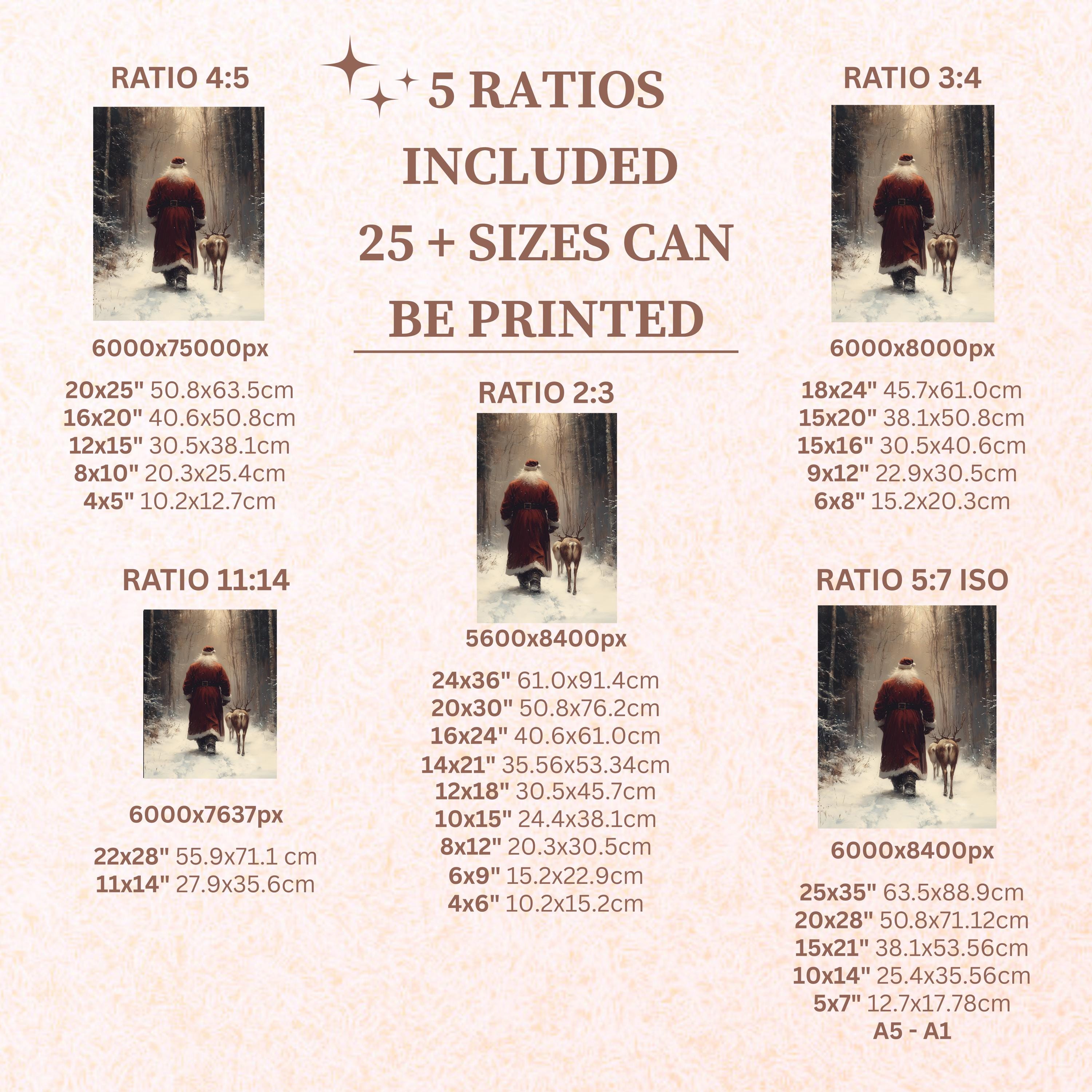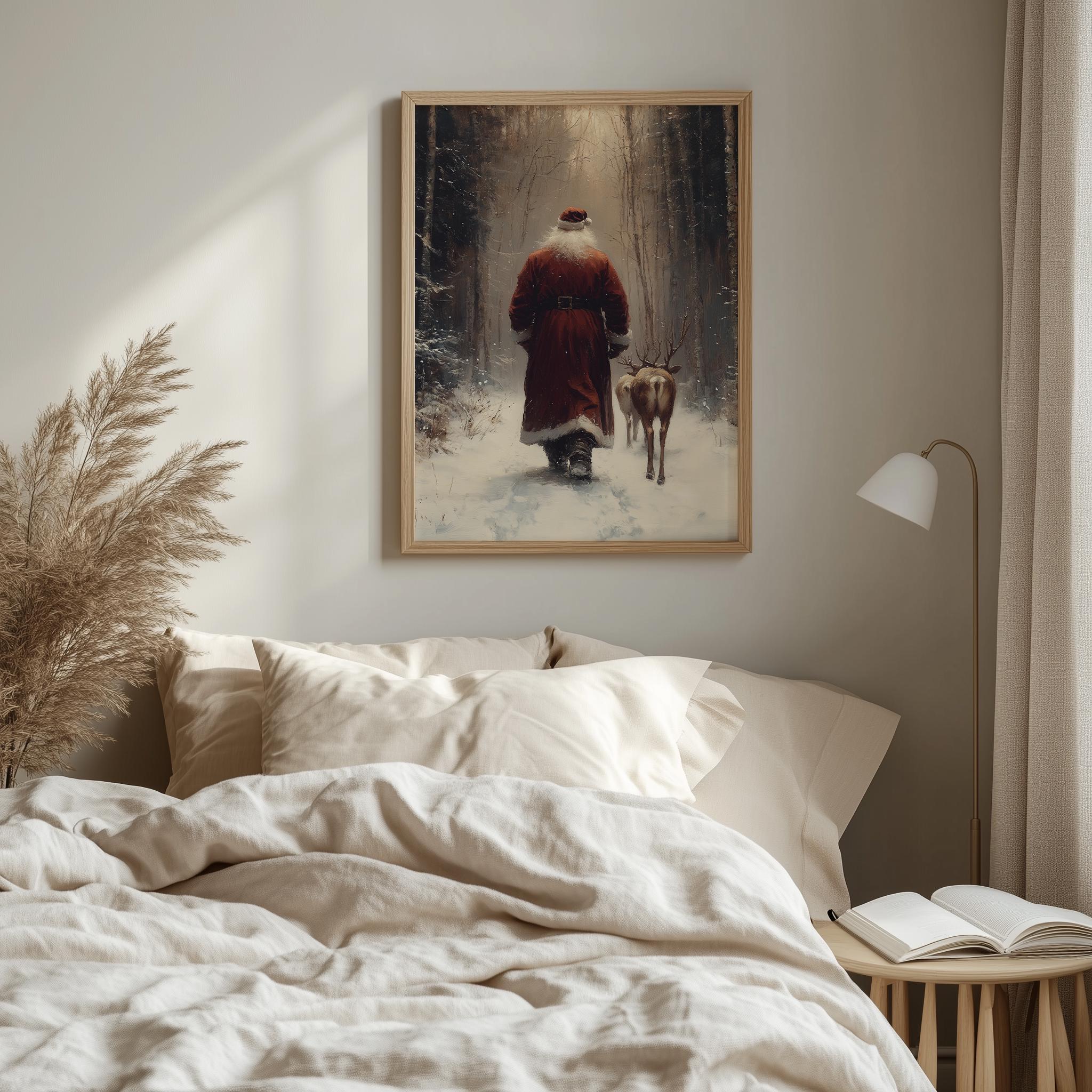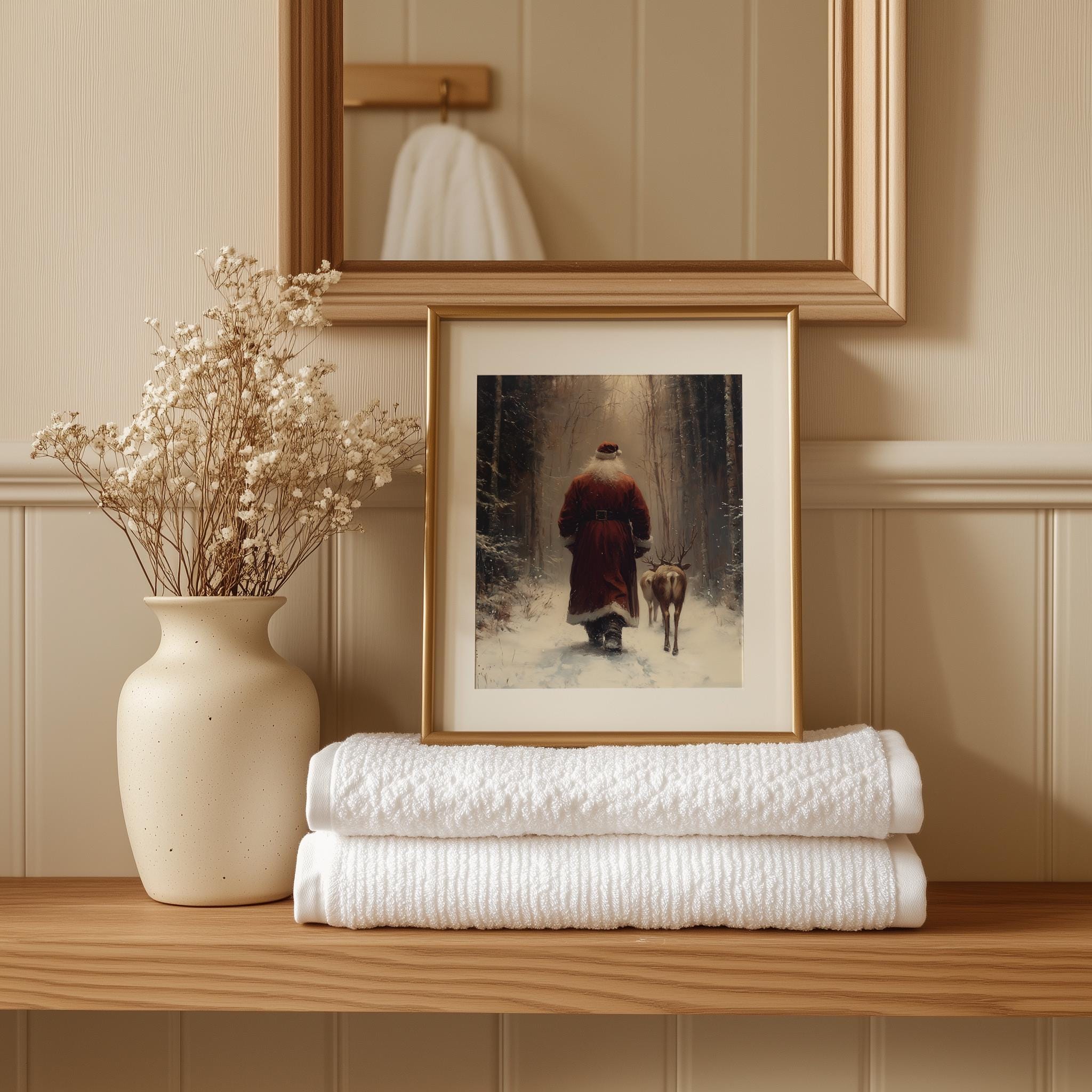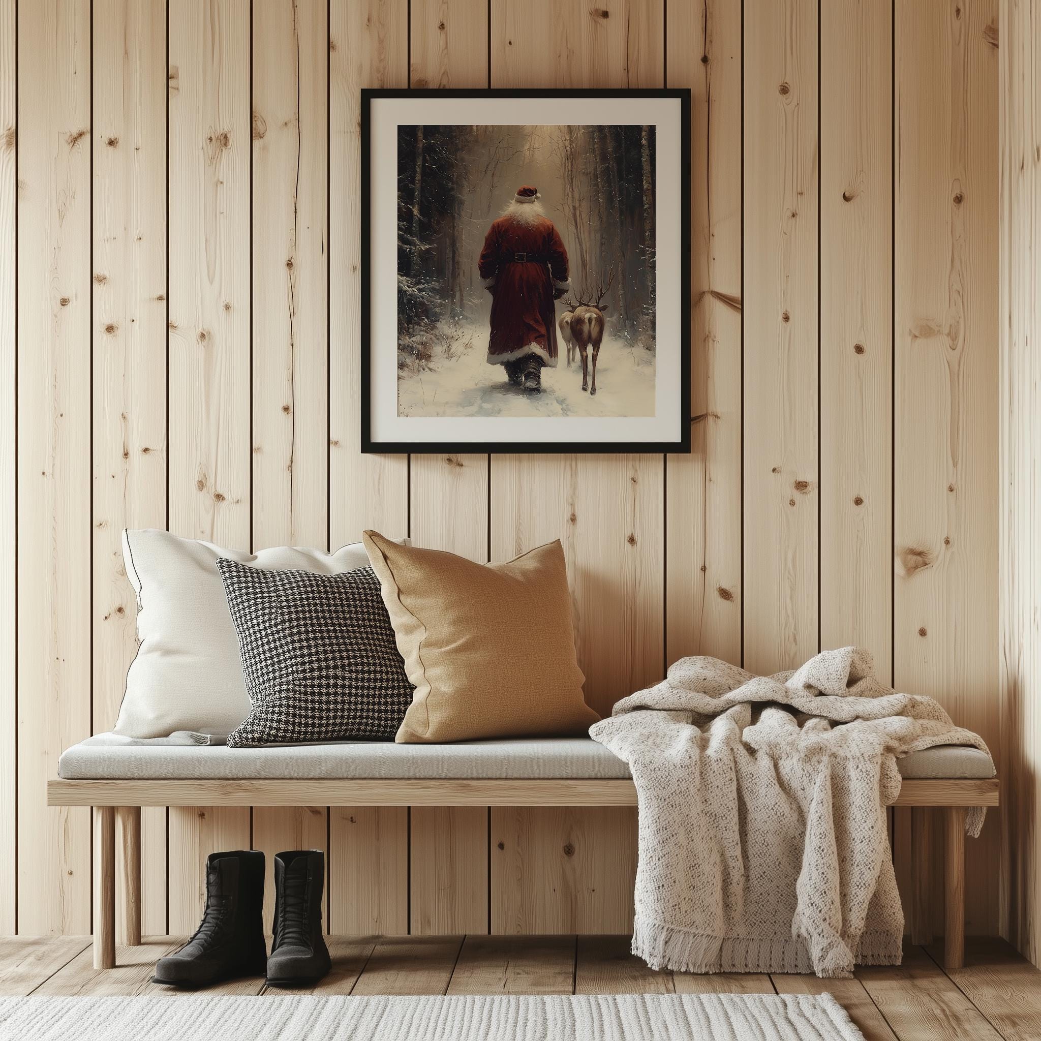 Immerse yourself in the charm of this rustic painting of a vintage Santa Claus journeying with reindeer through a serene, snowy forest. An instantly downloadable print, it's perfect for elevating your decor with budget-friendly charm. This gives you the flexibility to customize the size, frame, and material according to your personal taste and space, ensuring a perfect fit for your walls.