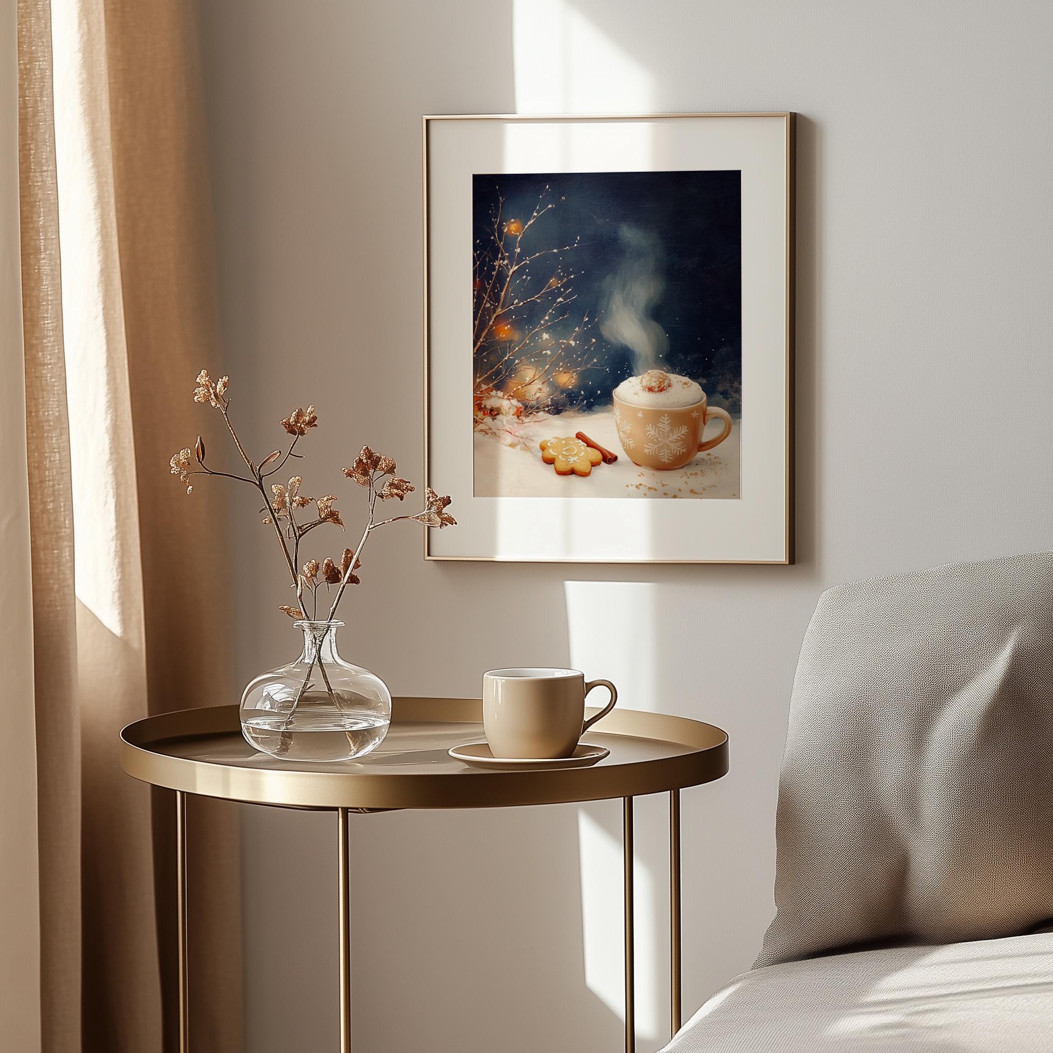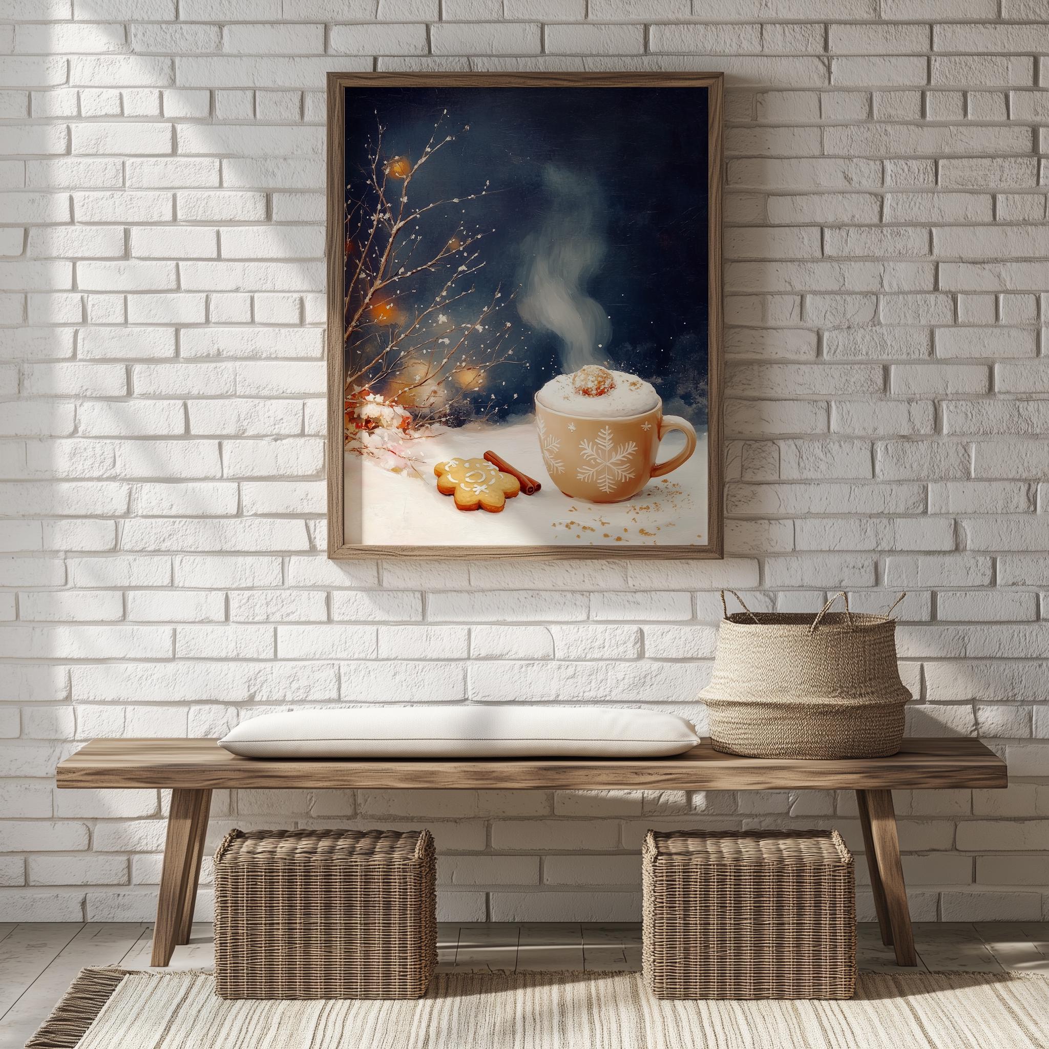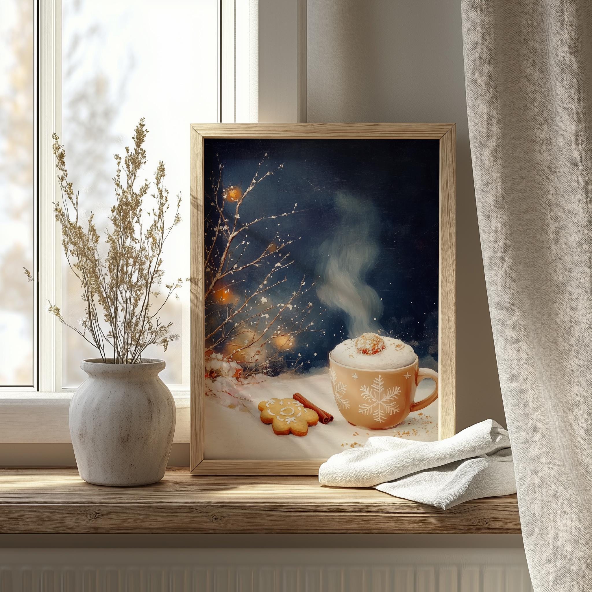 Immerse yourself in the charm of this rustic painting of a cozy mug of hot cocoa adorned with delicate snowflakes. An instantly downloadable print, it's perfect for elevating your decor with budget-friendly charm. This gives you the flexibility to customize the size, frame, and material according to your personal taste and space, ensuring a perfect fit for your walls.