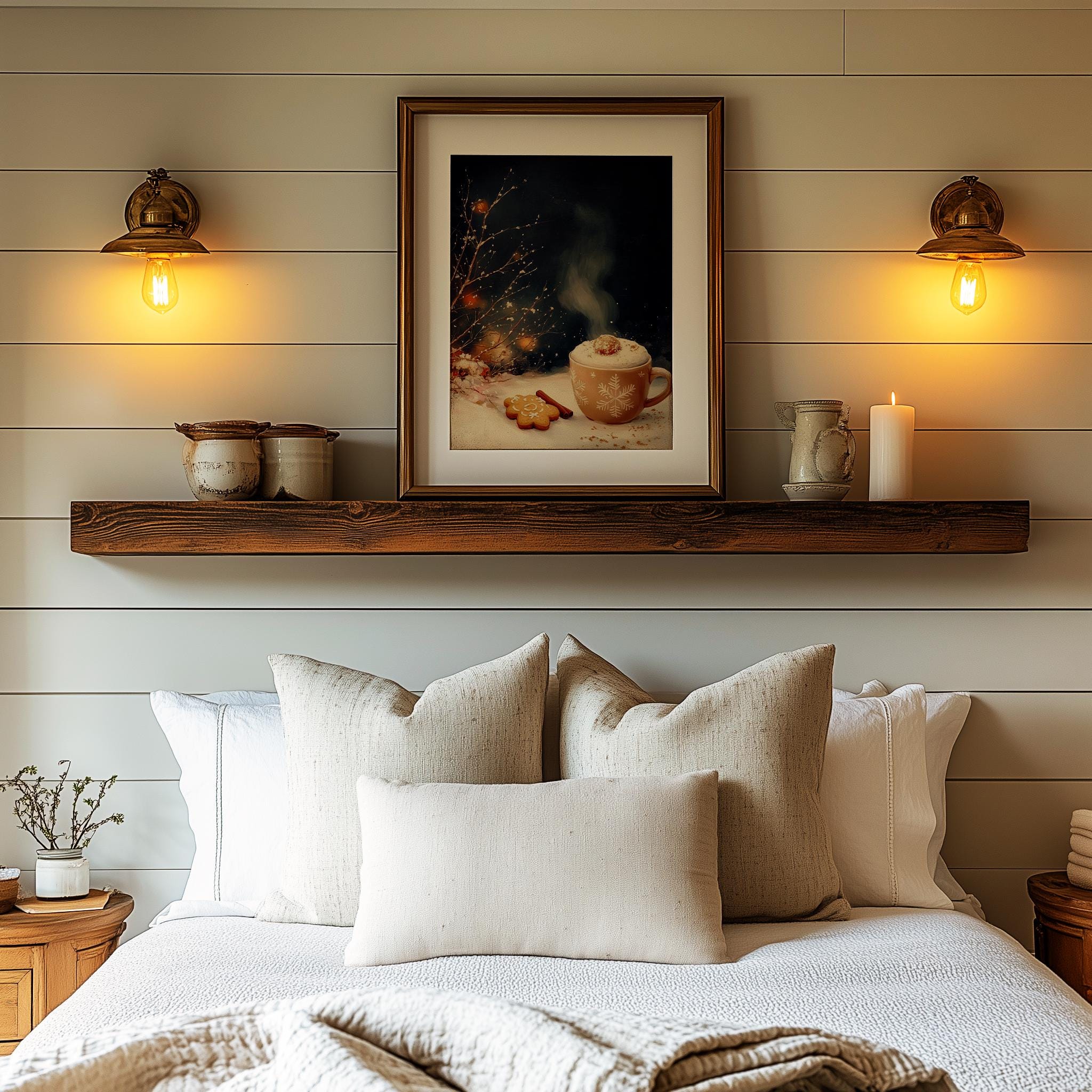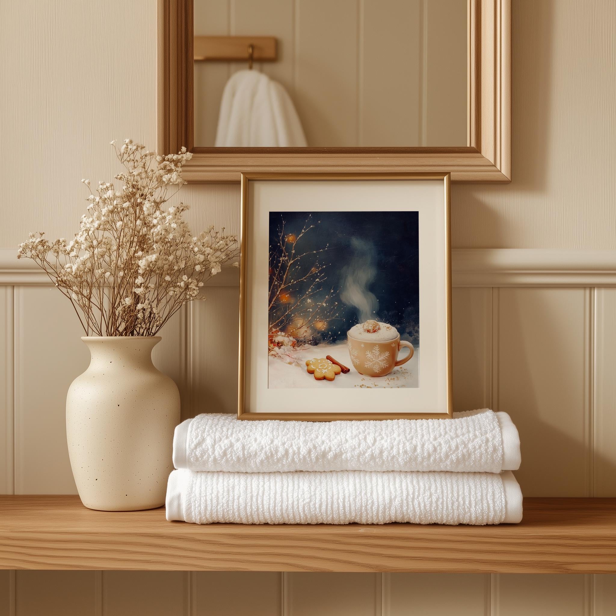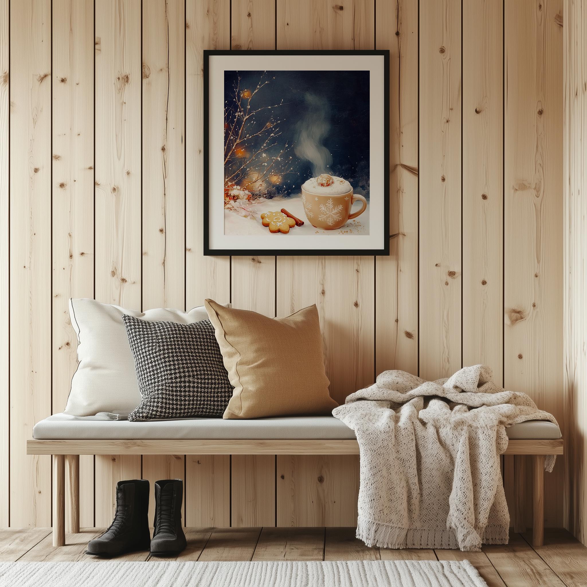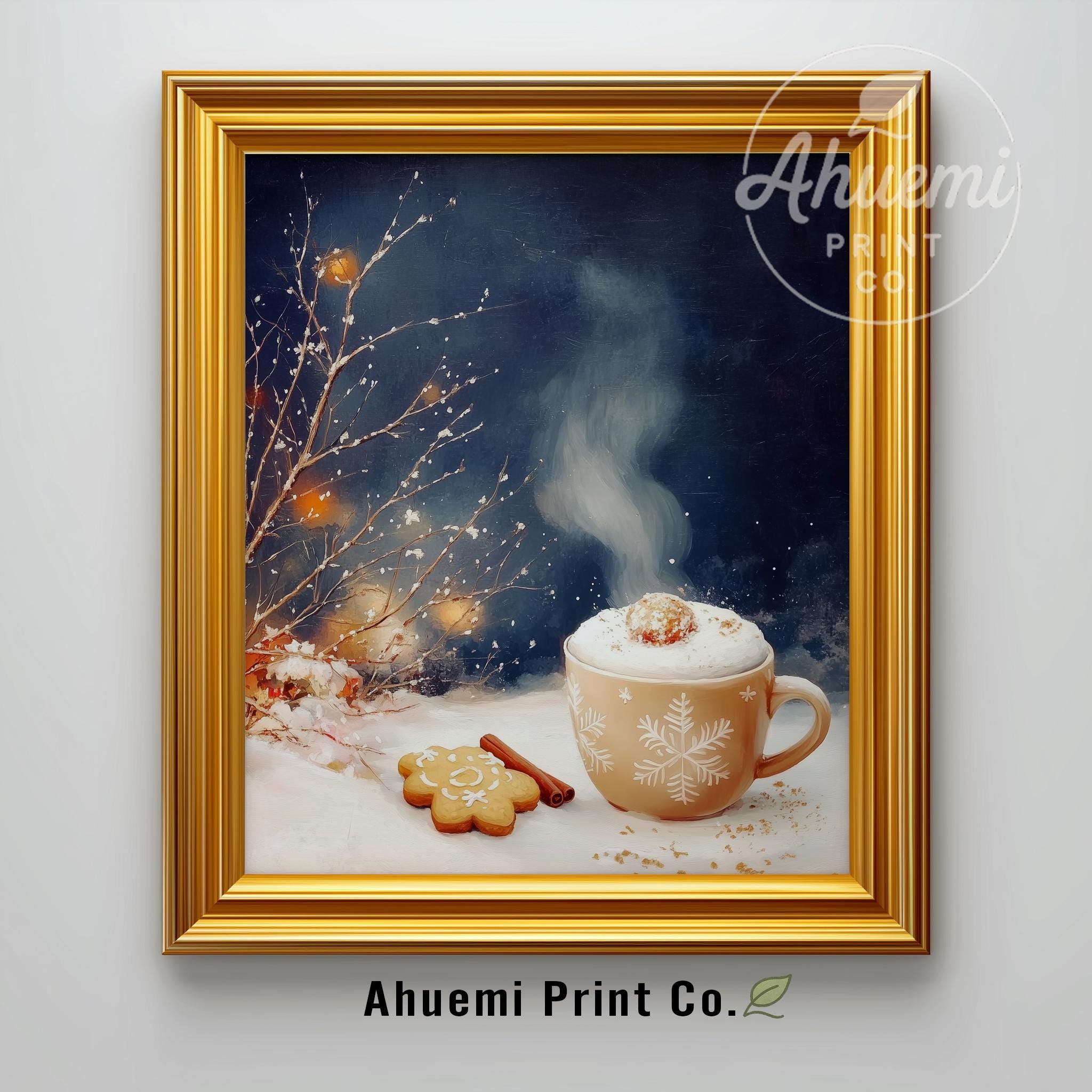 Immerse yourself in the charm of this rustic painting of a cozy mug of hot cocoa adorned with delicate snowflakes. An instantly downloadable print, it's perfect for elevating your decor with budget-friendly charm. This gives you the flexibility to customize the size, frame, and material according to your personal taste and space, ensuring a perfect fit for your walls.