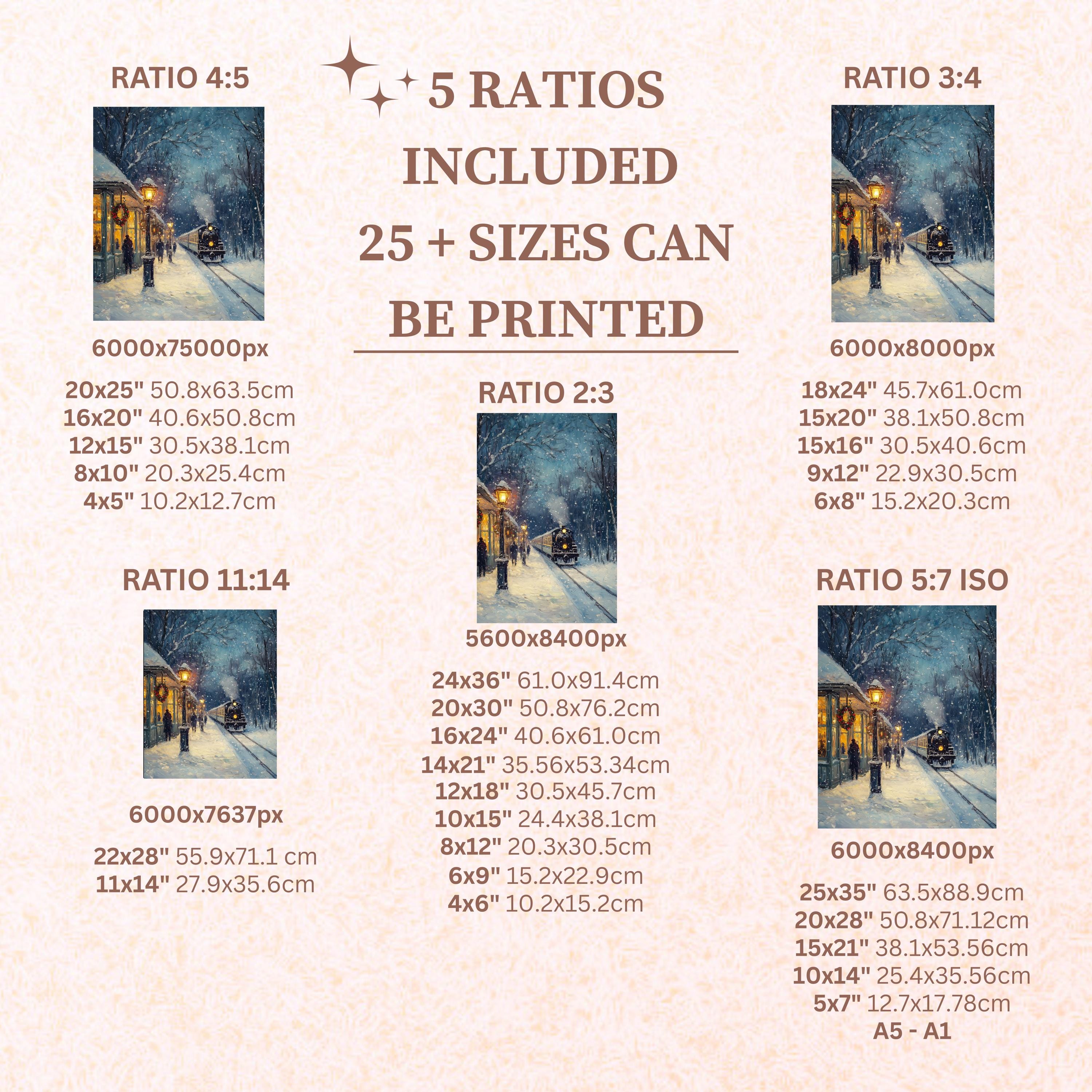 Each artwork includes 5 aspect ratios with 25+ print sizes. Most standard frames are covered. One custom resize per purchase available—message before ordering.