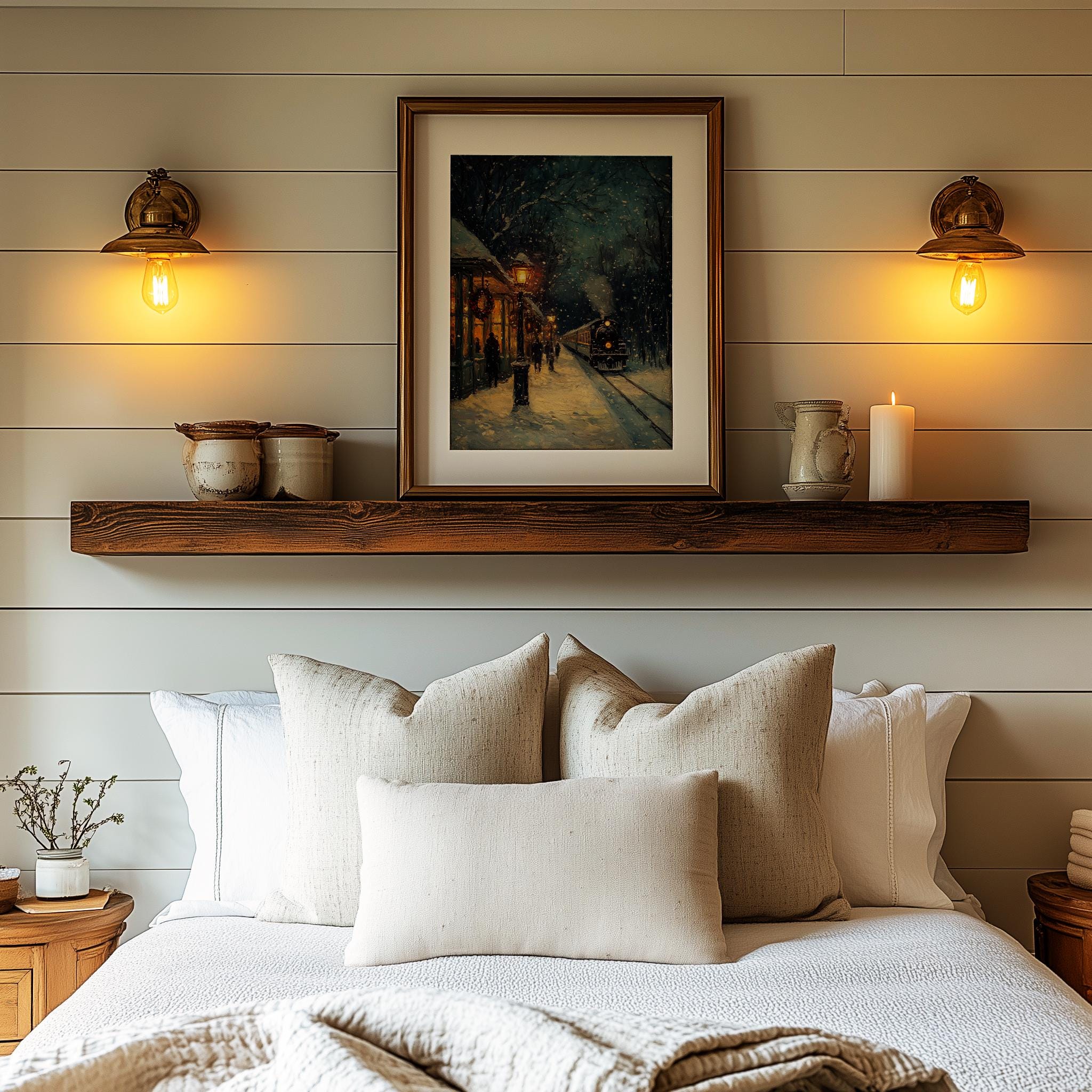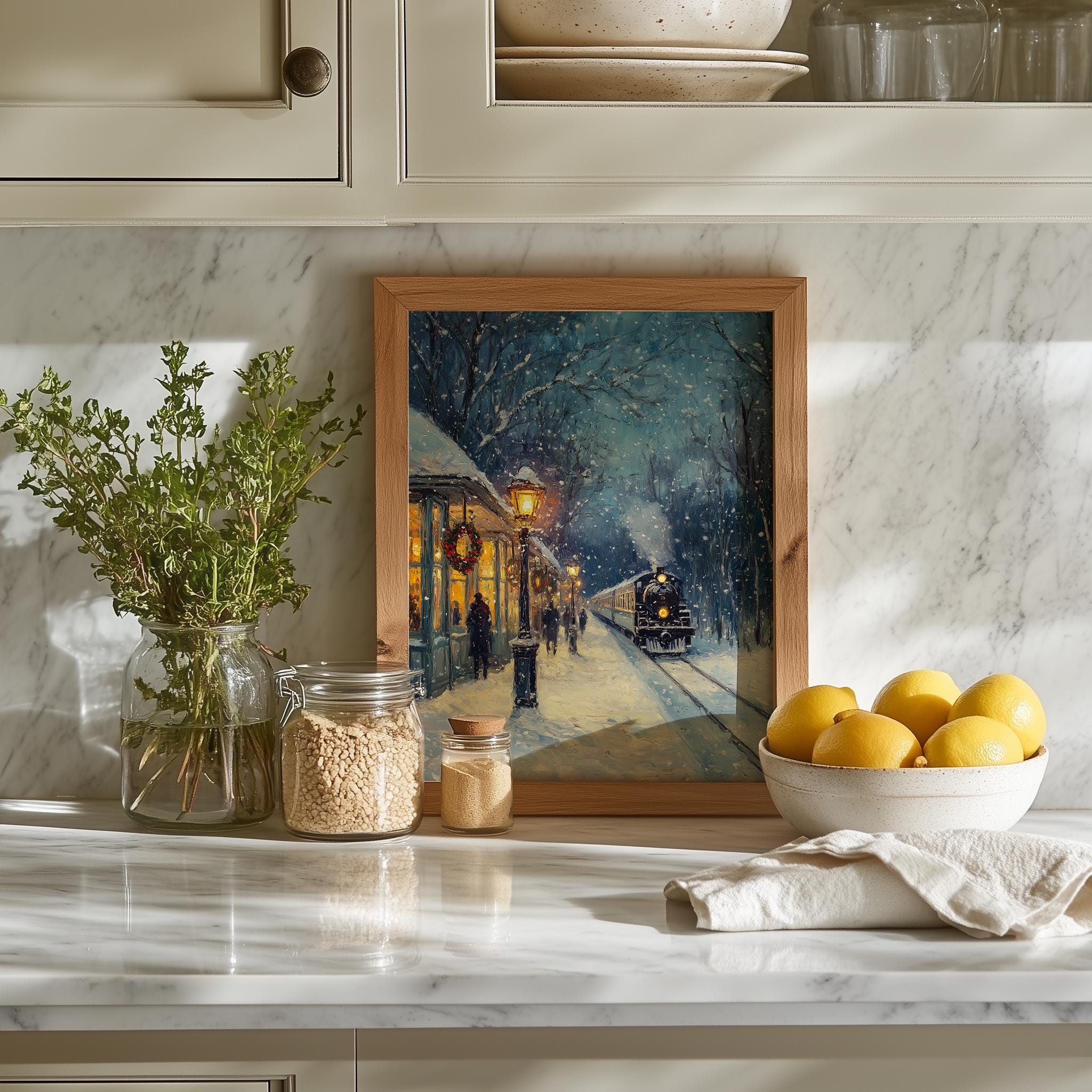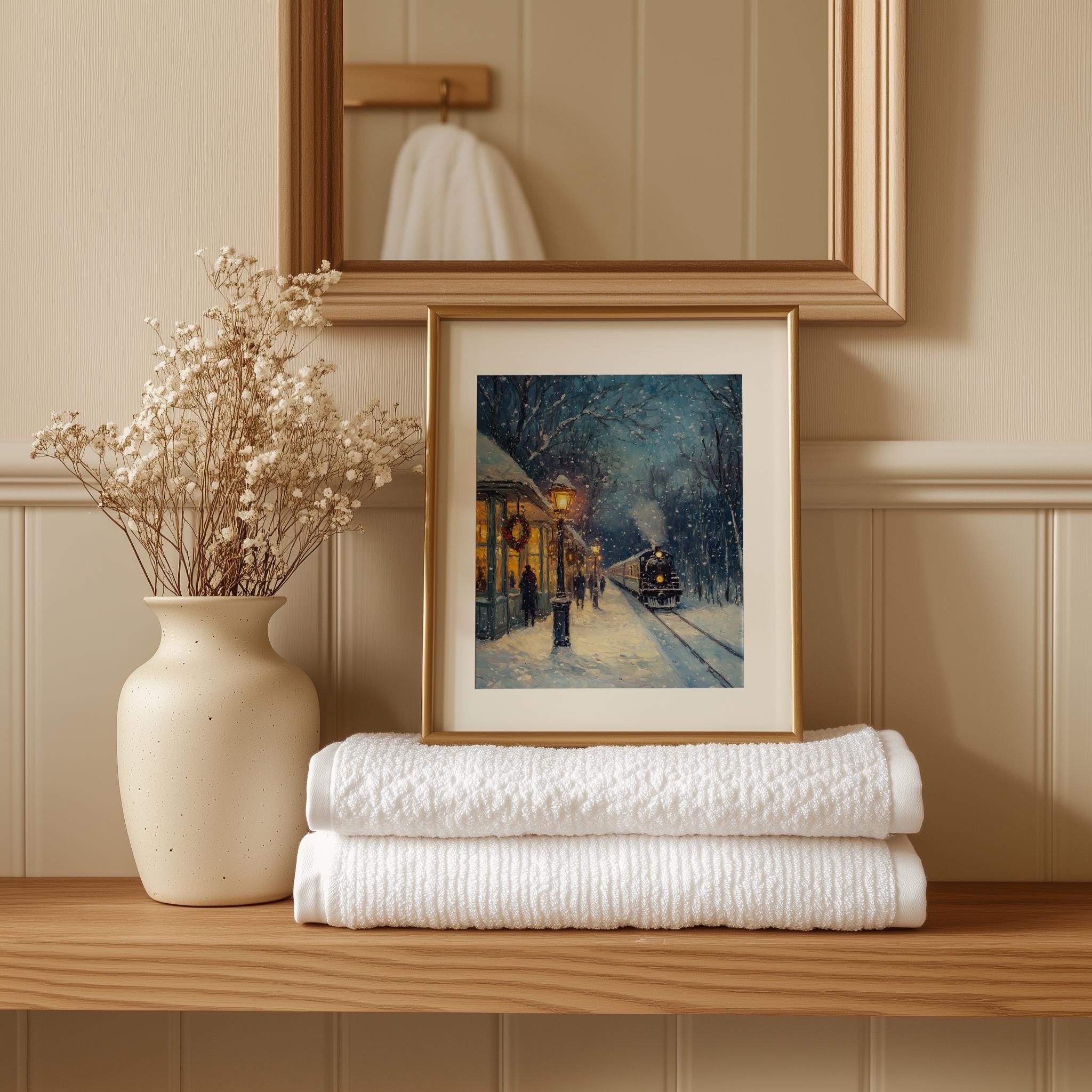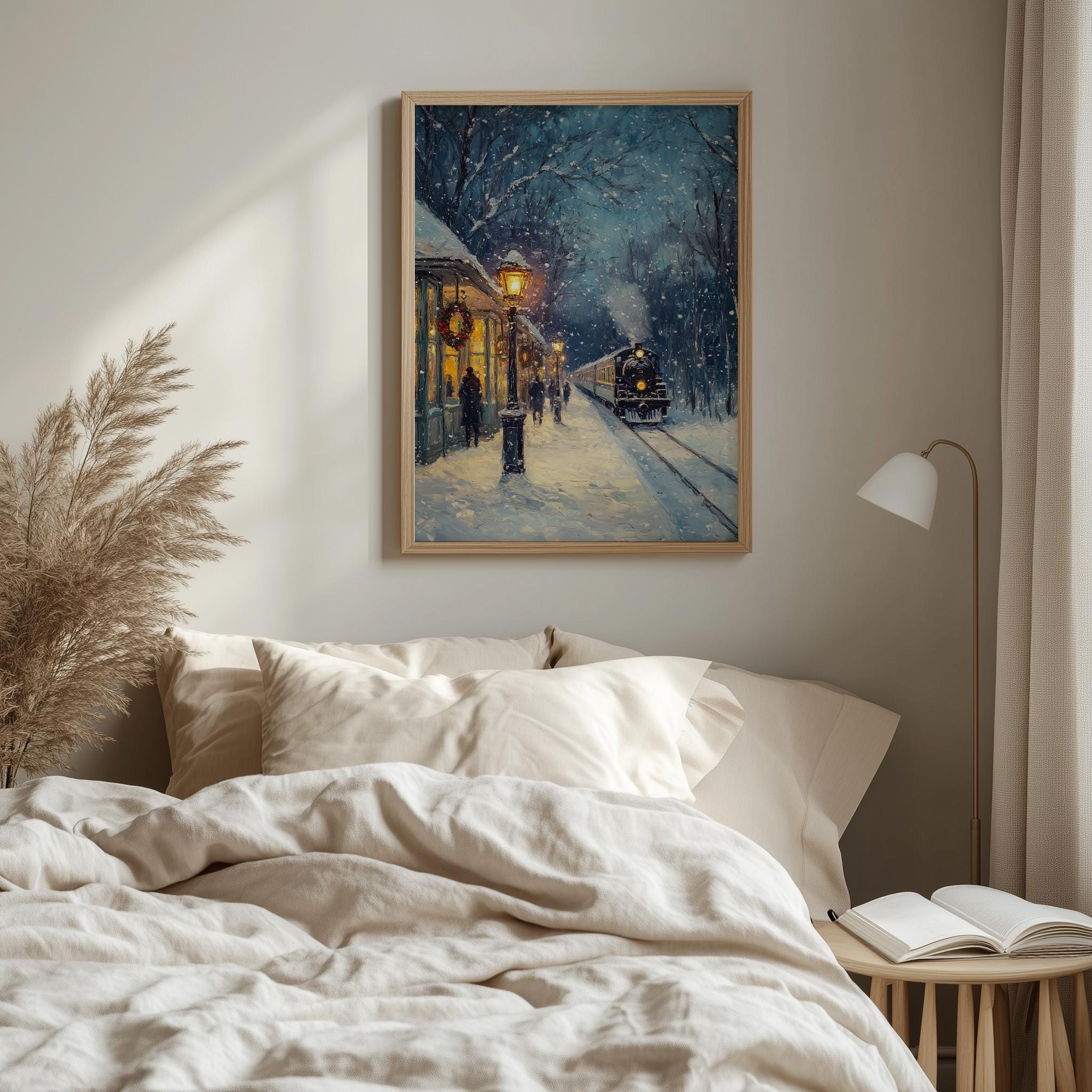 Immerse yourself in the charm of this rustic painting of a vintage steam locomotive gracefully traversing a snow-covered landscape. An instantly downloadable print, it's perfect for elevating your decor with budget-friendly charm. This gives you the flexibility to customize the size, frame, and material according to your personal taste and space, ensuring a perfect fit for your walls.