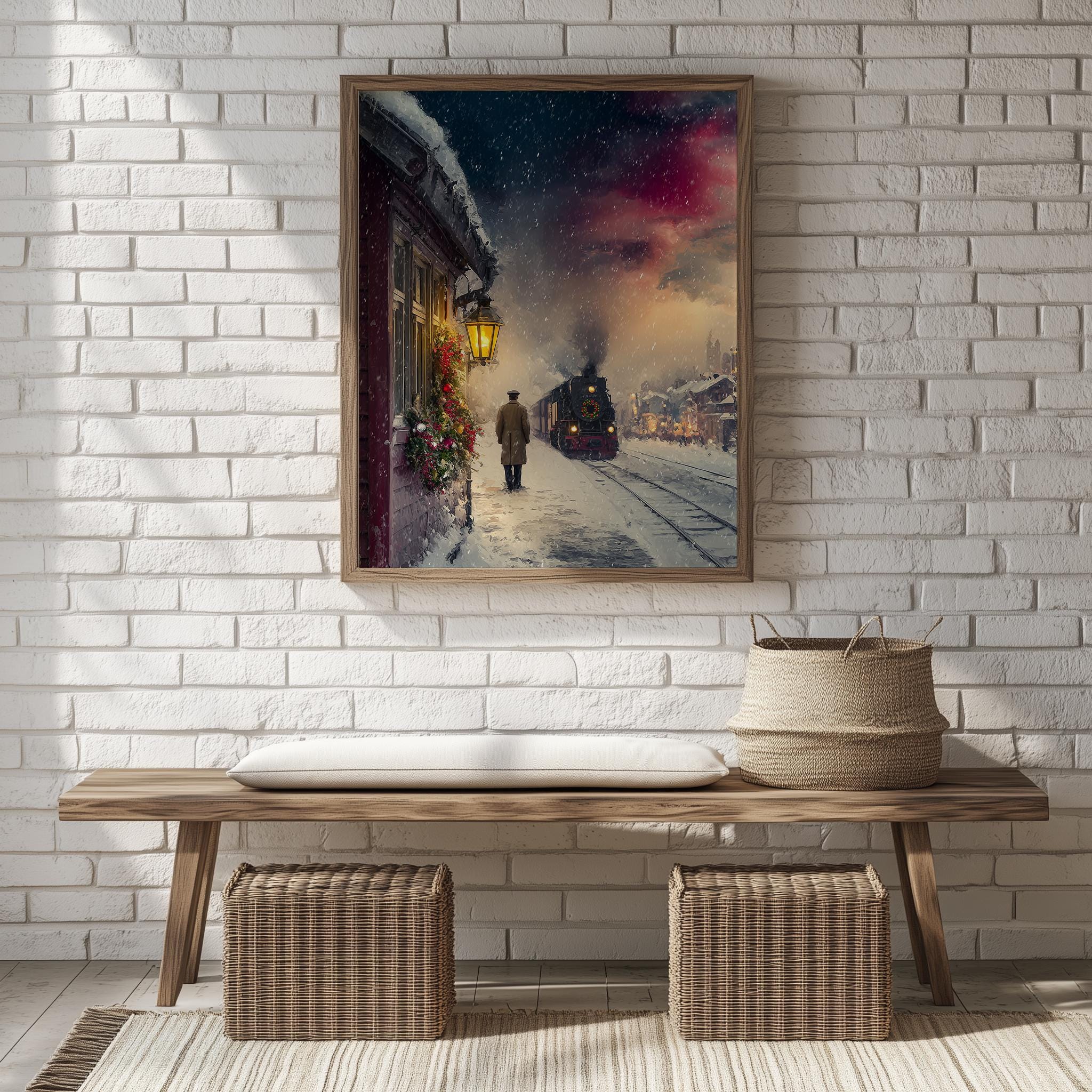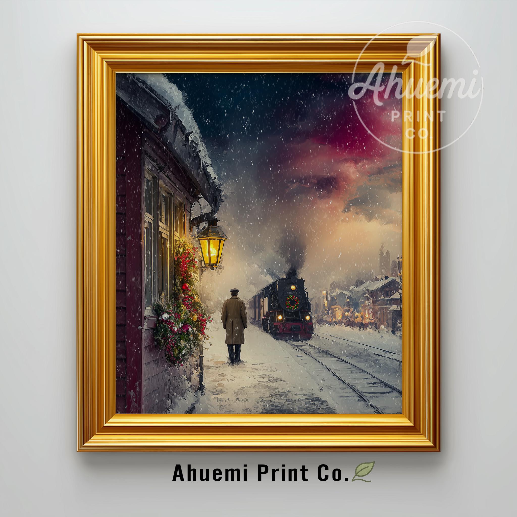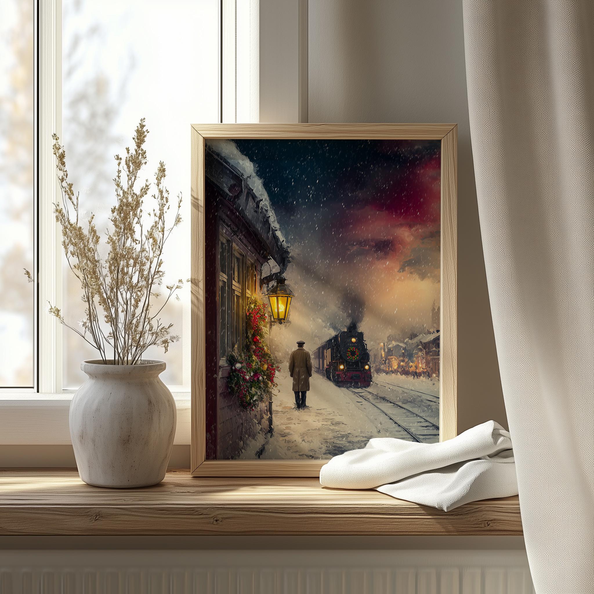 Immerse yourself in the charm of this rustic painting of a vintage steam locomotive stationed on a snowy train platform, illuminated by a warm conductor's lantern. An instantly downloadable print, it's perfect for elevating your decor with budget-friendly charm. This gives you the flexibility to customize the size, frame, and material according to your personal taste and space, ensuring a perfect fit for your walls.