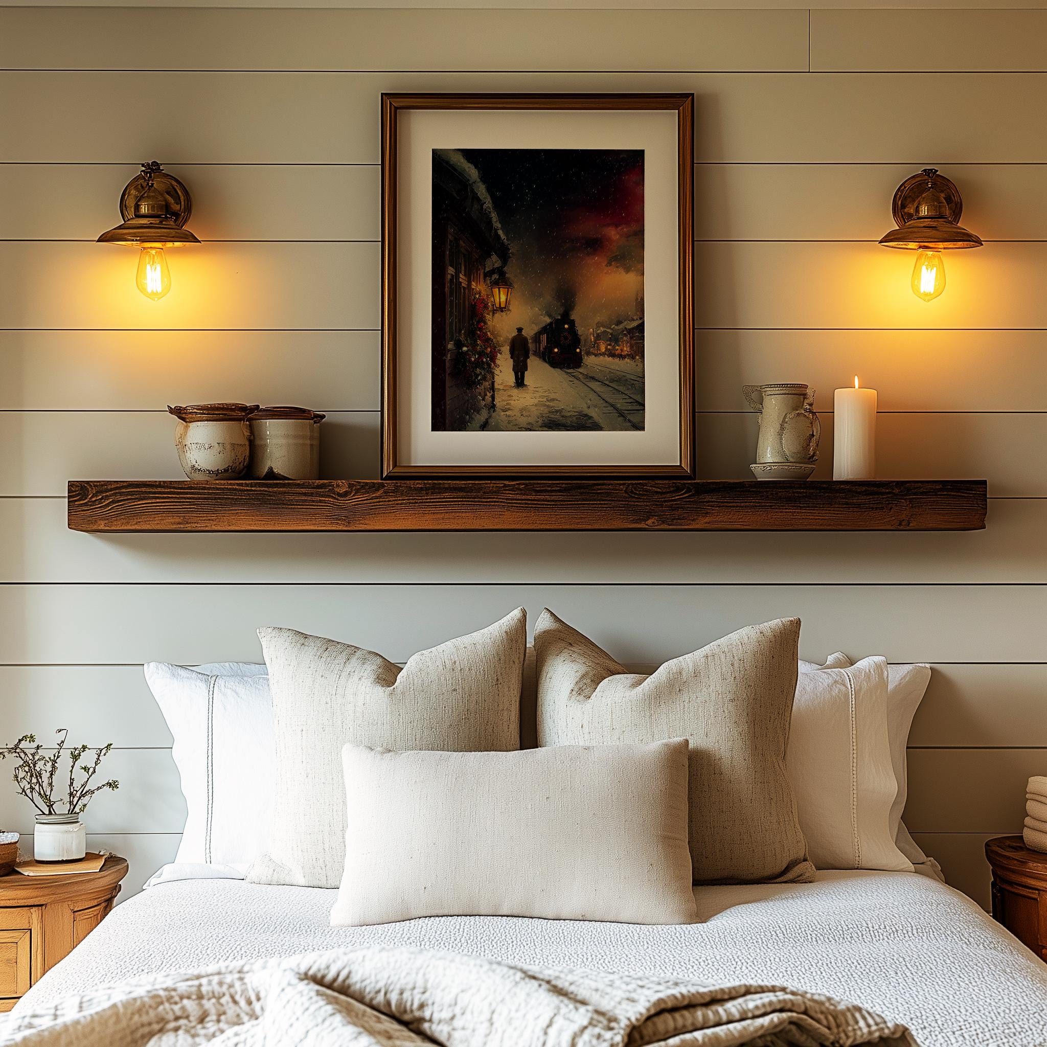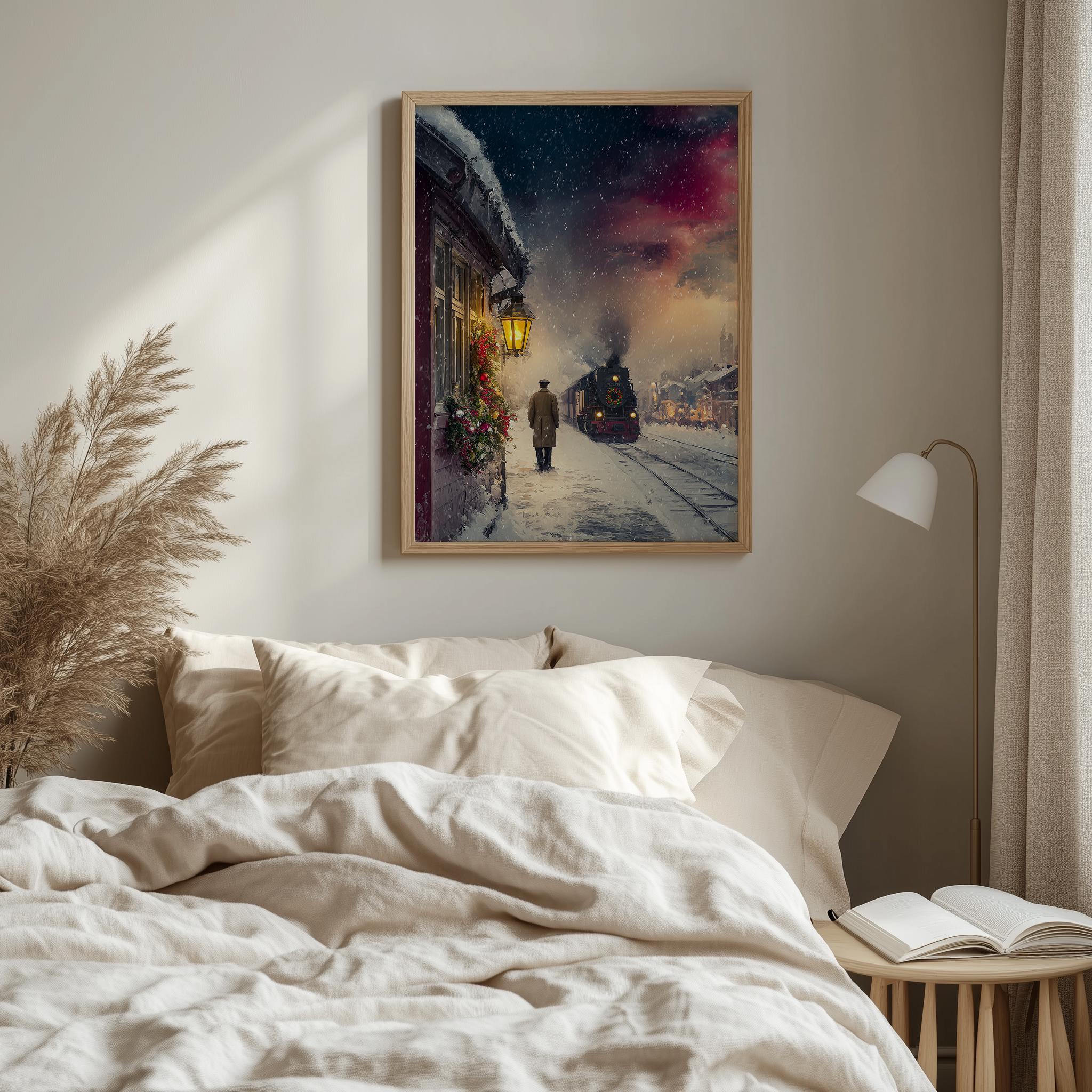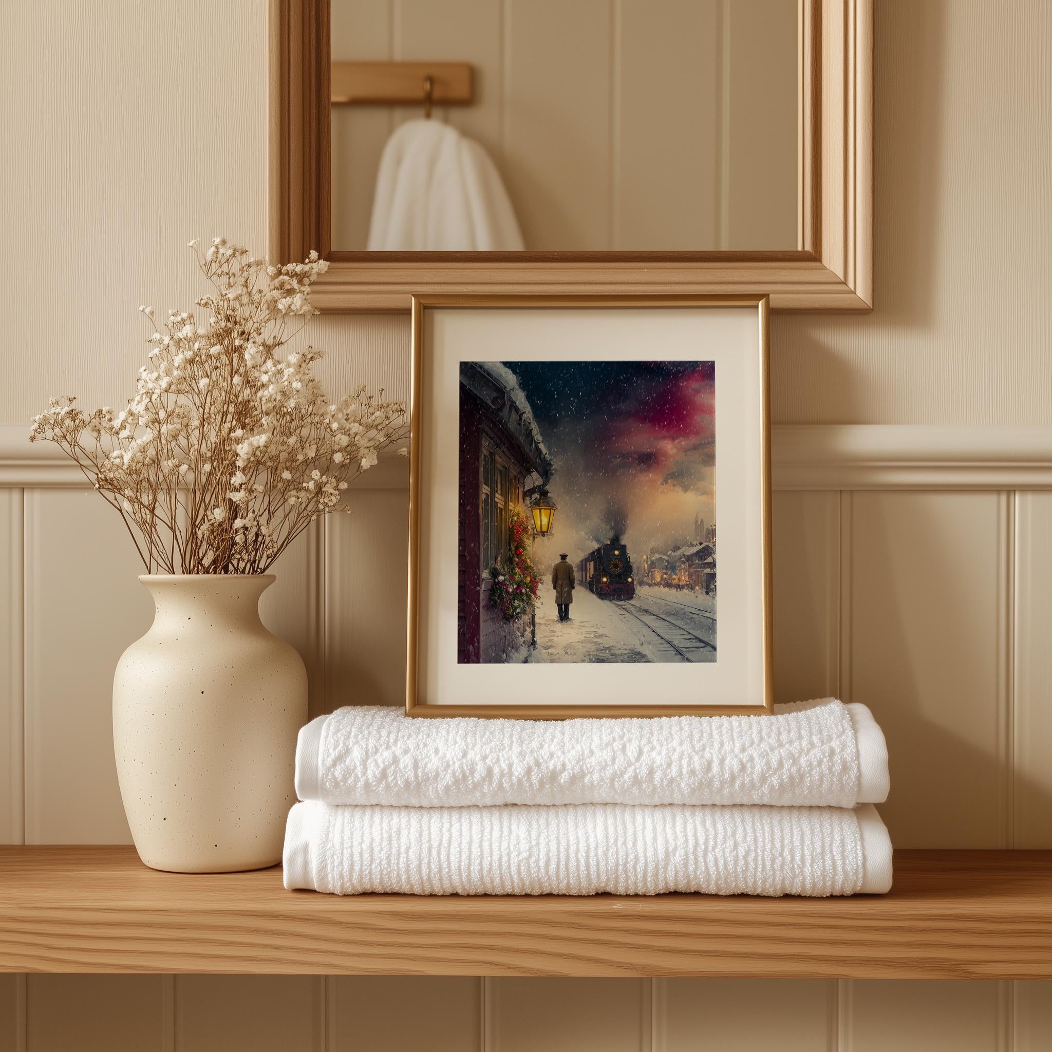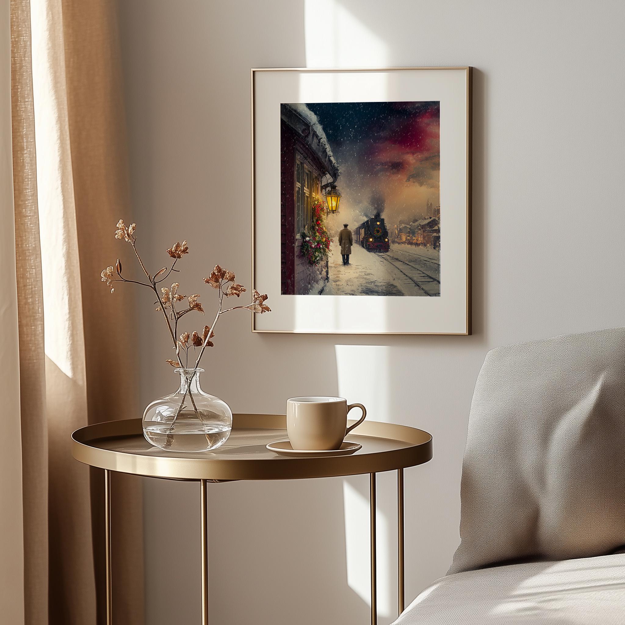 Immerse yourself in the charm of this rustic painting of a vintage steam locomotive stationed on a snowy train platform, illuminated by a warm conductor's lantern. An instantly downloadable print, it's perfect for elevating your decor with budget-friendly charm. This gives you the flexibility to customize the size, frame, and material according to your personal taste and space, ensuring a perfect fit for your walls.