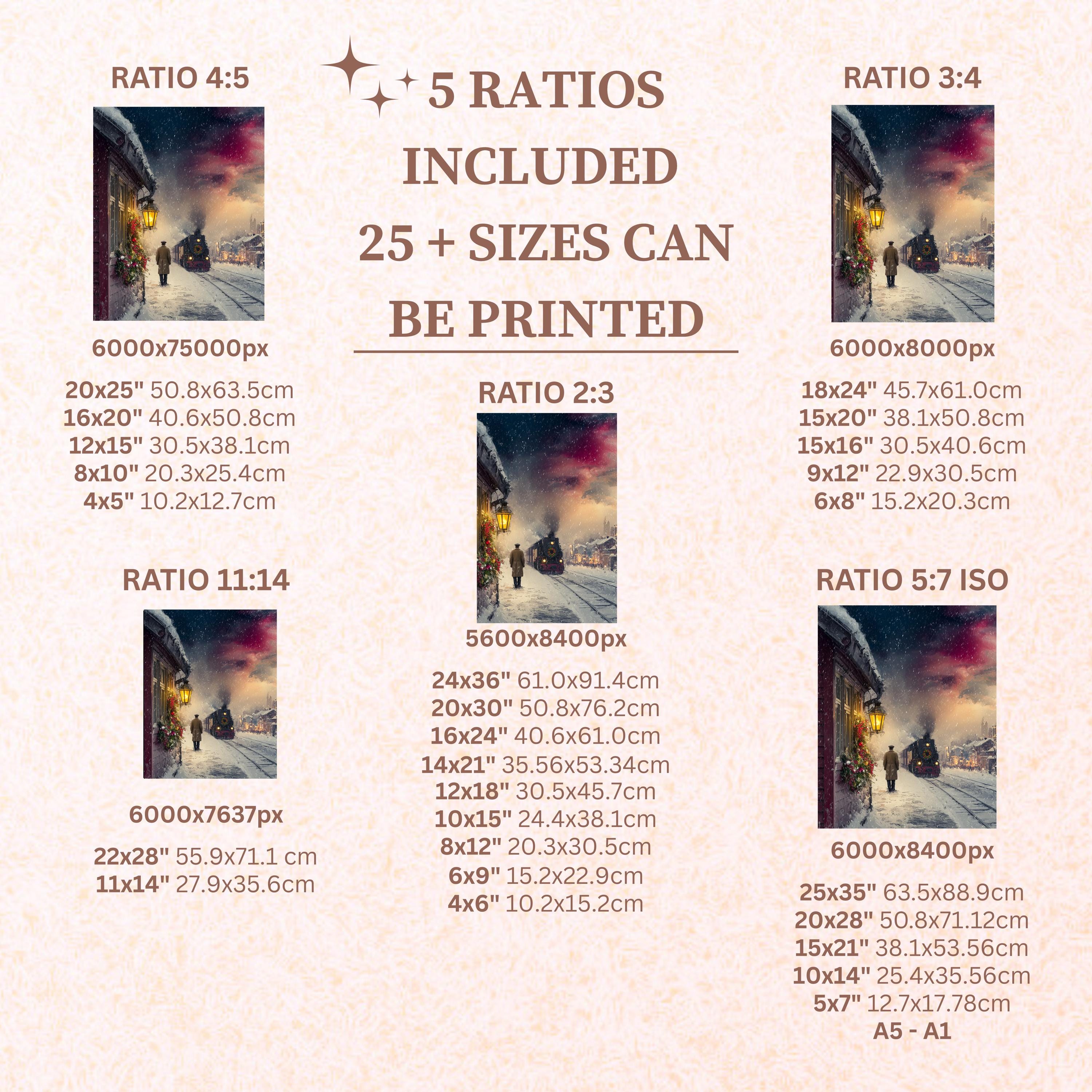 Each artwork includes 5 aspect ratios with 25+ print sizes. Most standard frames are covered. One custom resize per purchase available—message before ordering.