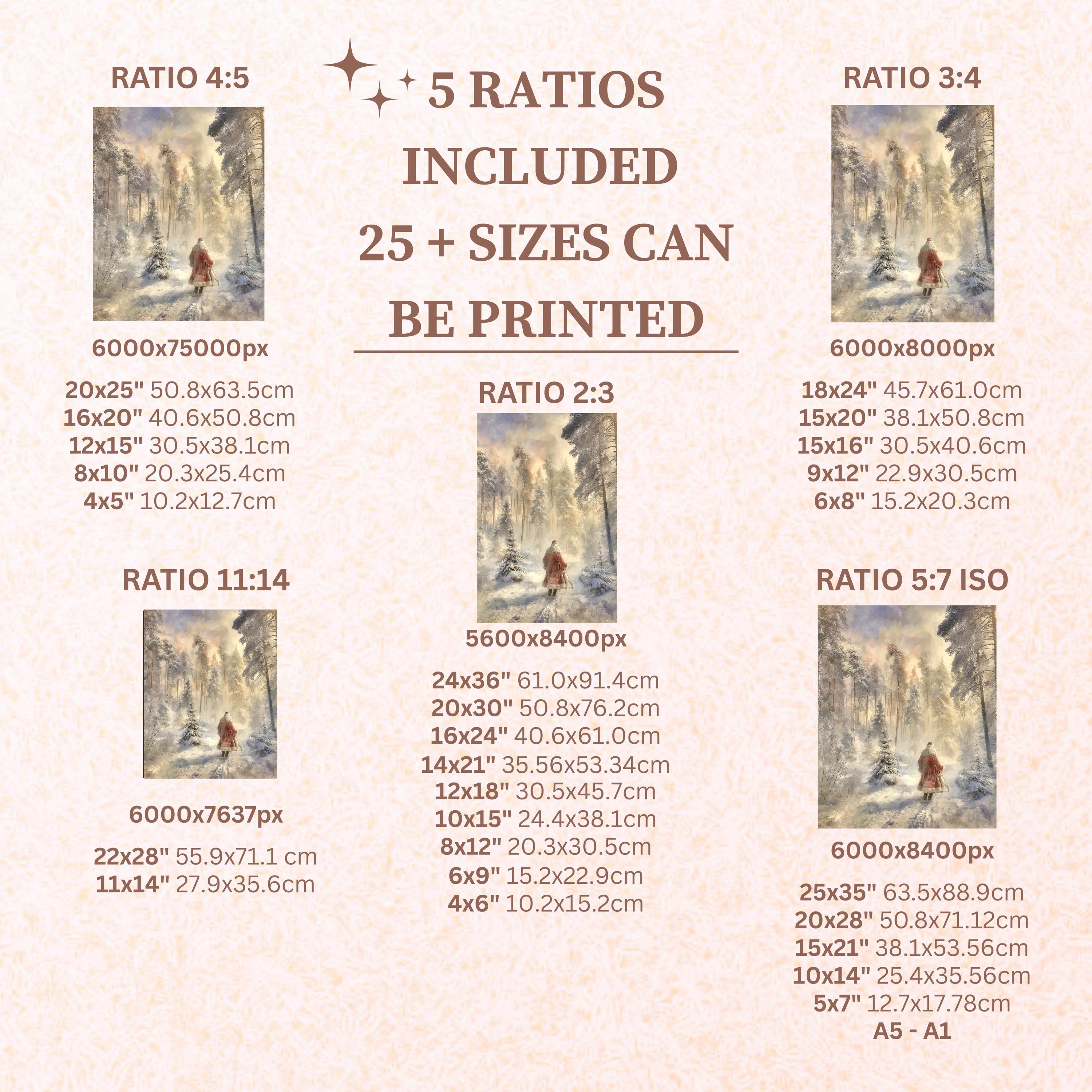 Each artwork includes 5 aspect ratios with 25+ print sizes. Most standard frames are covered. One custom resize per purchase available—message before ordering.