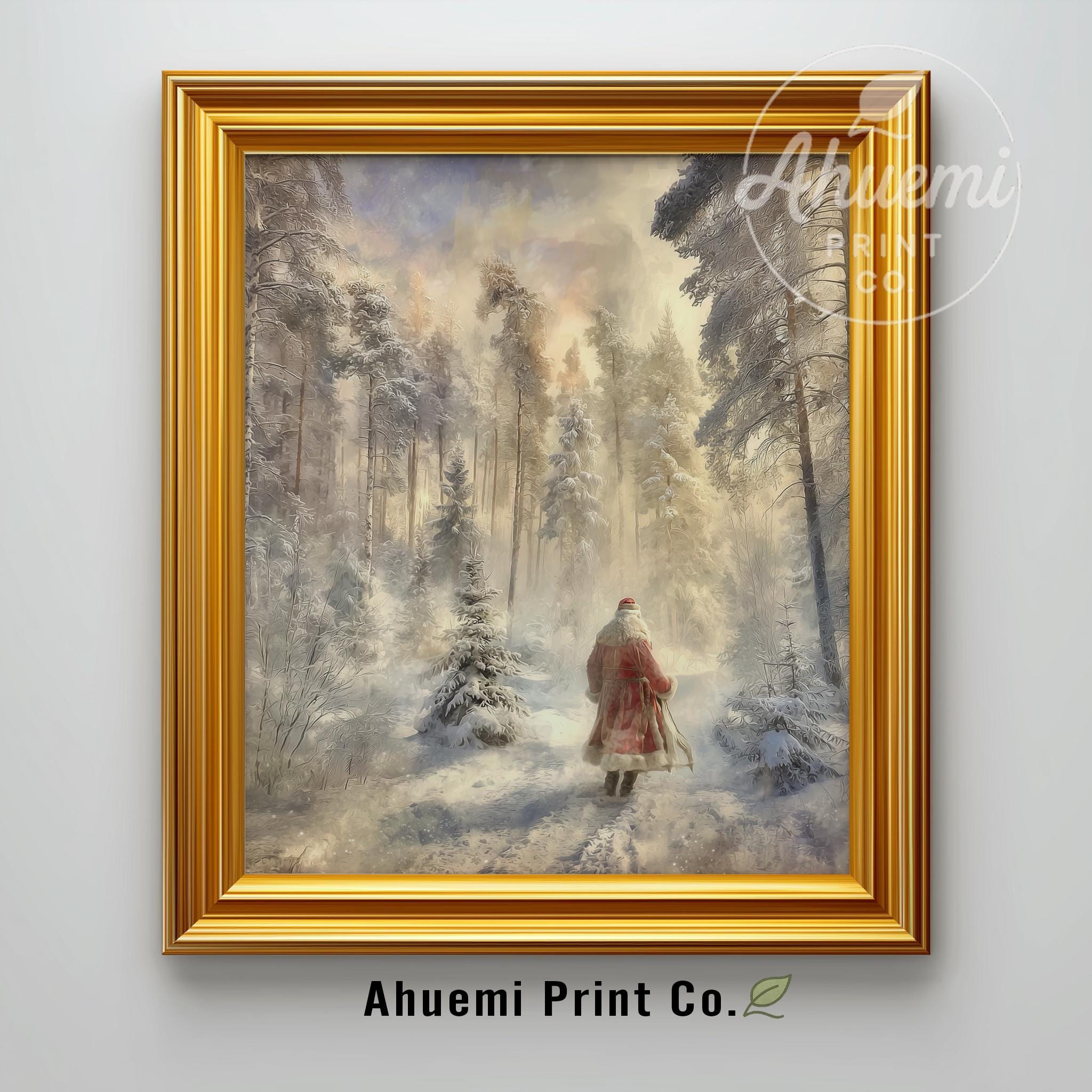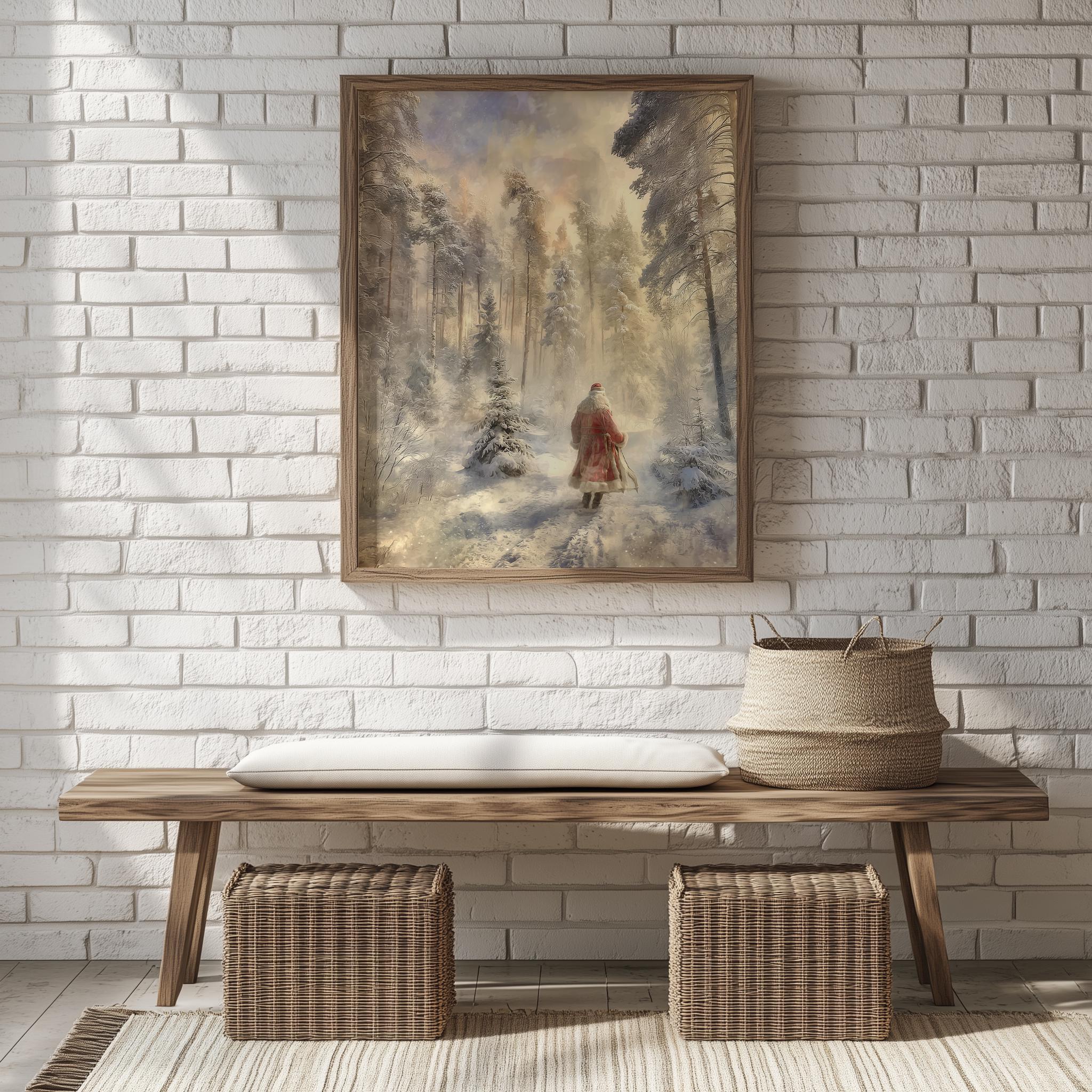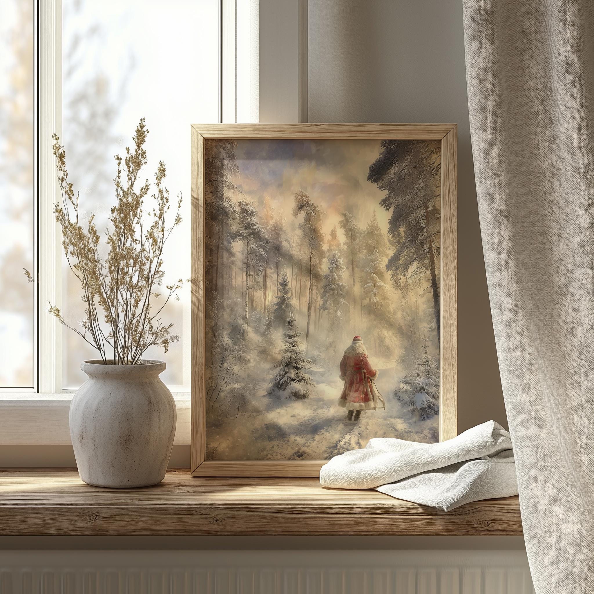 Immerse yourself in the charm of this rustic painting of Santa Claus meandering through a snowy forest landscape. An instantly downloadable print, it's perfect for elevating your decor with budget-friendly charm. This gives you the flexibility to customize the size, frame, and material according to your personal taste and space, ensuring a perfect fit for your walls.