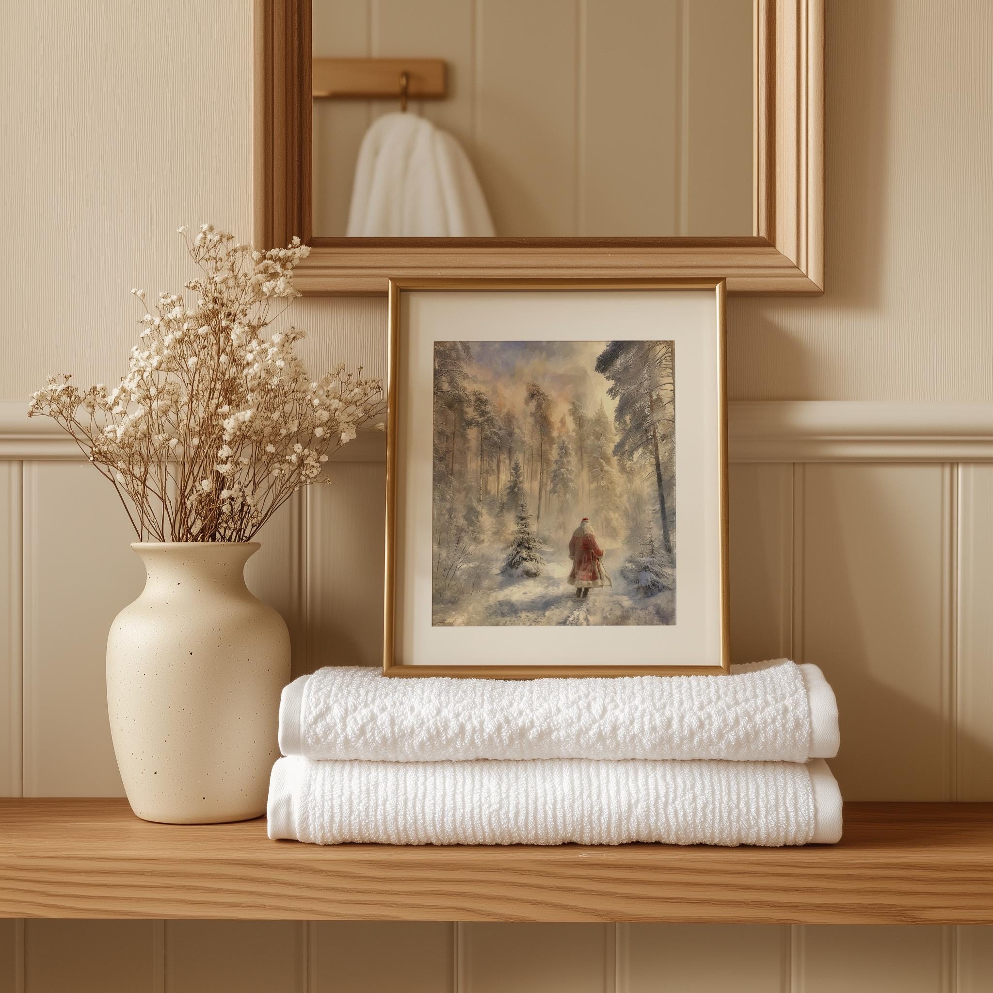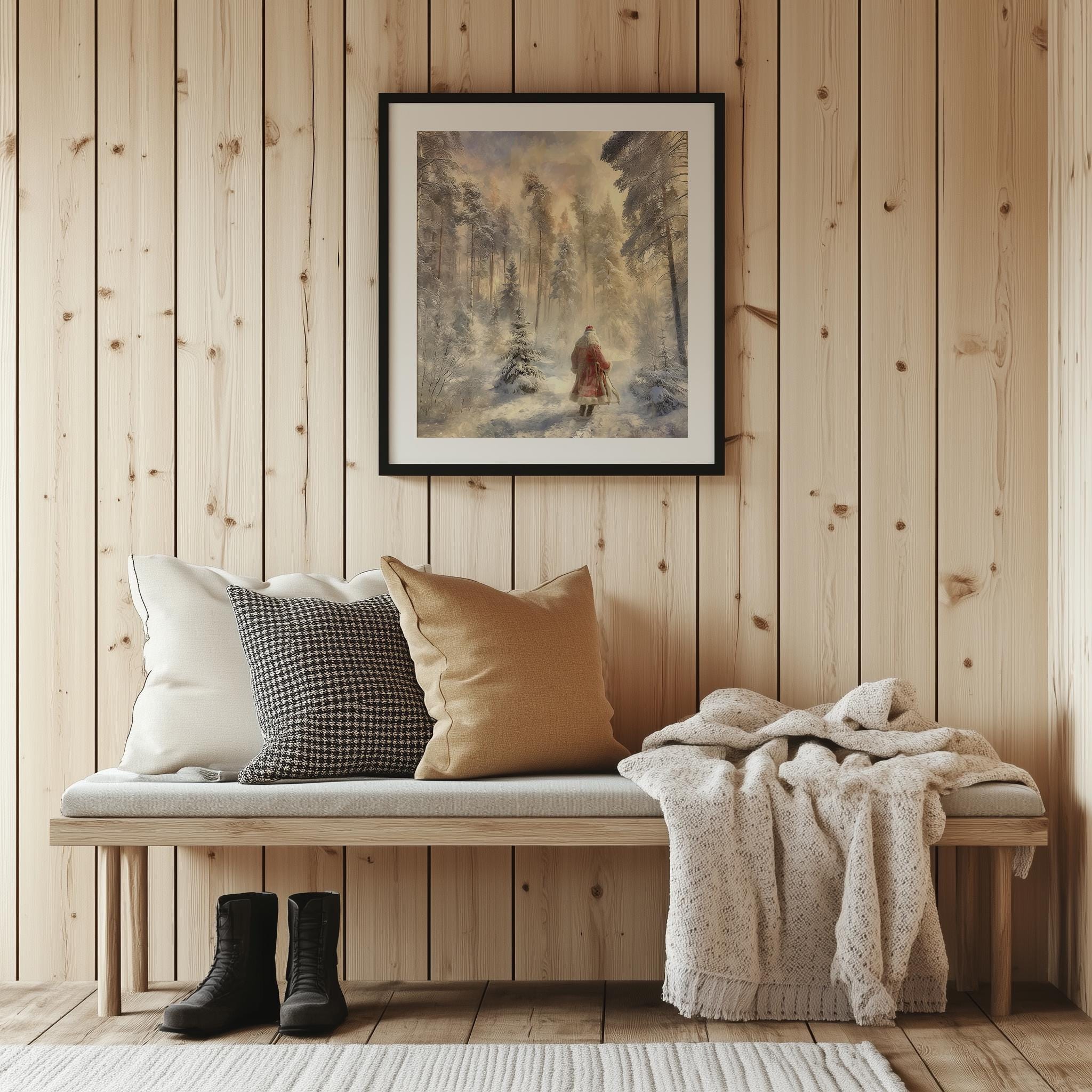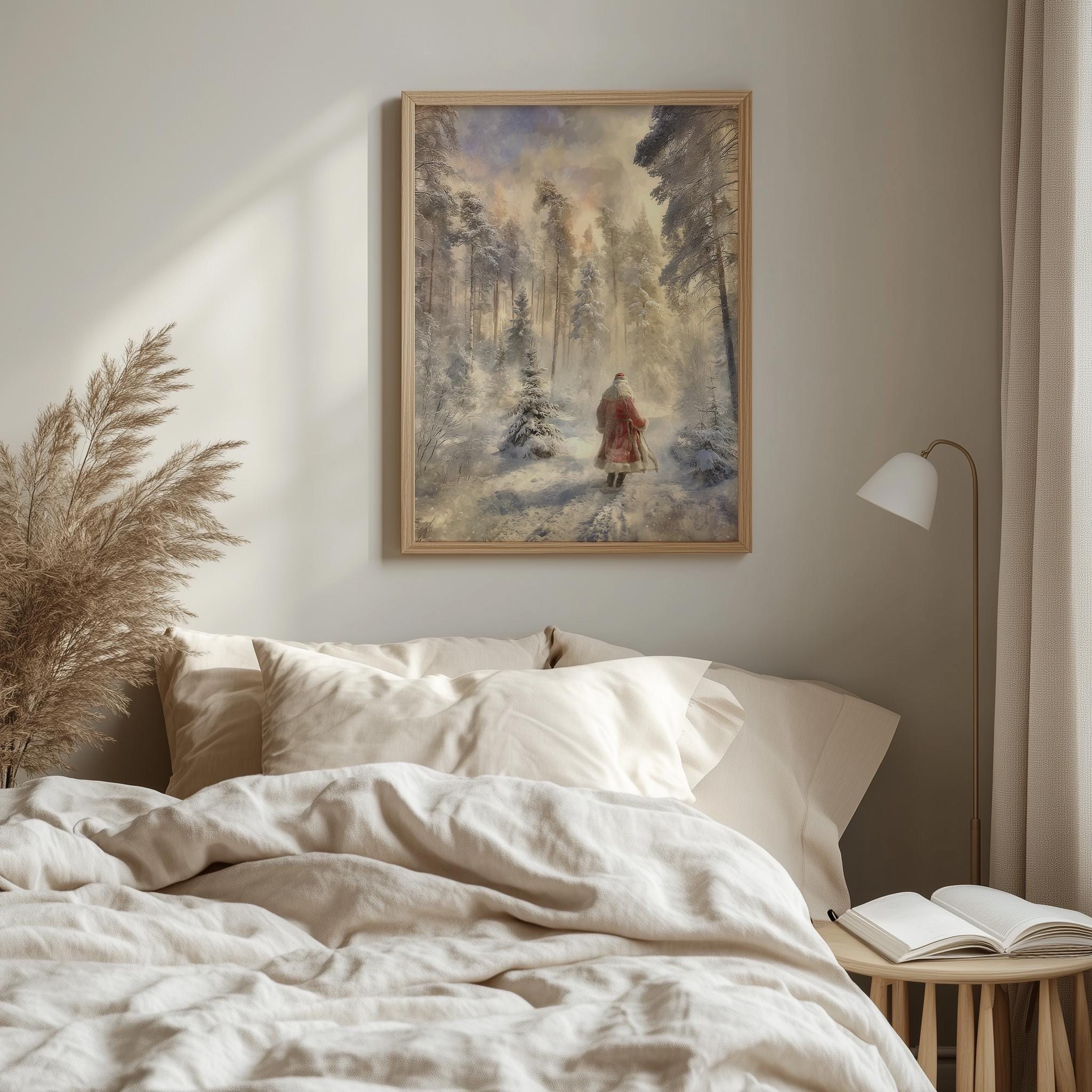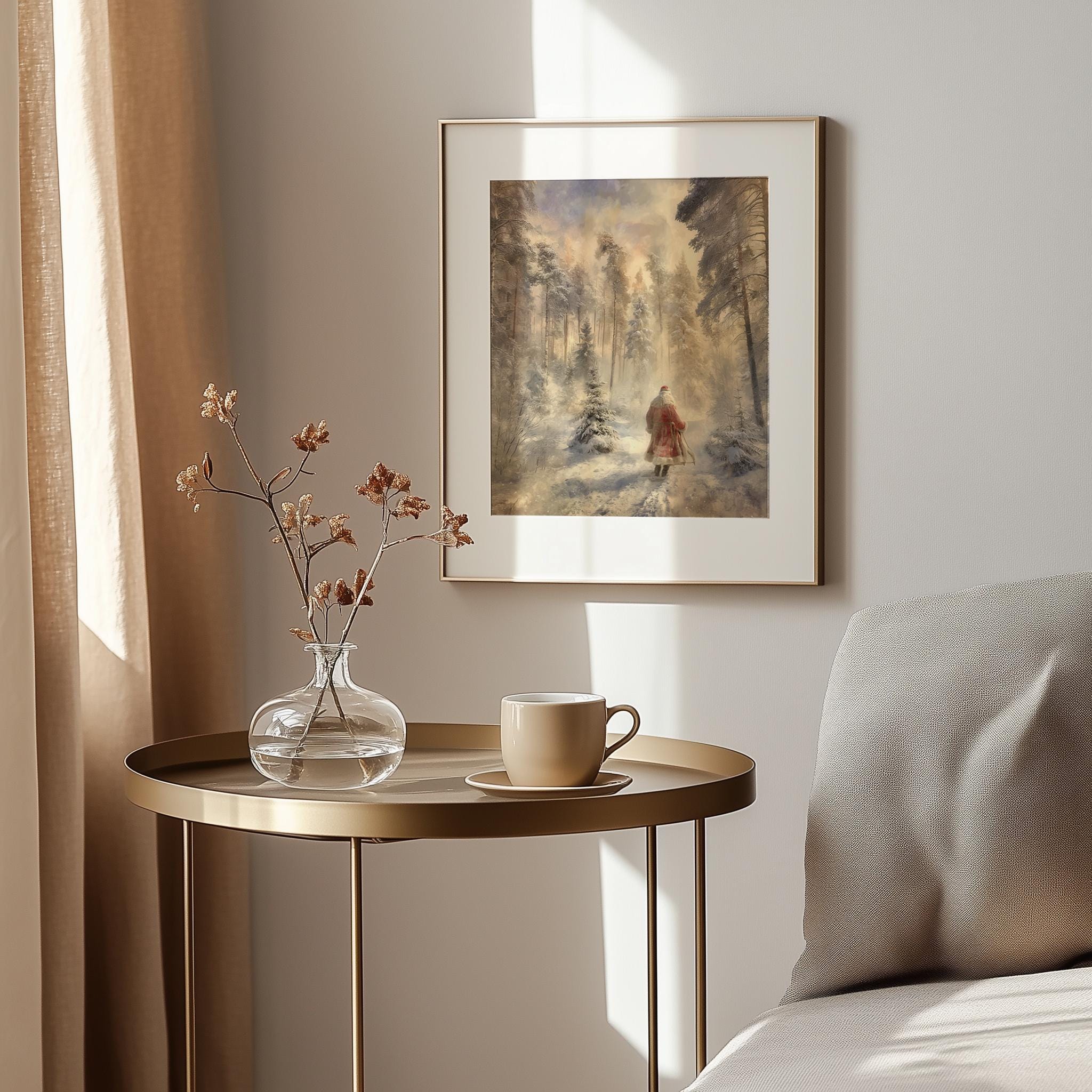 Immerse yourself in the charm of this rustic painting of Santa Claus meandering through a snowy forest landscape. An instantly downloadable print, it's perfect for elevating your decor with budget-friendly charm. This gives you the flexibility to customize the size, frame, and material according to your personal taste and space, ensuring a perfect fit for your walls.