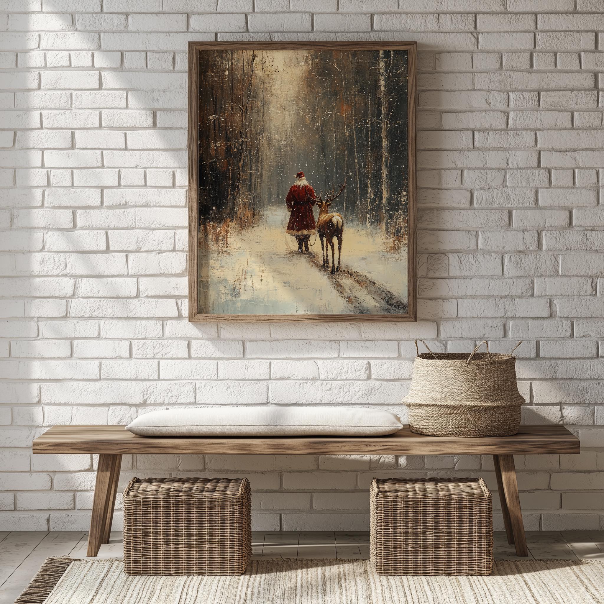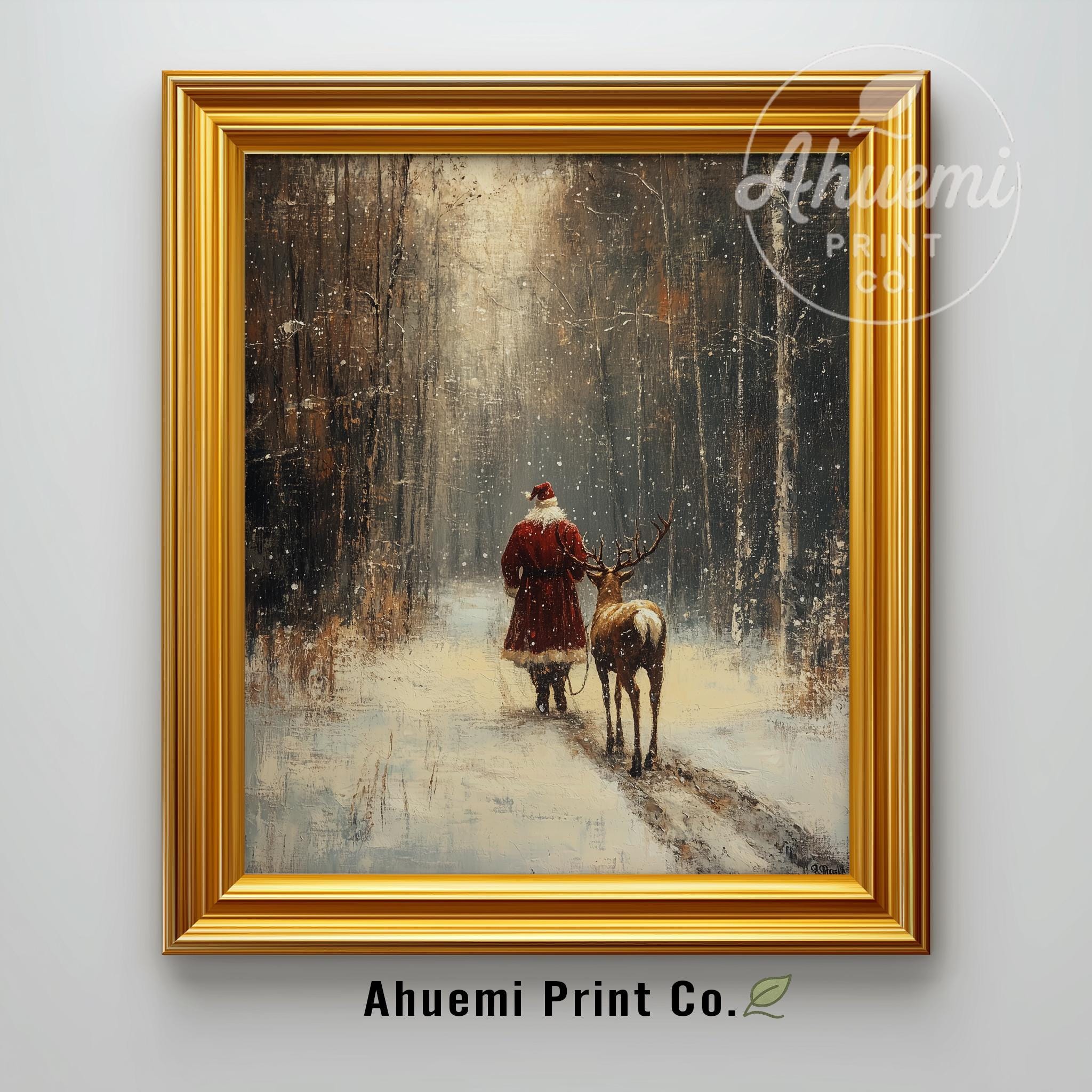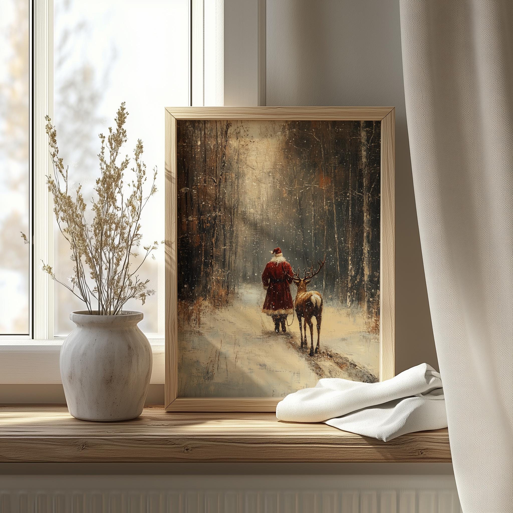 Immerse yourself in the charm of this rustic painting of a nostalgic Santa Claus and his playful reindeer frolicking in a snowy landscape. An instantly downloadable print, it's perfect for elevating your decor with budget-friendly charm. This gives you the flexibility to customize the size, frame, and material according to your personal taste and space, ensuring a perfect fit for your walls.