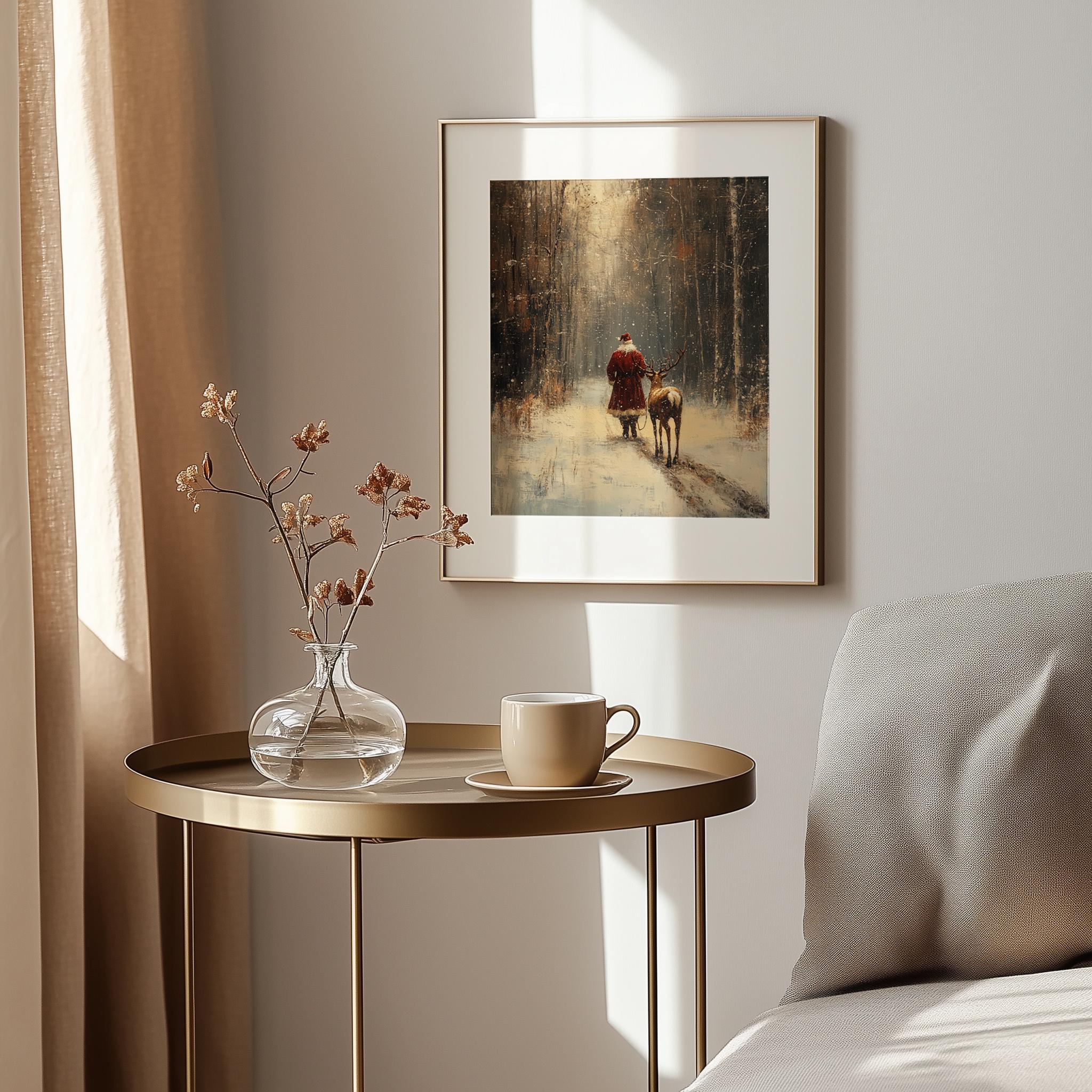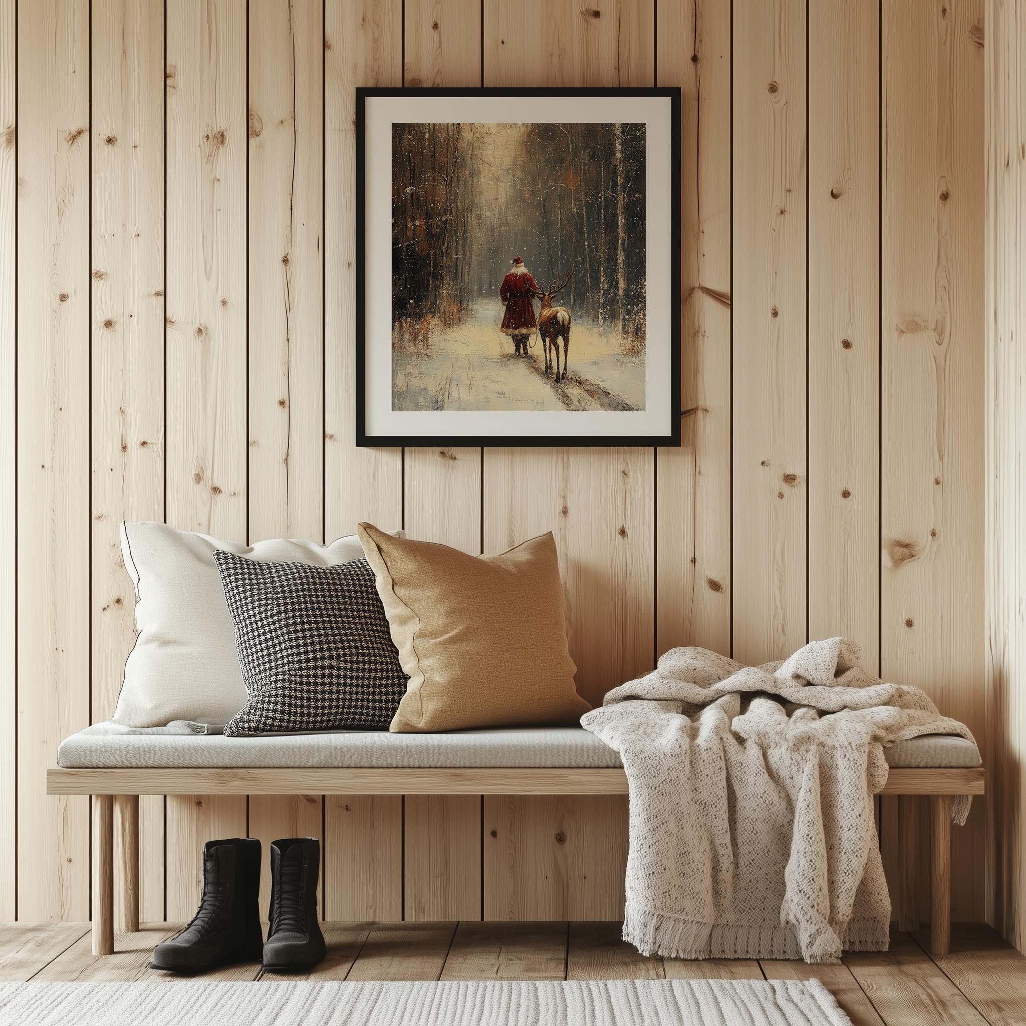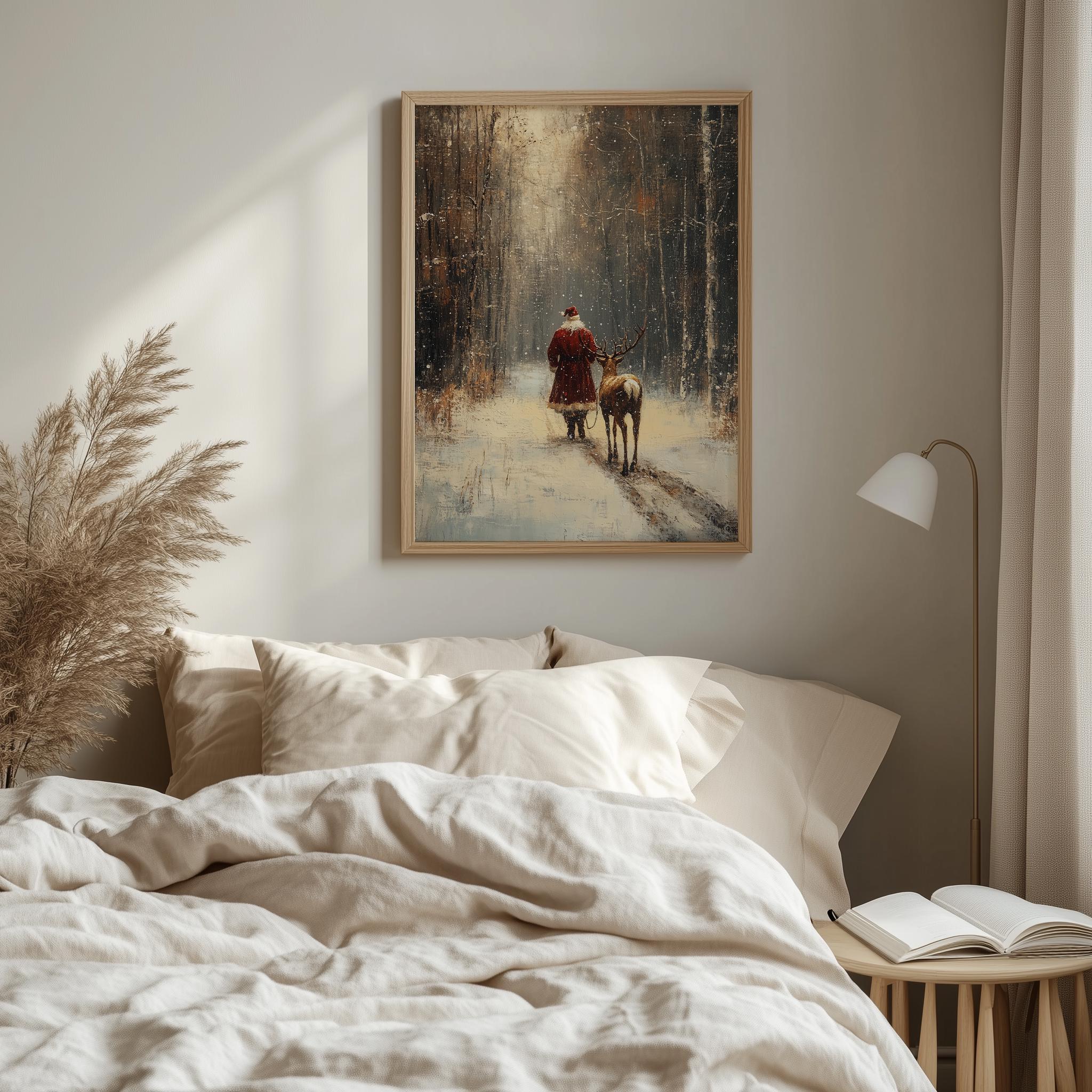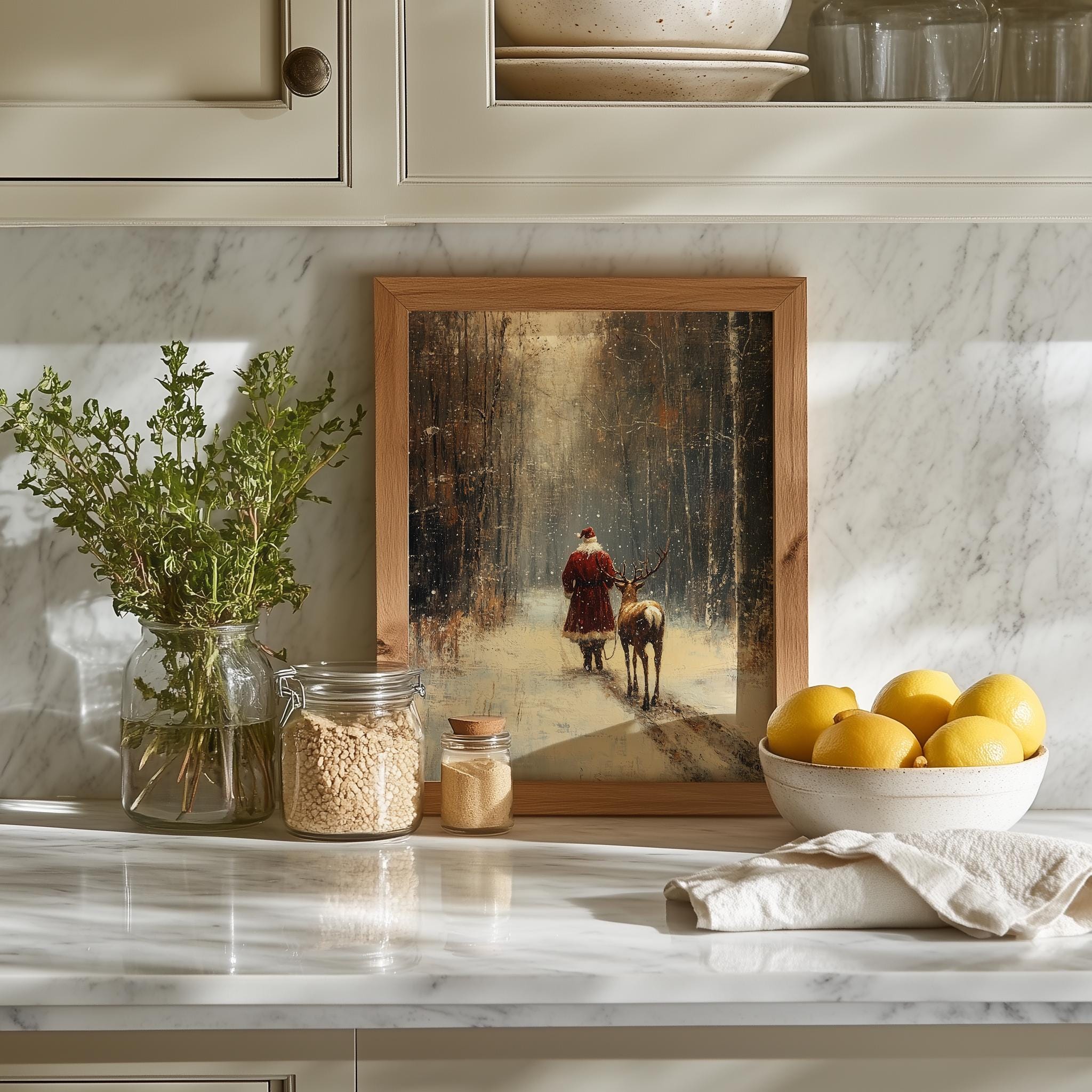 Immerse yourself in the charm of this rustic painting of a nostalgic Santa Claus and his playful reindeer frolicking in a snowy landscape. An instantly downloadable print, it's perfect for elevating your decor with budget-friendly charm. This gives you the flexibility to customize the size, frame, and material according to your personal taste and space, ensuring a perfect fit for your walls.