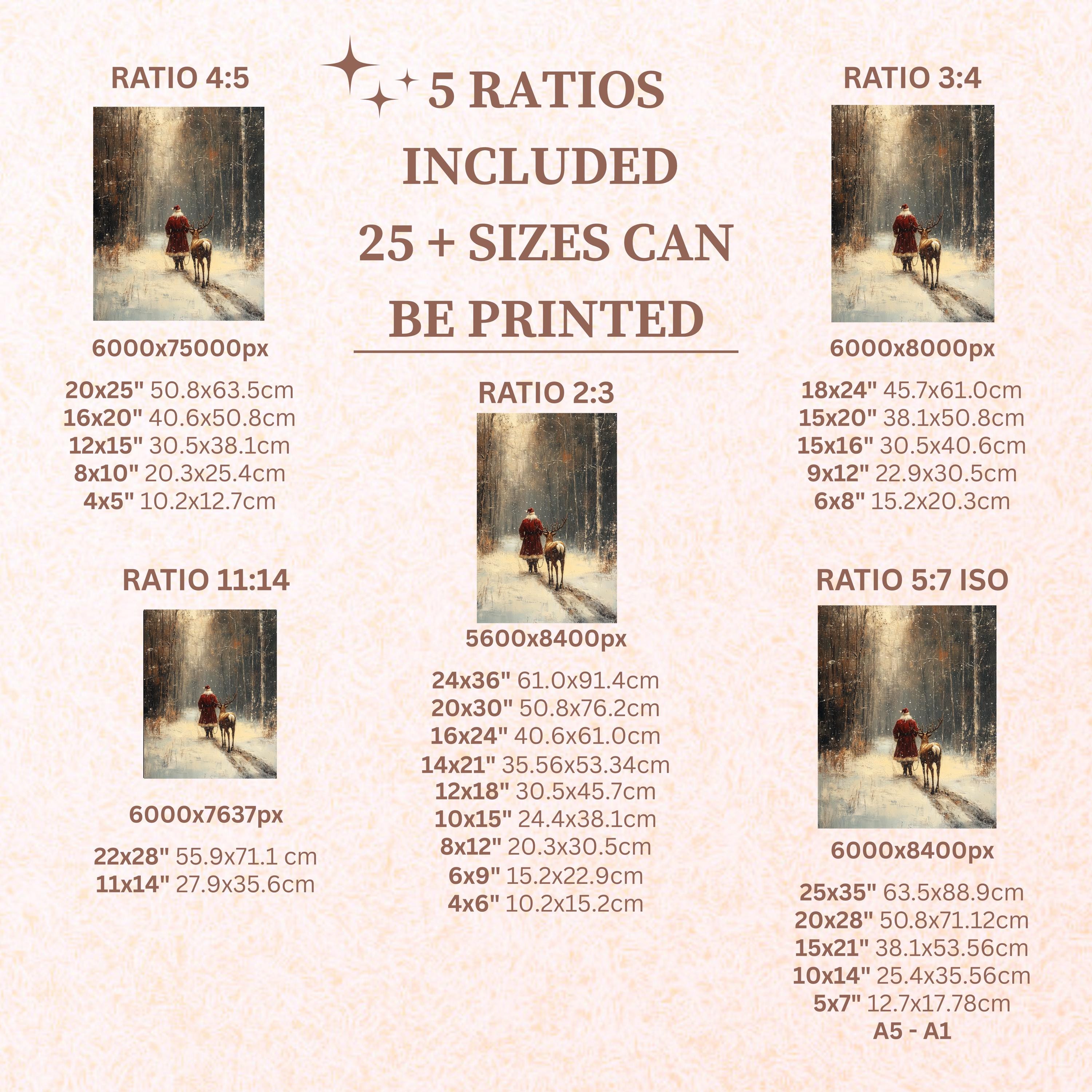 Each artwork includes 5 aspect ratios with 25+ print sizes. Most standard frames are covered. One custom resize per purchase available—message before ordering.