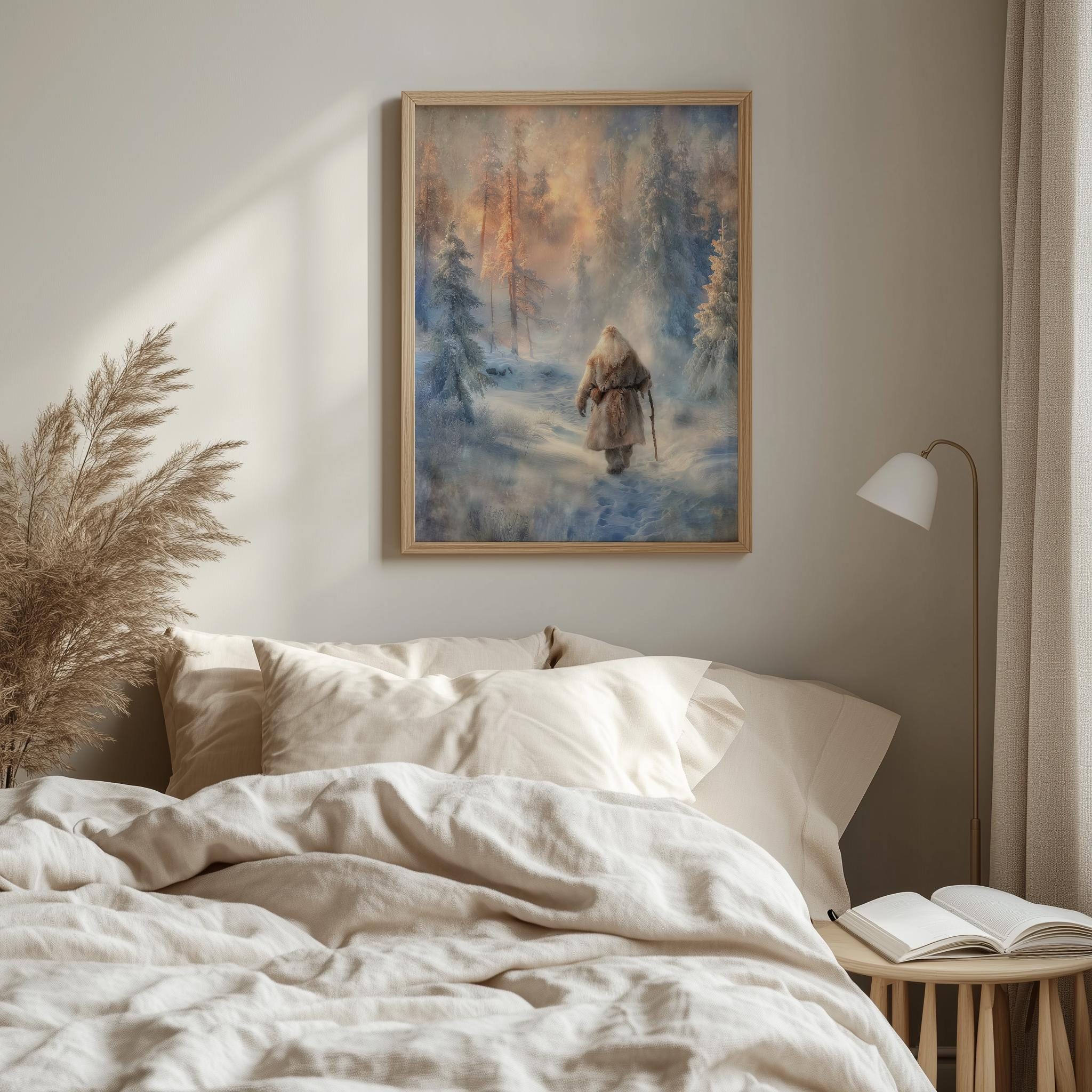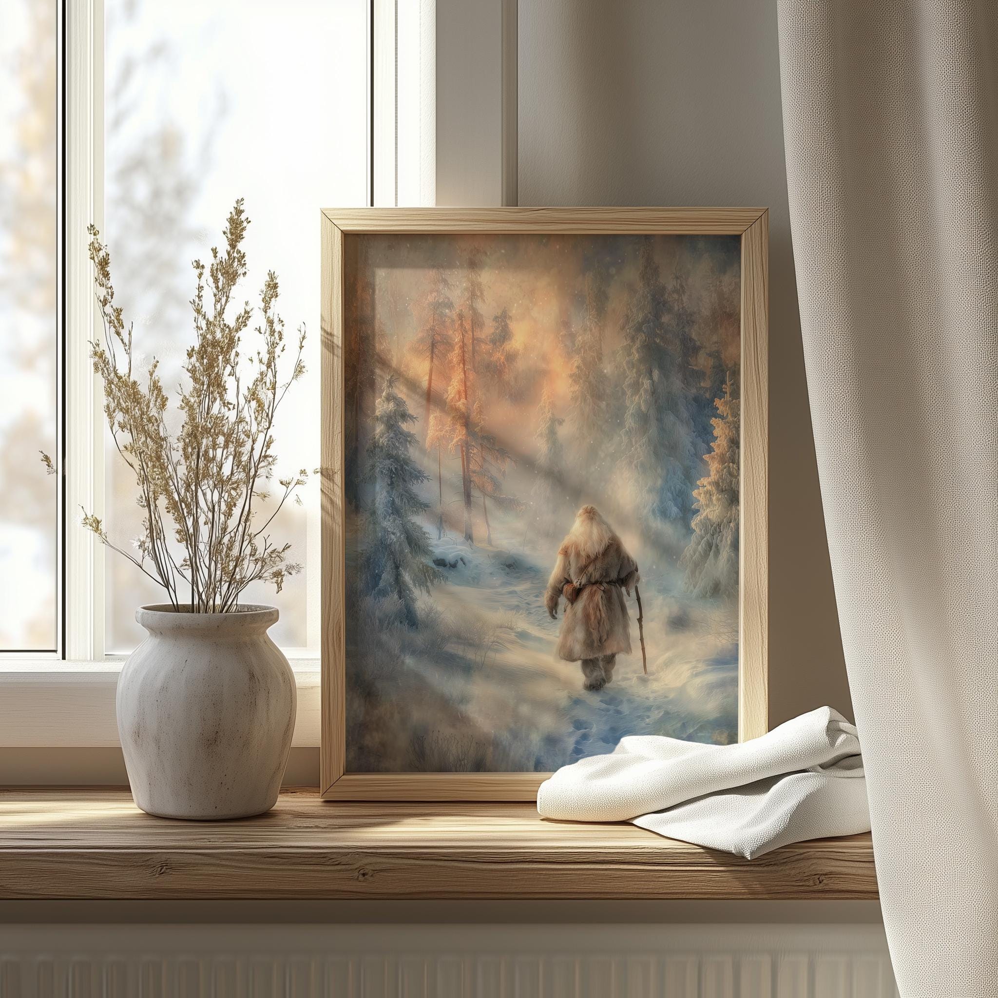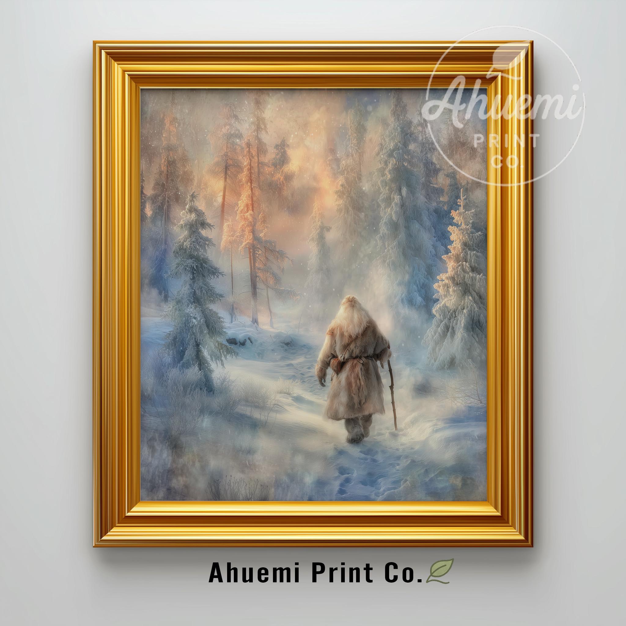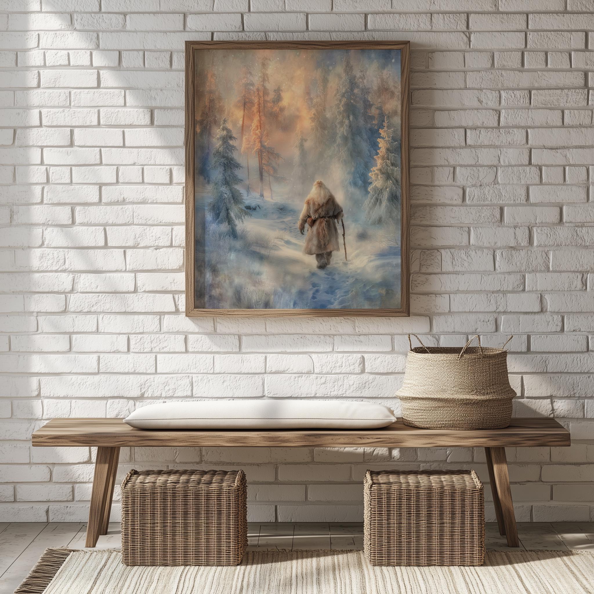 Immerse yourself in the charm of this rustic painting of a solitary Santa standing amidst a tranquil snowy landscape. An instantly downloadable print, it's perfect for elevating your decor with budget-friendly charm. This gives you the flexibility to customize the size, frame, and material according to your personal taste and space, ensuring a perfect fit for your walls.