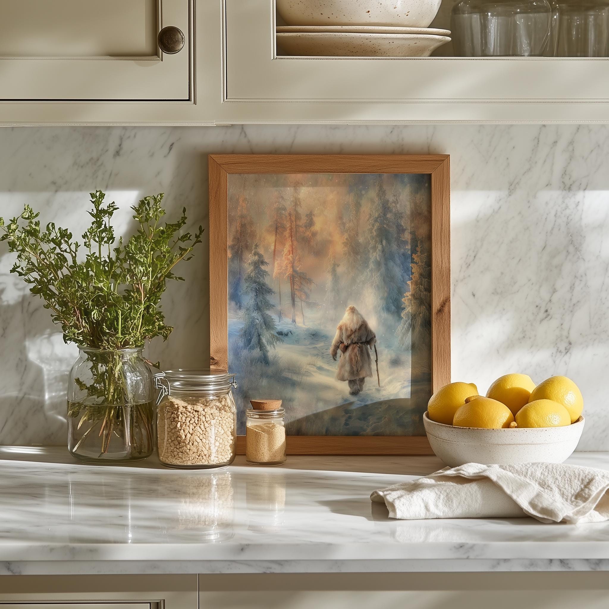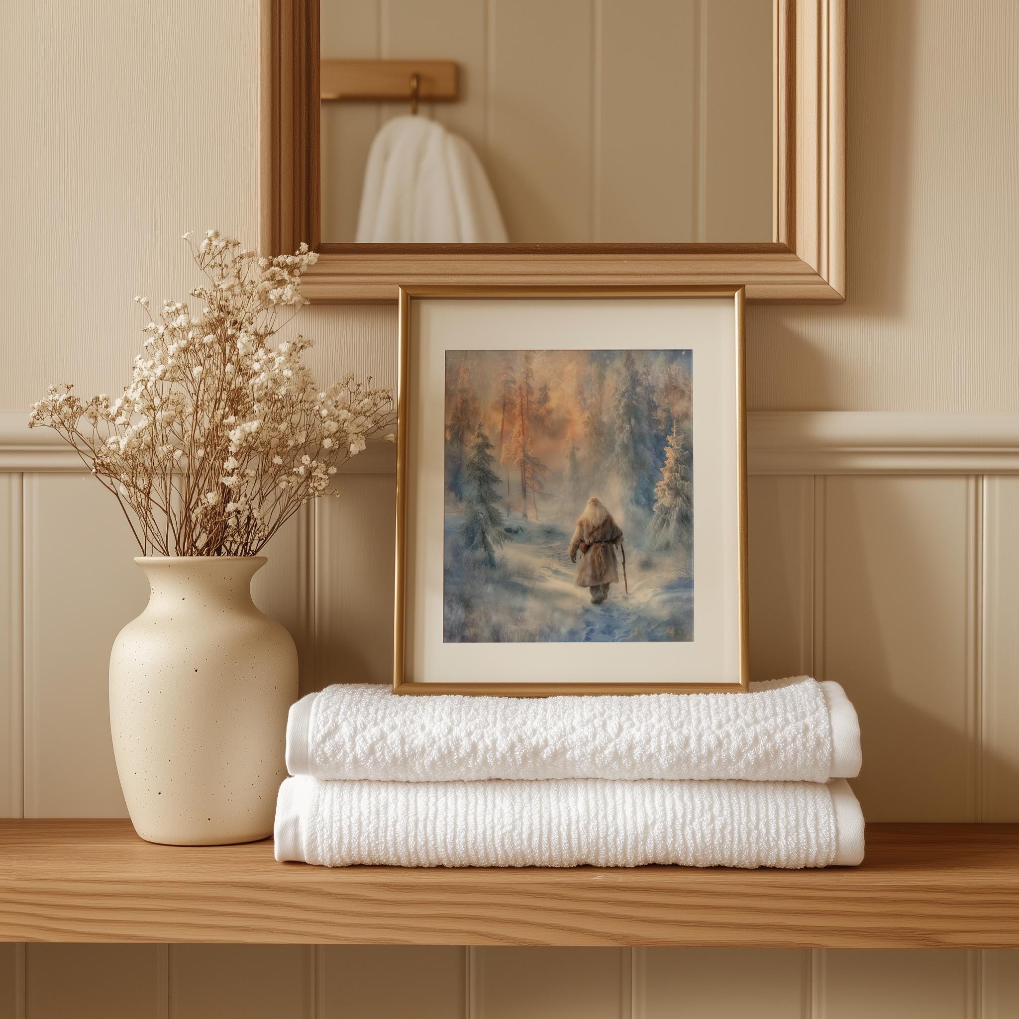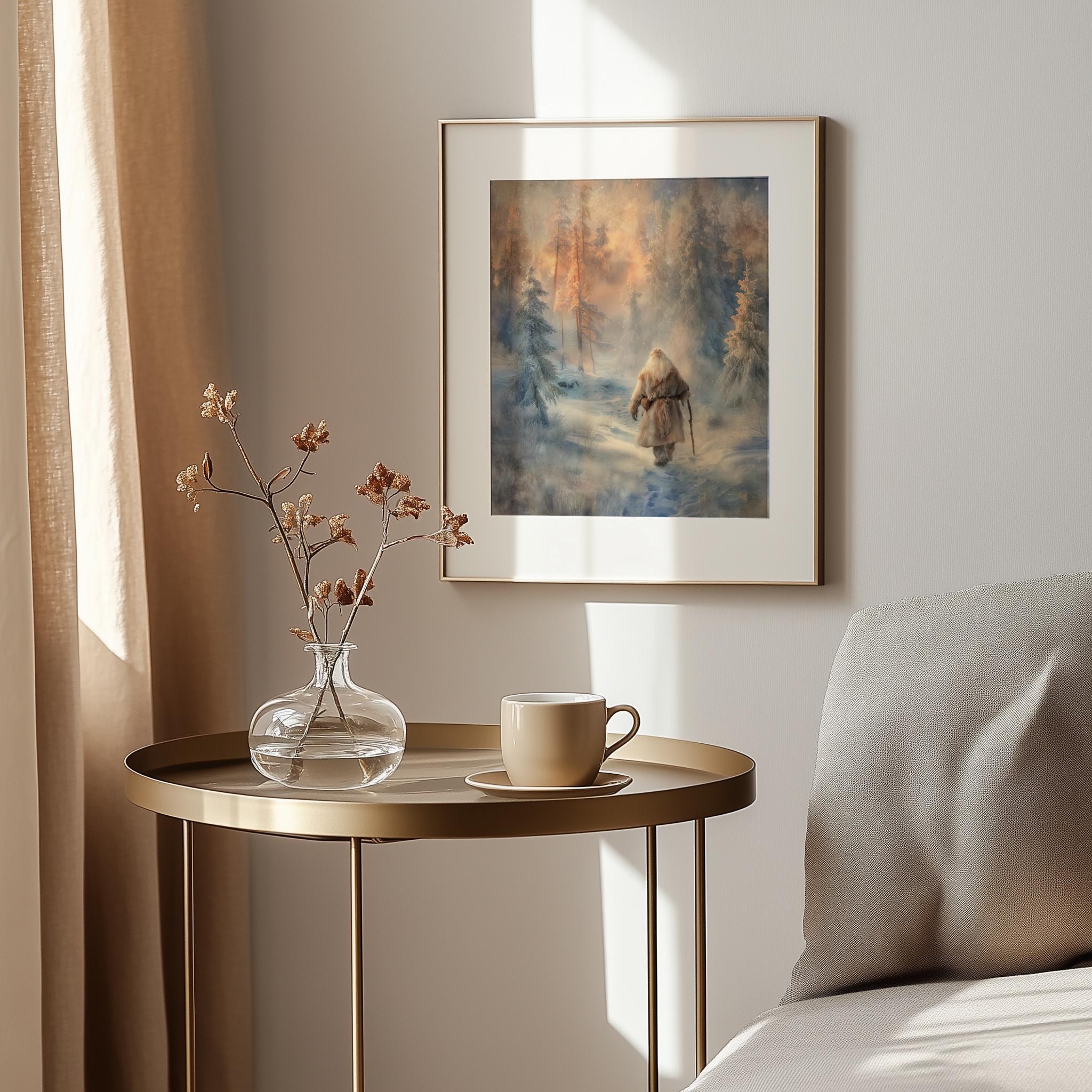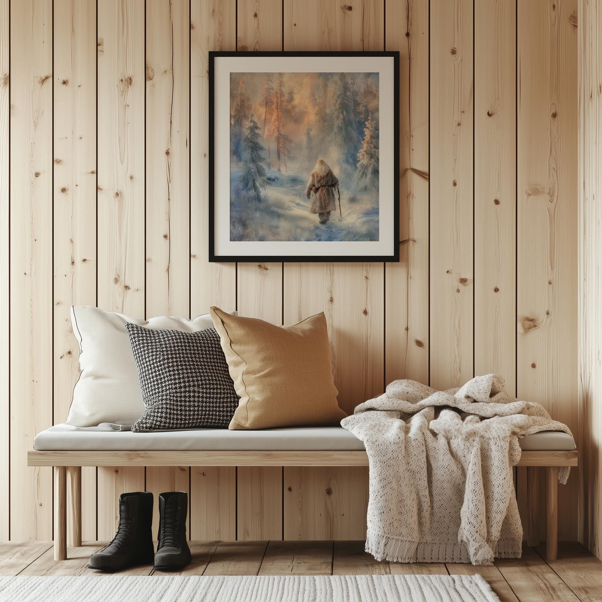 Immerse yourself in the charm of this rustic painting of a solitary Santa standing amidst a tranquil snowy landscape. An instantly downloadable print, it's perfect for elevating your decor with budget-friendly charm. This gives you the flexibility to customize the size, frame, and material according to your personal taste and space, ensuring a perfect fit for your walls.