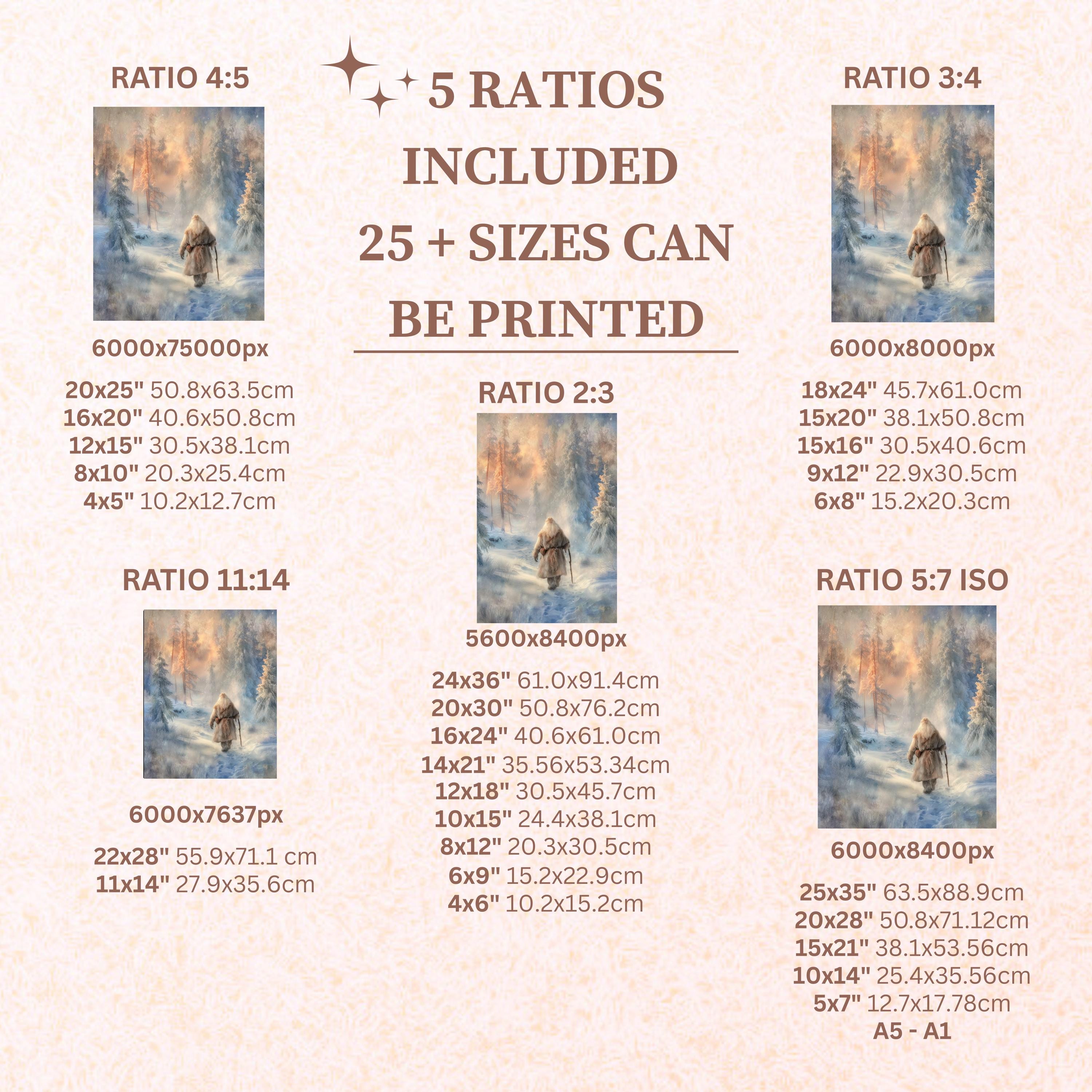 Each artwork includes 5 aspect ratios with 25+ print sizes. Most standard frames are covered. One custom resize per purchase available—message before ordering.