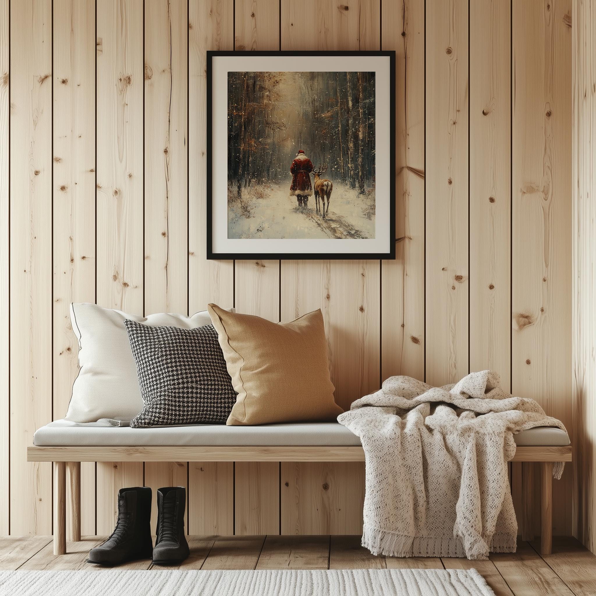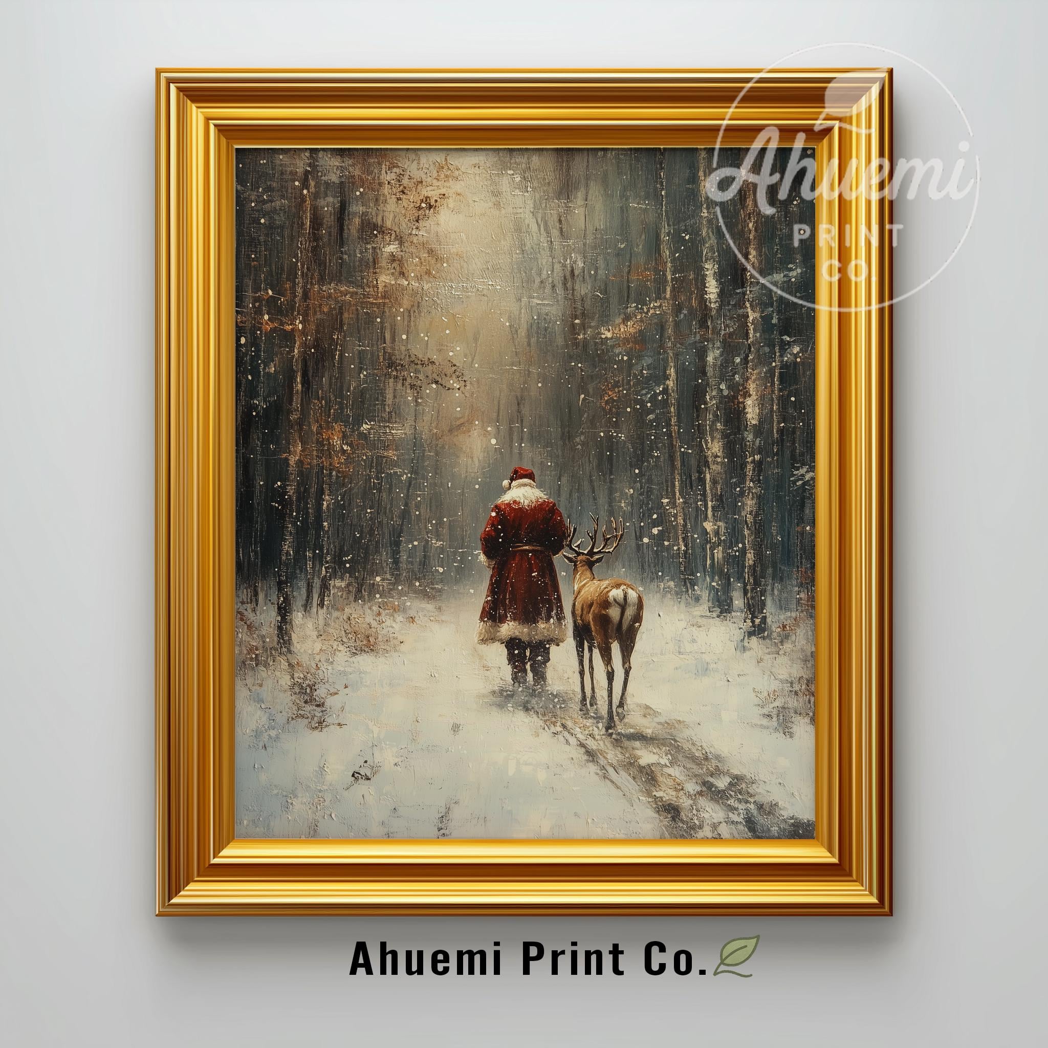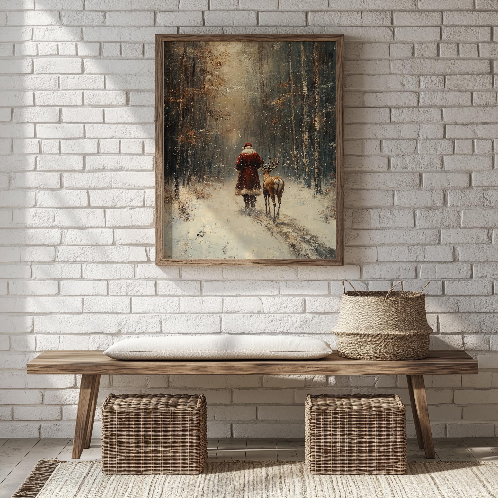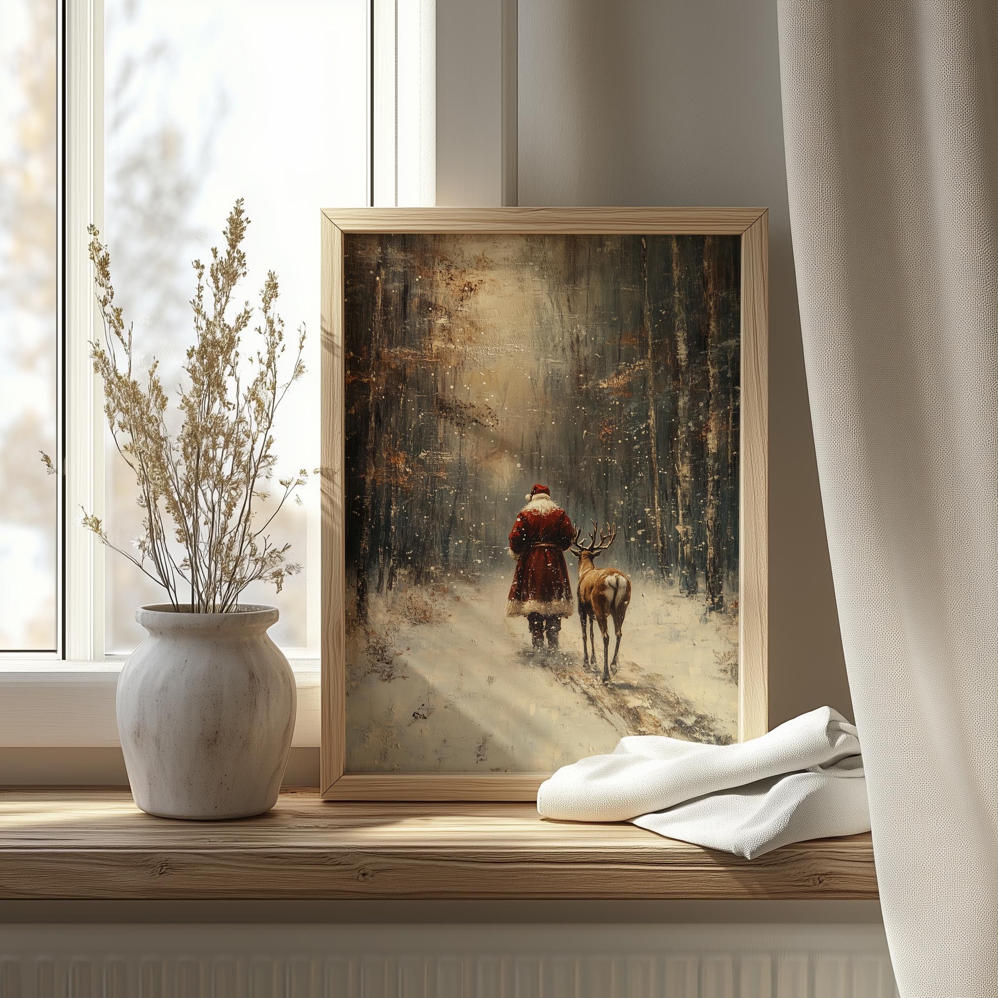 Immerse yourself in the charm of this rustic painting of a vintage Santa Claus and his reindeer in a serene snowy forest. An instantly downloadable print, it's perfect for elevating your decor with budget-friendly charm. This gives you the flexibility to customize the size, frame, and material according to your personal taste and space, ensuring a perfect fit for your walls.