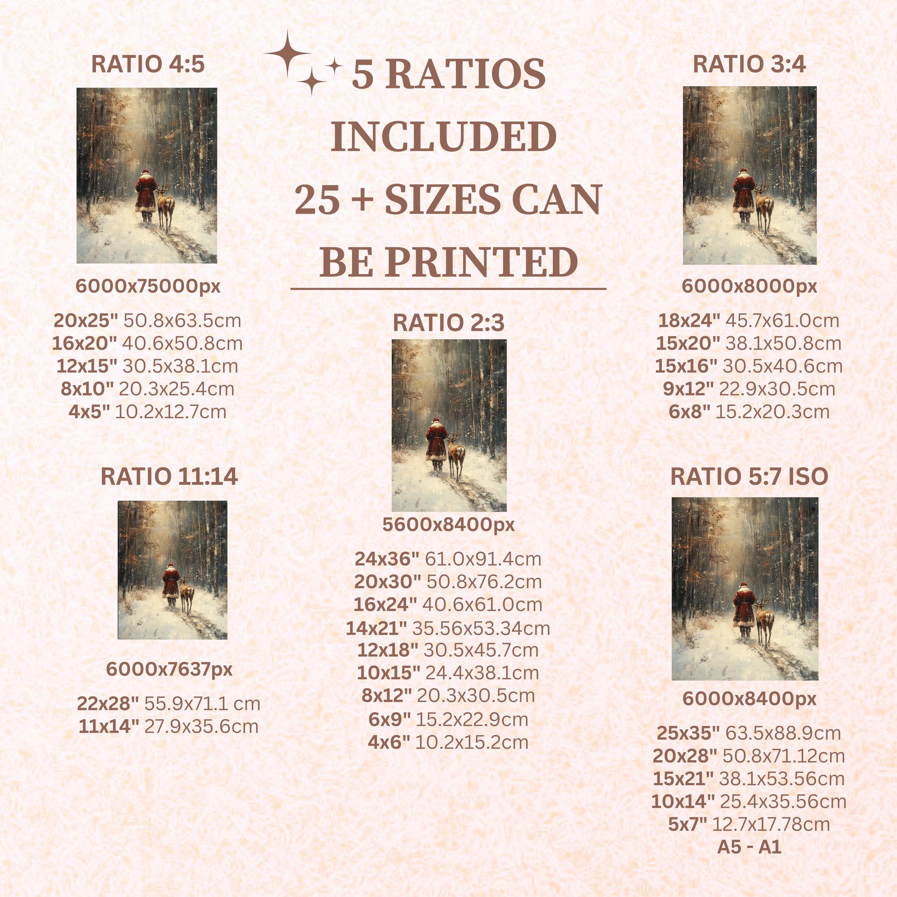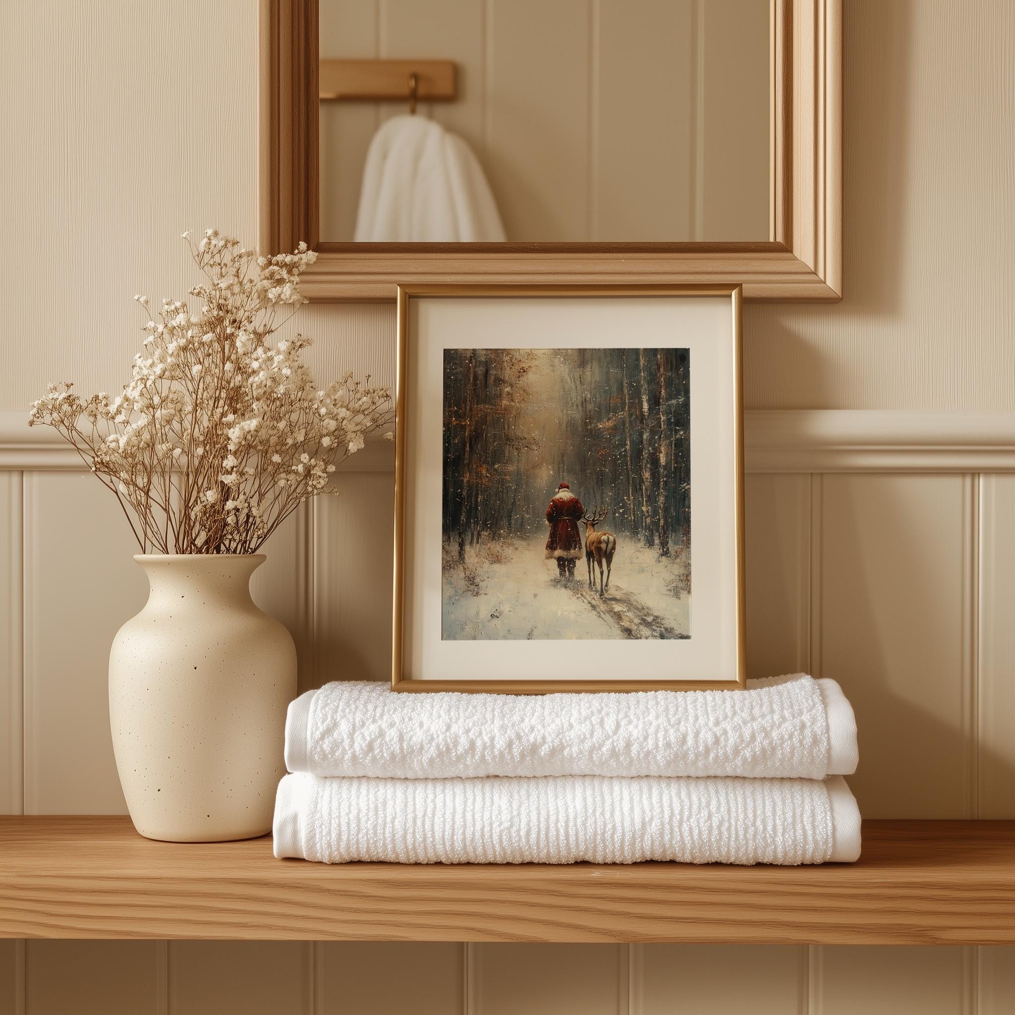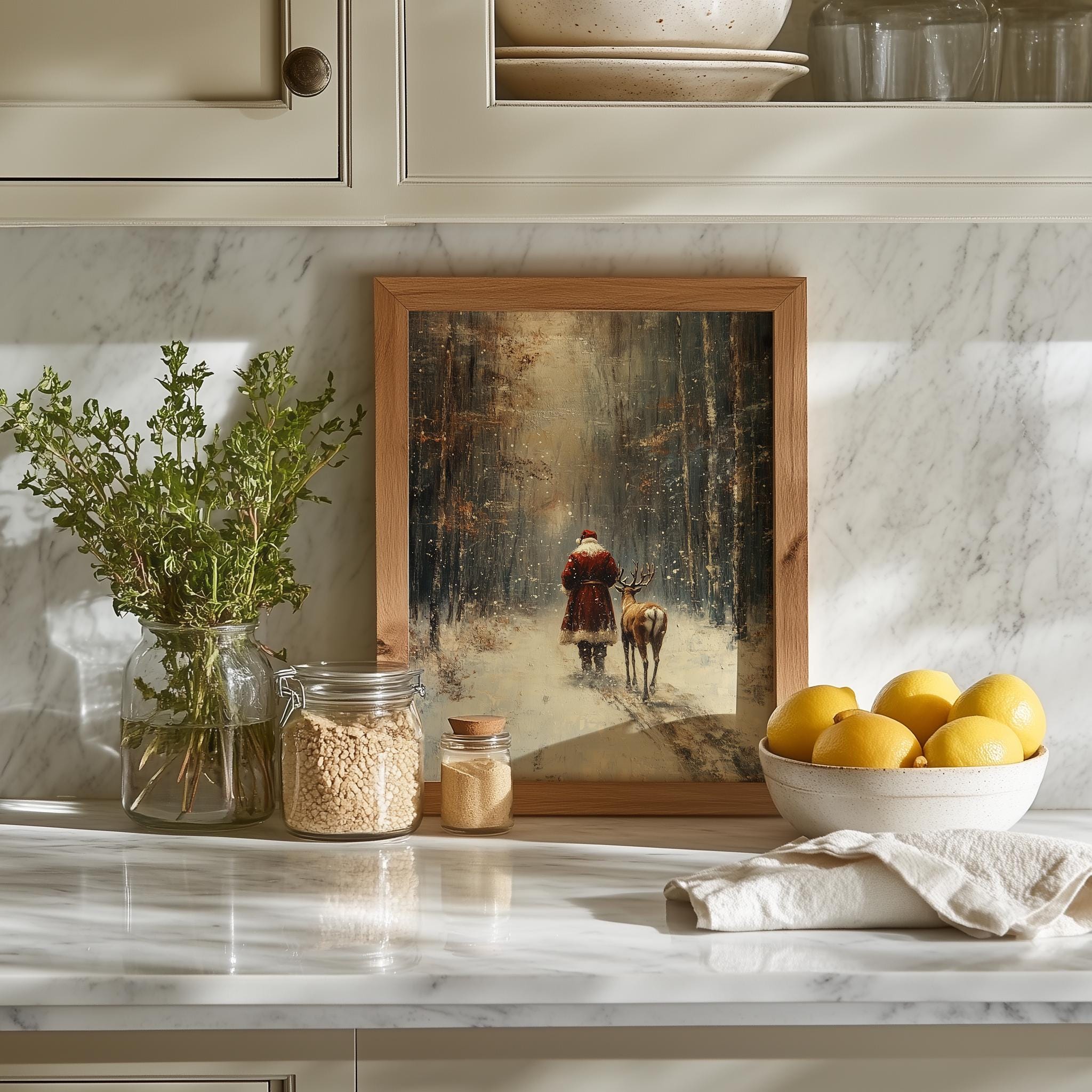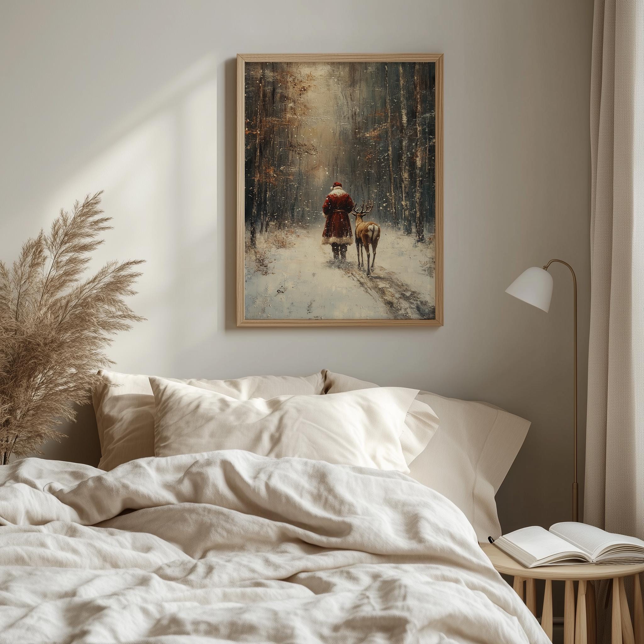 Immerse yourself in the charm of this rustic painting of a vintage Santa Claus and his reindeer in a serene snowy forest. An instantly downloadable print, it's perfect for elevating your decor with budget-friendly charm. This gives you the flexibility to customize the size, frame, and material according to your personal taste and space, ensuring a perfect fit for your walls.
