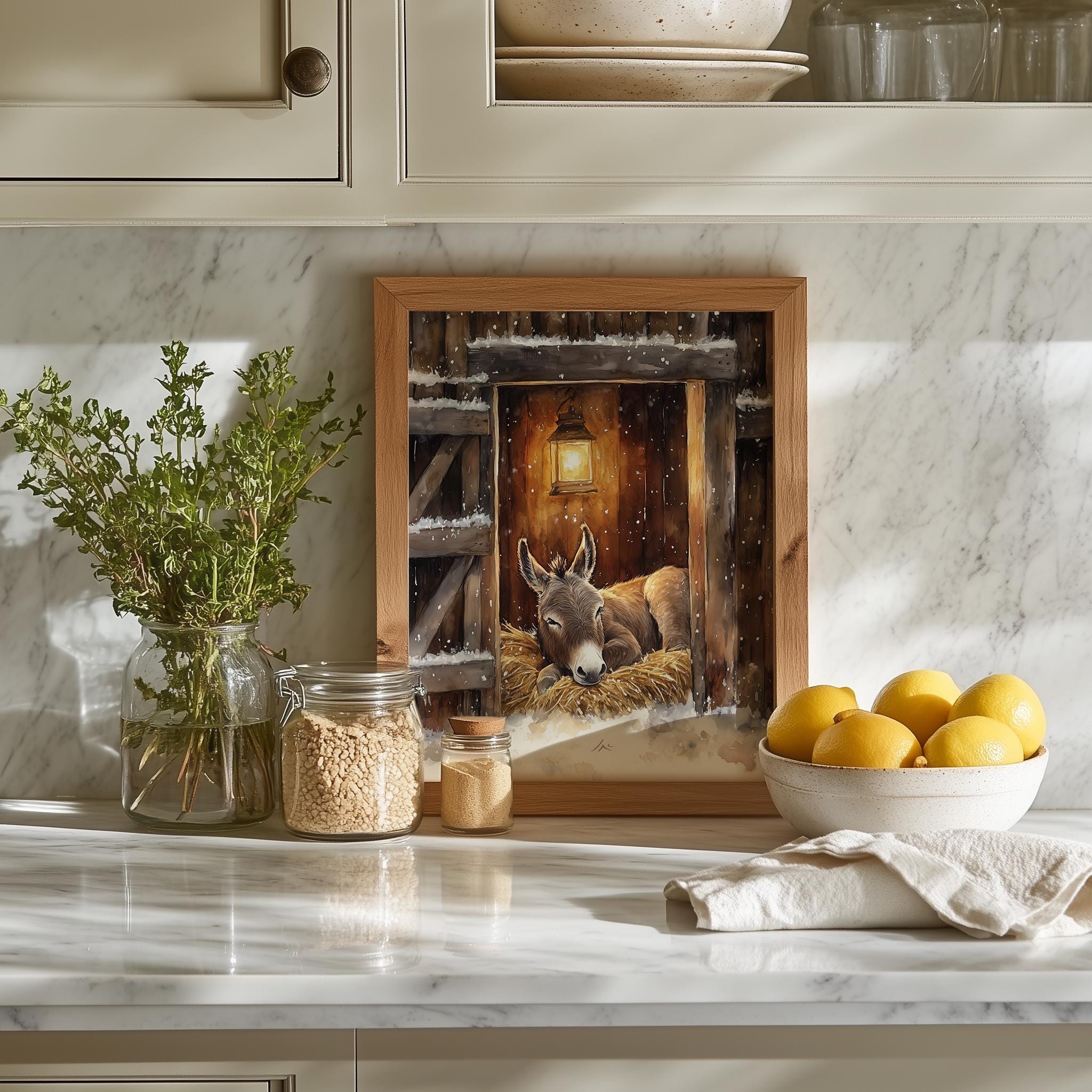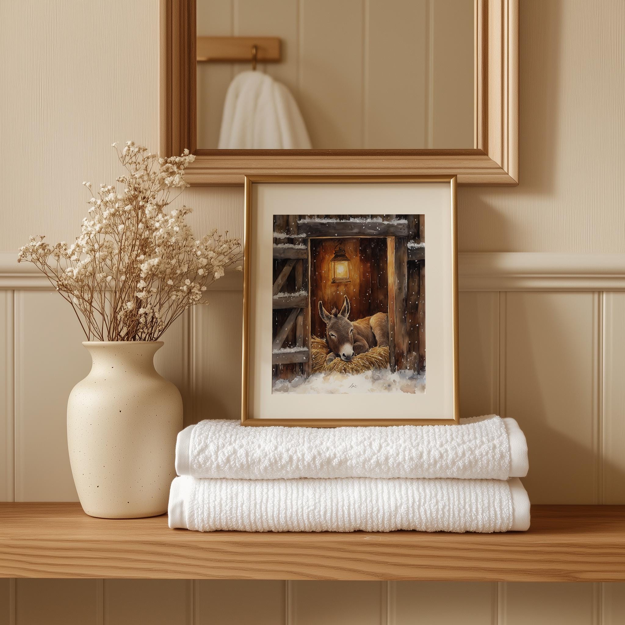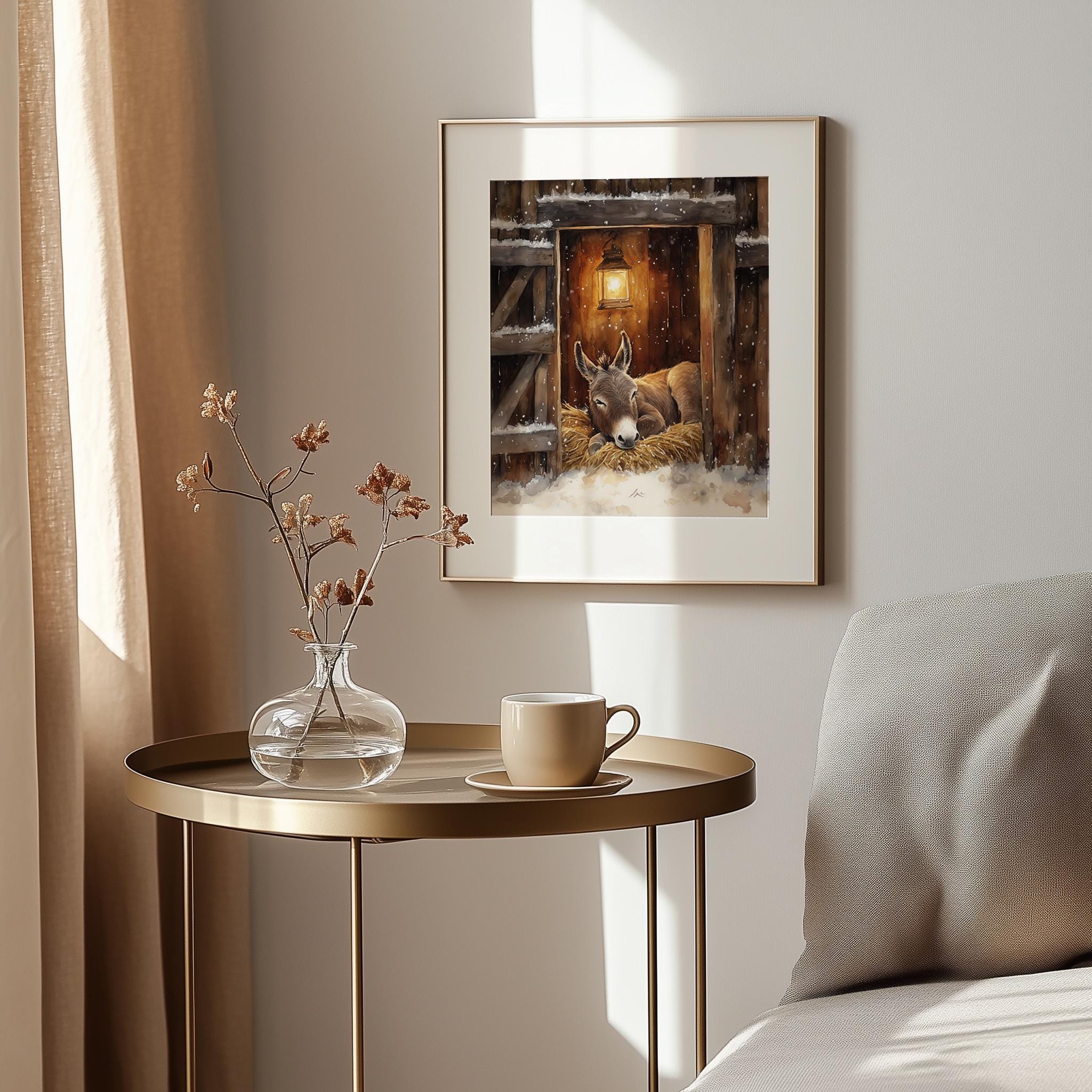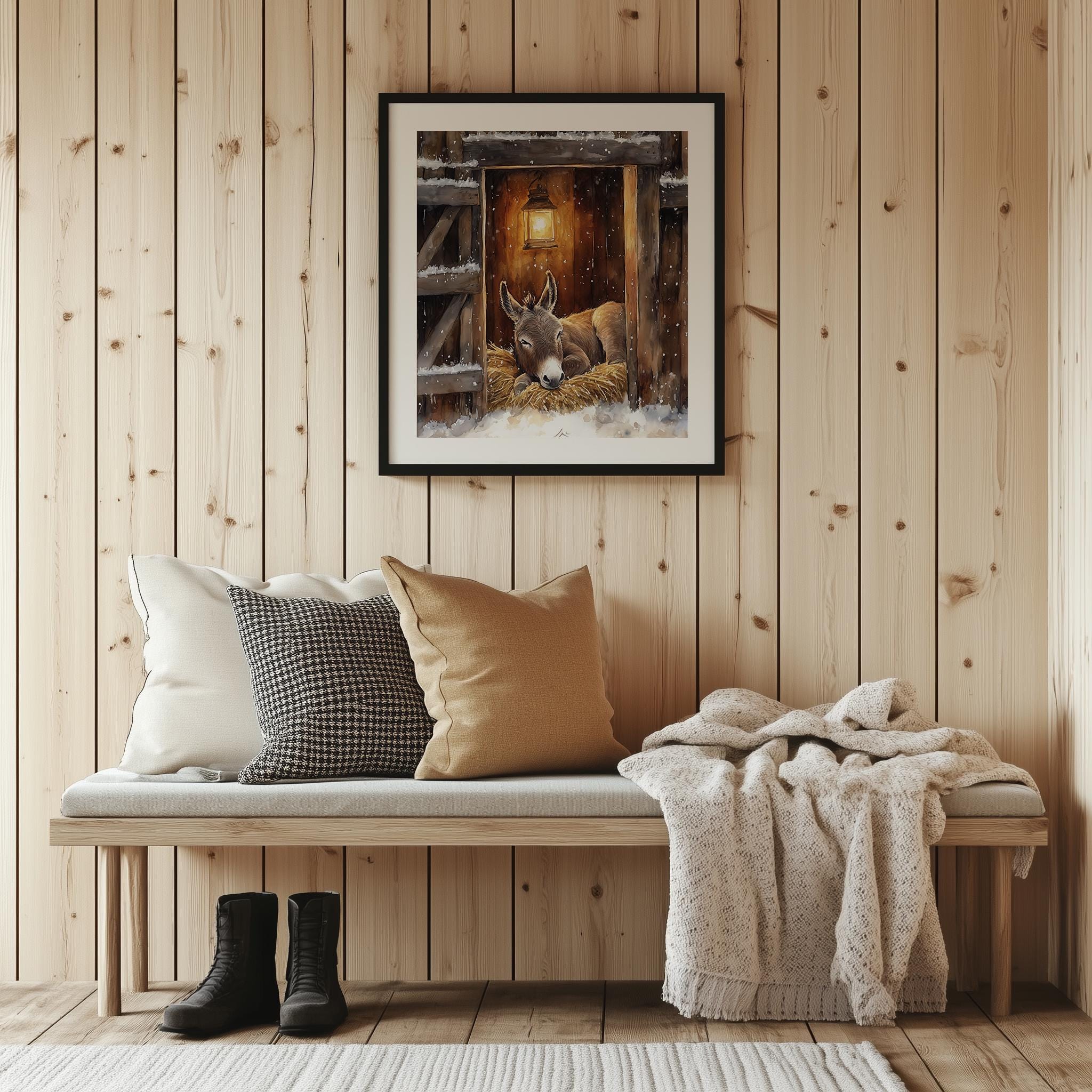Immerse yourself in the charm of this rustic painting of a serene donkey resting in a cozy stable. An instantly downloadable print, it's perfect for elevating your decor with budget-friendly charm. This gives you the flexibility to customize the size, frame, and material according to your personal taste and space, ensuring a perfect fit for your walls.