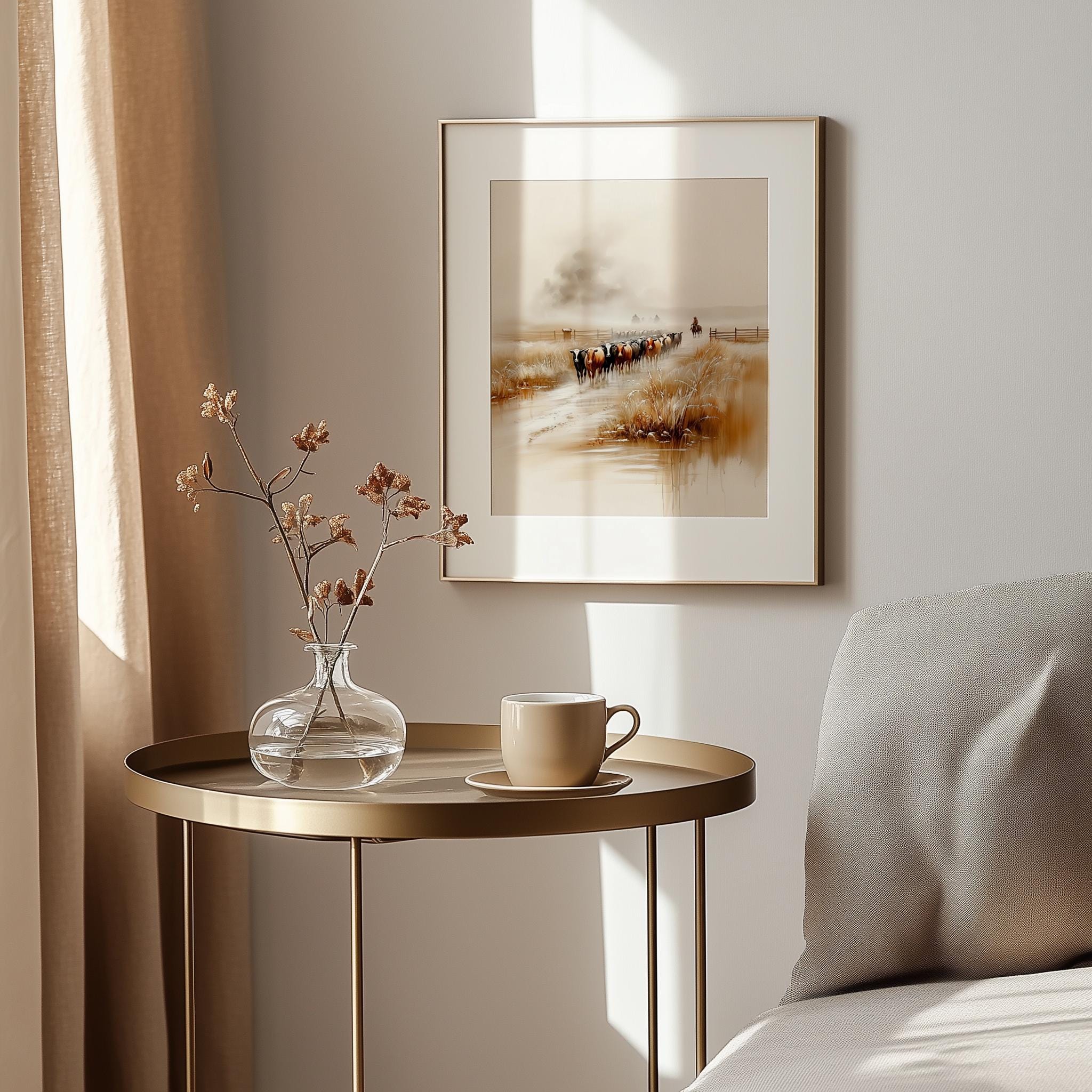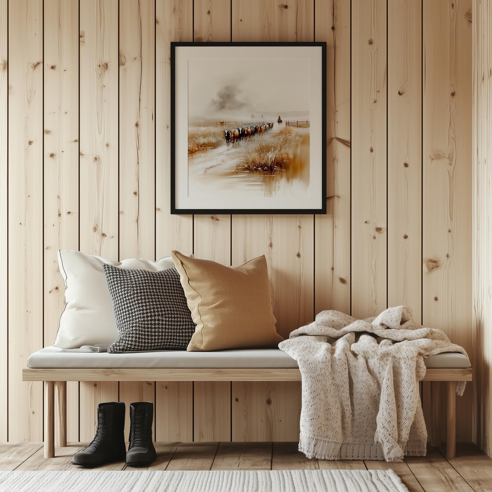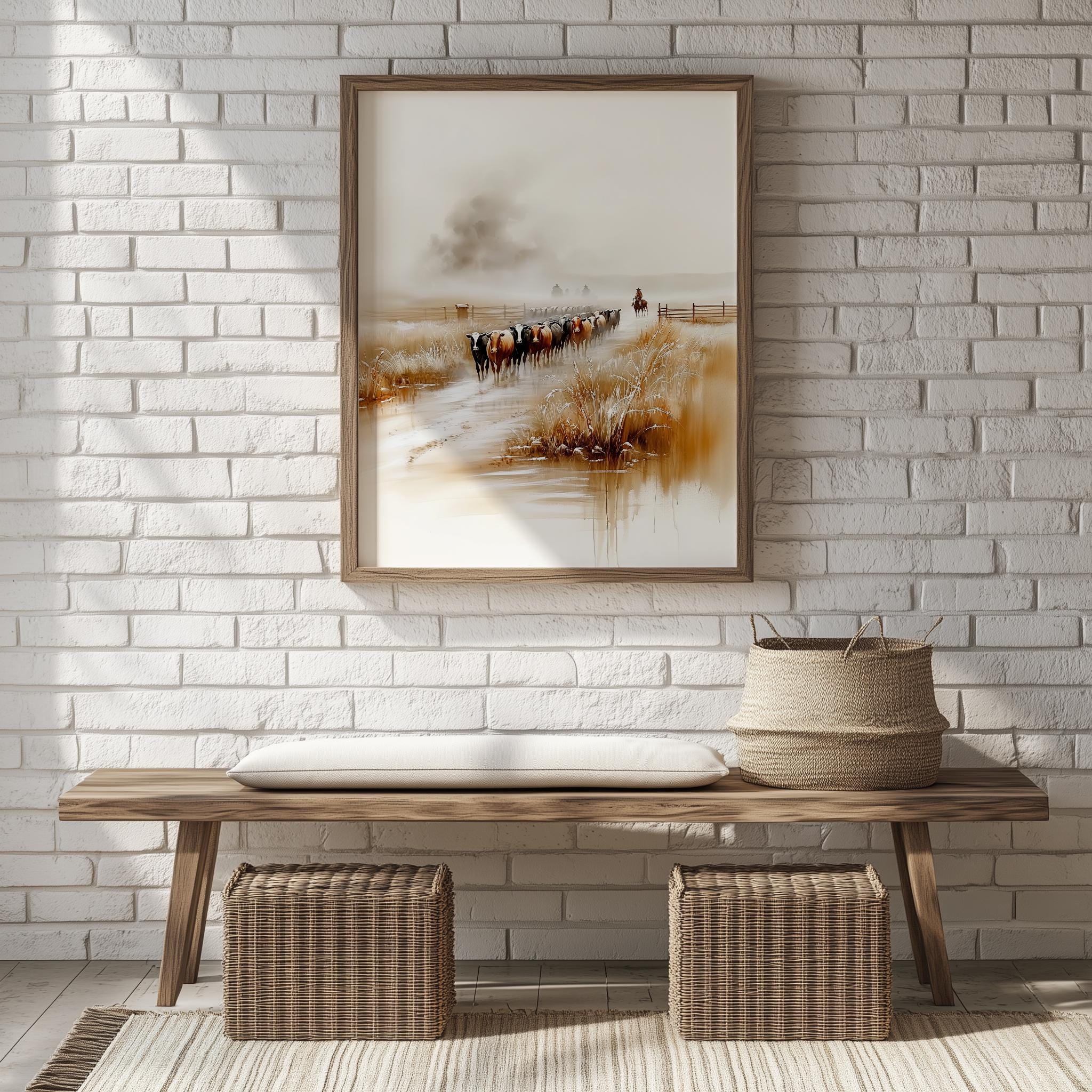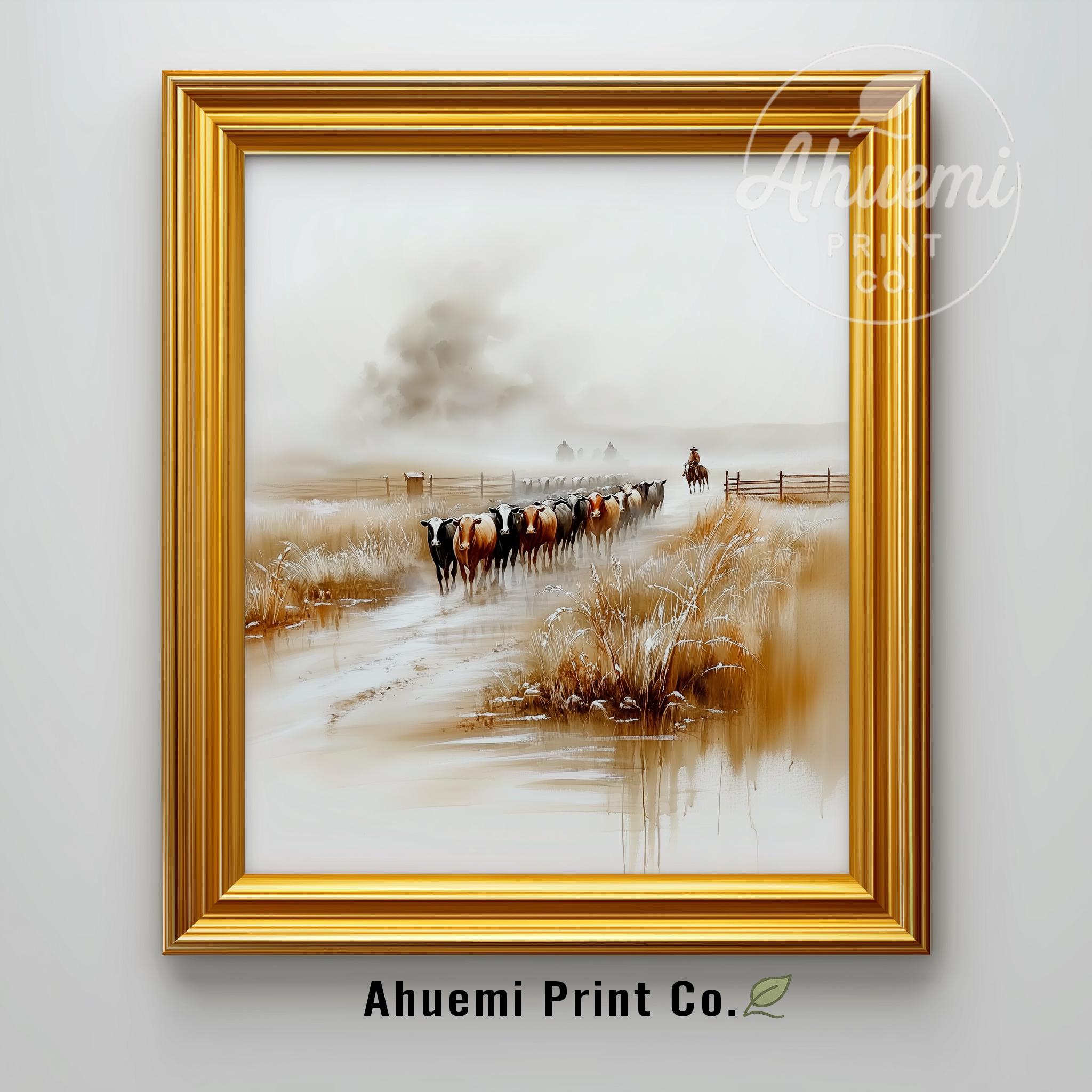 Immerse yourself in the charm of this rustic painting of a tranquil cattle drive featuring Black Angus and Hereford cattle. An instantly downloadable print, it's perfect for elevating your decor with budget-friendly charm. This gives you the flexibility to customize the size, frame, and material according to your personal taste and space, ensuring a perfect fit for your walls.