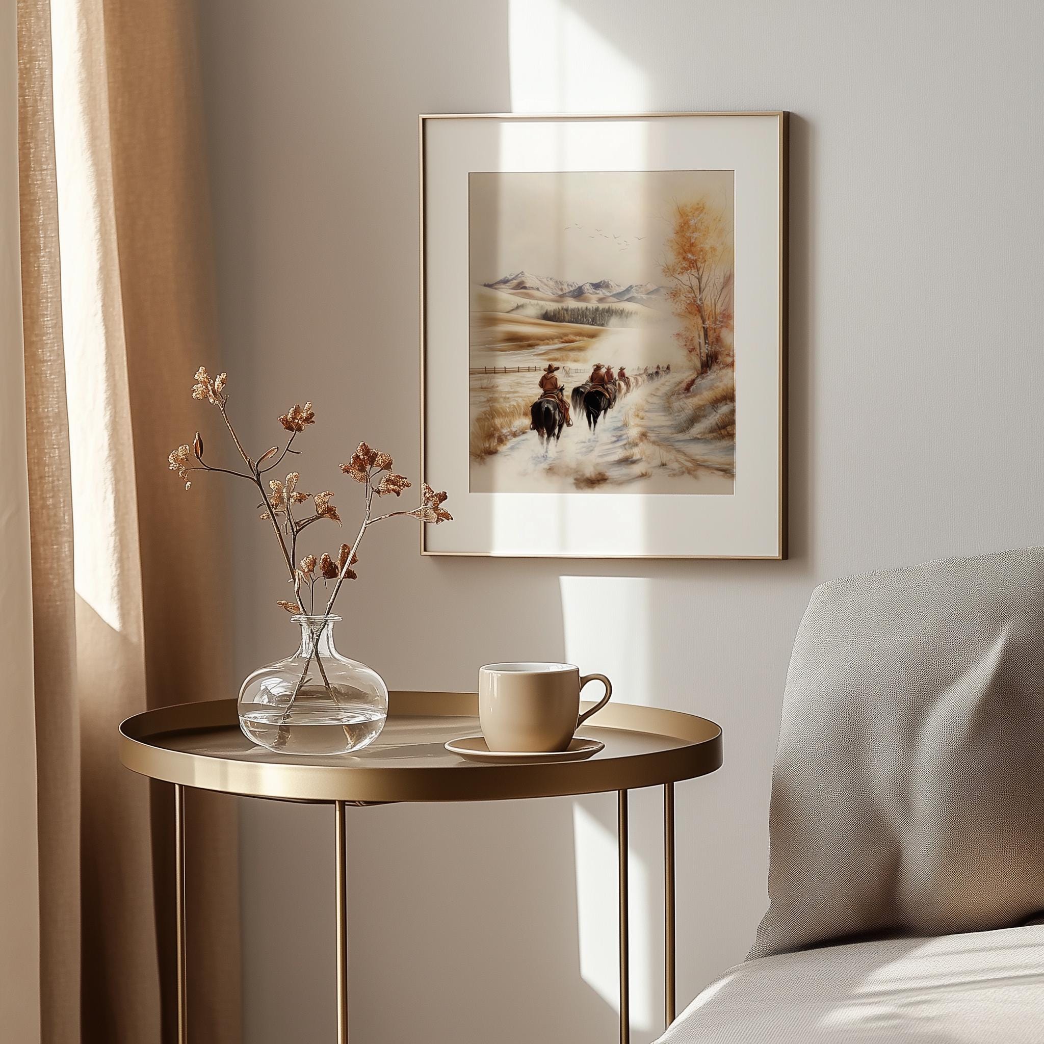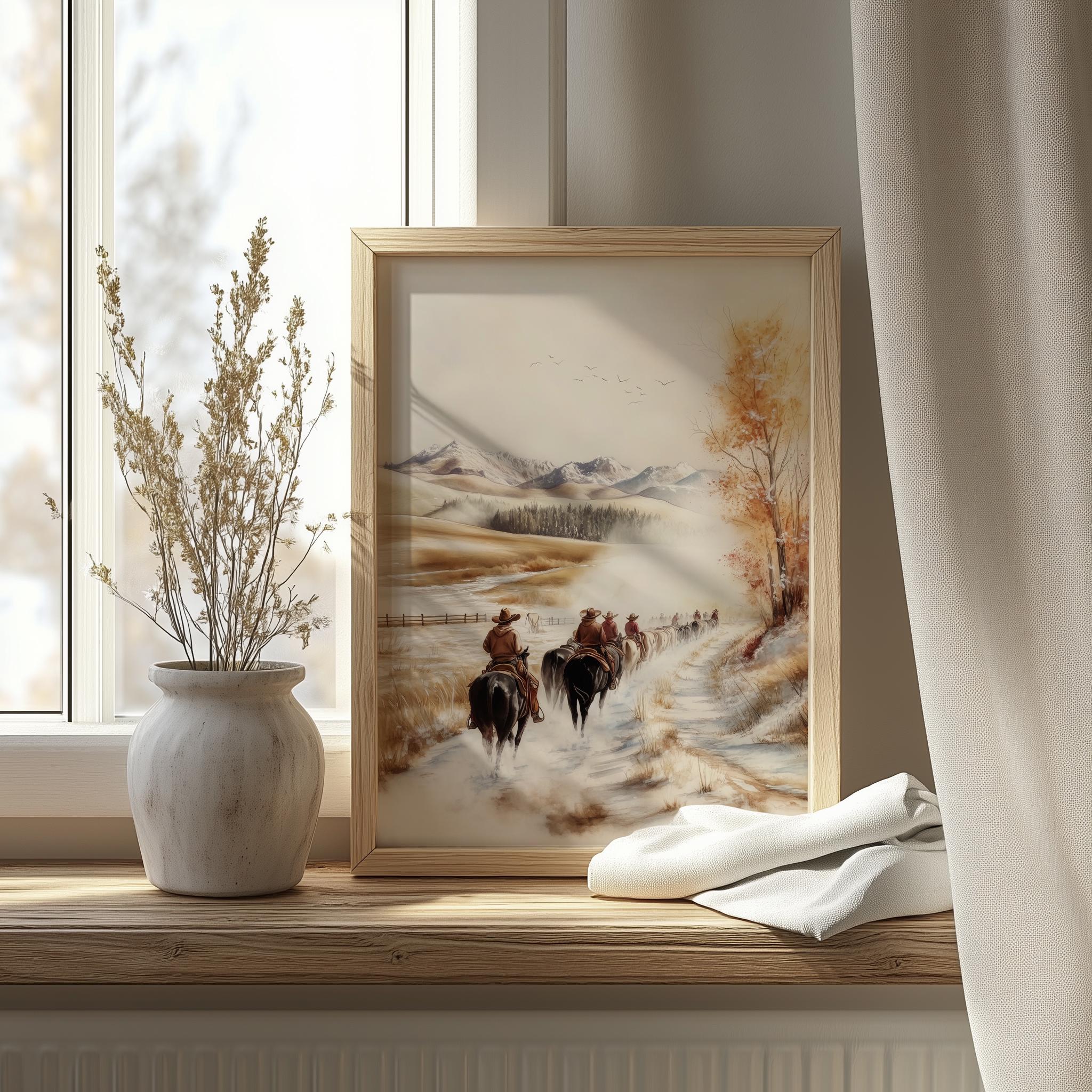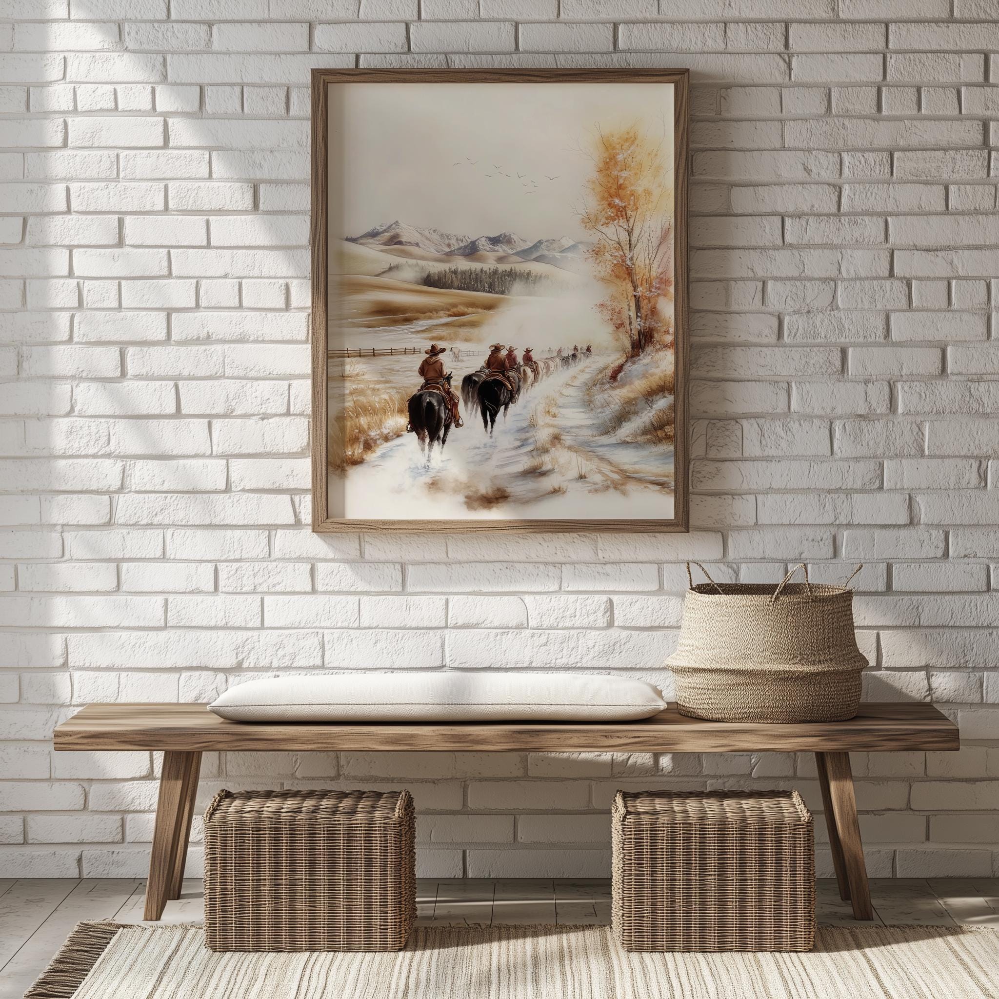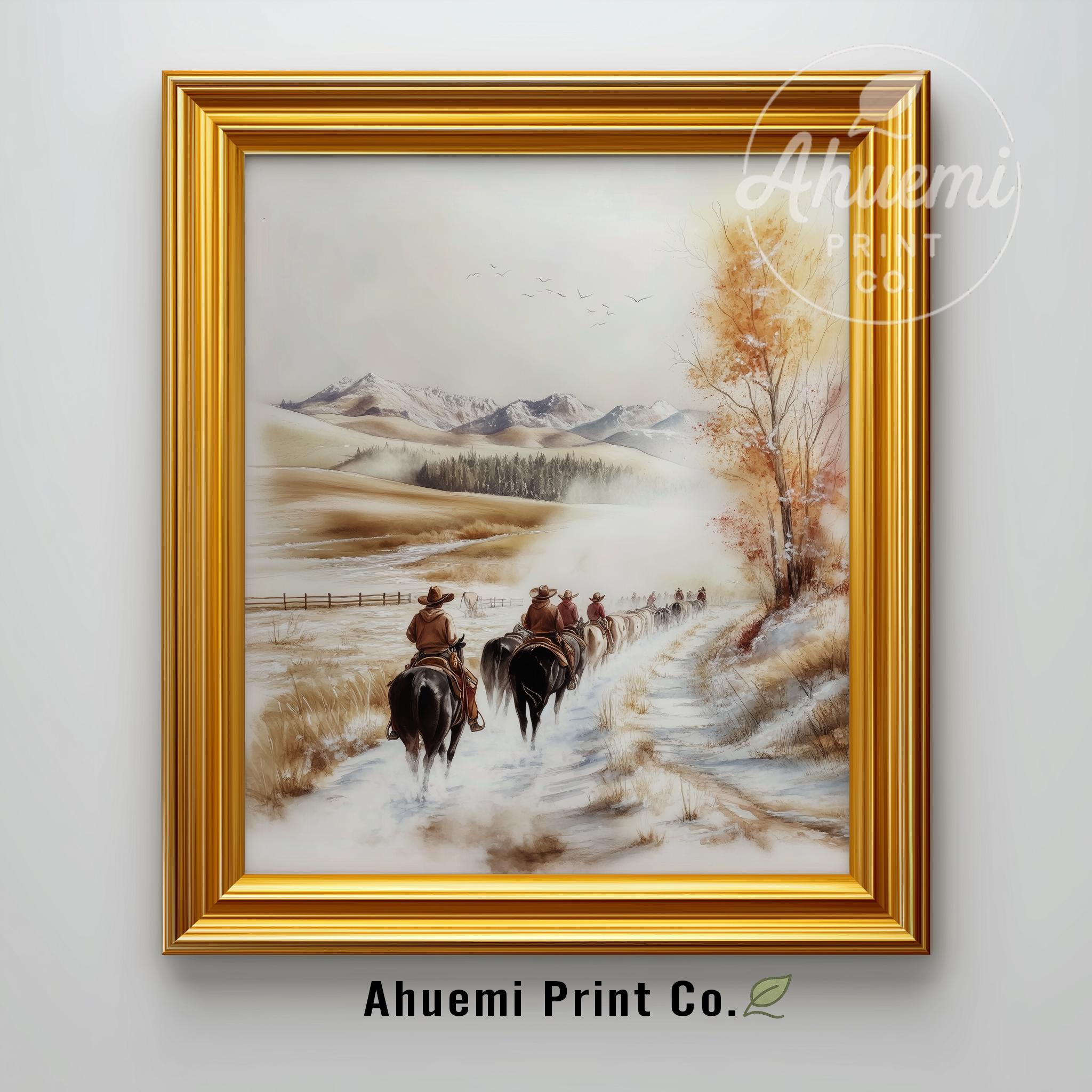 Immerse yourself in the charm of this rustic painting of a nostalgic winter cattle drive scene, featuring cowboys guiding their herd through a serene, snowy landscape. An instantly downloadable print, it's perfect for elevating your decor with budget-friendly charm. This gives you the flexibility to customize the size, frame, and material according to your personal taste and space, ensuring a perfect fit for your walls.