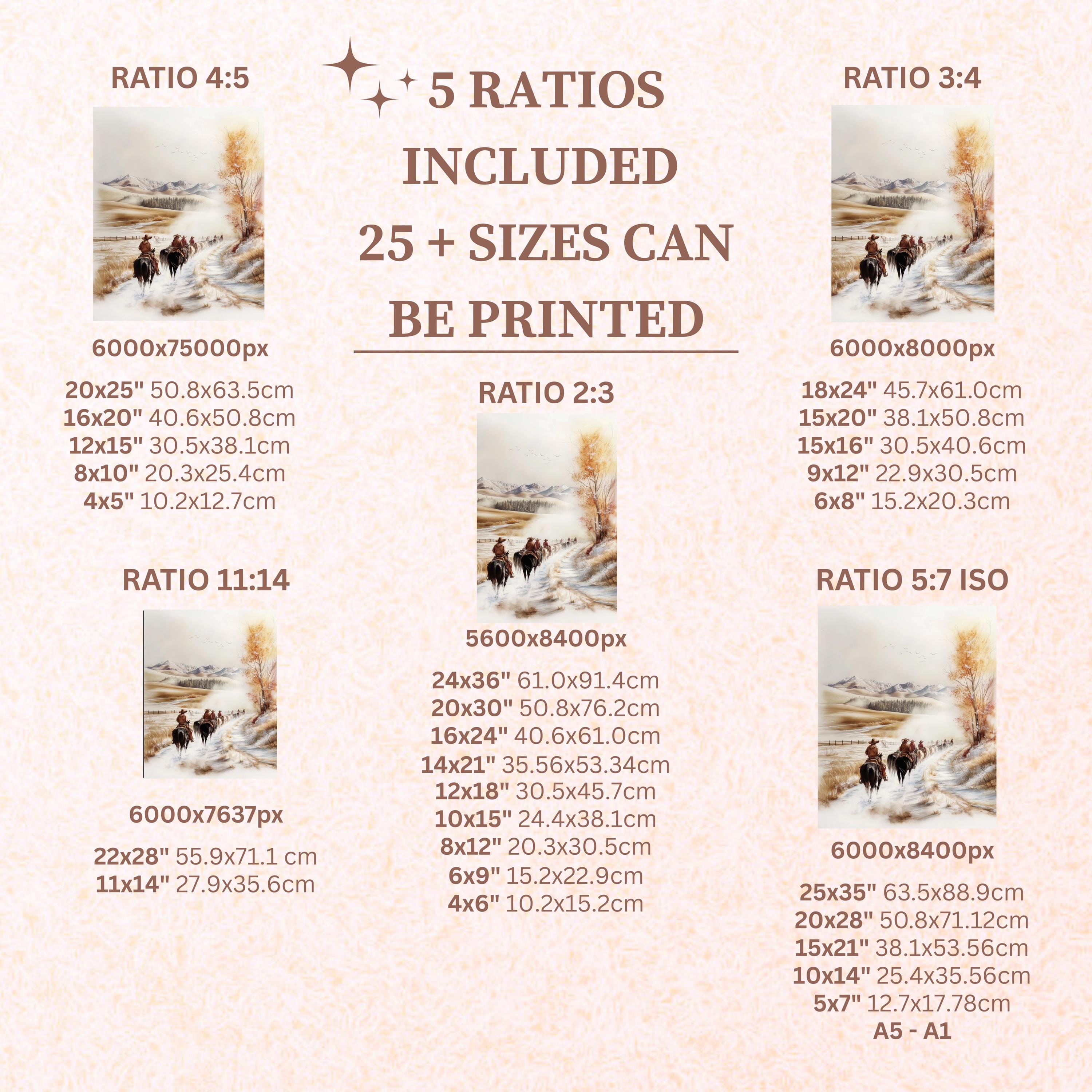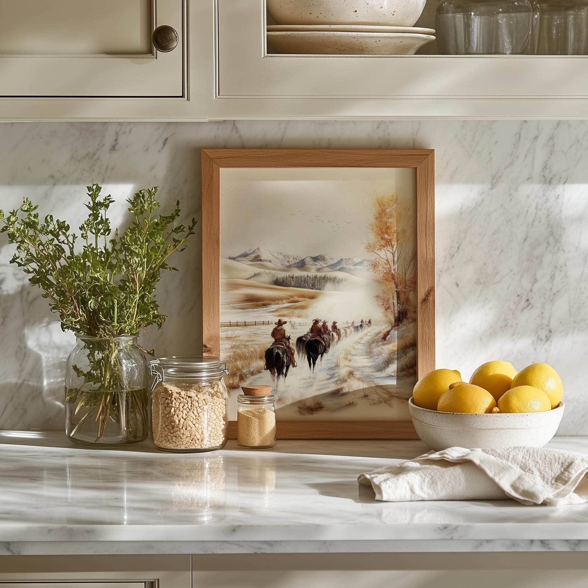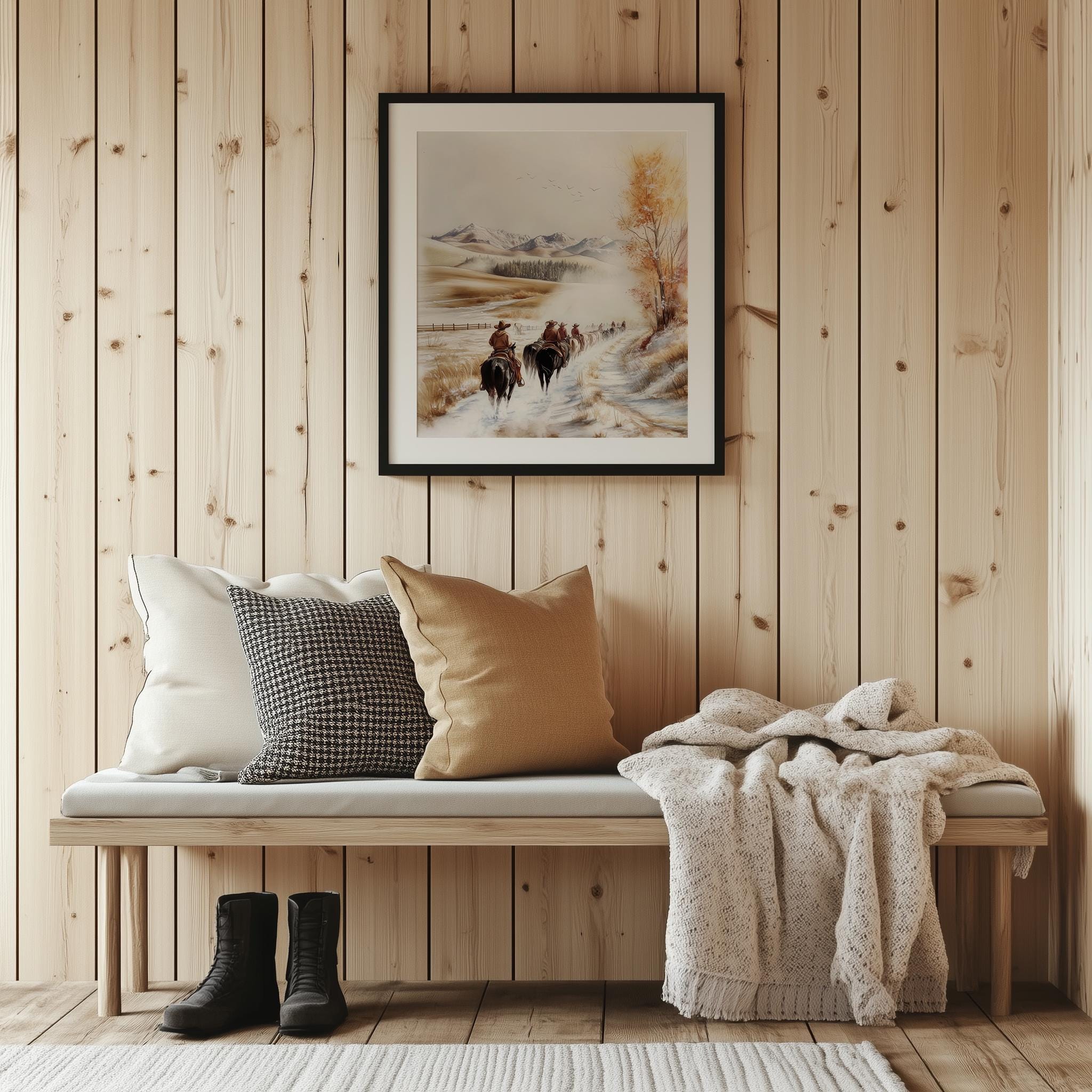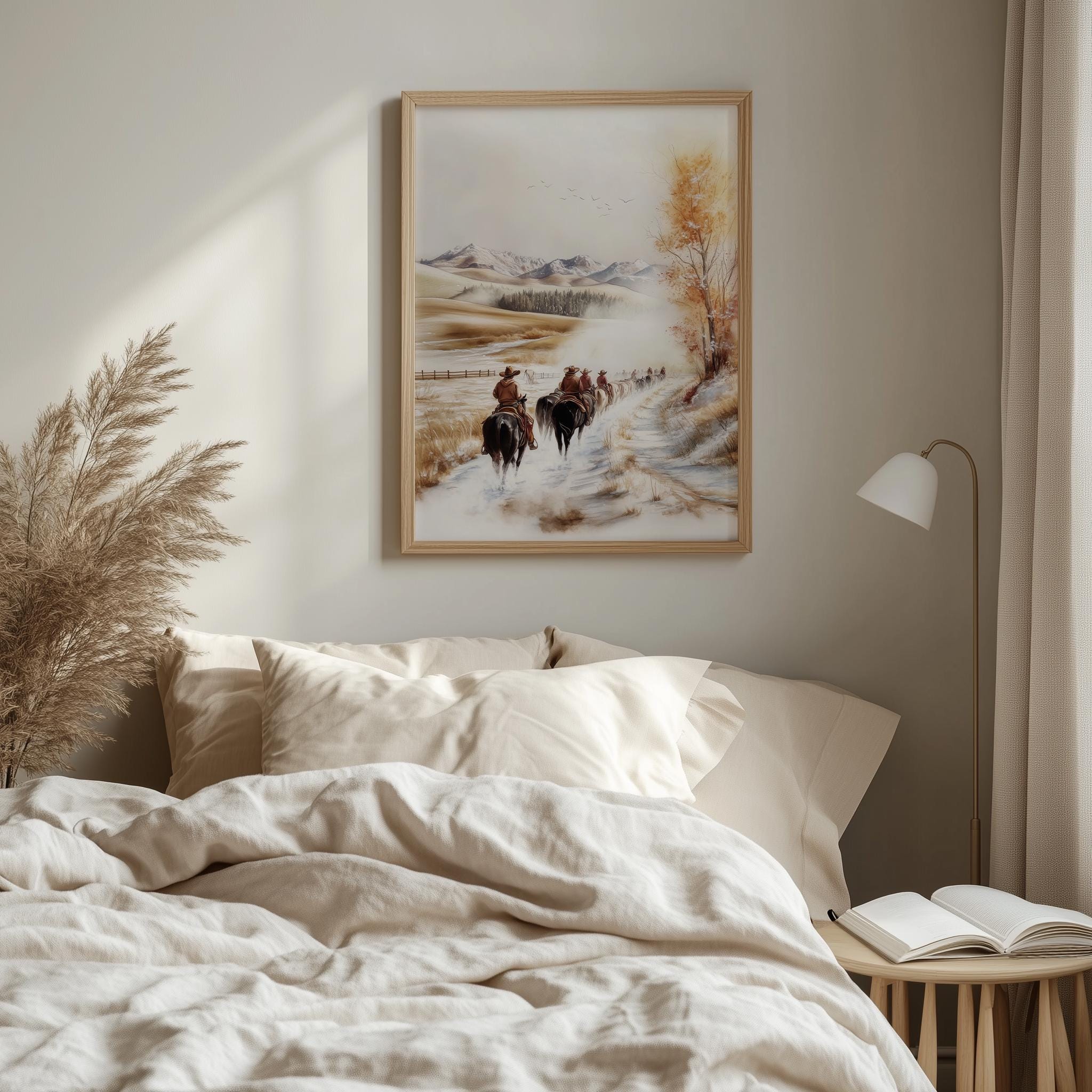 Immerse yourself in the charm of this rustic painting of a nostalgic winter cattle drive scene, featuring cowboys guiding their herd through a serene, snowy landscape. An instantly downloadable print, it's perfect for elevating your decor with budget-friendly charm. This gives you the flexibility to customize the size, frame, and material according to your personal taste and space, ensuring a perfect fit for your walls.