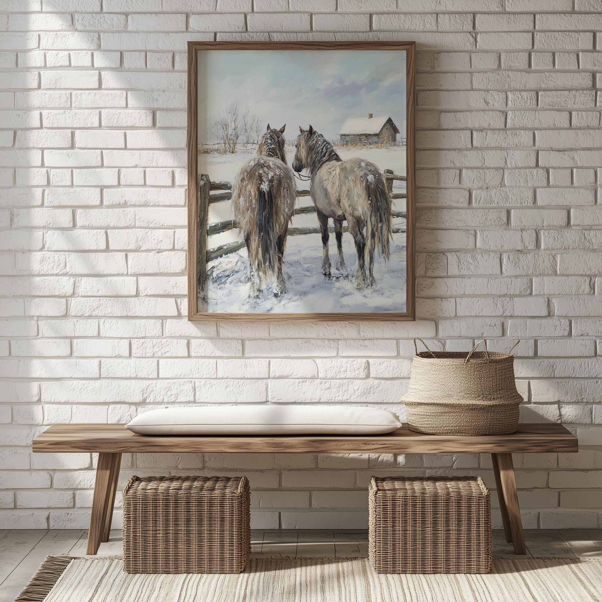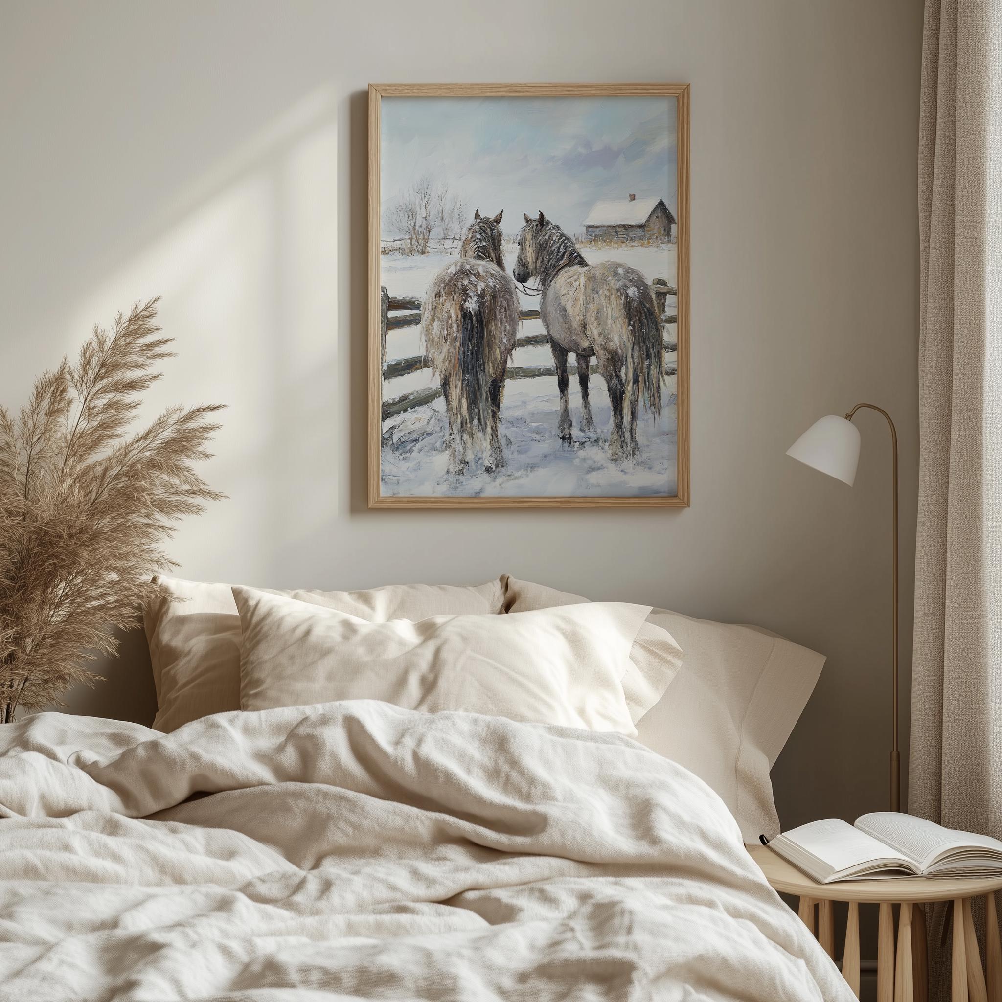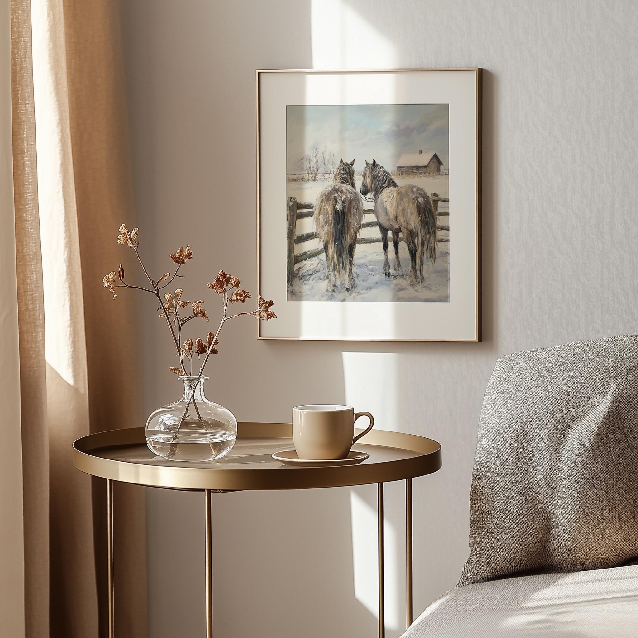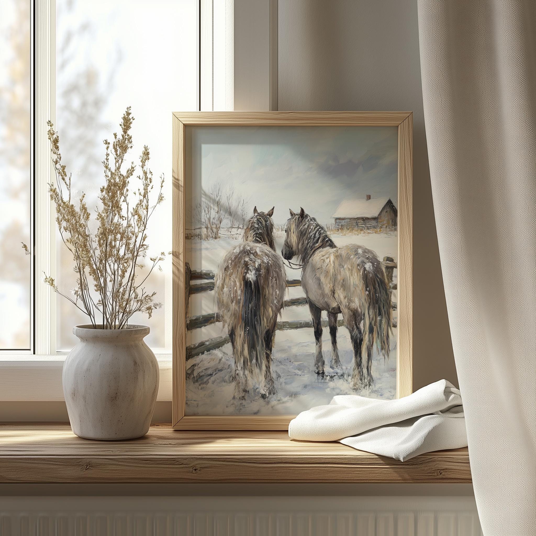 Immerse yourself in the charm of this rustic painting of shaggy horses standing gracefully by a rustic fence in a snowy landscape. An instantly downloadable print, it's perfect for elevating your decor with budget-friendly charm. This gives you the flexibility to customize the size, frame, and material according to your personal taste and space, ensuring a perfect fit for your walls.