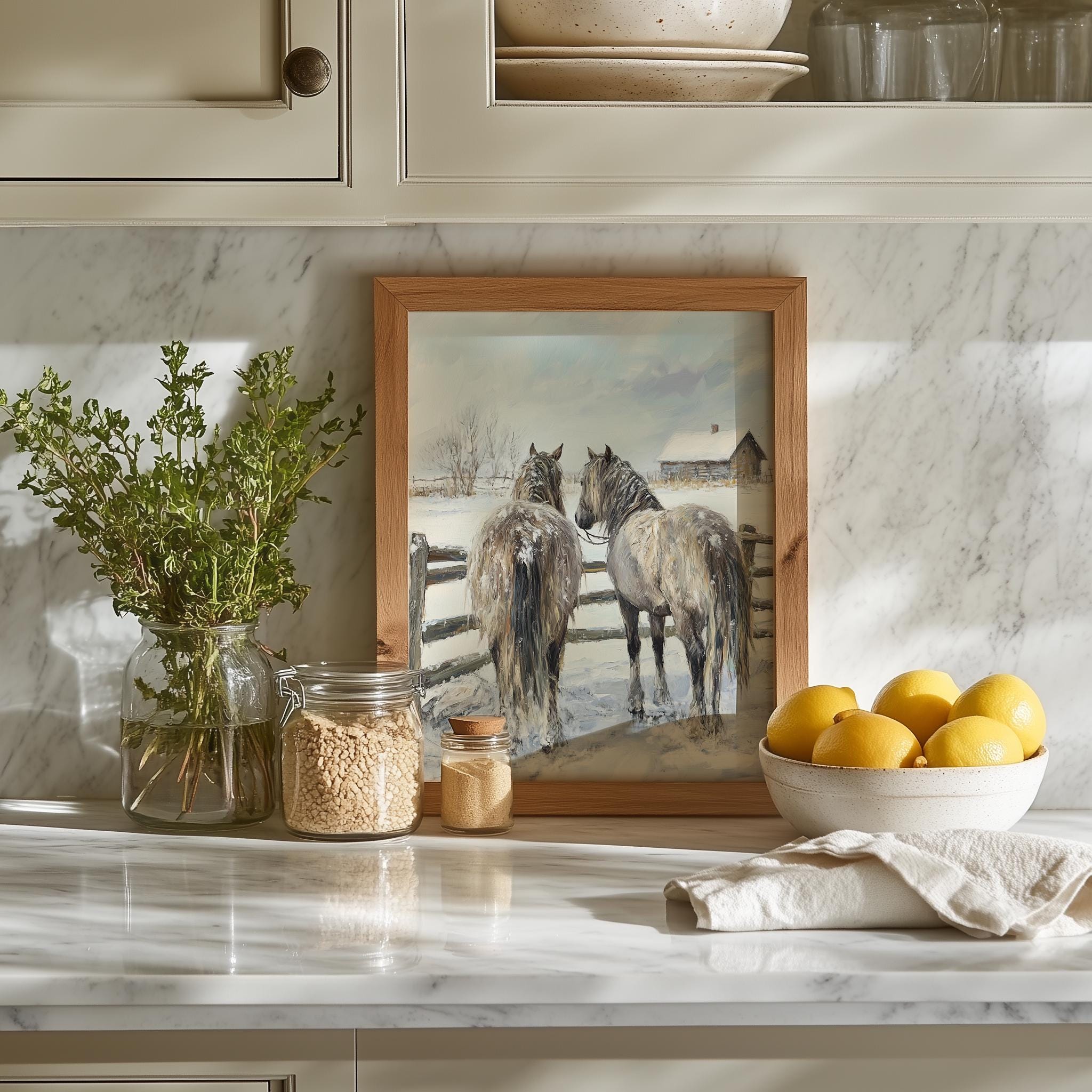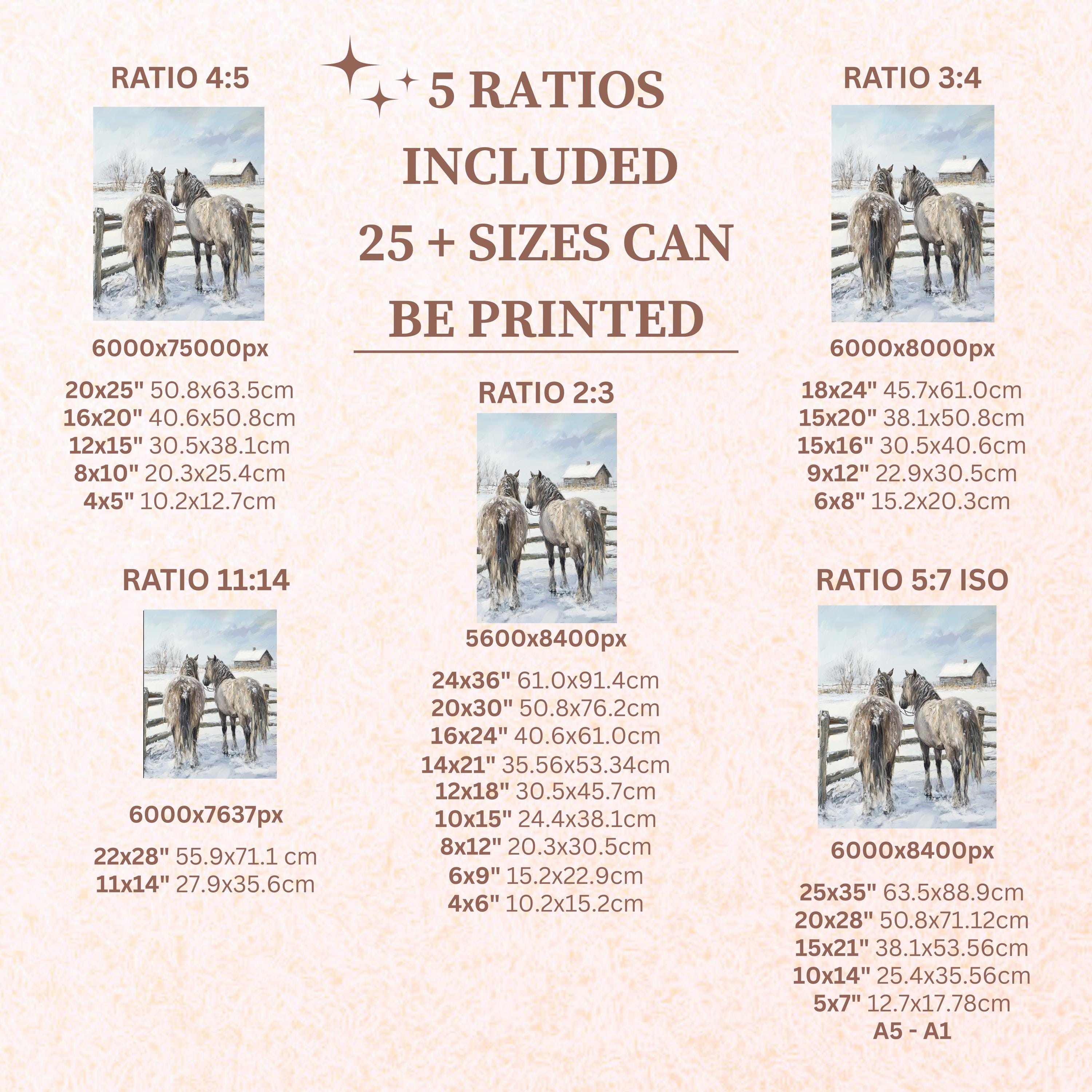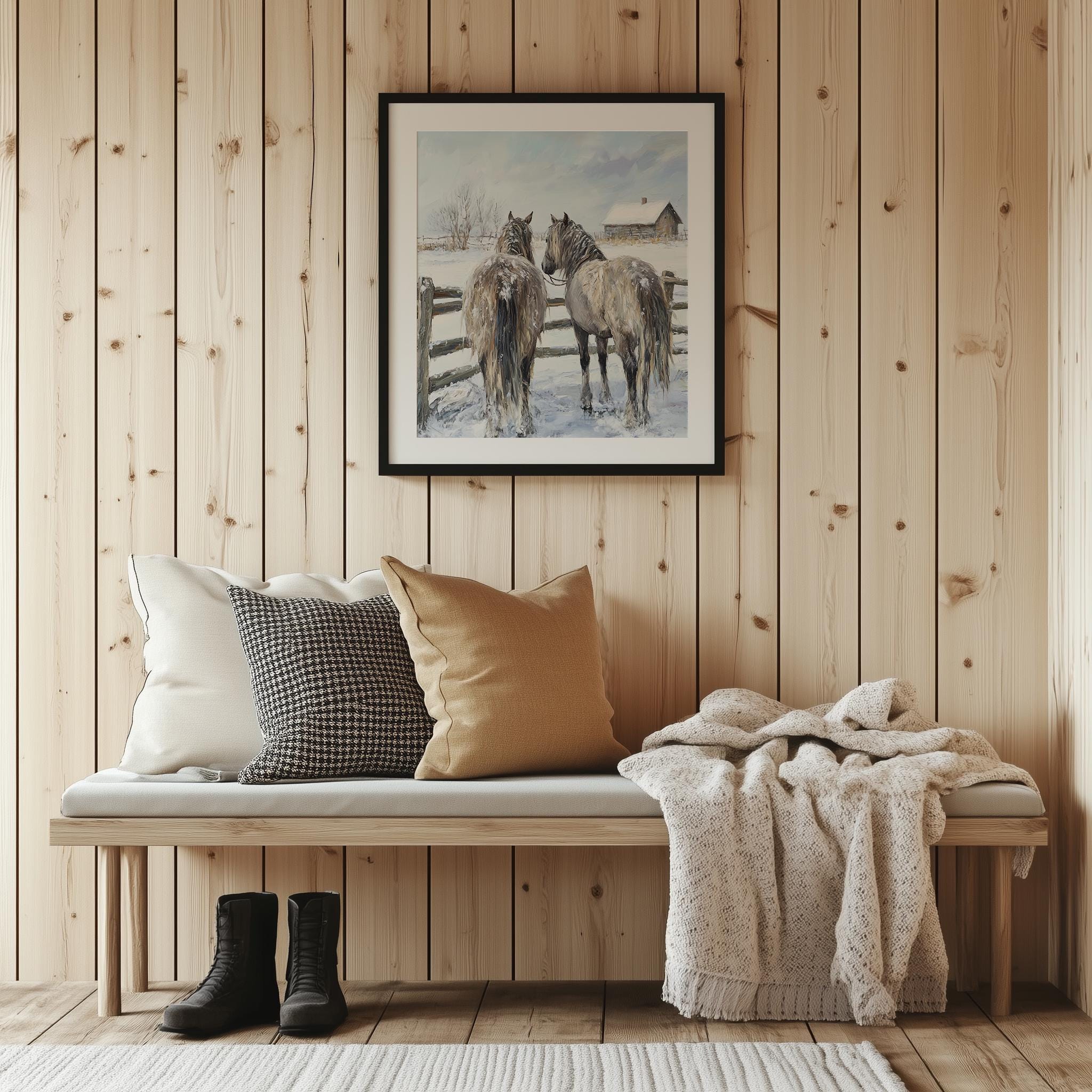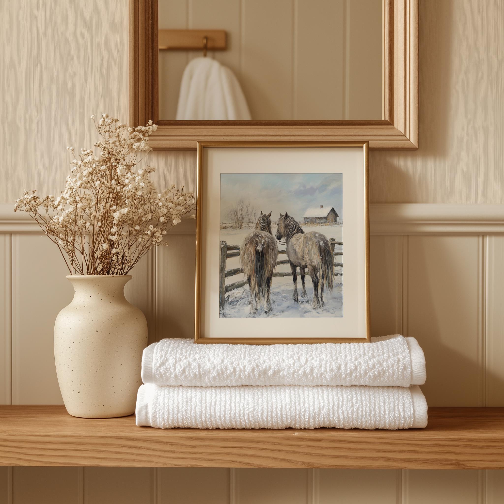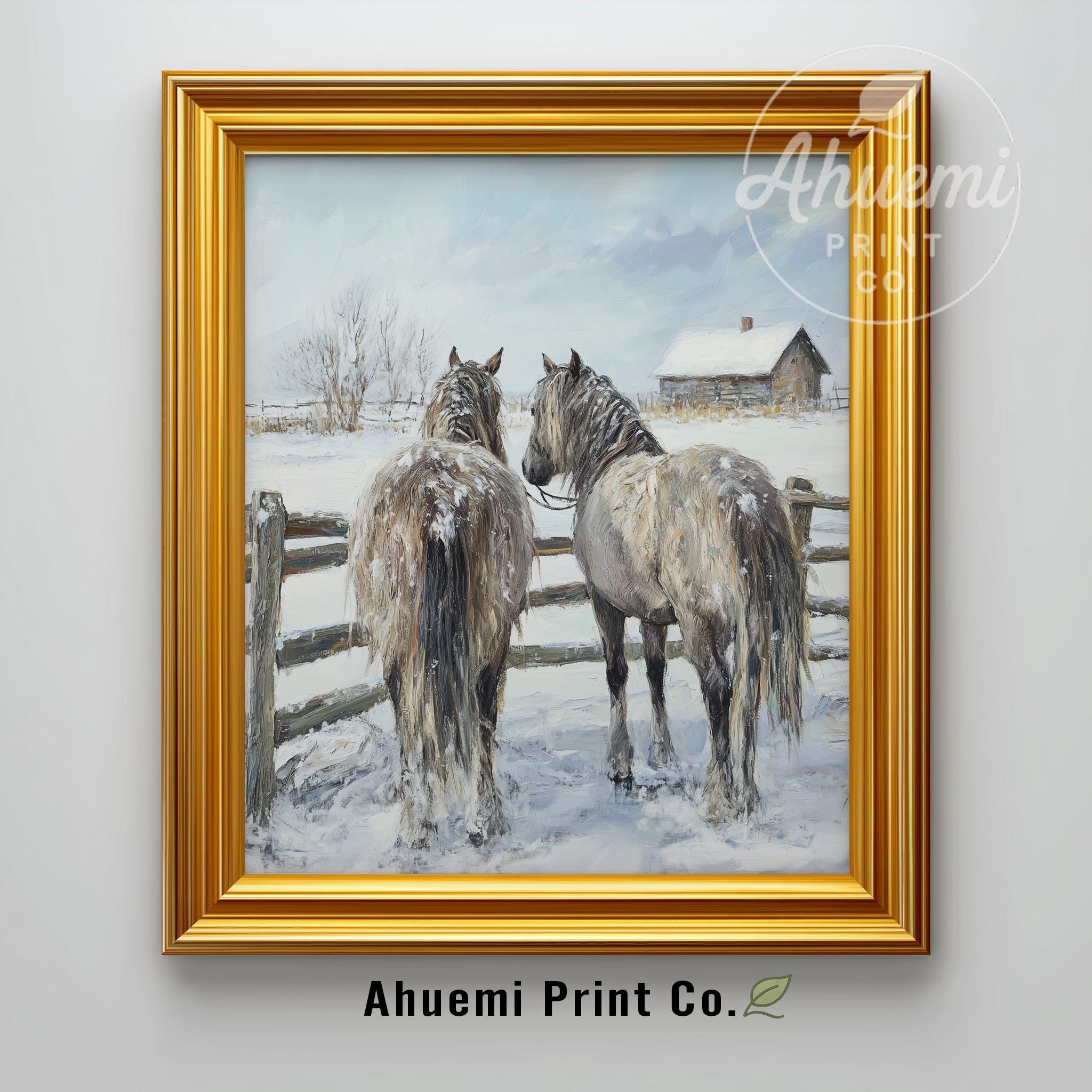 Immerse yourself in the charm of this rustic painting of shaggy horses standing gracefully by a rustic fence in a snowy landscape. An instantly downloadable print, it's perfect for elevating your decor with budget-friendly charm. This gives you the flexibility to customize the size, frame, and material according to your personal taste and space, ensuring a perfect fit for your walls.