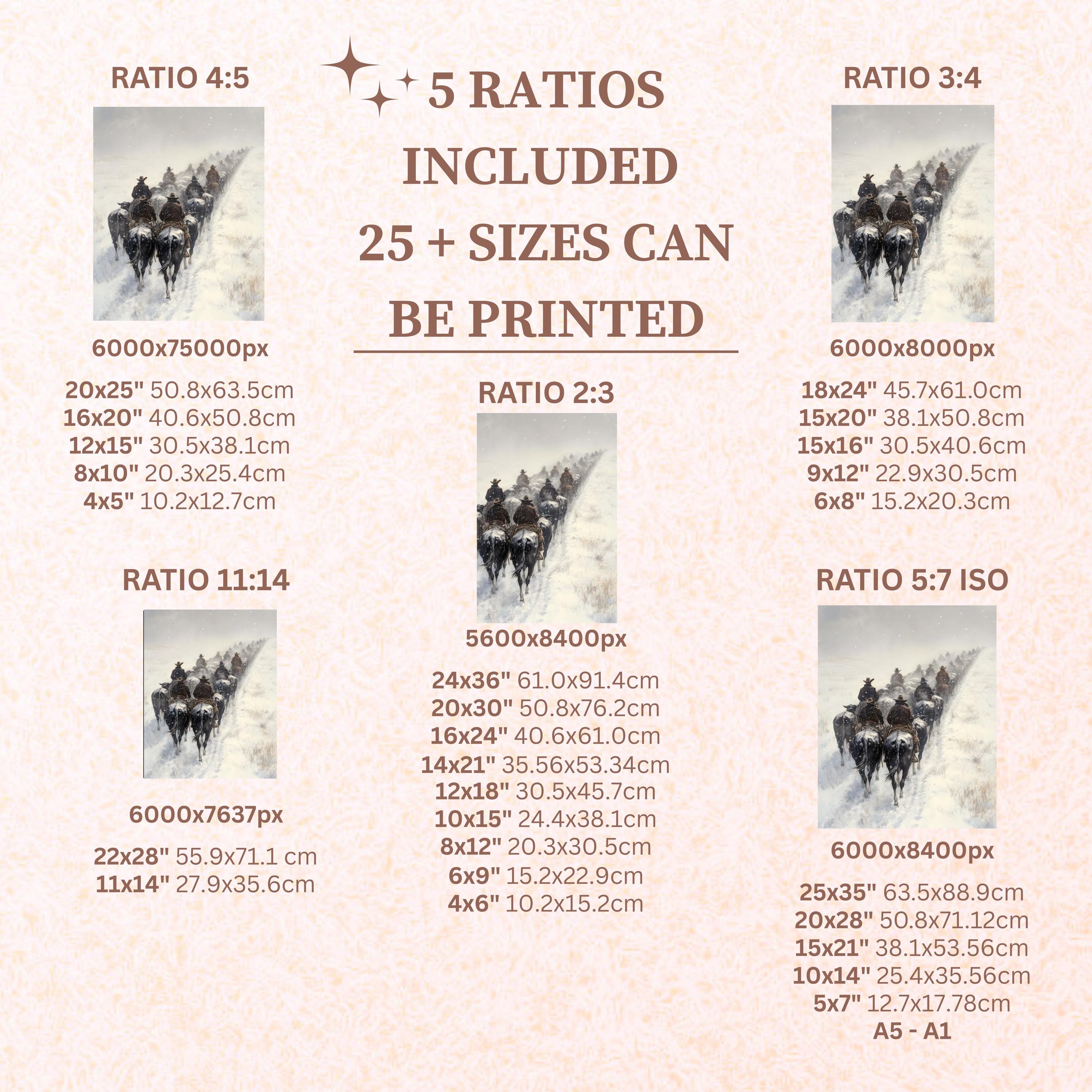 Each artwork includes 5 aspect ratios with 25+ print sizes. Most standard frames are covered. One custom resize per purchase available—message before ordering.