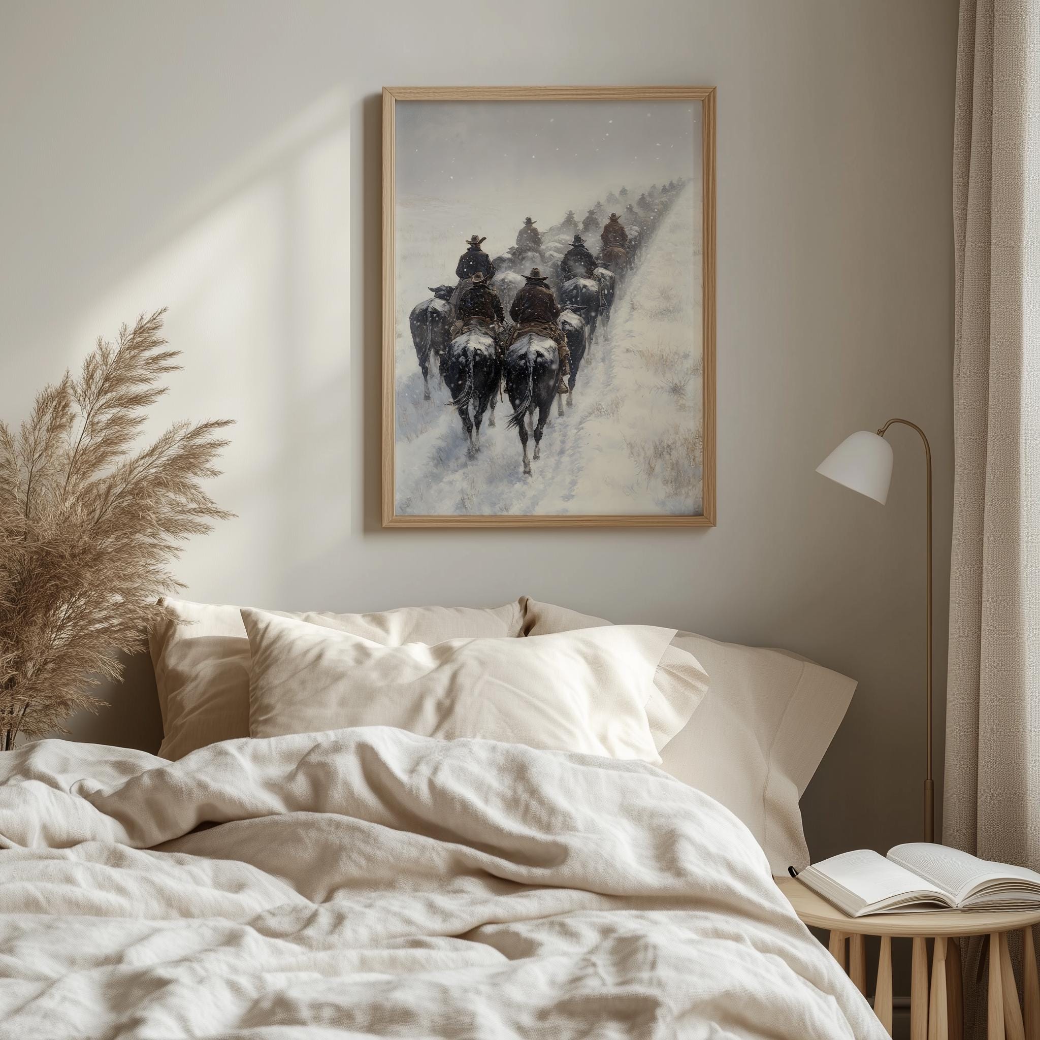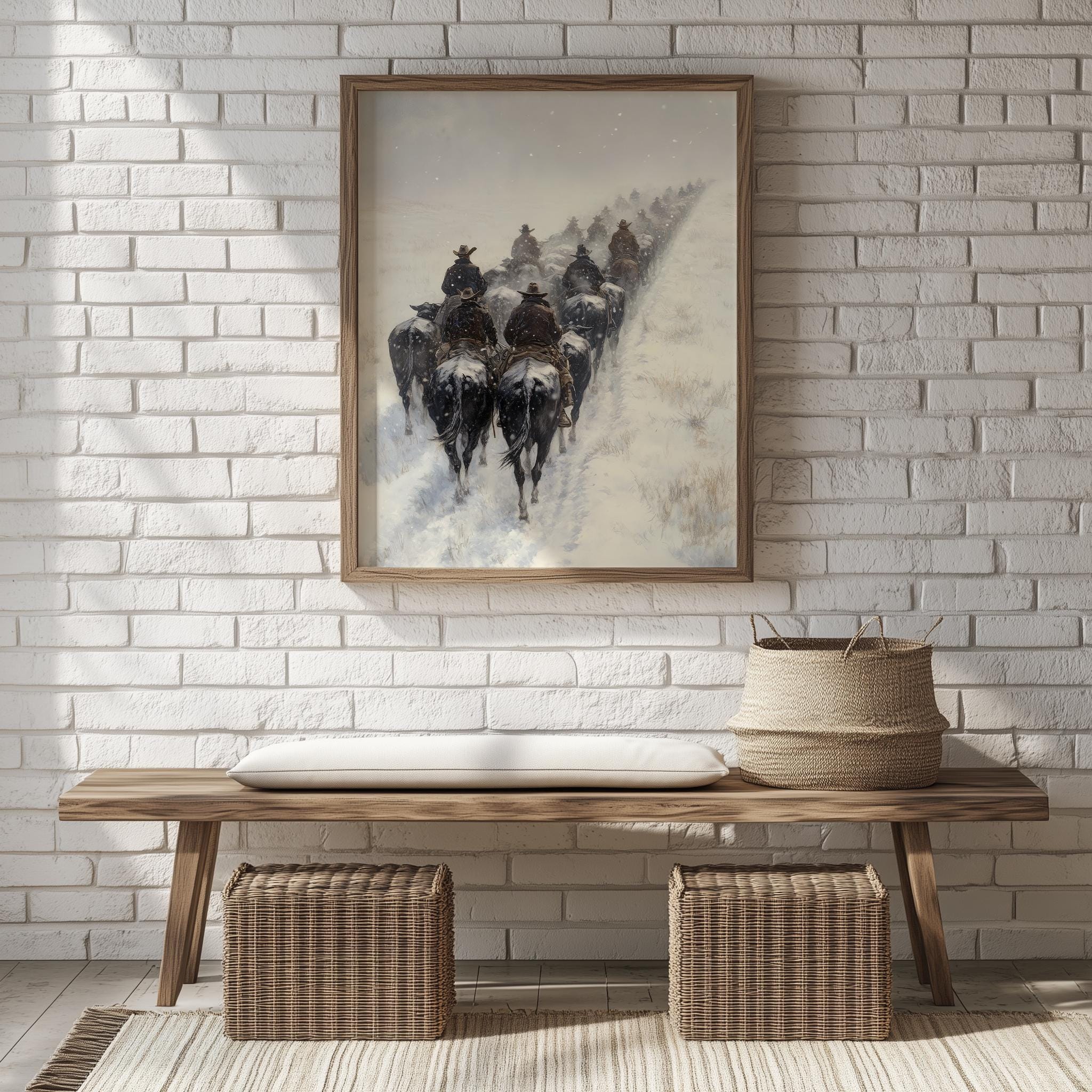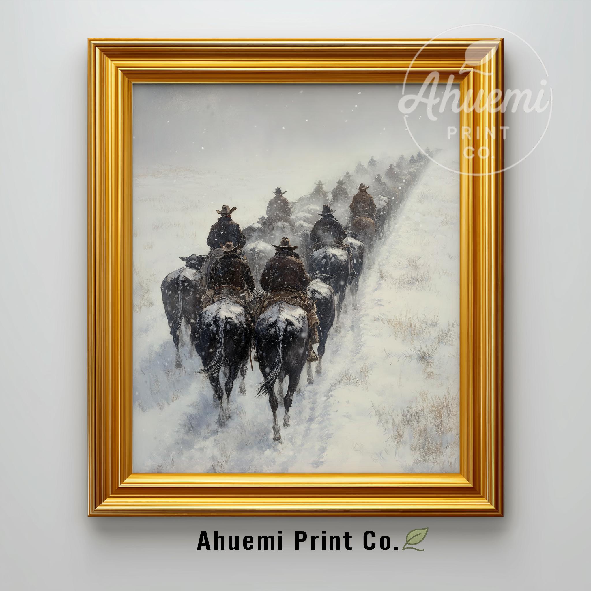 Immerse yourself in the charm of this rustic painting of a serene snowy landscape featuring a herd of Black Angus and Hereford cattle driven by cowboys. An instantly downloadable print, it's perfect for elevating your decor with budget-friendly charm. This gives you the flexibility to customize the size, frame, and material according to your personal taste and space, ensuring a perfect fit for your walls.