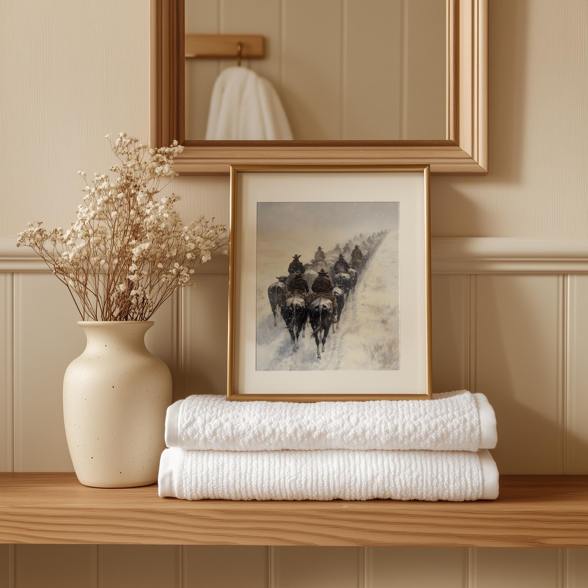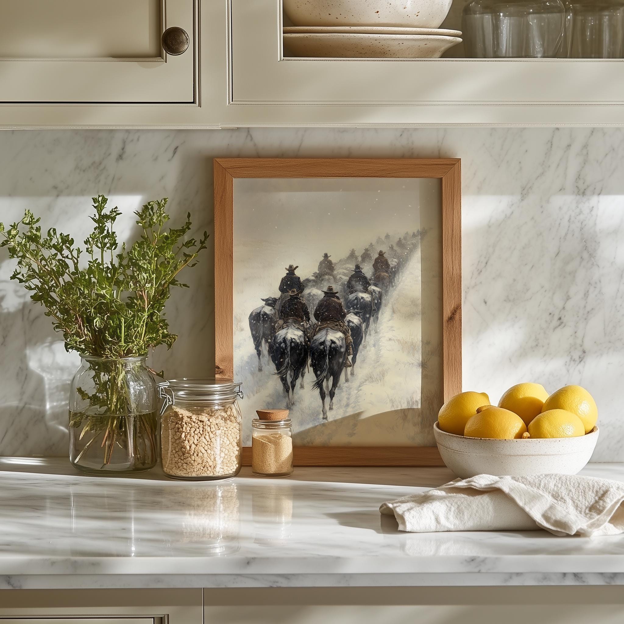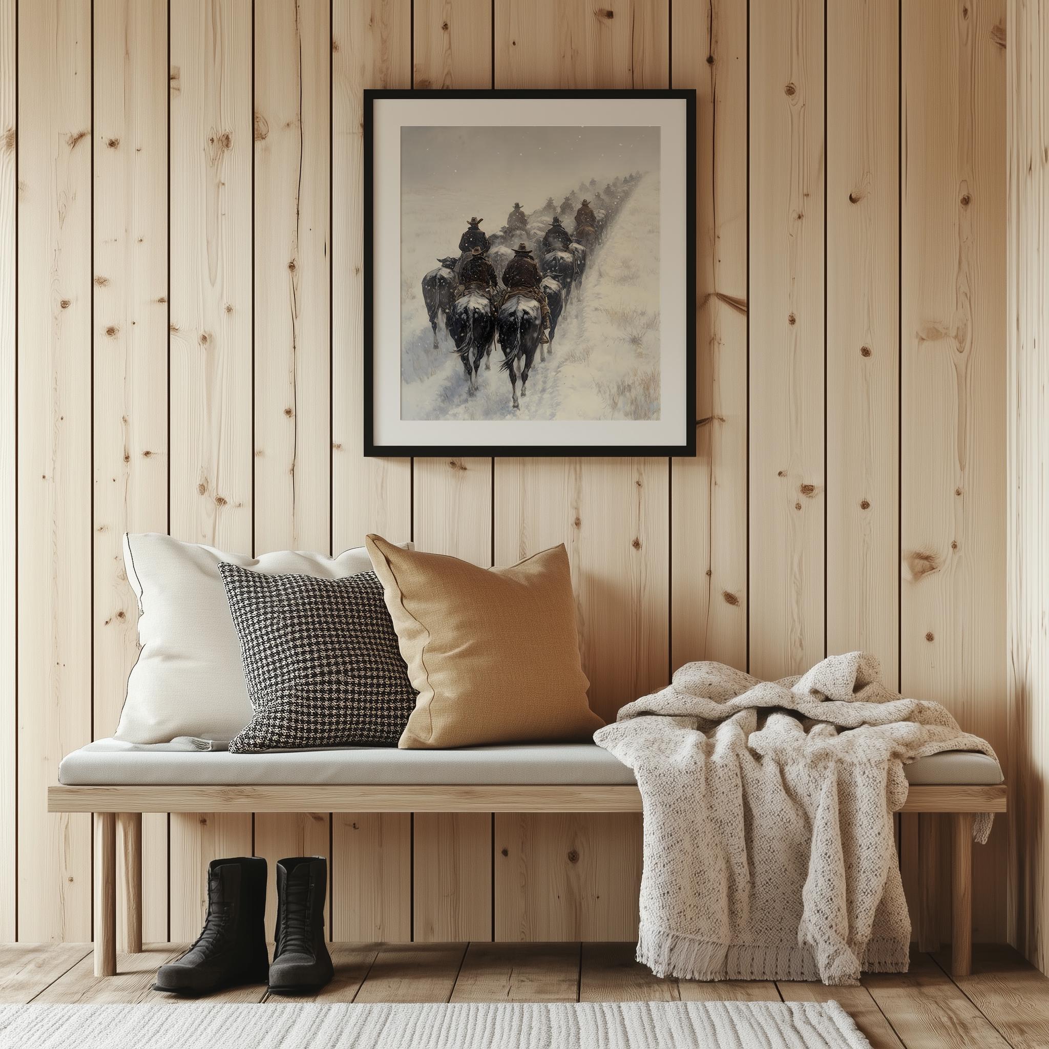 Immerse yourself in the charm of this rustic painting of a serene snowy landscape featuring a herd of Black Angus and Hereford cattle driven by cowboys. An instantly downloadable print, it's perfect for elevating your decor with budget-friendly charm. This gives you the flexibility to customize the size, frame, and material according to your personal taste and space, ensuring a perfect fit for your walls.