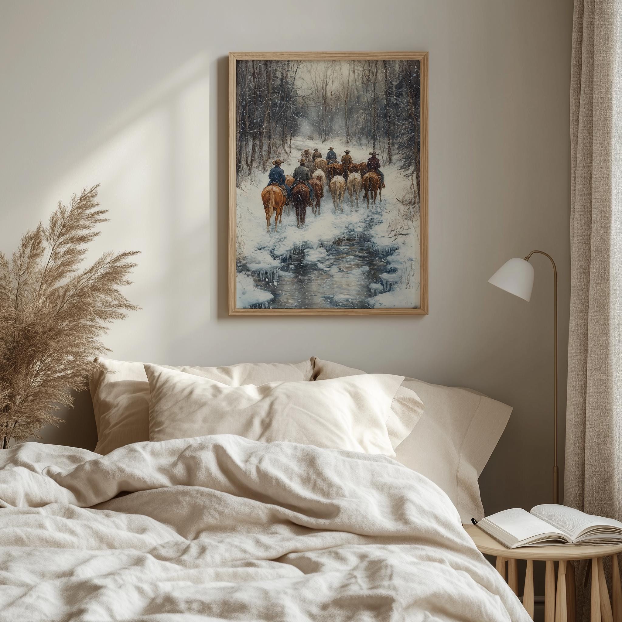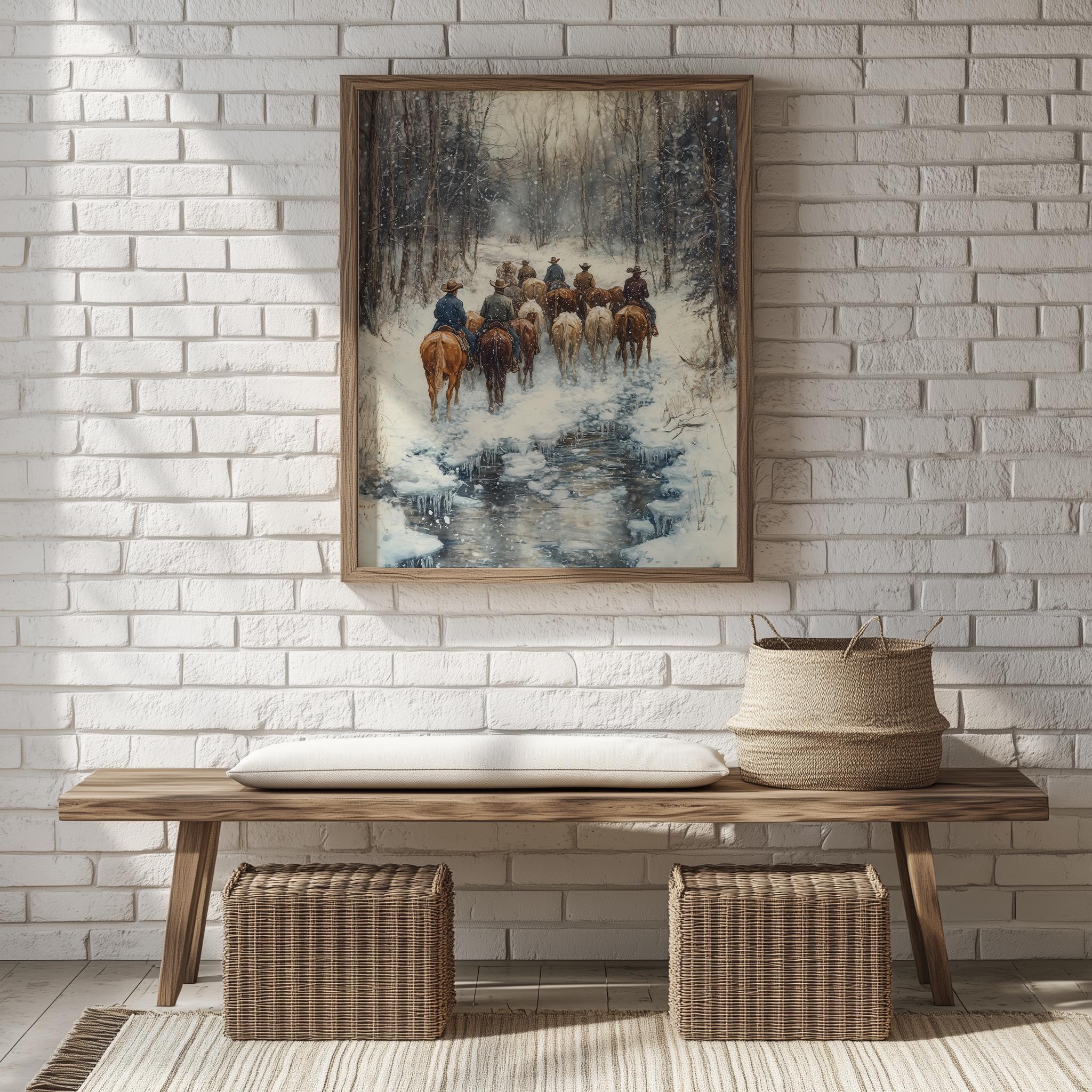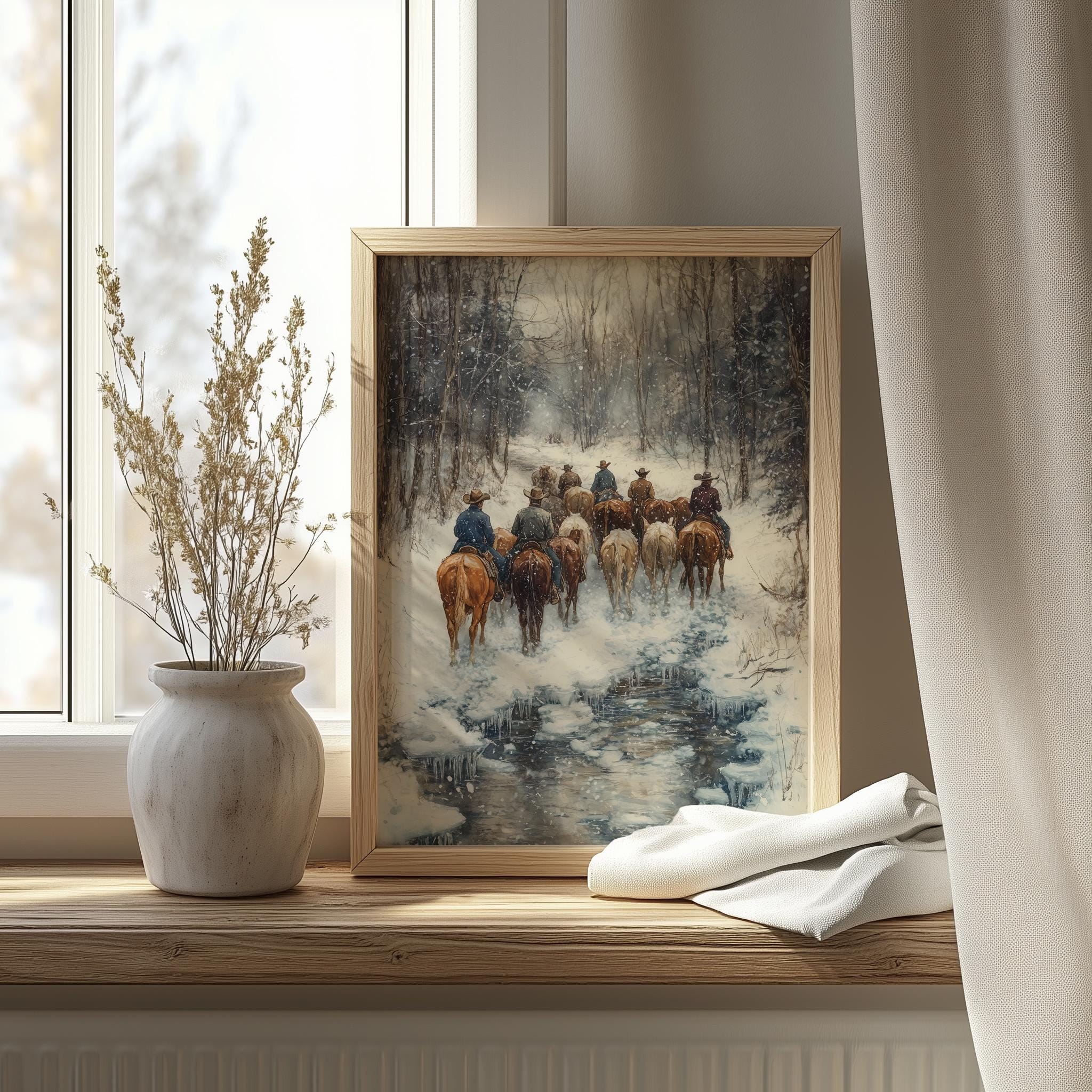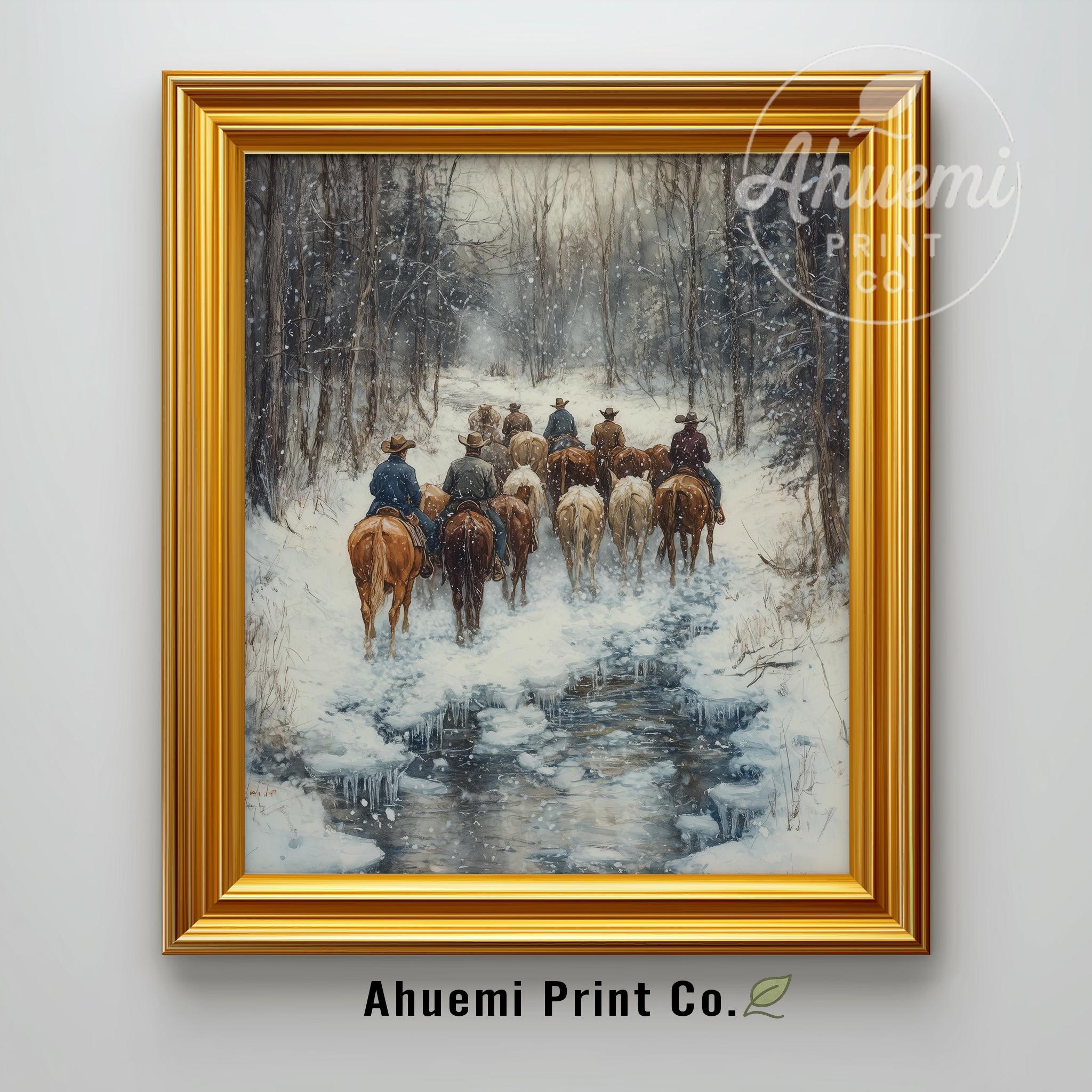 Immerse yourself in the charm of this rustic painting of cowboys guiding their cattle across a serene winter stream. An instantly downloadable print, it's perfect for elevating your decor with budget-friendly charm. This gives you the flexibility to customize the size, frame, and material according to your personal taste and space, ensuring a perfect fit for your walls.