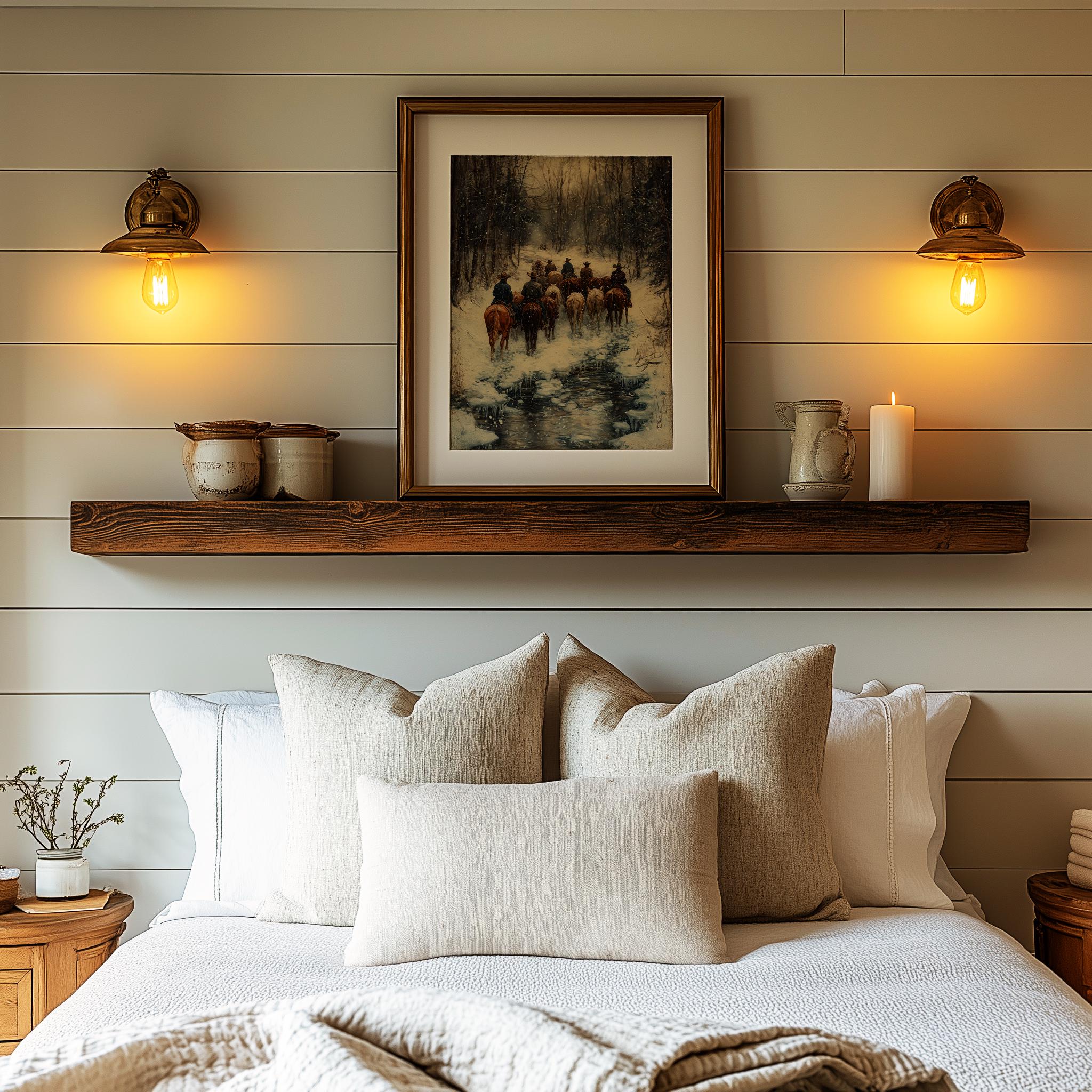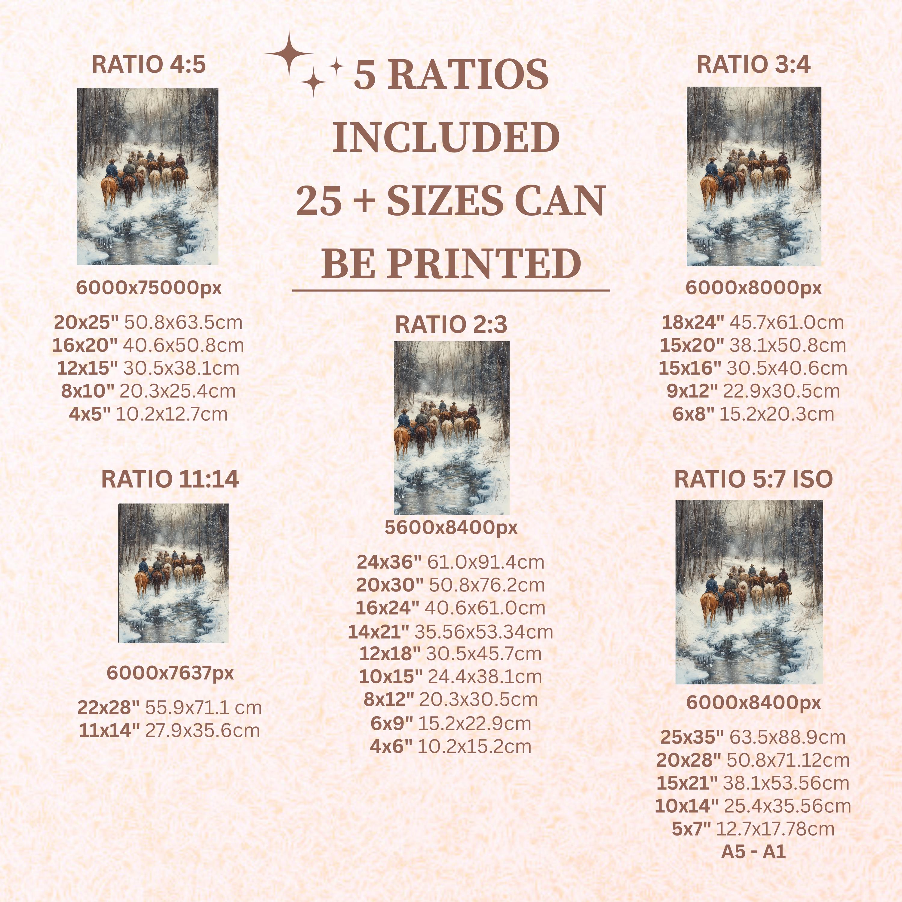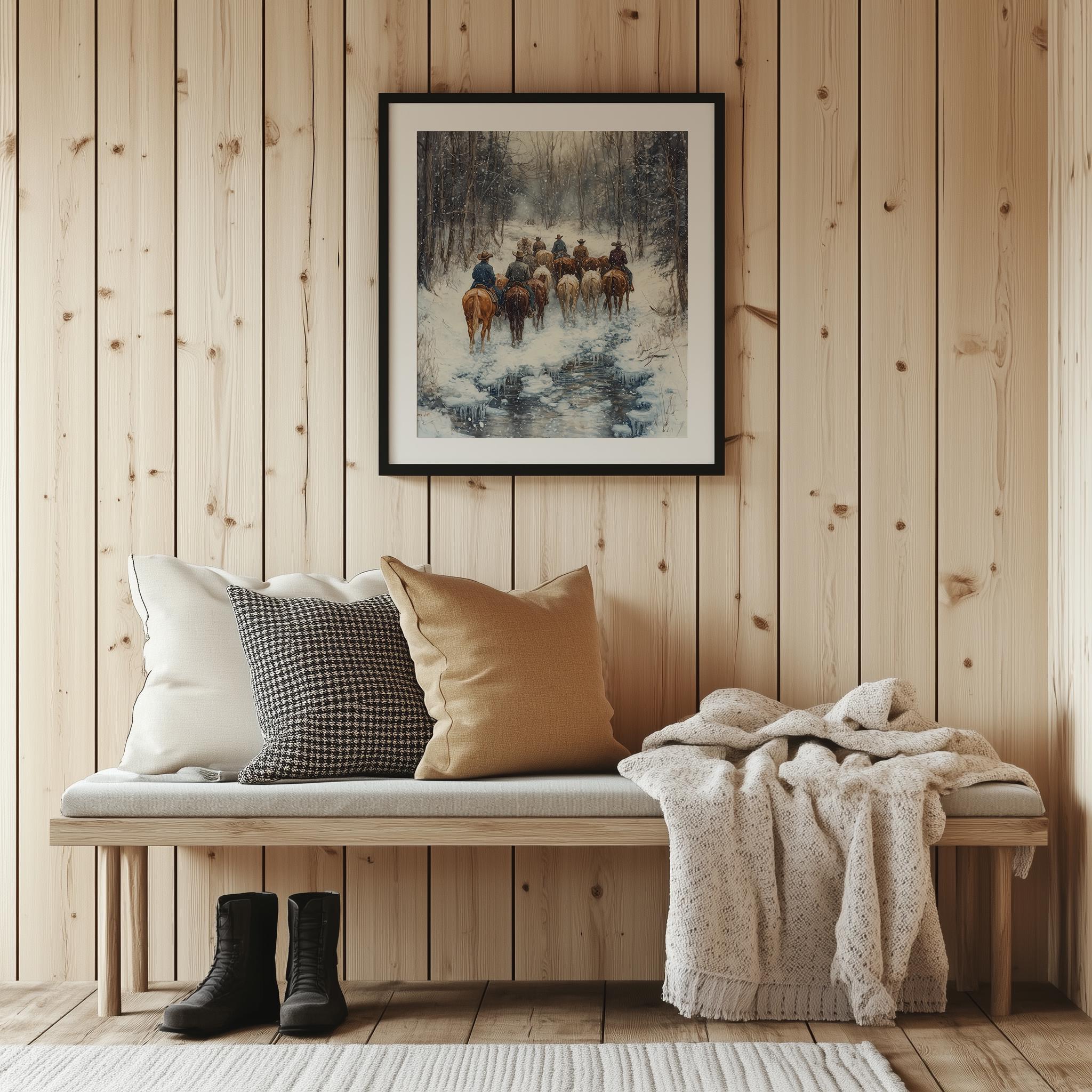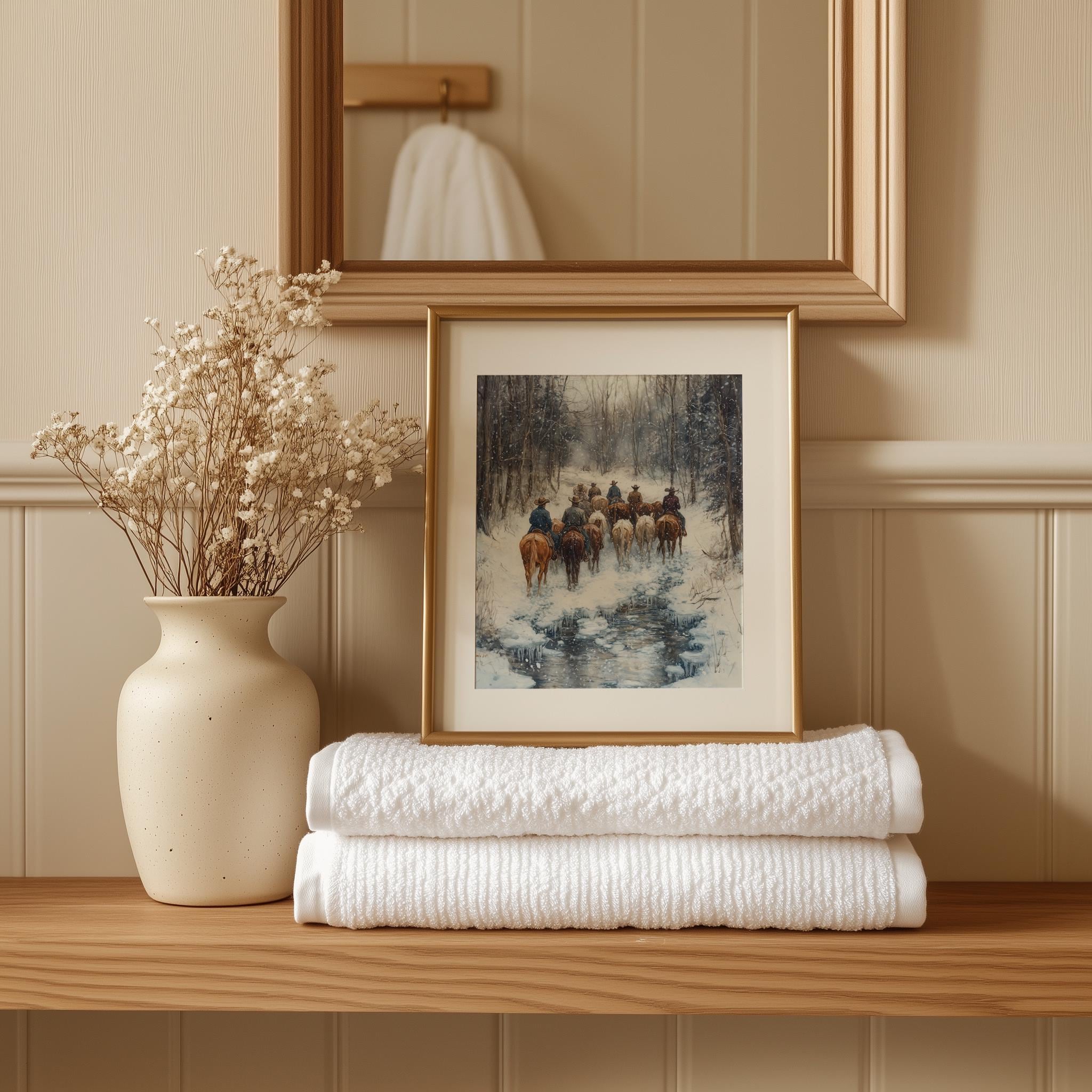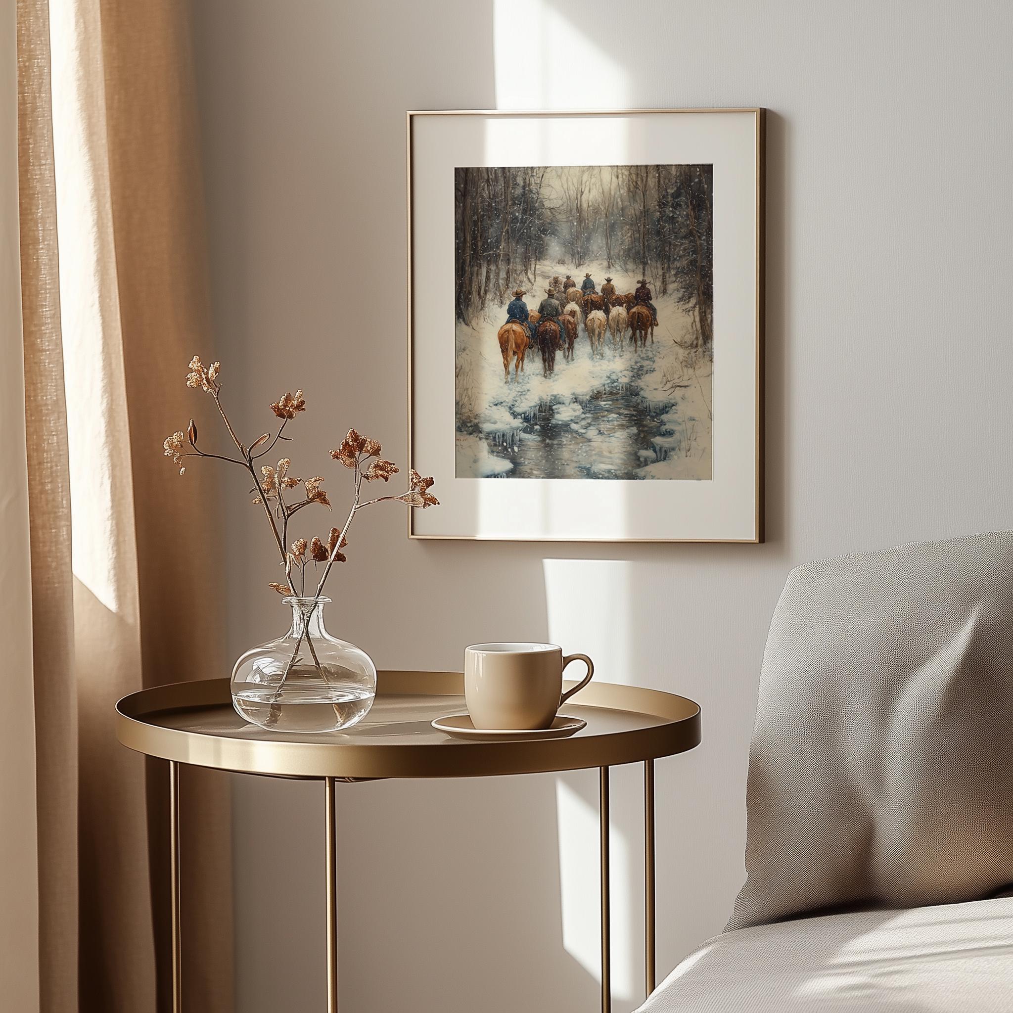 Immerse yourself in the charm of this rustic painting of cowboys guiding their cattle across a serene winter stream. An instantly downloadable print, it's perfect for elevating your decor with budget-friendly charm. This gives you the flexibility to customize the size, frame, and material according to your personal taste and space, ensuring a perfect fit for your walls.