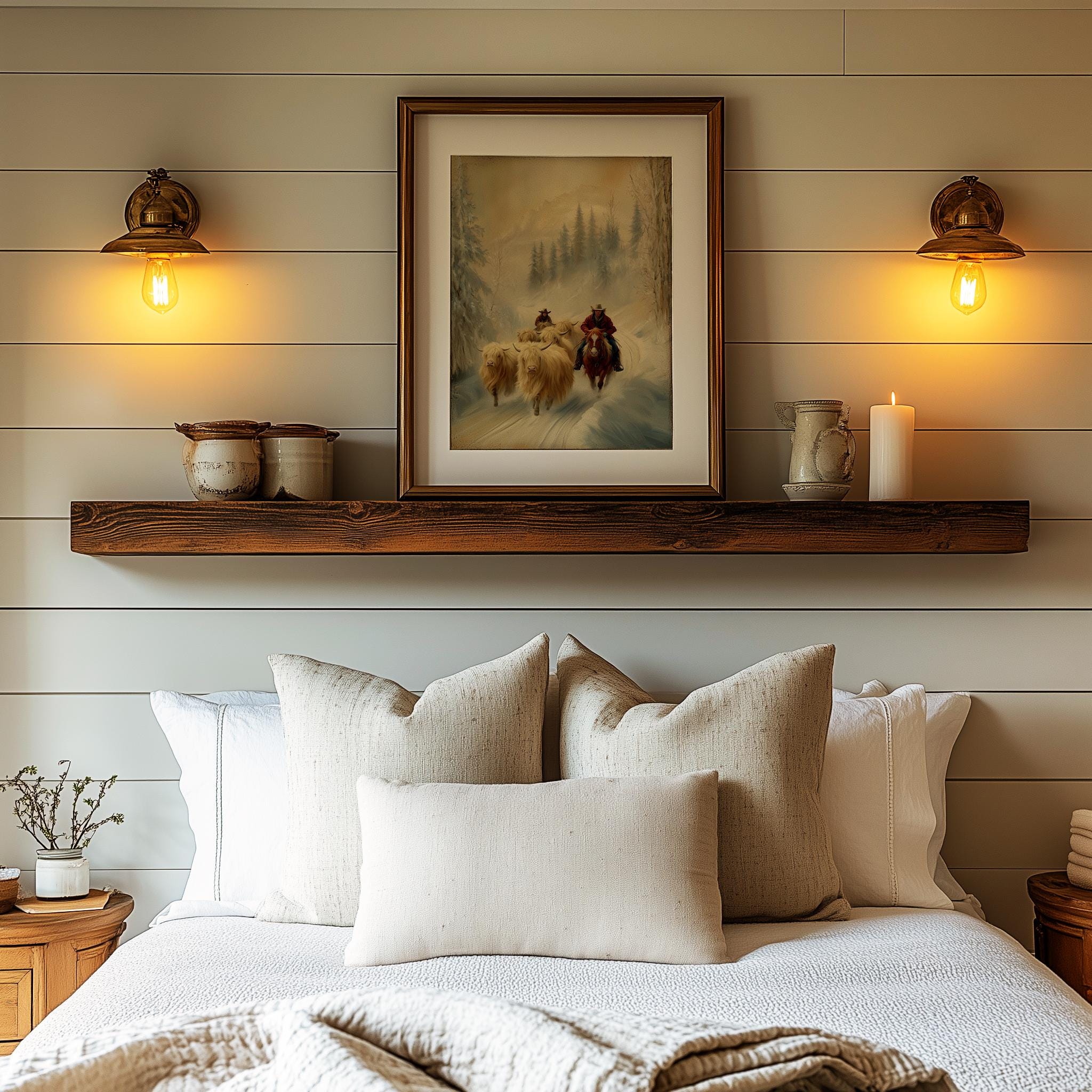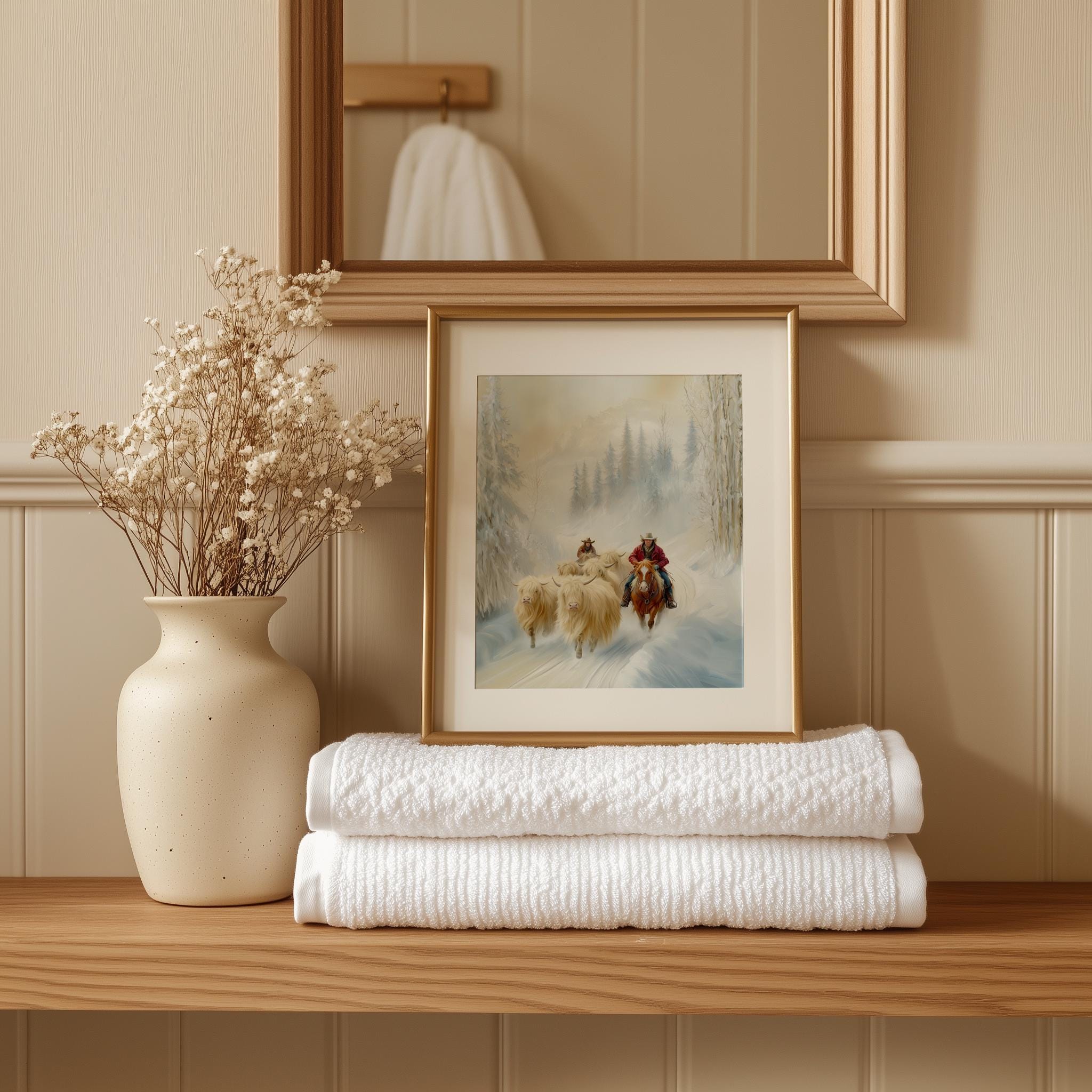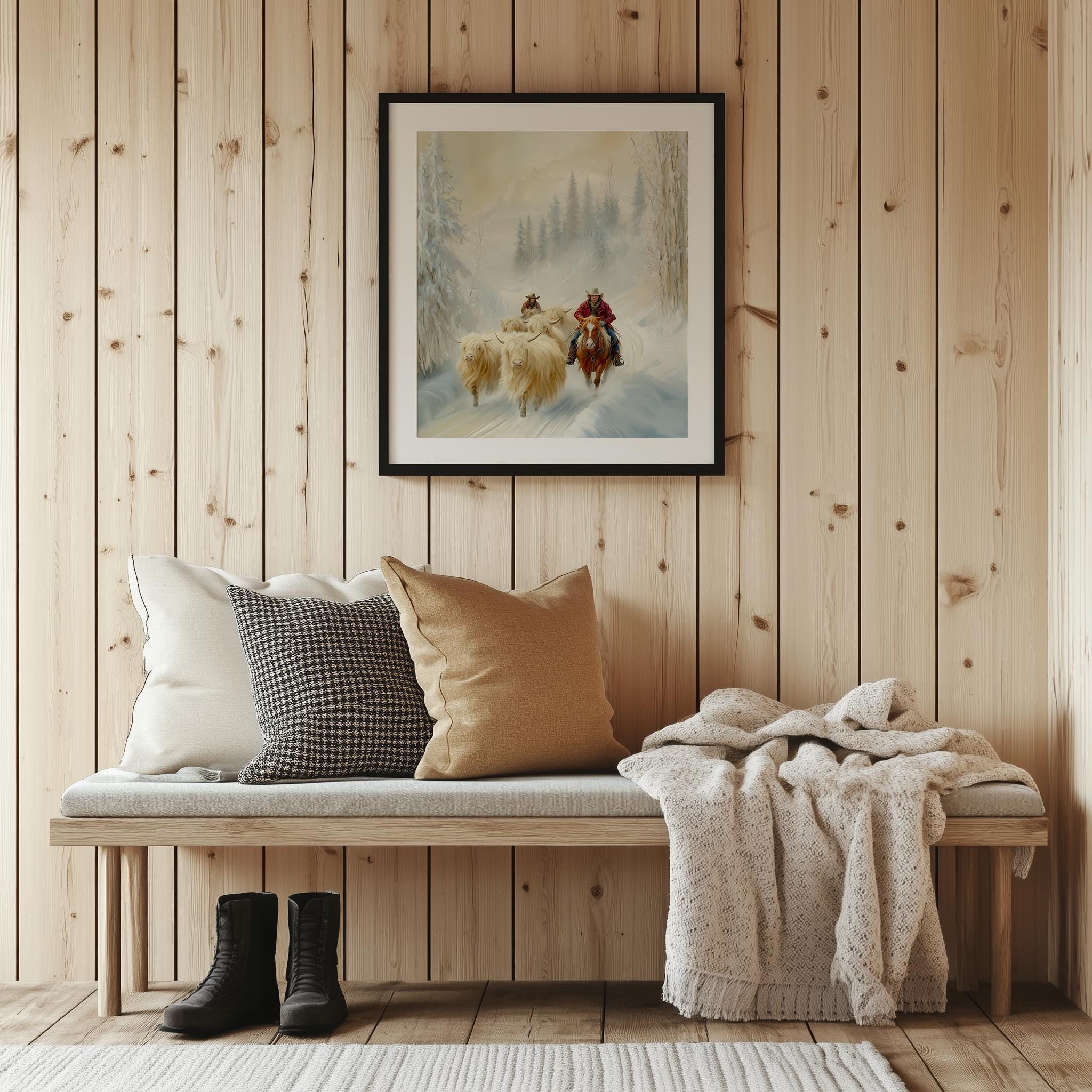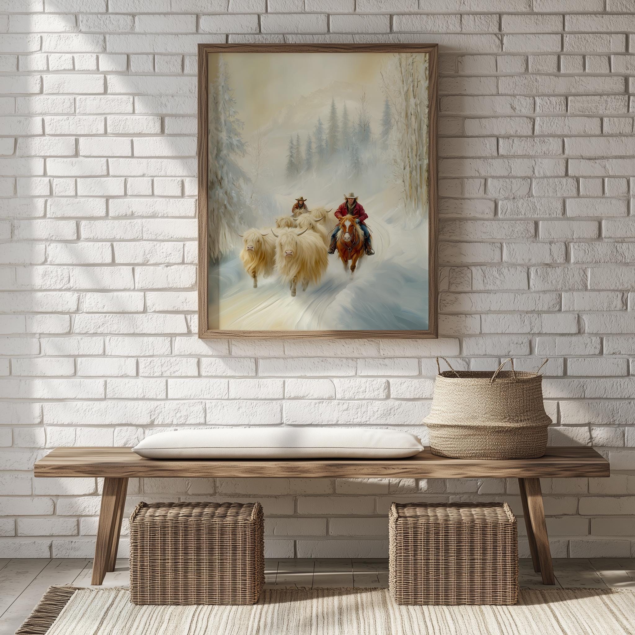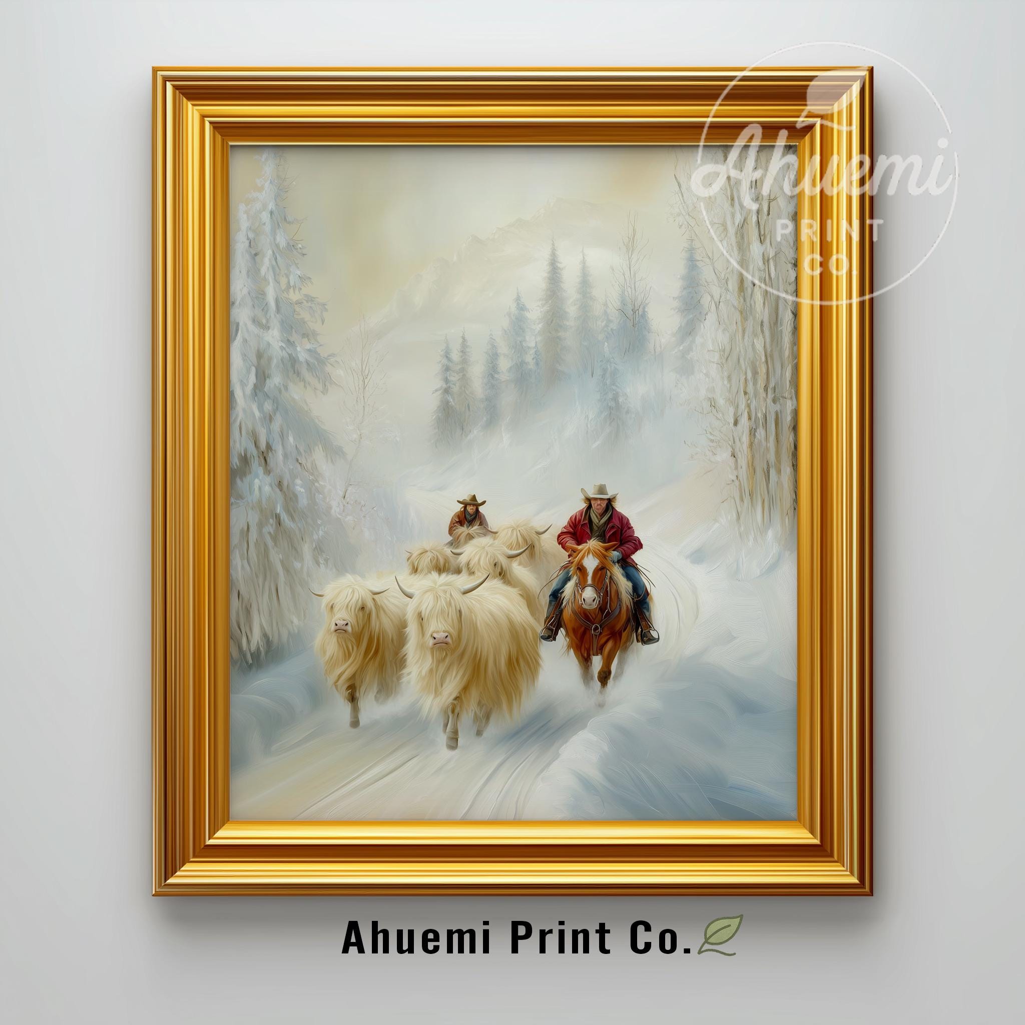 Immerse yourself in the charm of this rustic painting of a herd of Highland cattle gracefully traversing a serene winter landscape. An instantly downloadable print, it's perfect for elevating your decor with budget-friendly charm. This gives you the flexibility to customize the size, frame, and material according to your personal taste and space, ensuring a perfect fit for your walls.