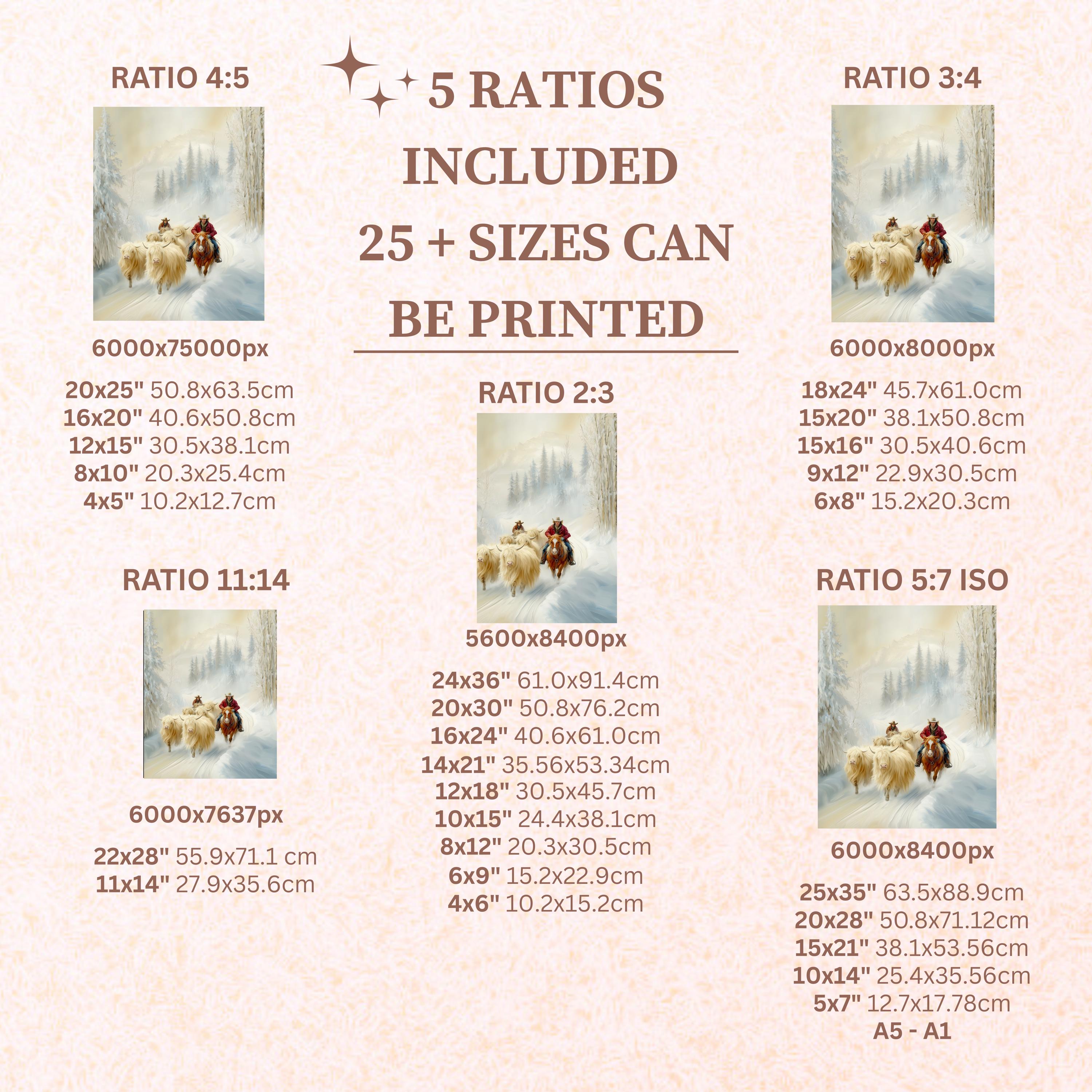 Each artwork includes 5 aspect ratios with 25+ print sizes. Most standard frames are covered. One custom resize per purchase available—message before ordering.