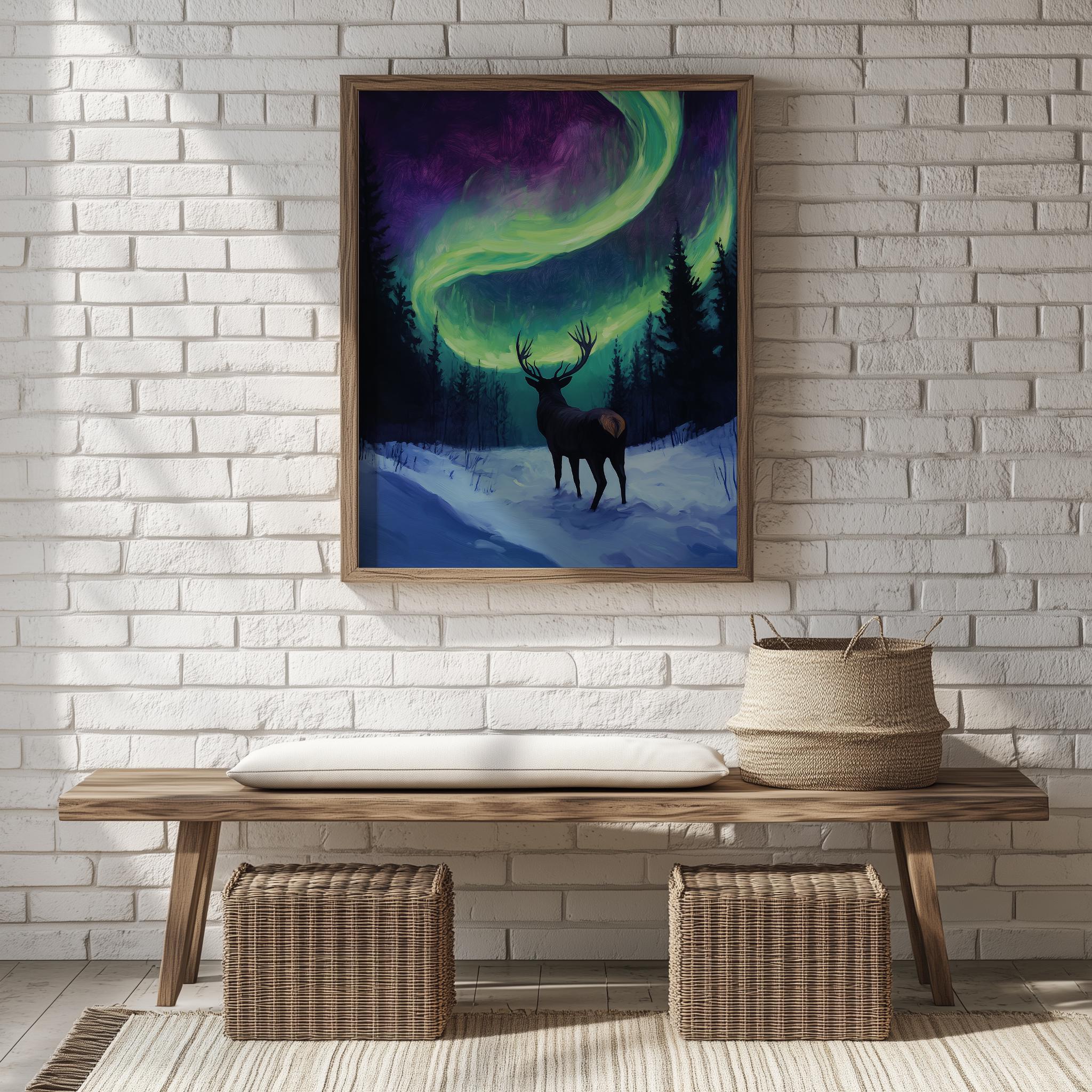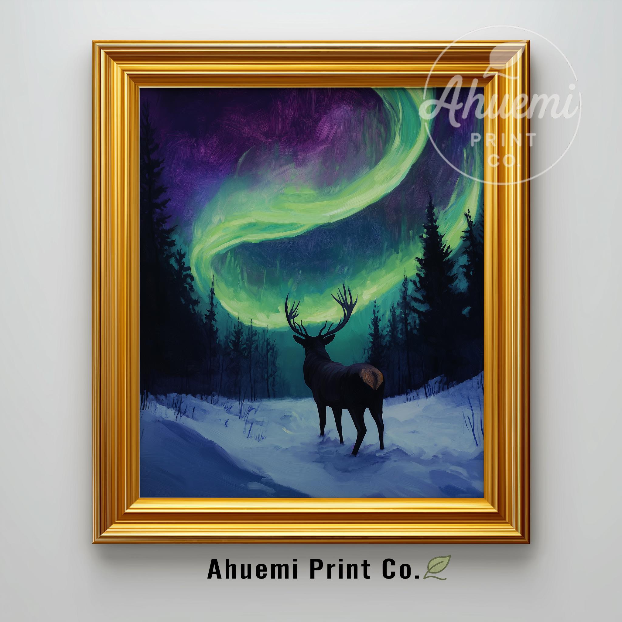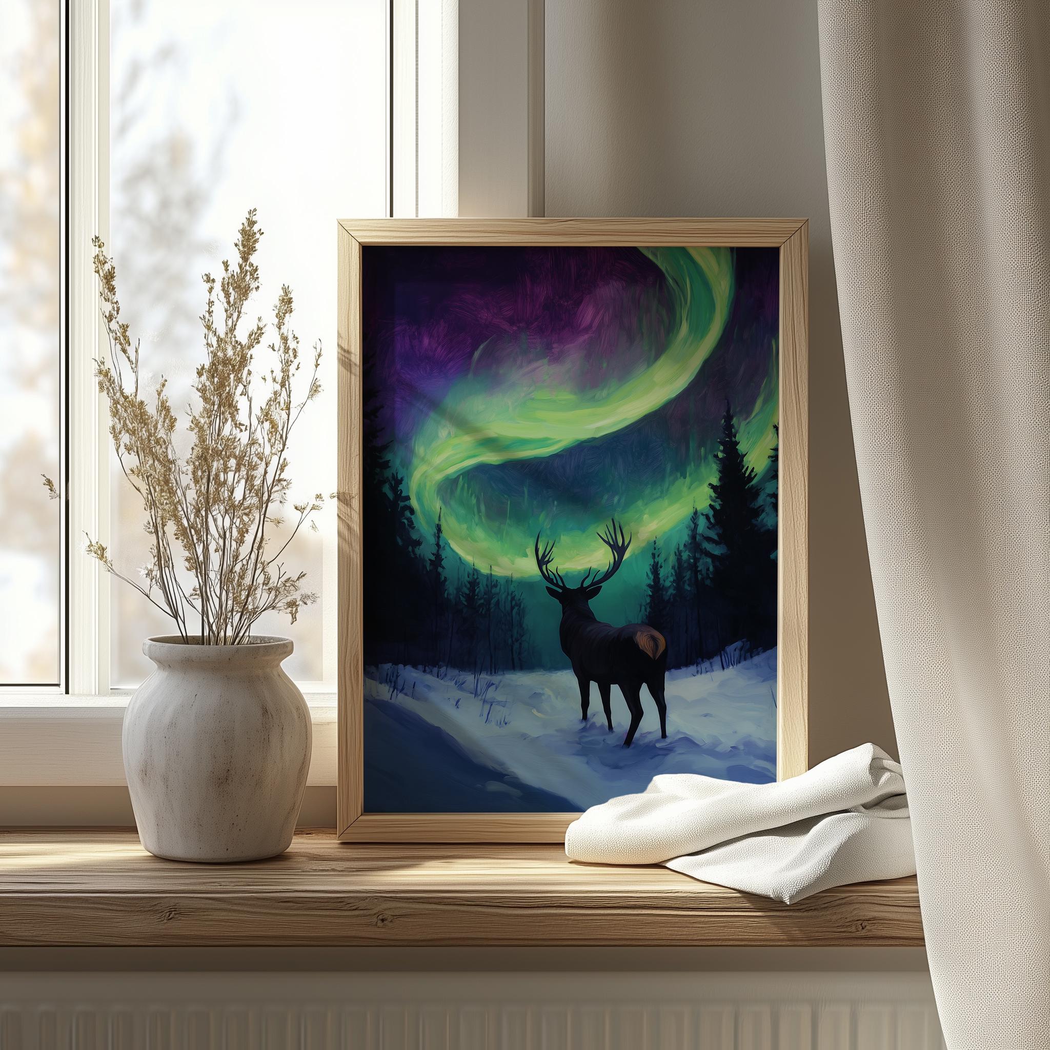 Immerse yourself in the charm of this rustic painting of a majestic stag wandering through a tranquil winter forest. An instantly downloadable print, it's perfect for elevating your decor with budget-friendly charm. This gives you the flexibility to customize the size, frame, and material according to your personal taste and space, ensuring a perfect fit for your walls.