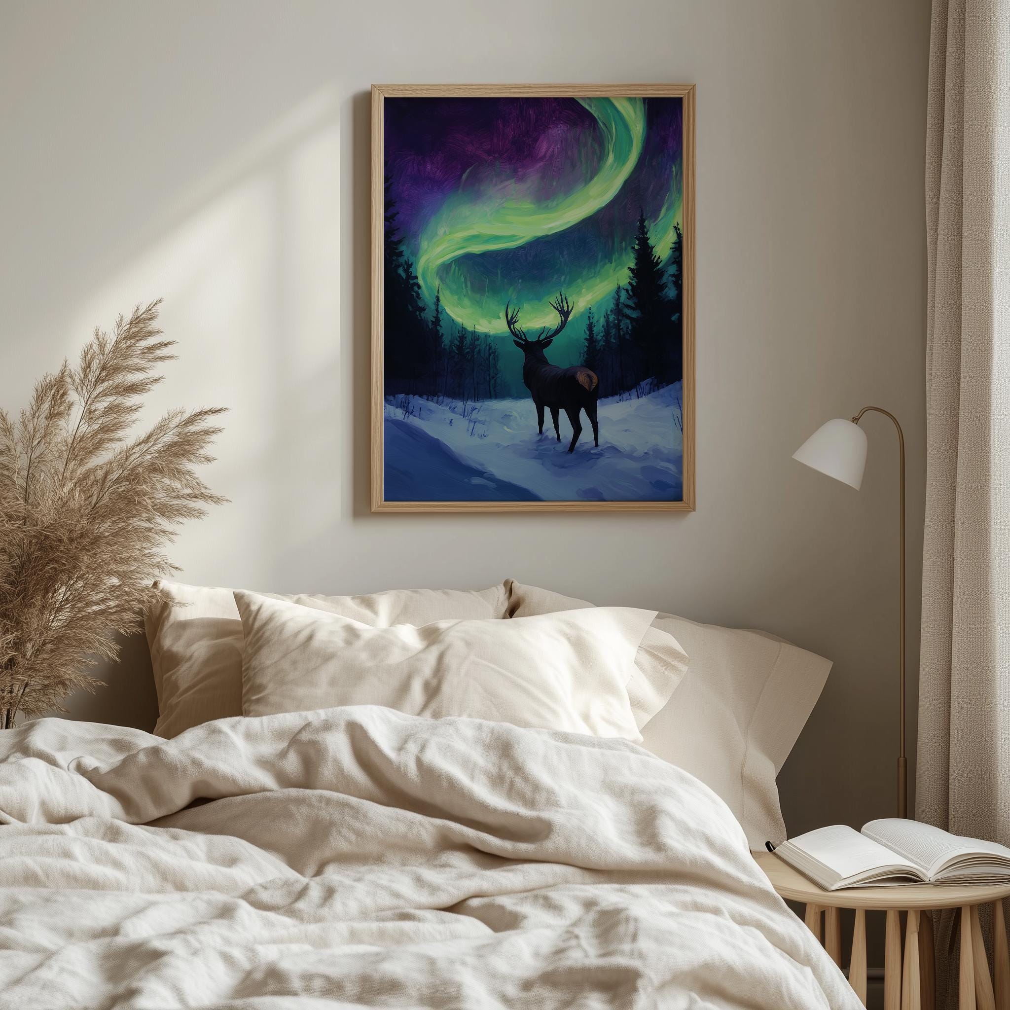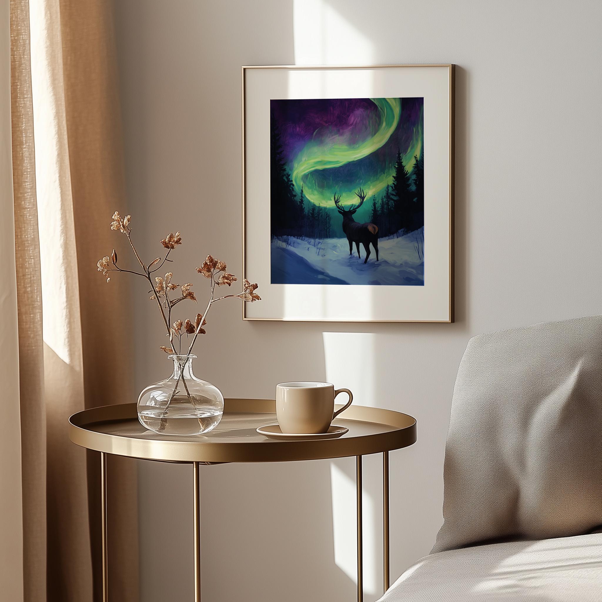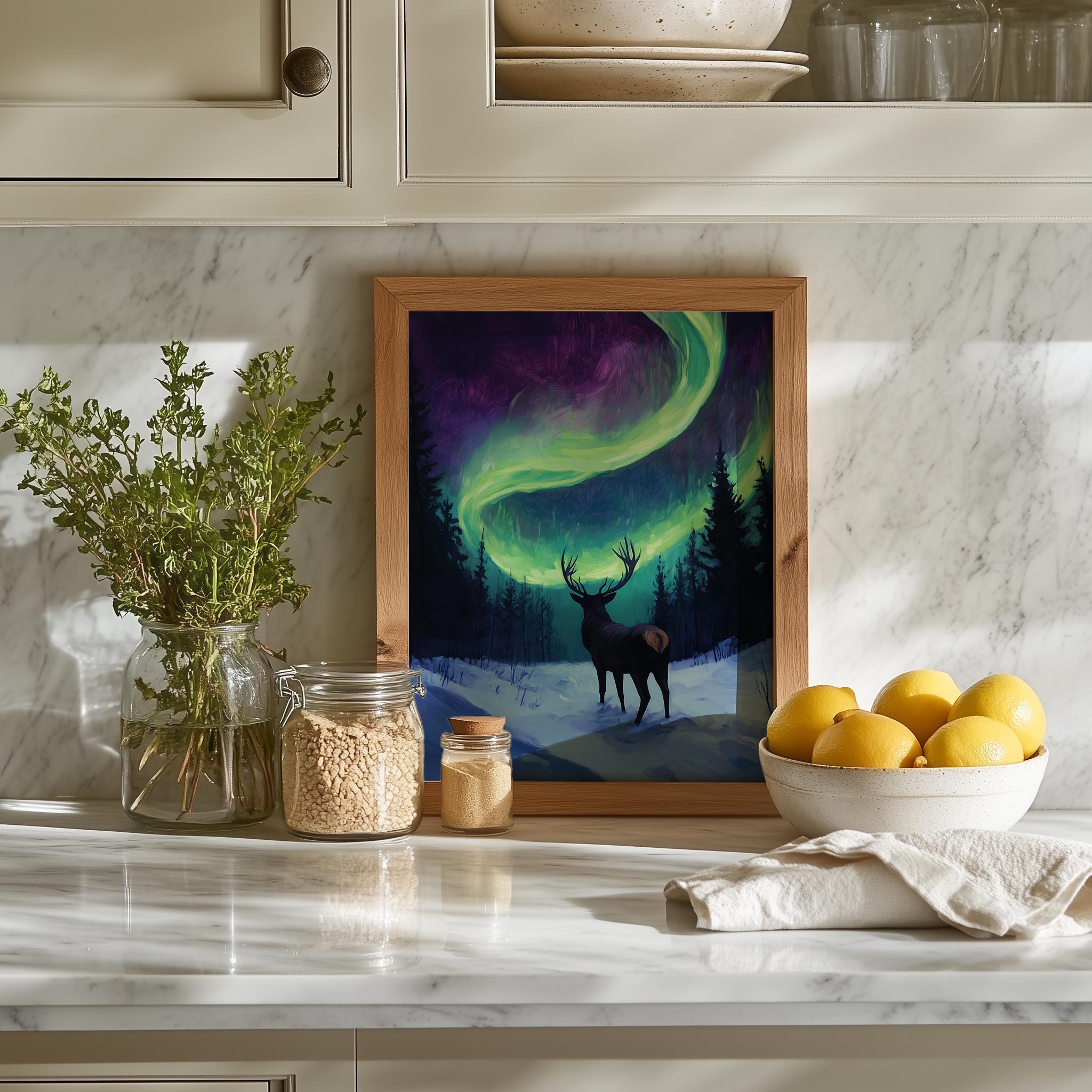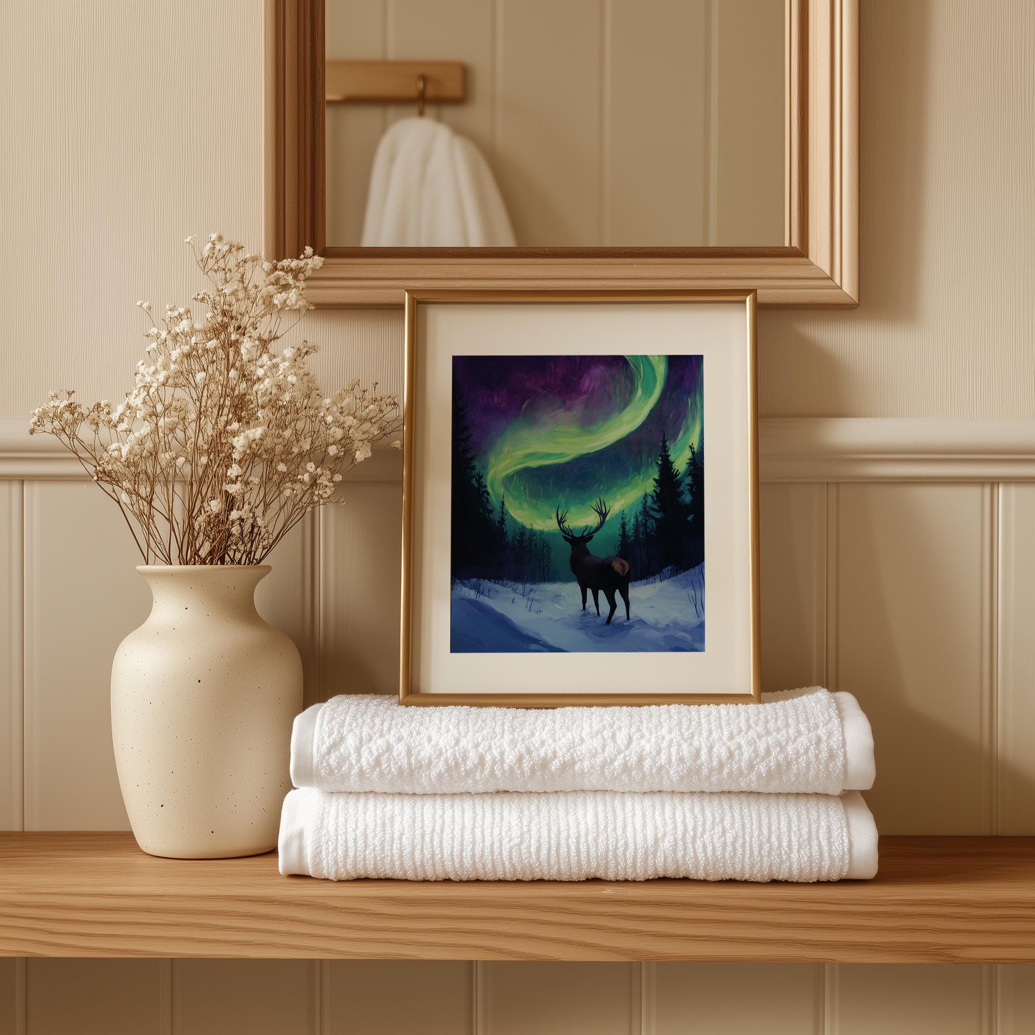 Immerse yourself in the charm of this rustic painting of a majestic stag wandering through a tranquil winter forest. An instantly downloadable print, it's perfect for elevating your decor with budget-friendly charm. This gives you the flexibility to customize the size, frame, and material according to your personal taste and space, ensuring a perfect fit for your walls.