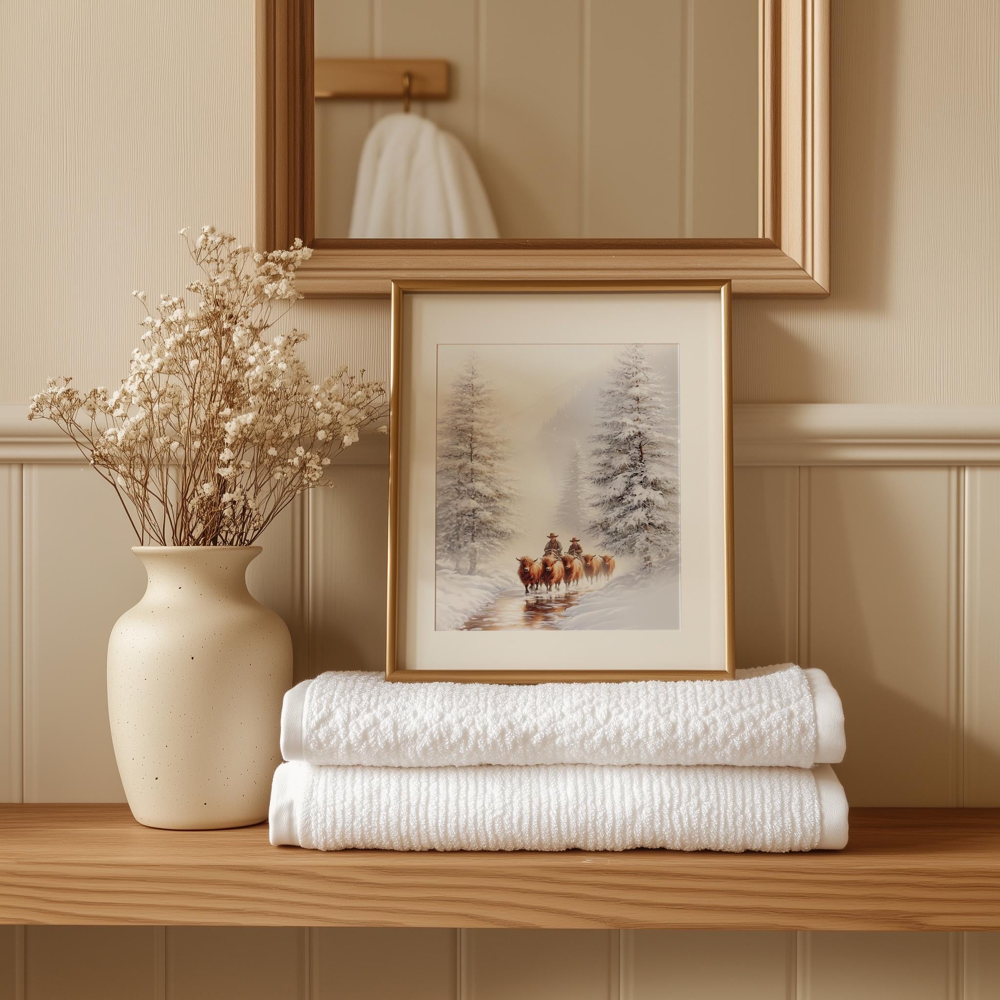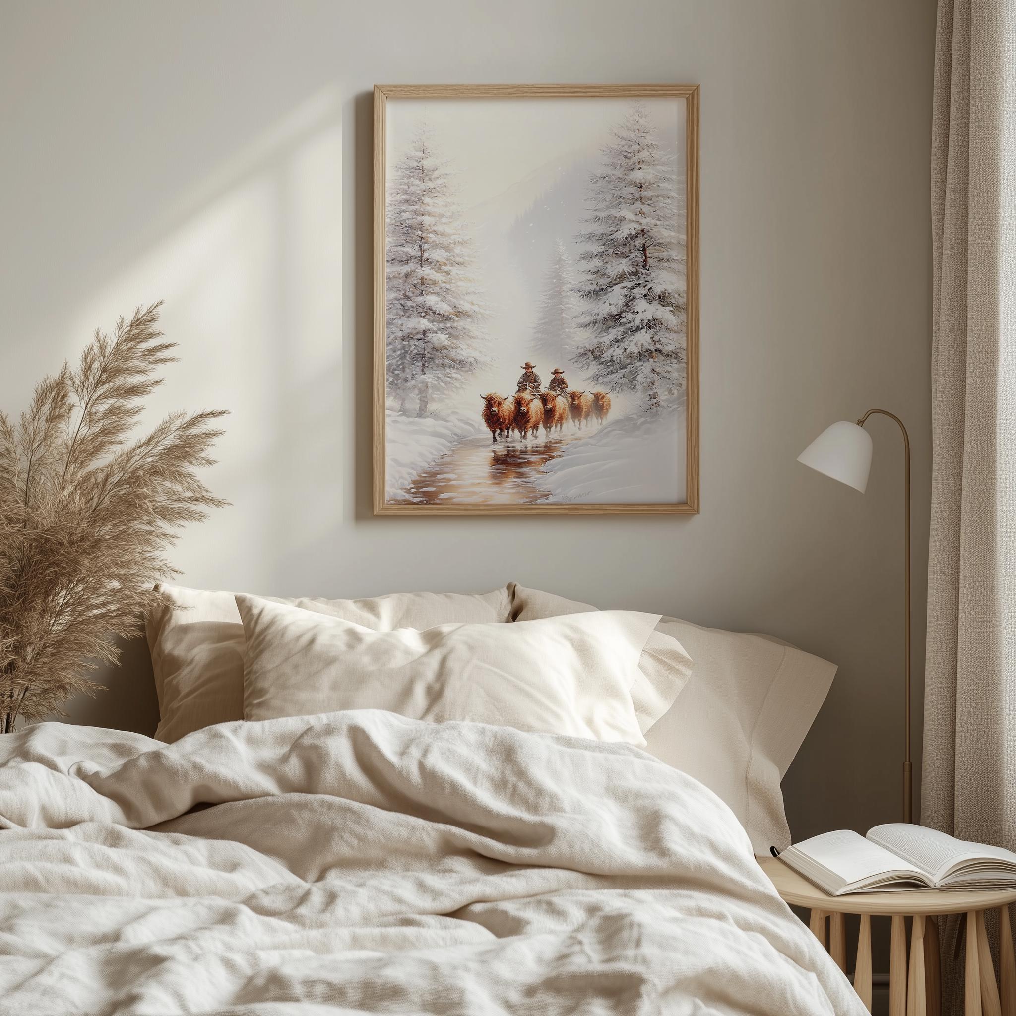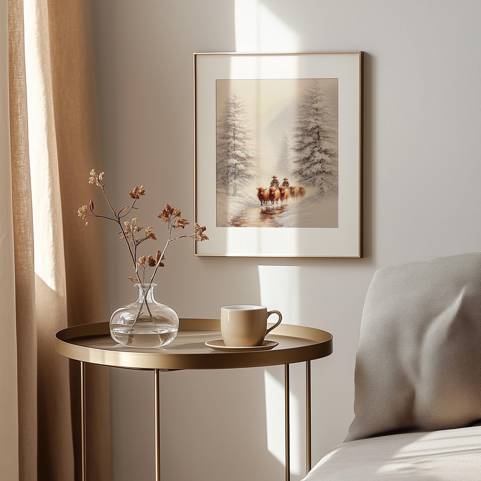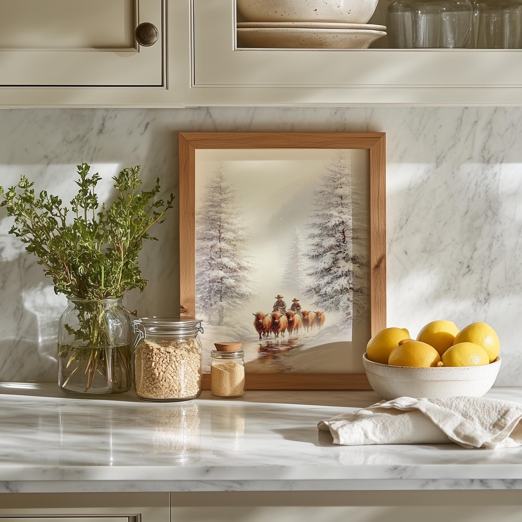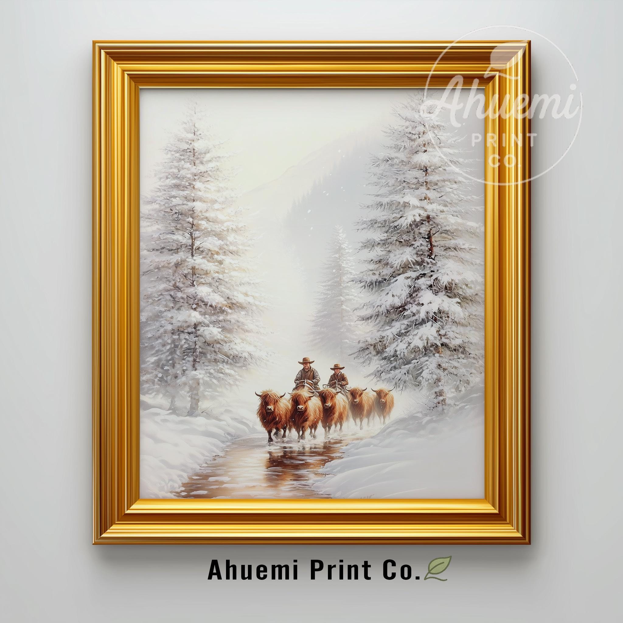 Immerse yourself in the charm of this rustic painting of a serene herd of Highland cattle traversing a snowy landscape. An instantly downloadable print, it's perfect for elevating your decor with budget-friendly charm. This gives you the flexibility to customize the size, frame, and material according to your personal taste and space, ensuring a perfect fit for your walls.