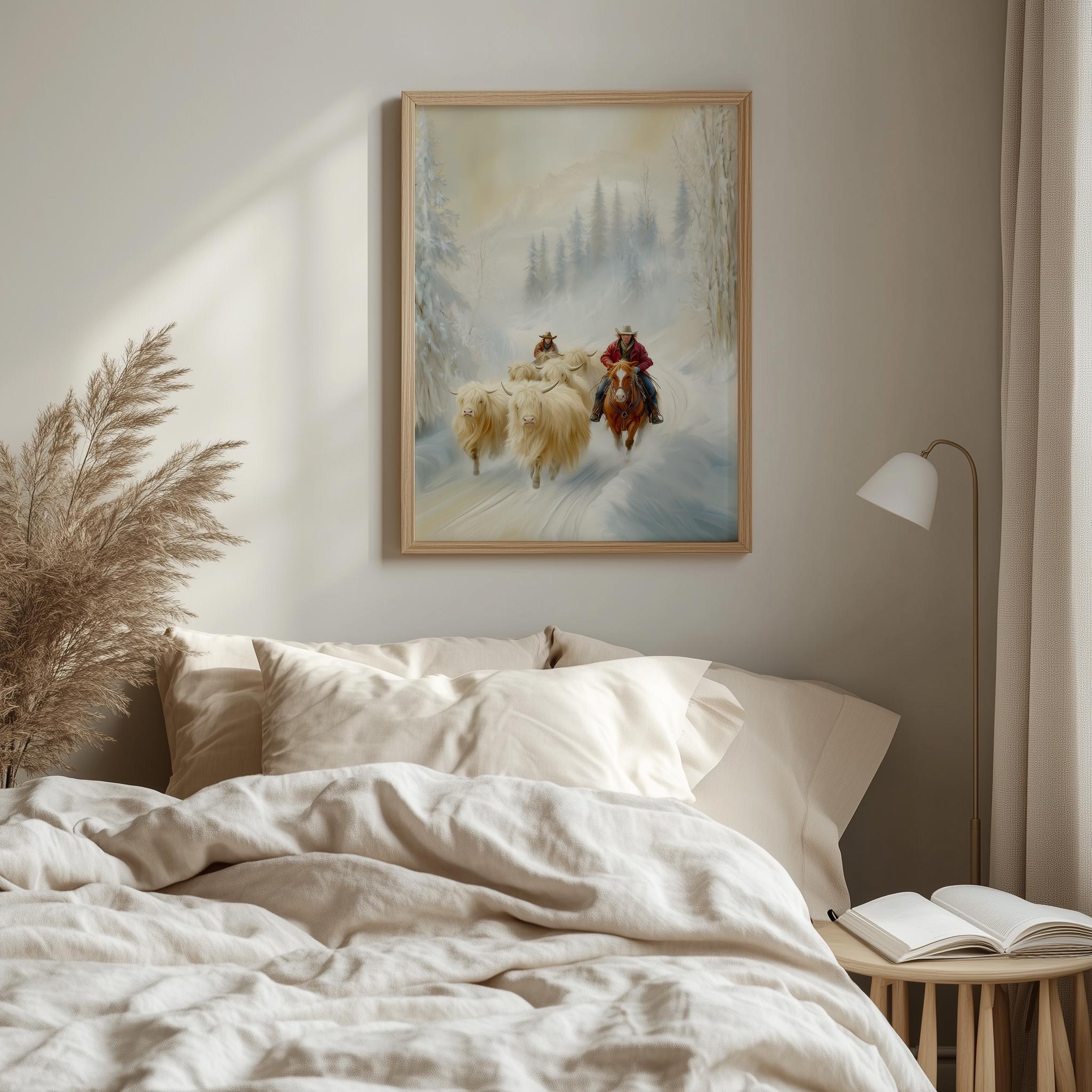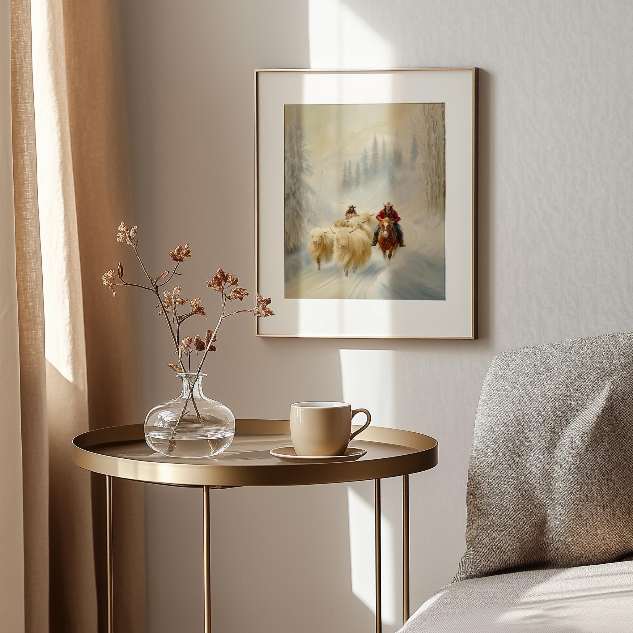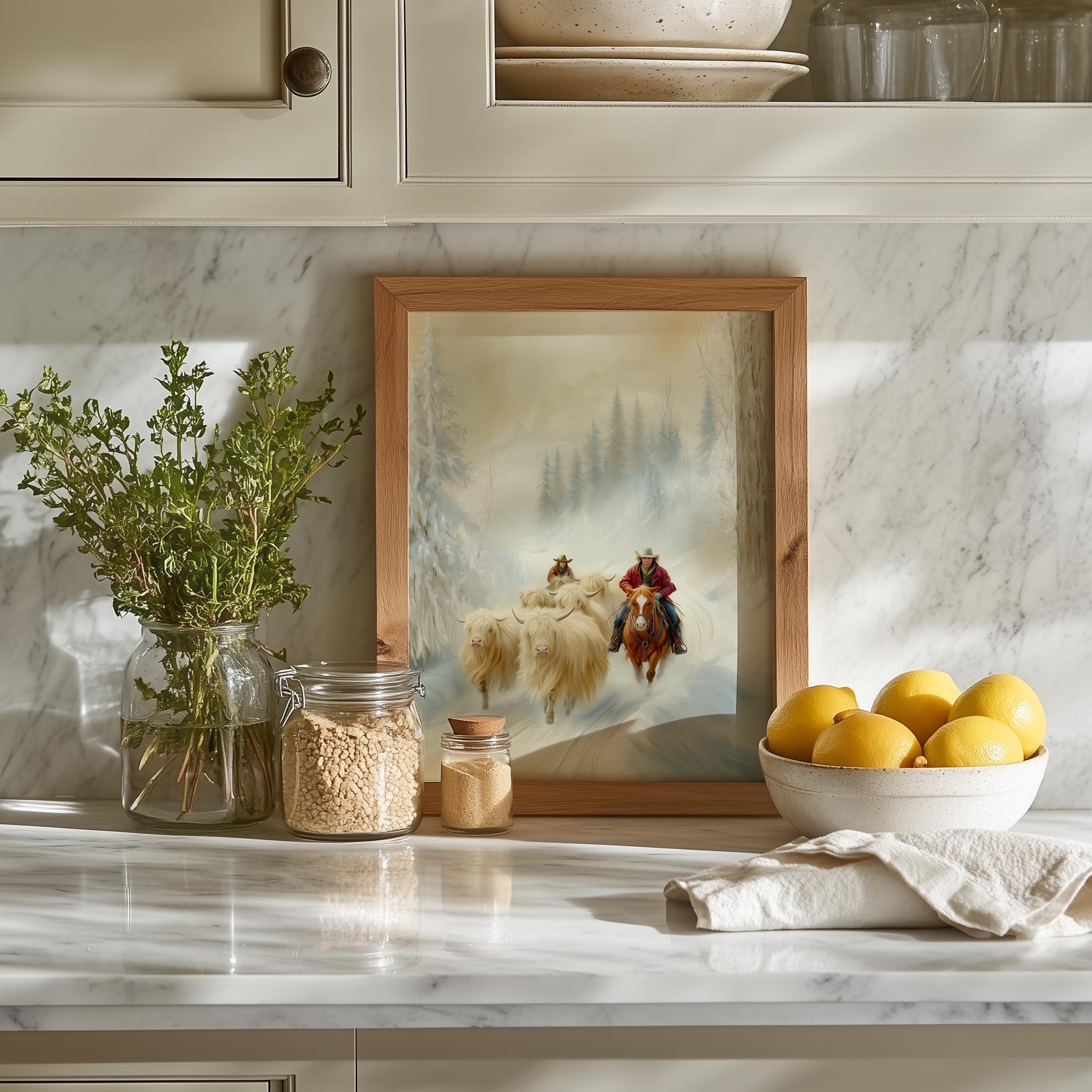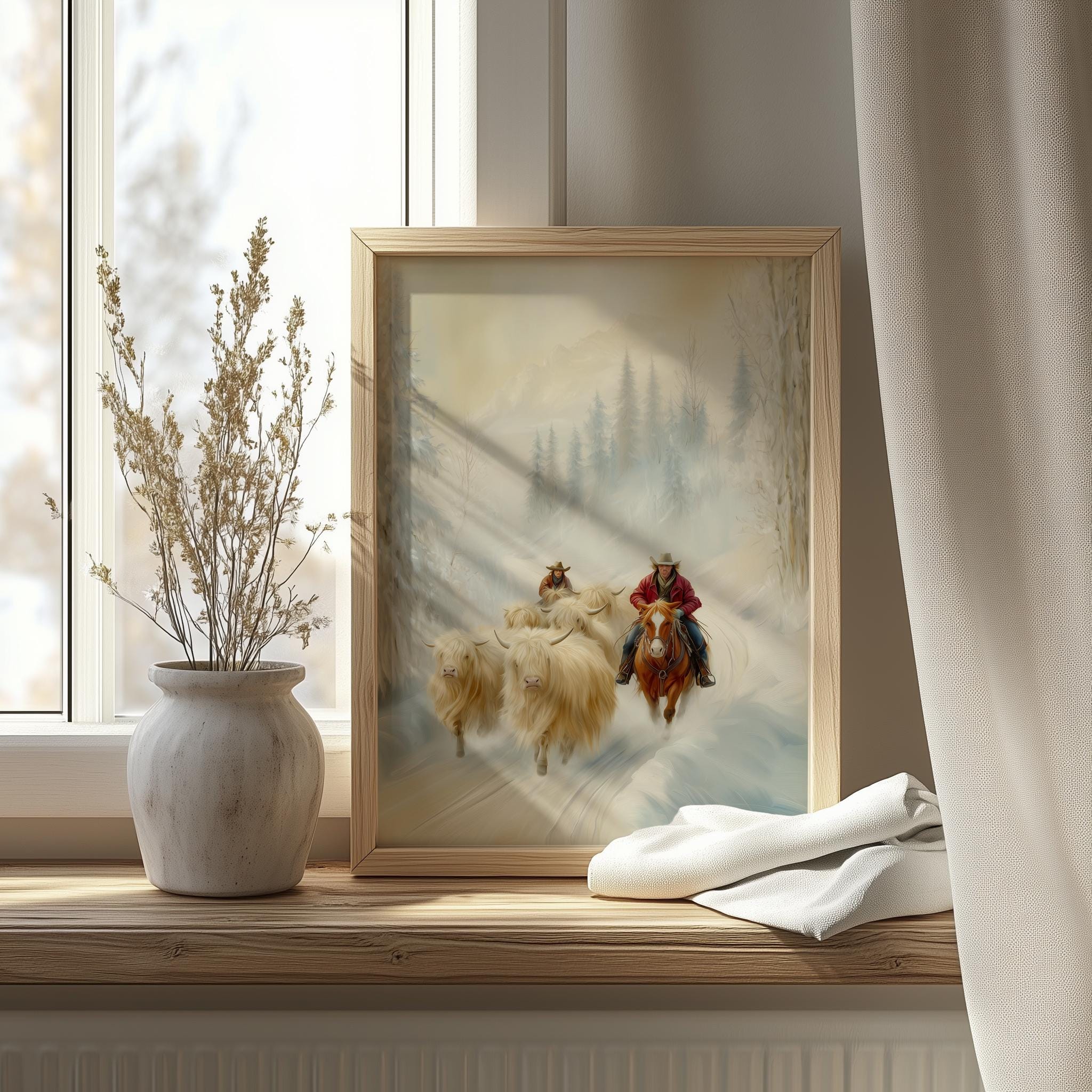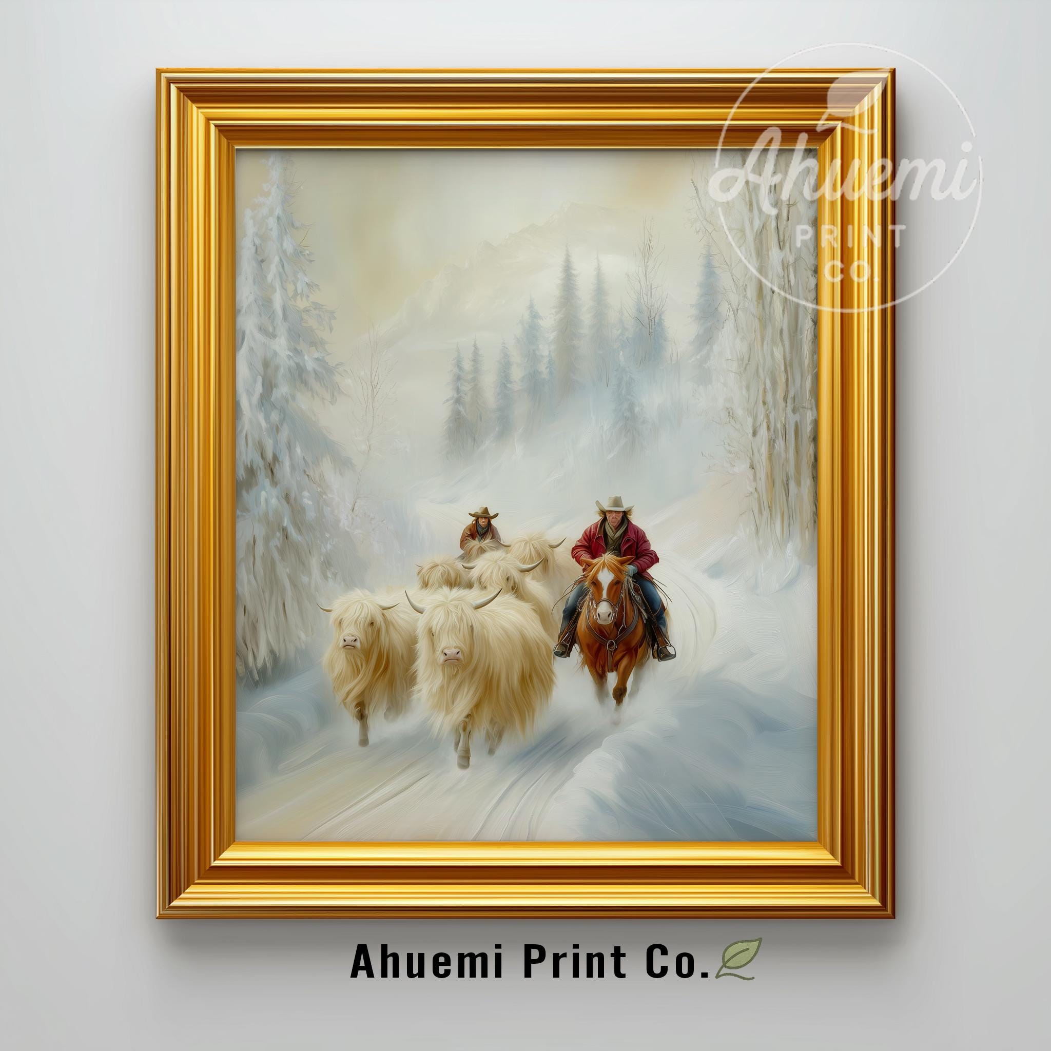 Immerse yourself in the charm of this rustic painting of shaggy Highland cattle navigating a snowy trail. An instantly downloadable print, it's perfect for elevating your decor with budget-friendly charm. This gives you the flexibility to customize the size, frame, and material according to your personal taste and space, ensuring a perfect fit for your walls.