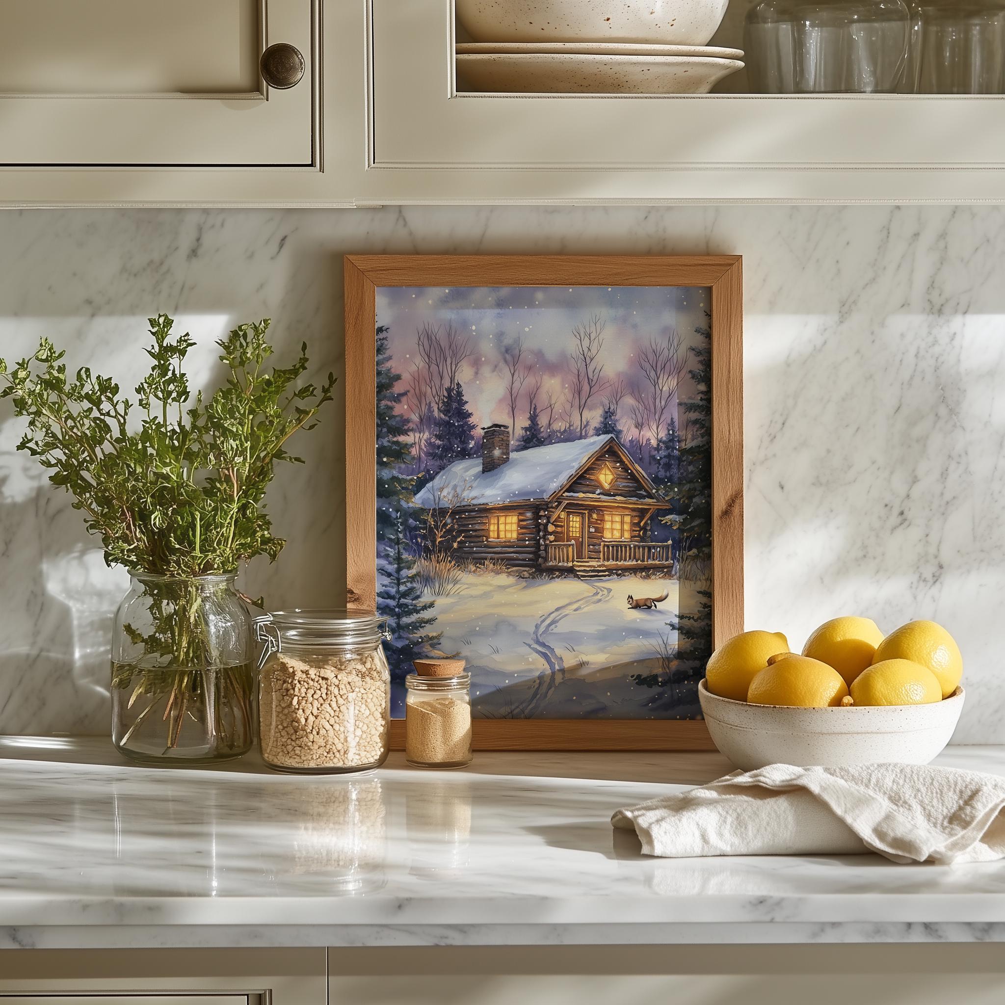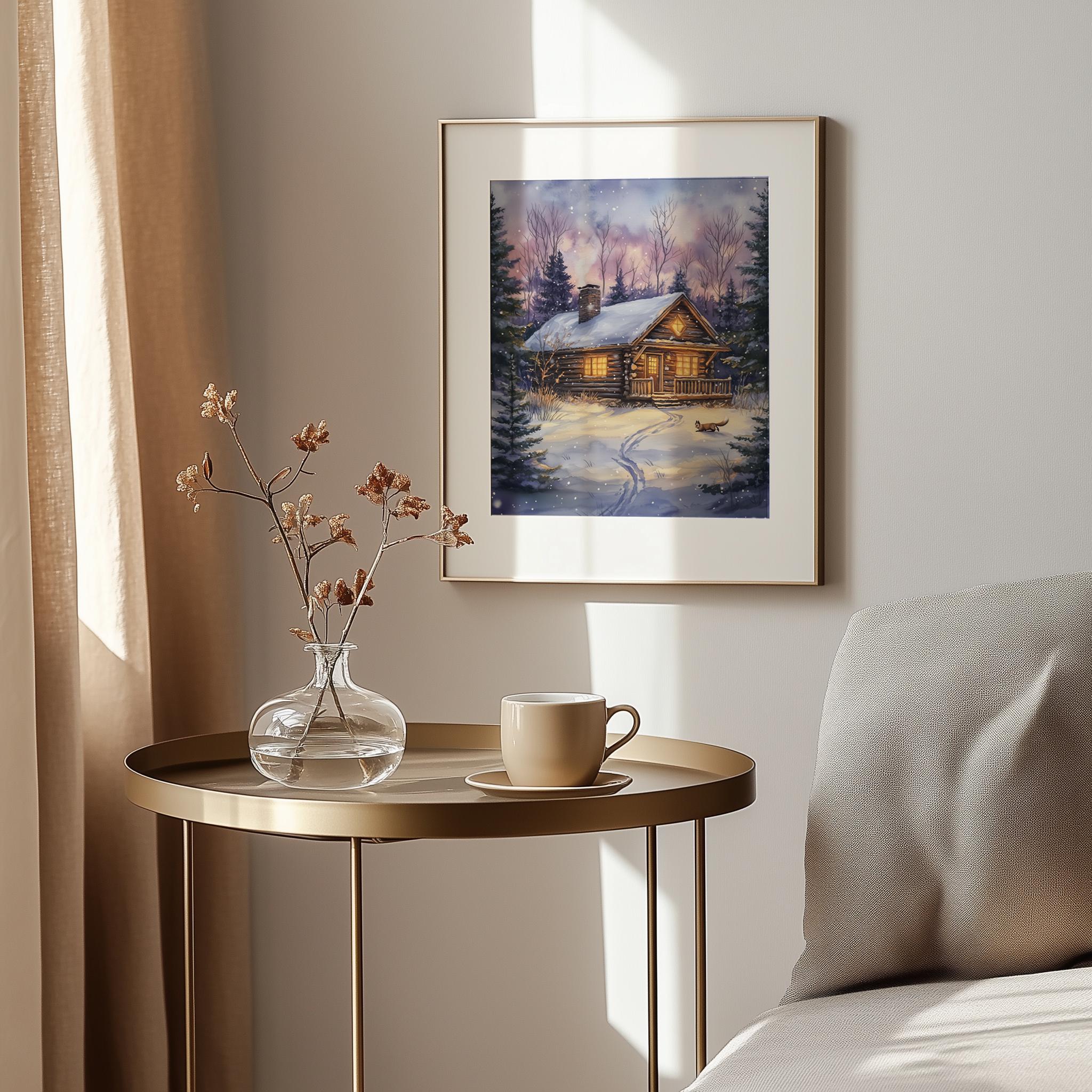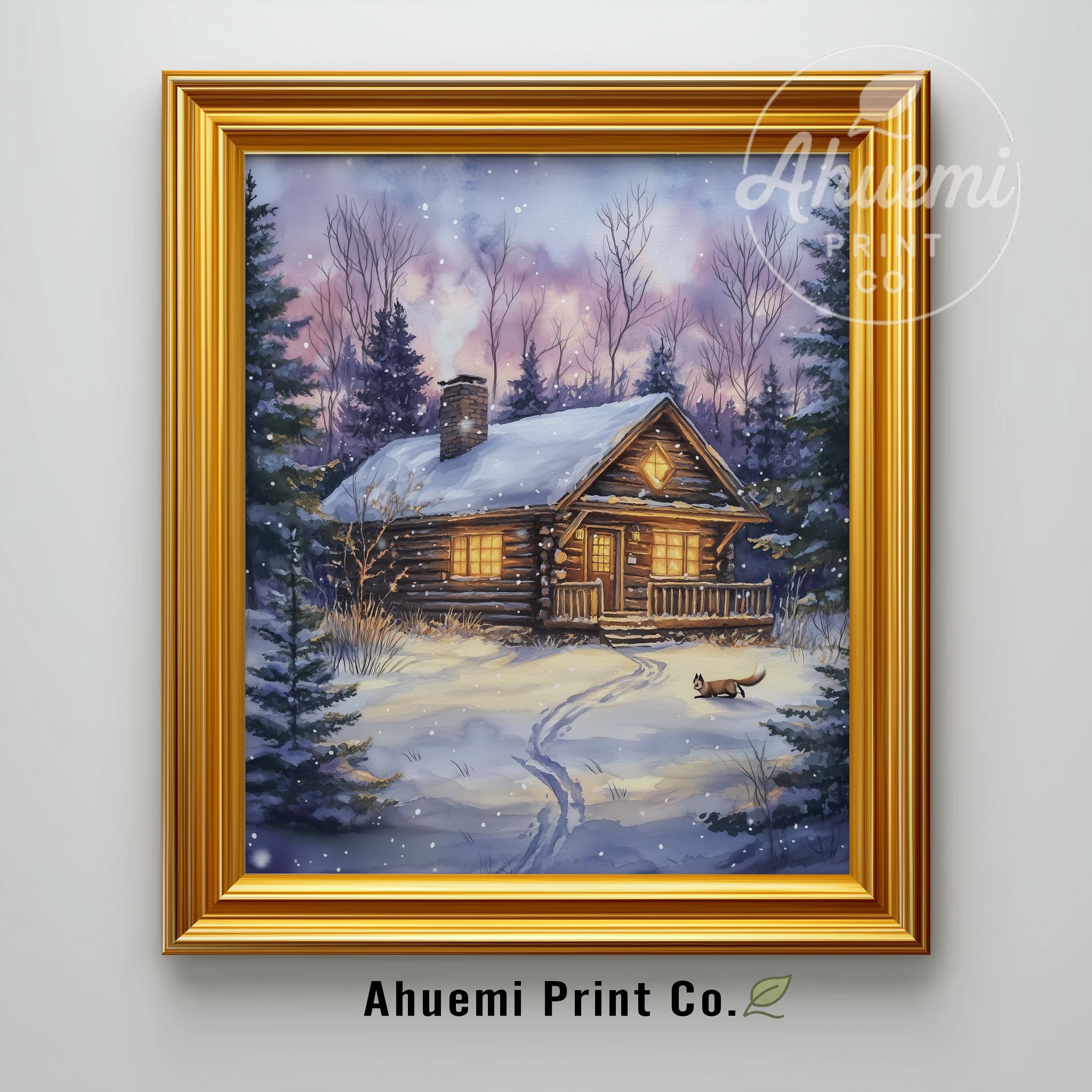 Immerse yourself in the charm of this rustic painting of a cozy winter cabin nestled in a snowy woodland setting. An instantly downloadable print, it's perfect for elevating your decor with budget-friendly charm. This gives you the flexibility to customize the size, frame, and material according to your personal taste and space, ensuring a perfect fit for your walls.