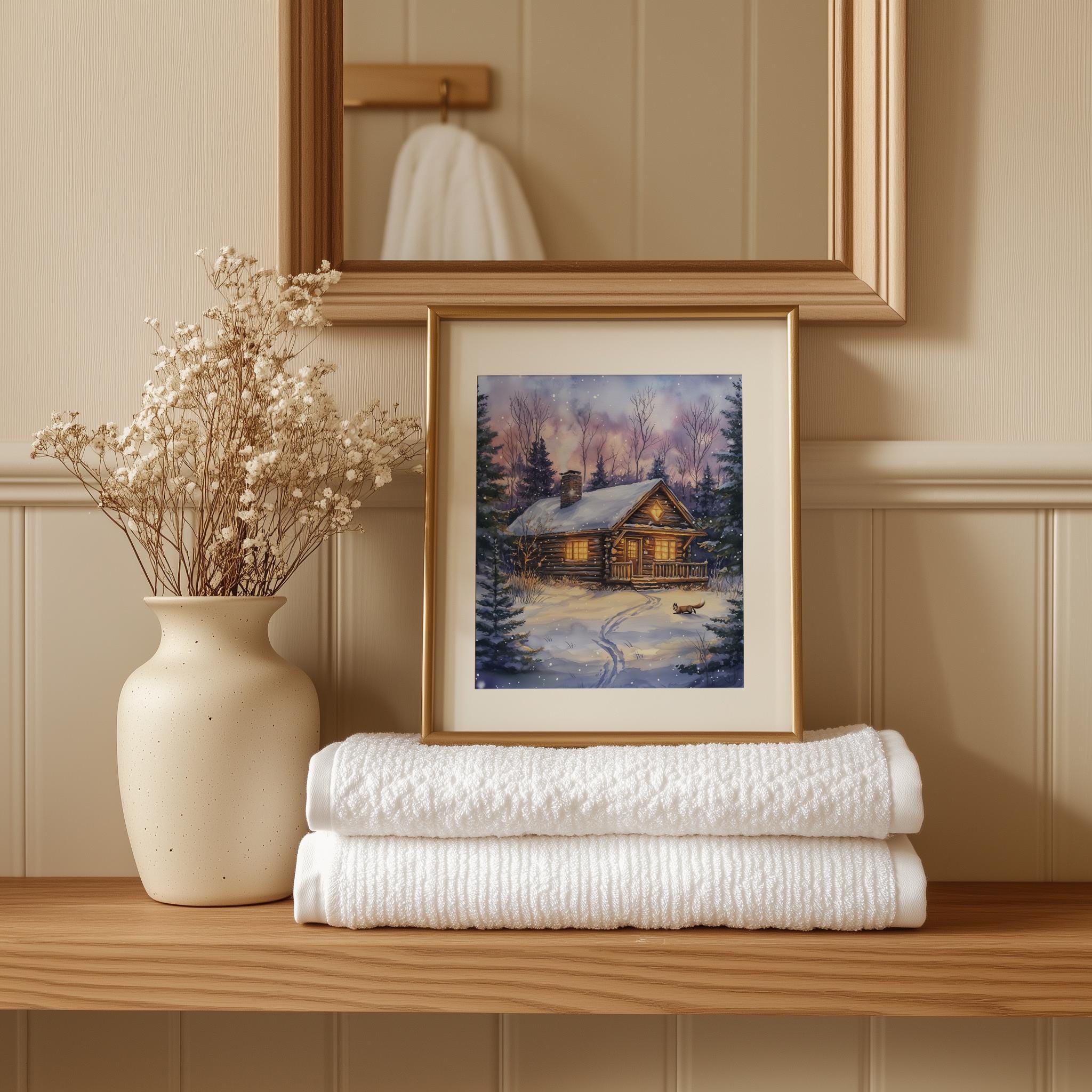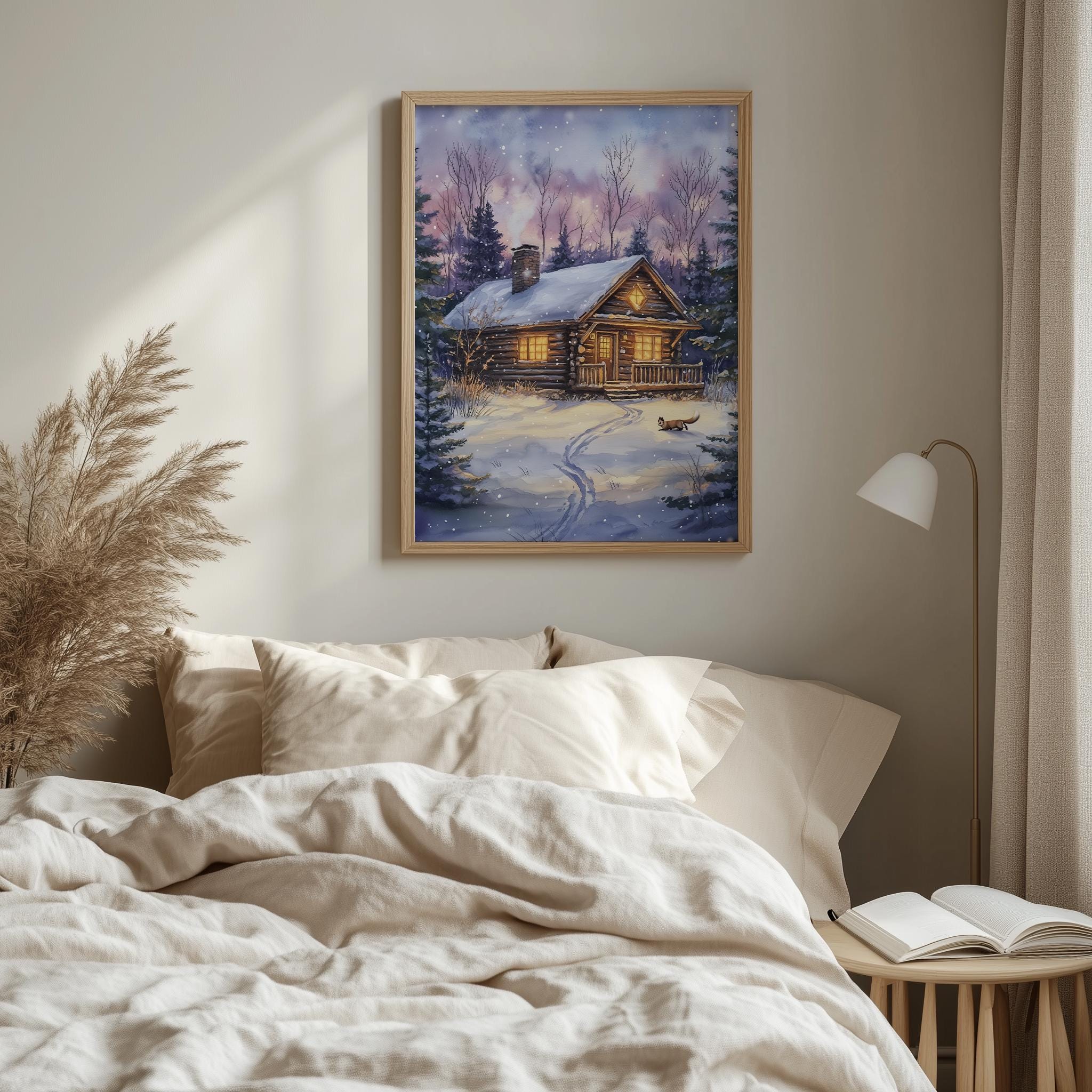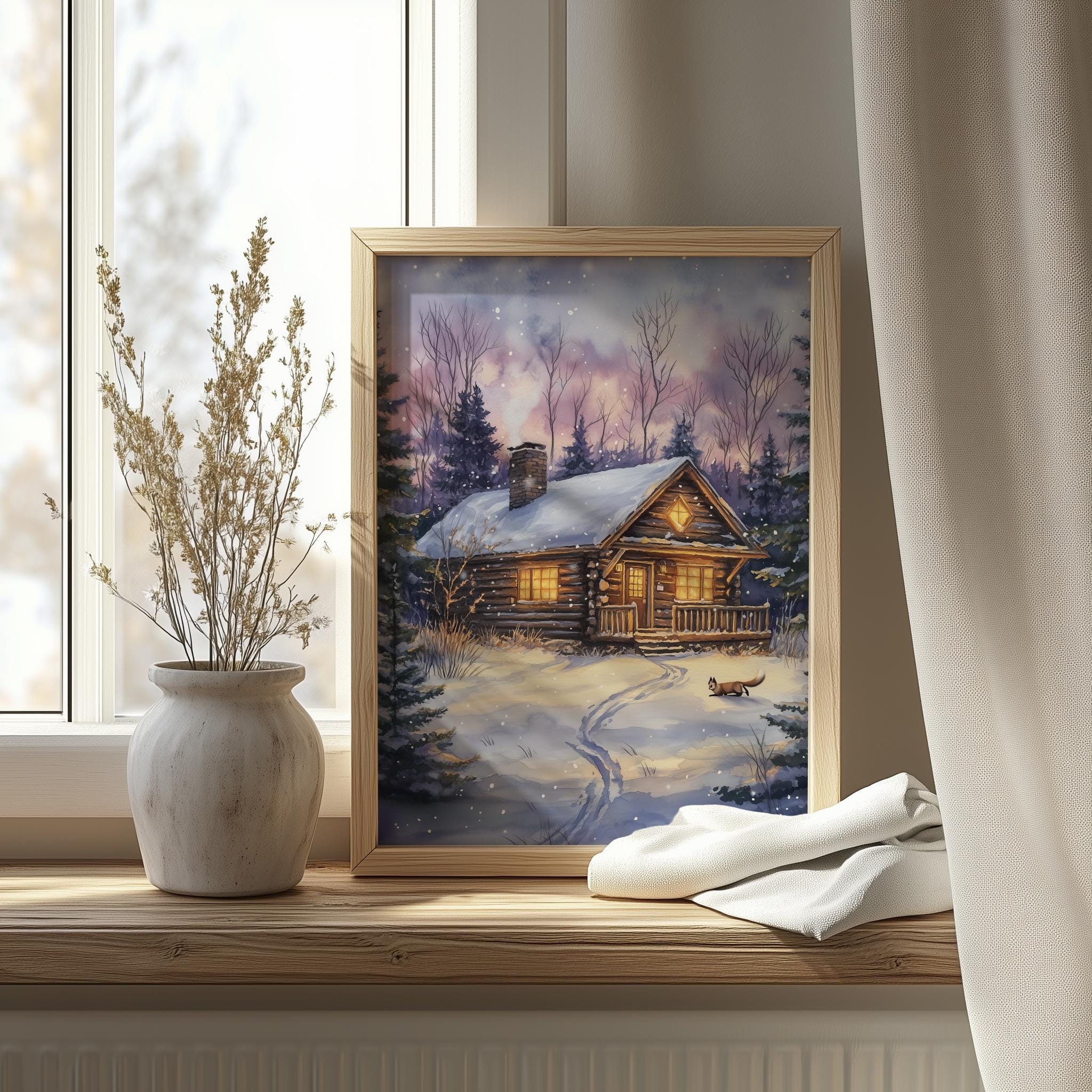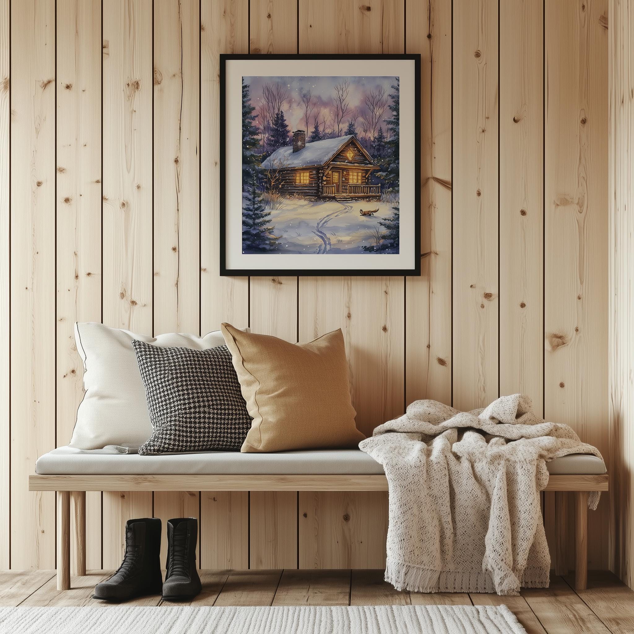Immerse yourself in the charm of this rustic painting of a cozy winter cabin nestled in a snowy woodland setting. An instantly downloadable print, it's perfect for elevating your decor with budget-friendly charm. This gives you the flexibility to customize the size, frame, and material according to your personal taste and space, ensuring a perfect fit for your walls.