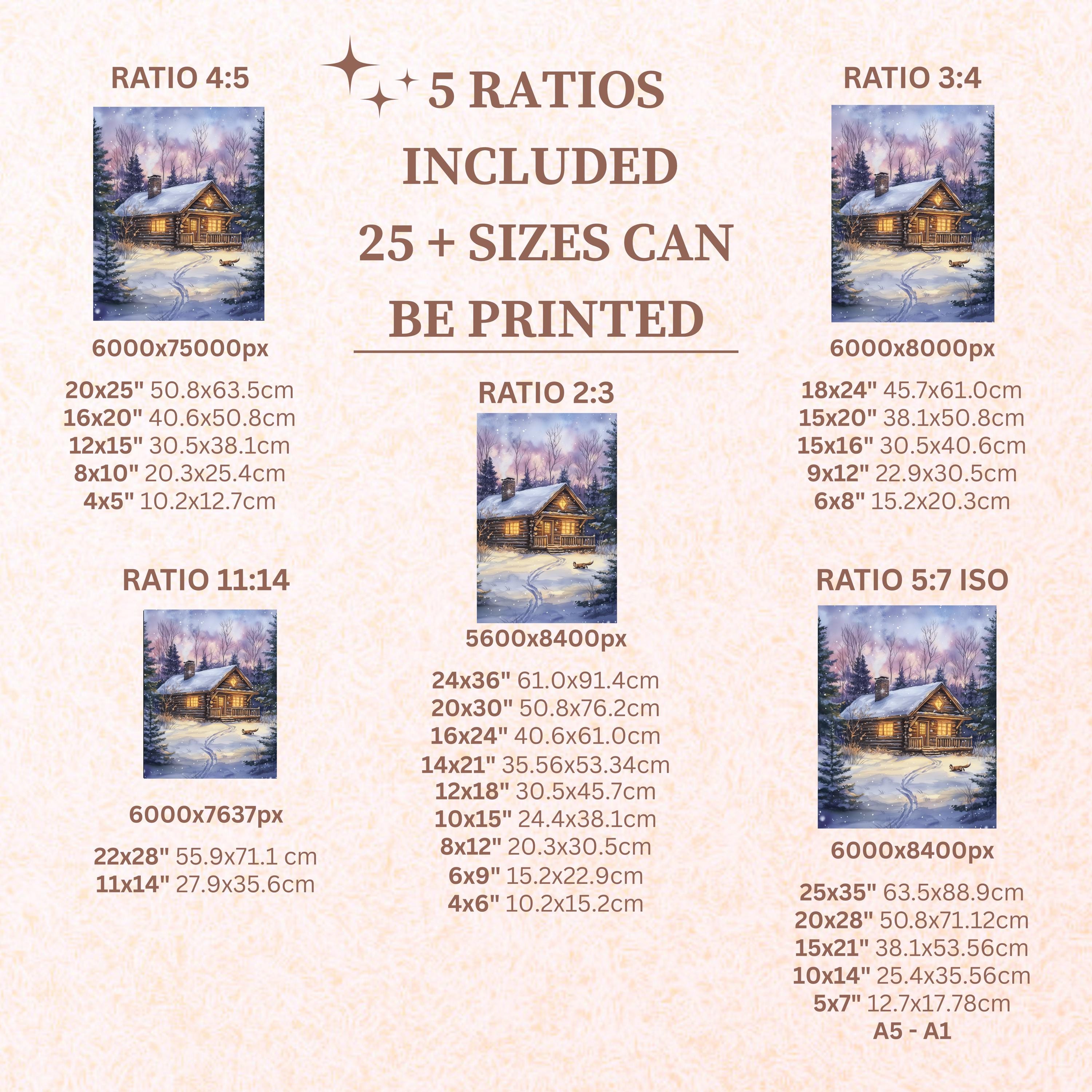 Each artwork includes 5 aspect ratios with 25+ print sizes. Most standard frames are covered. One custom resize per purchase available—message before ordering.