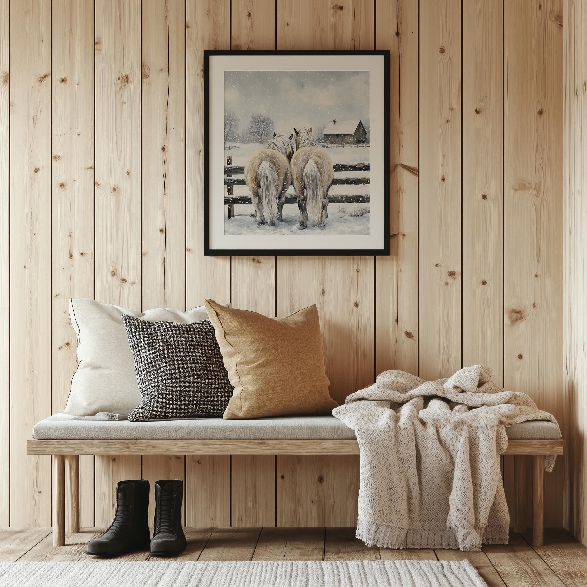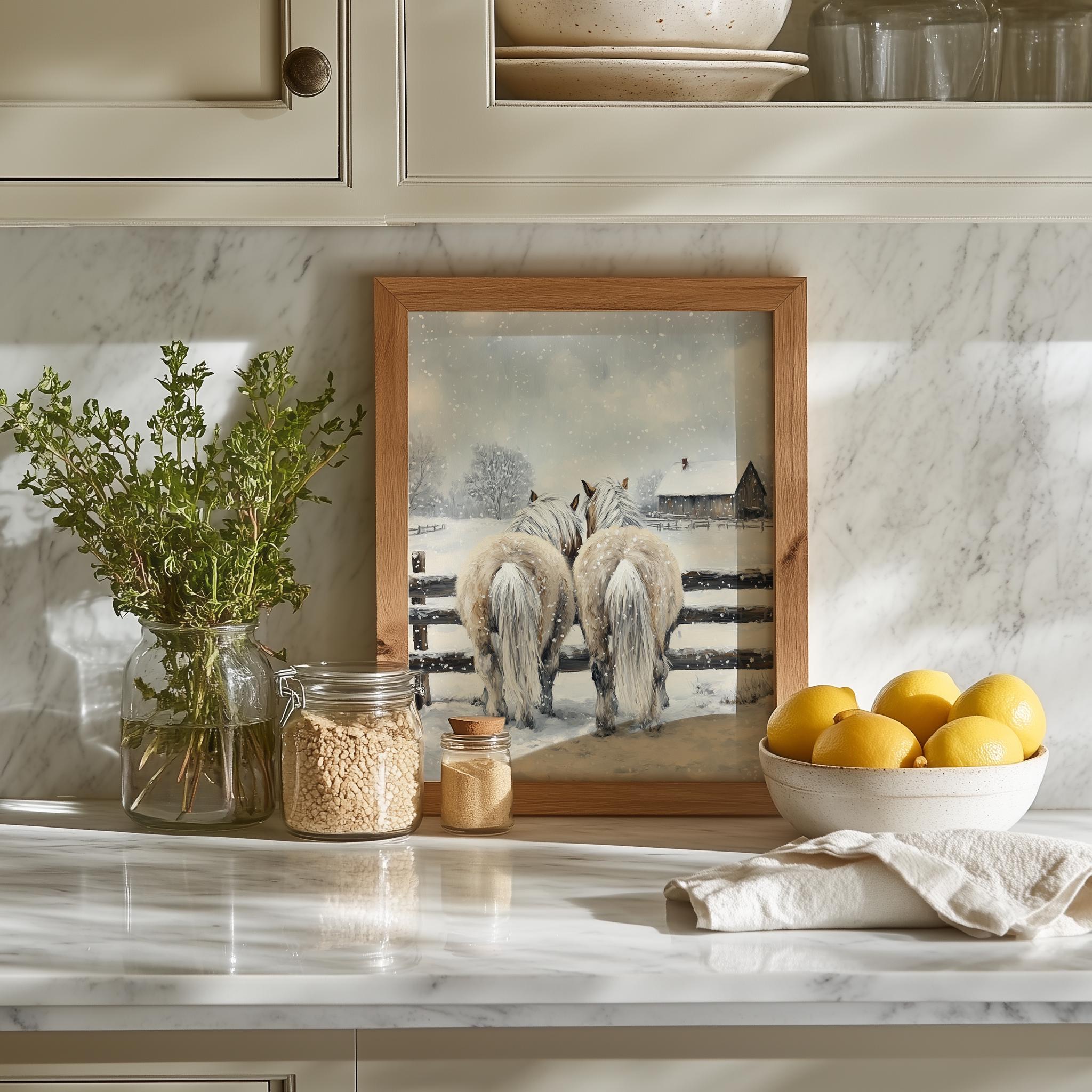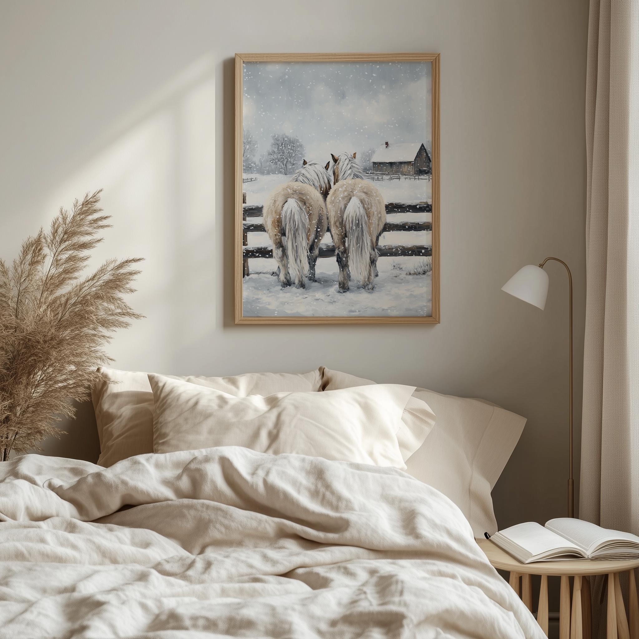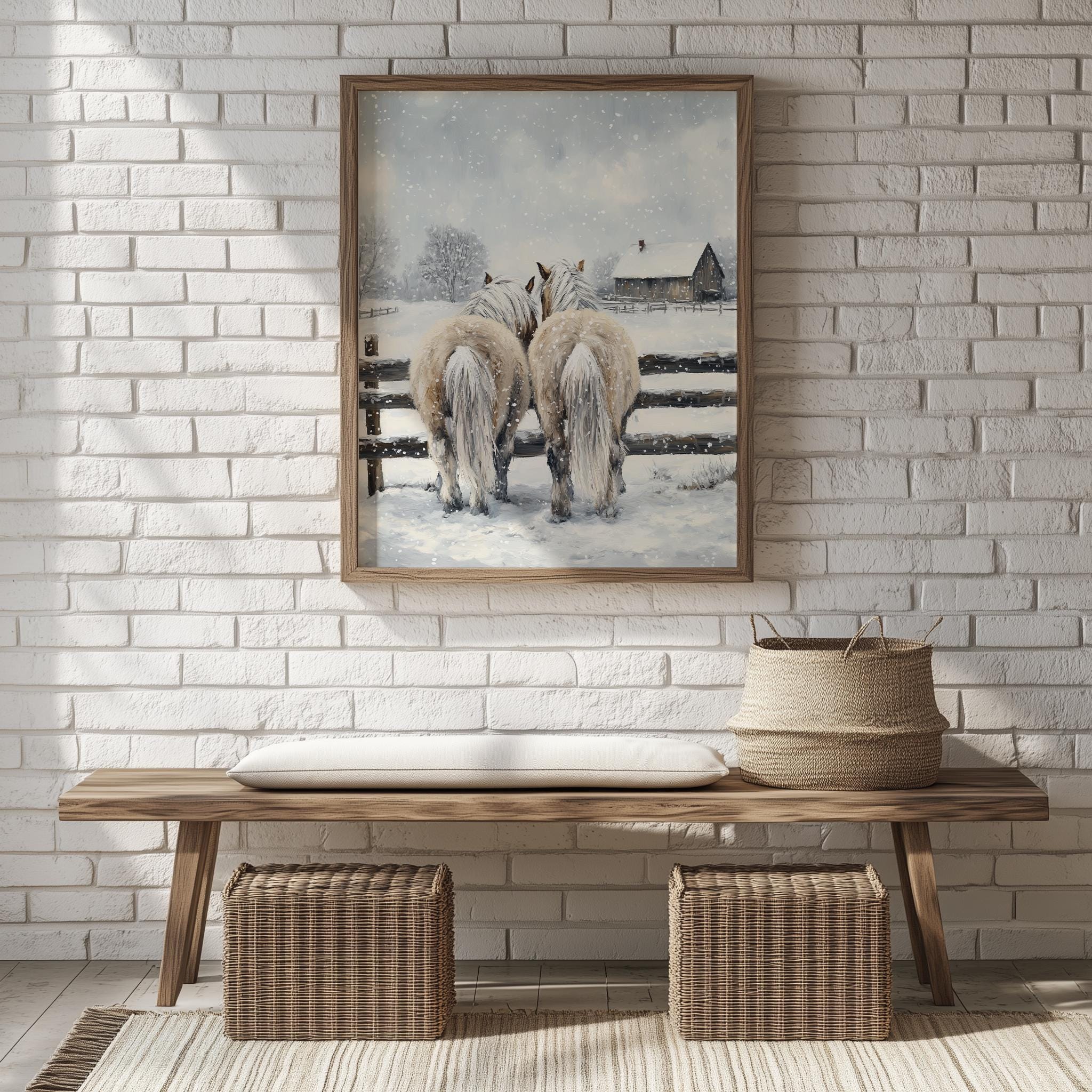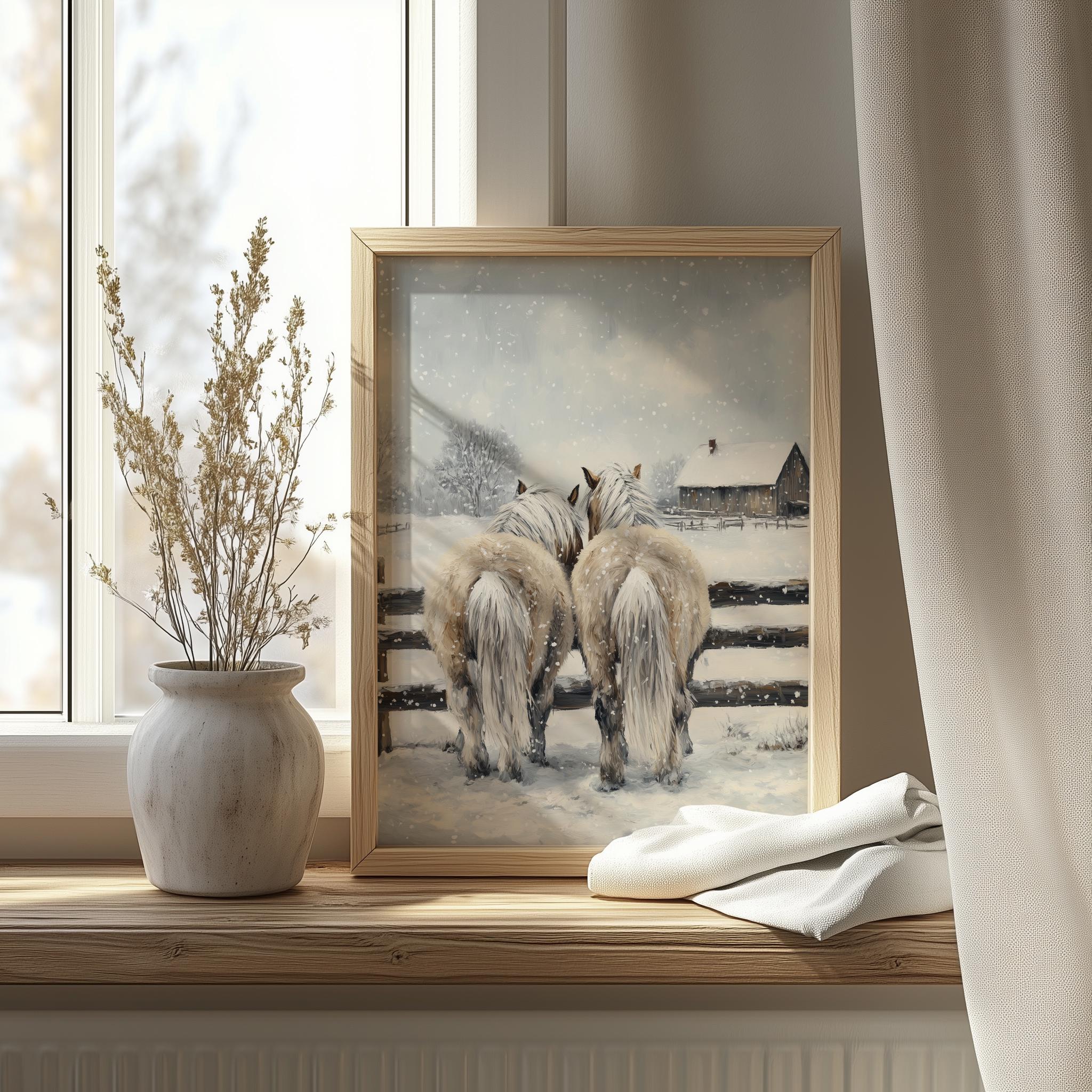 Immerse yourself in the charm of this rustic painting of shaggy horses roaming in a snowy field. An instantly downloadable print, it's perfect for elevating your decor with budget-friendly charm. This gives you the flexibility to customize the size, frame, and material according to your personal taste and space, ensuring a perfect fit for your walls.