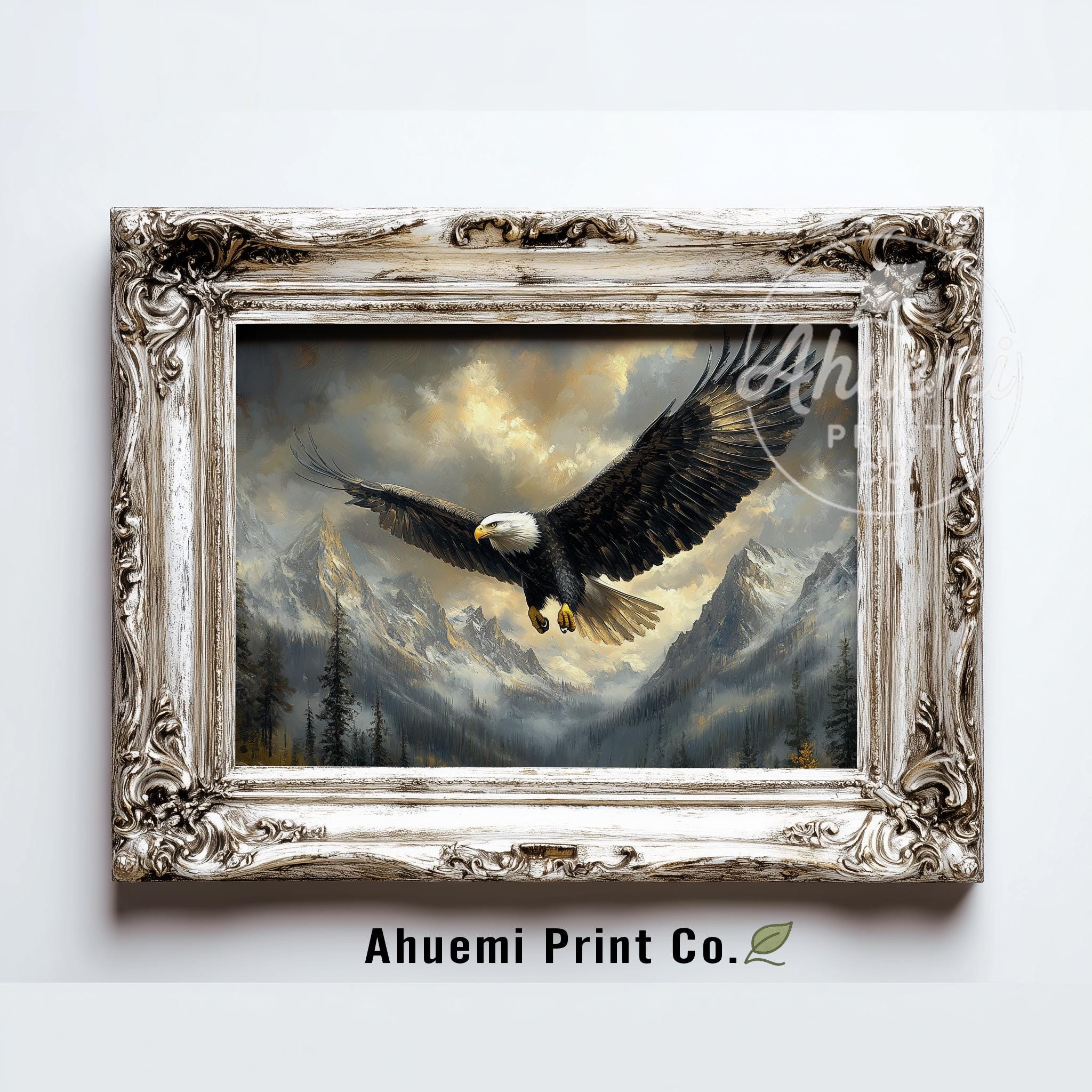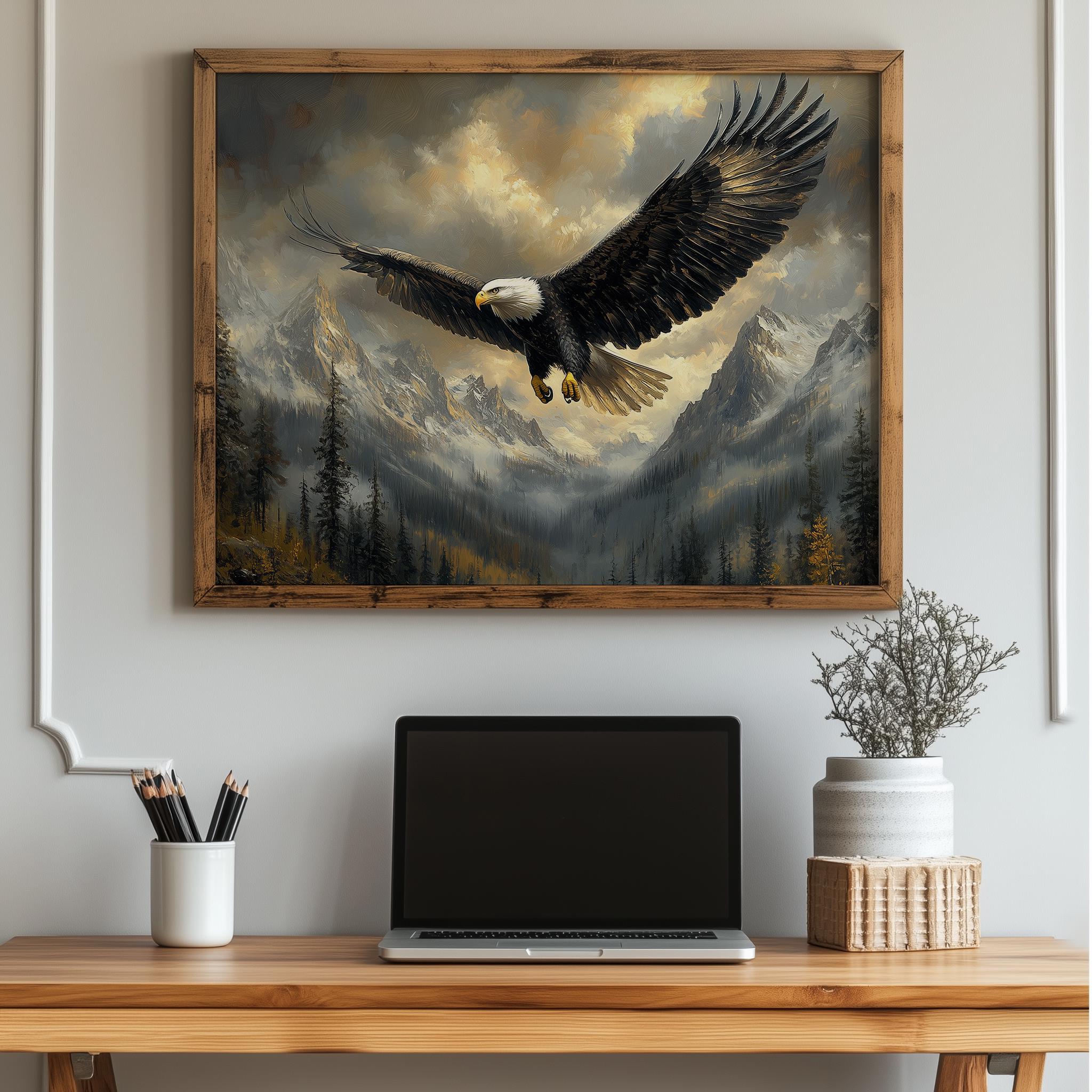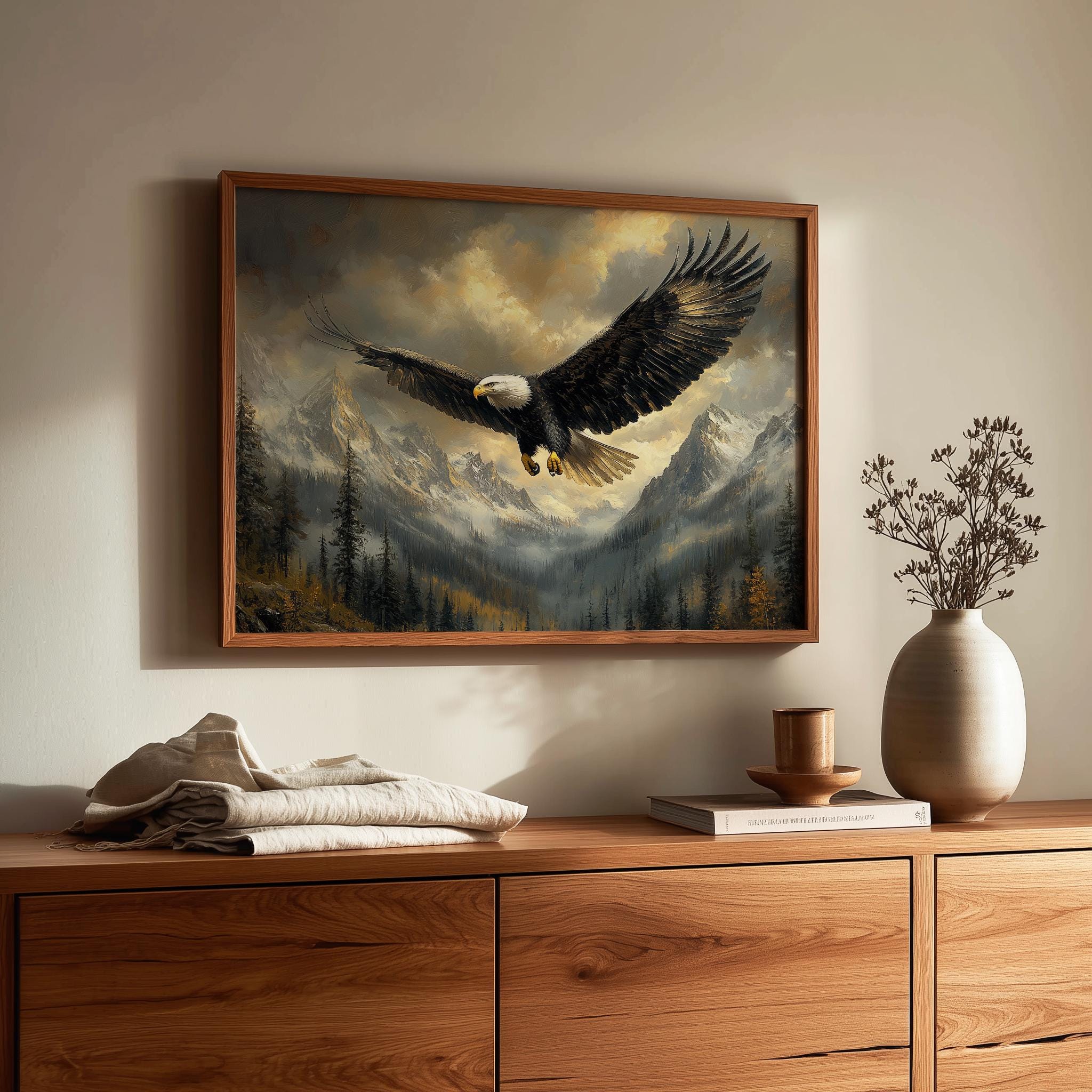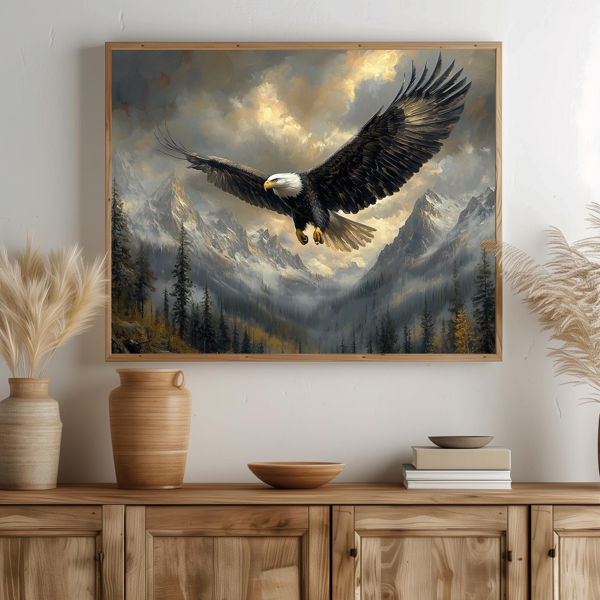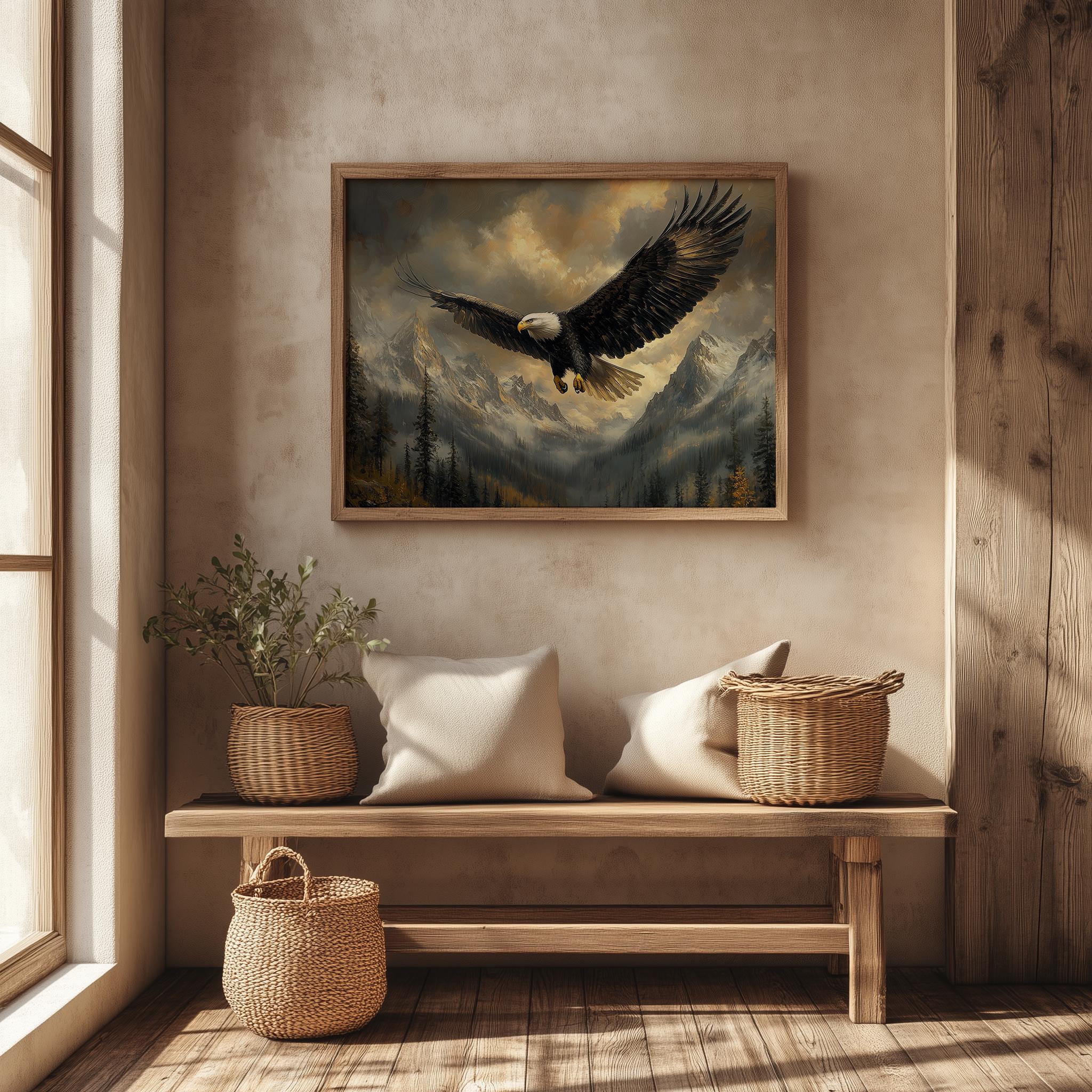 Immerse yourself in the charm with this rustic painting of a majestic bald eagle soaring through a stormy mountain landscape. An instantly downloadable print, it's perfect for elevating your decor with budget-friendly charm. This gives you the flexibility to customize the size, frame, and material according to your personal taste and space, ensuring a perfect fit for your walls.