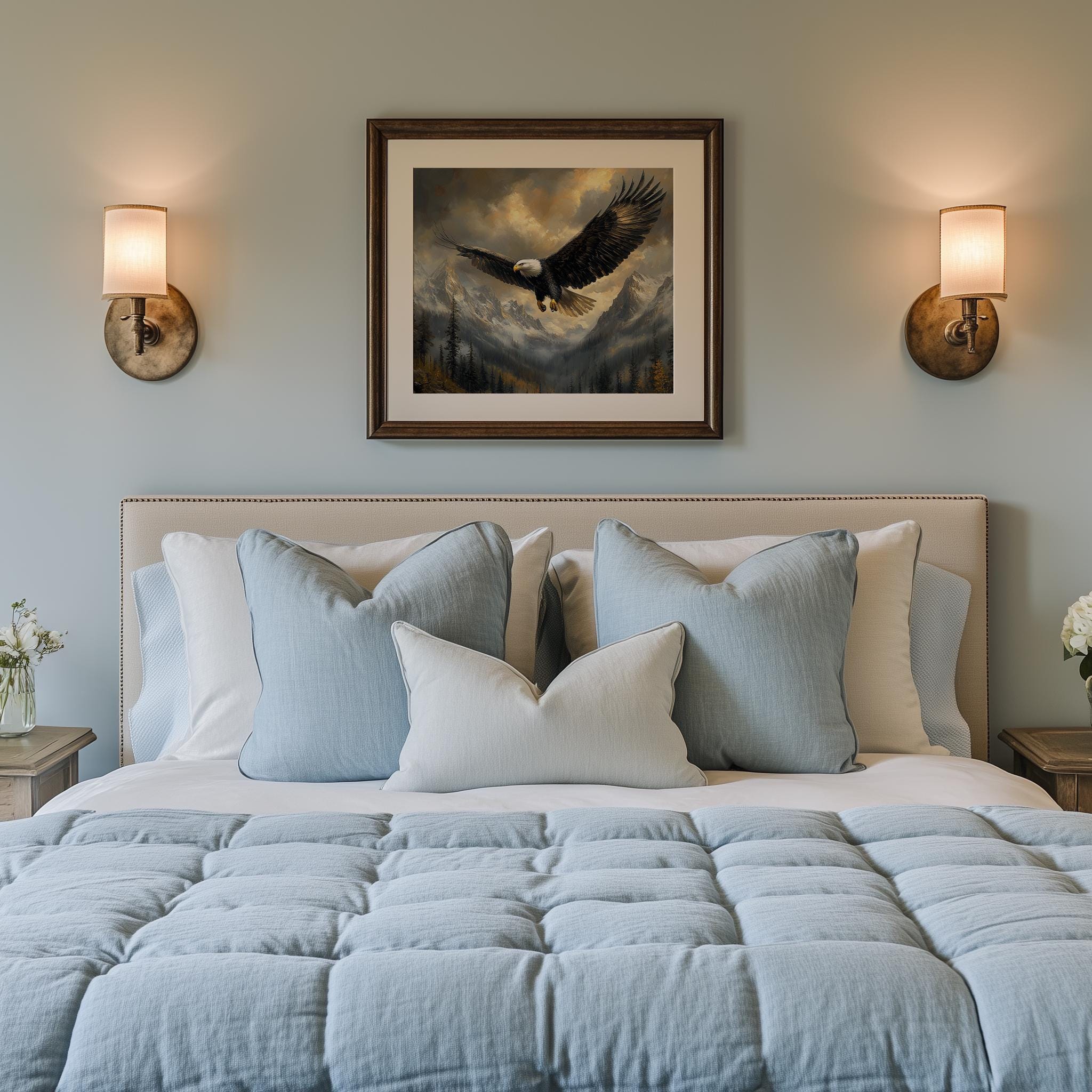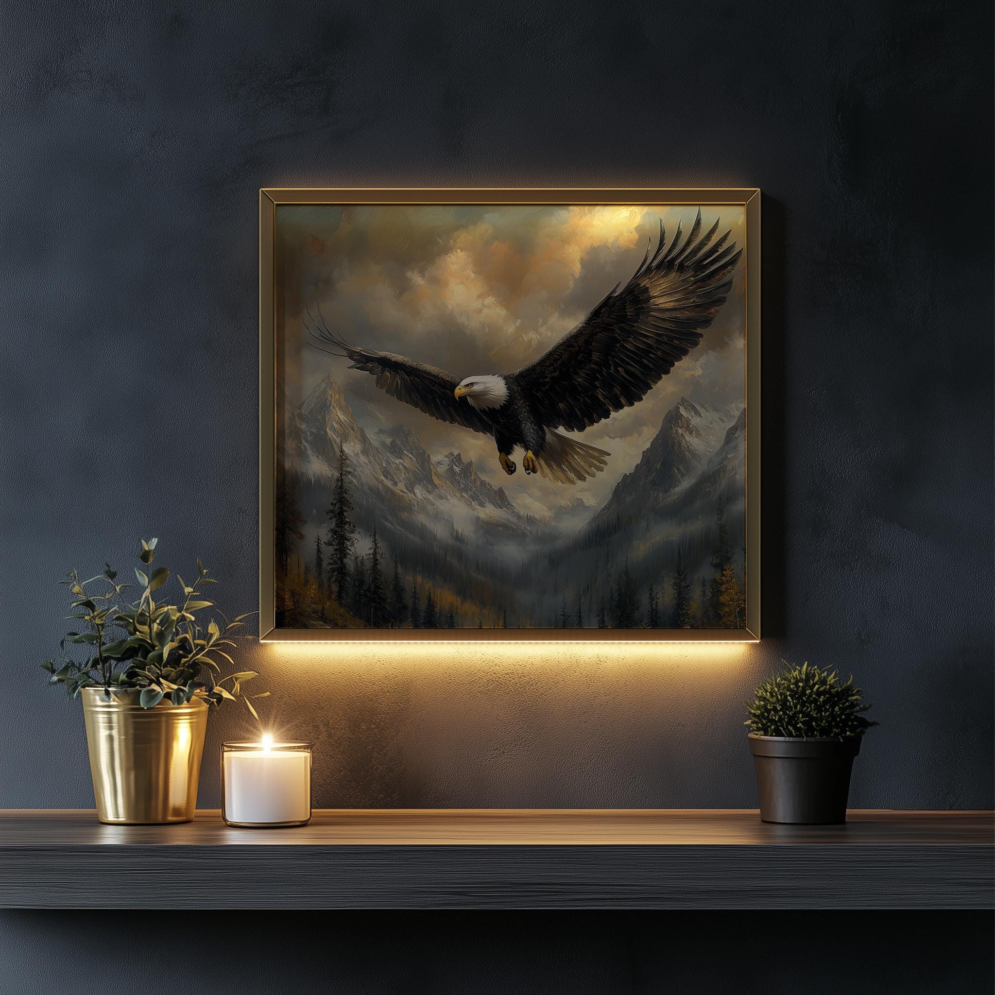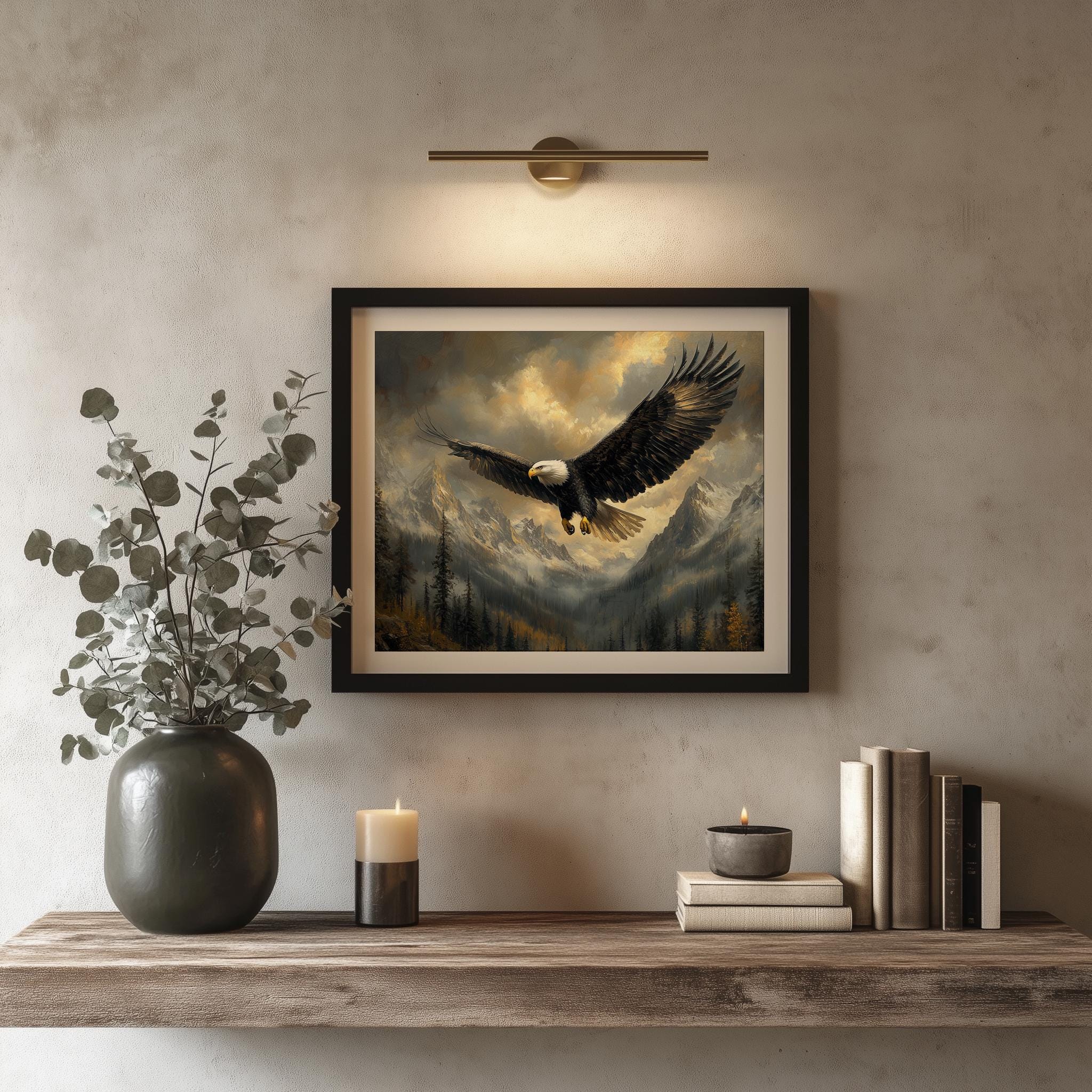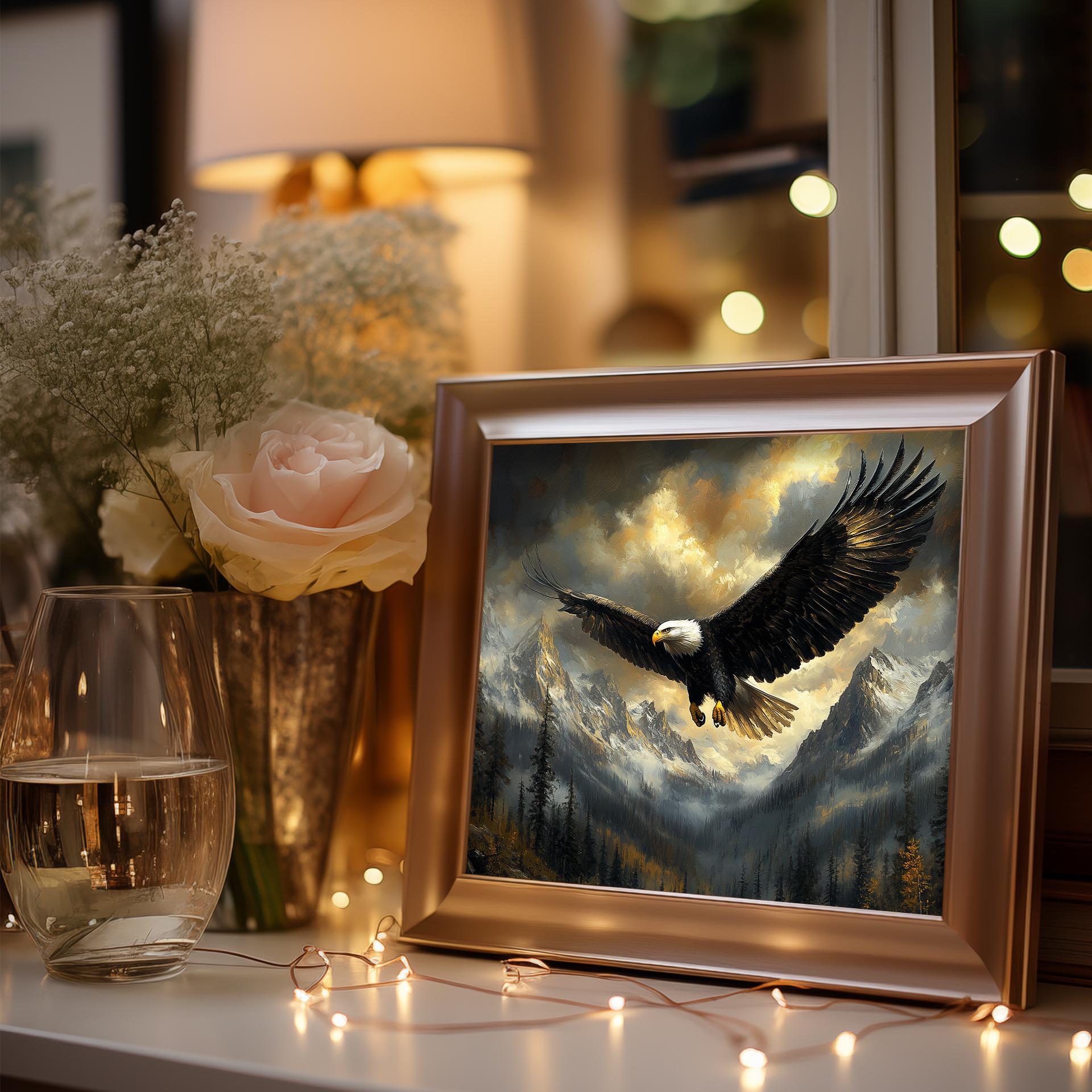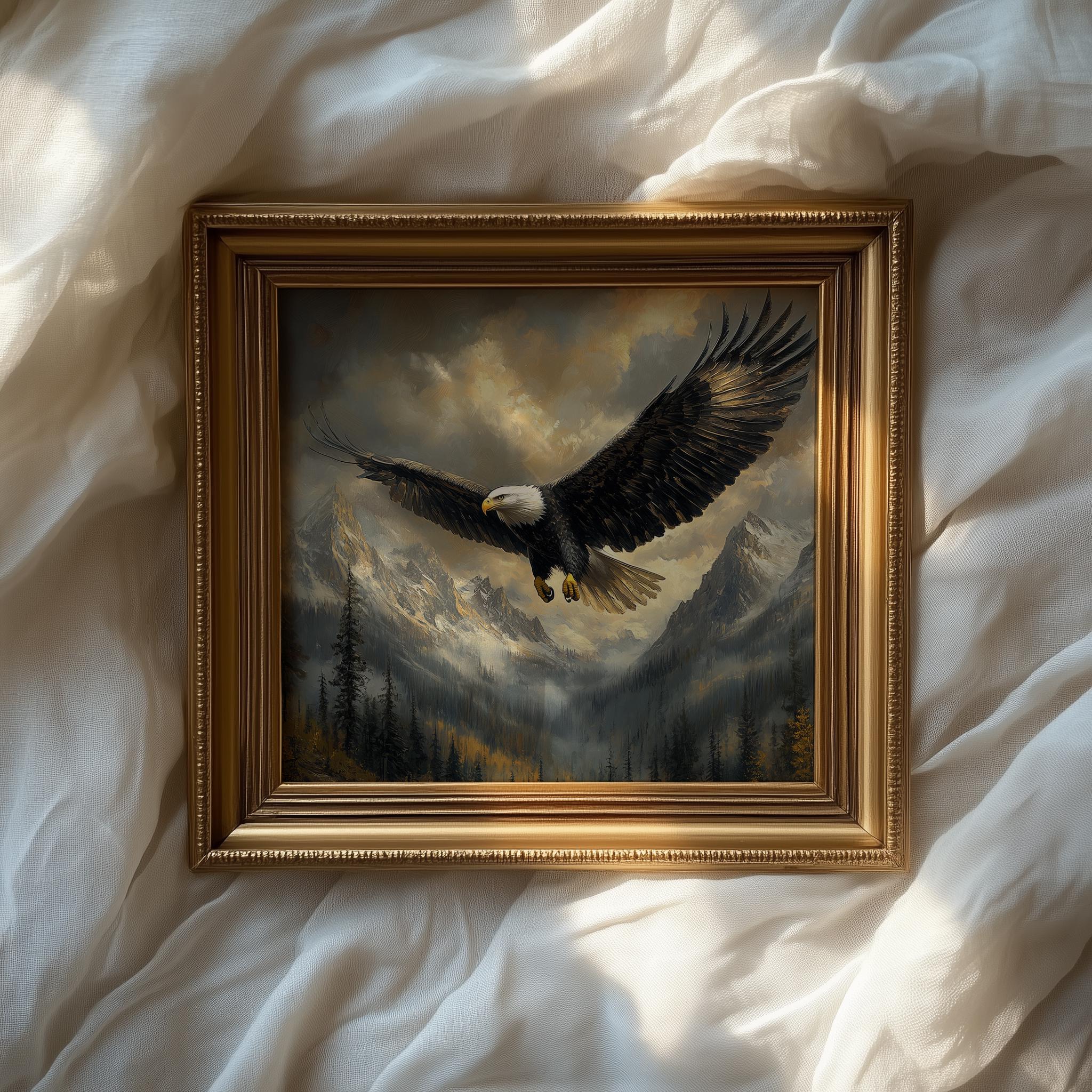 Immerse yourself in the charm with this rustic painting of a majestic bald eagle soaring through a stormy mountain landscape. An instantly downloadable print, it's perfect for elevating your decor with budget-friendly charm. This gives you the flexibility to customize the size, frame, and material according to your personal taste and space, ensuring a perfect fit for your walls.