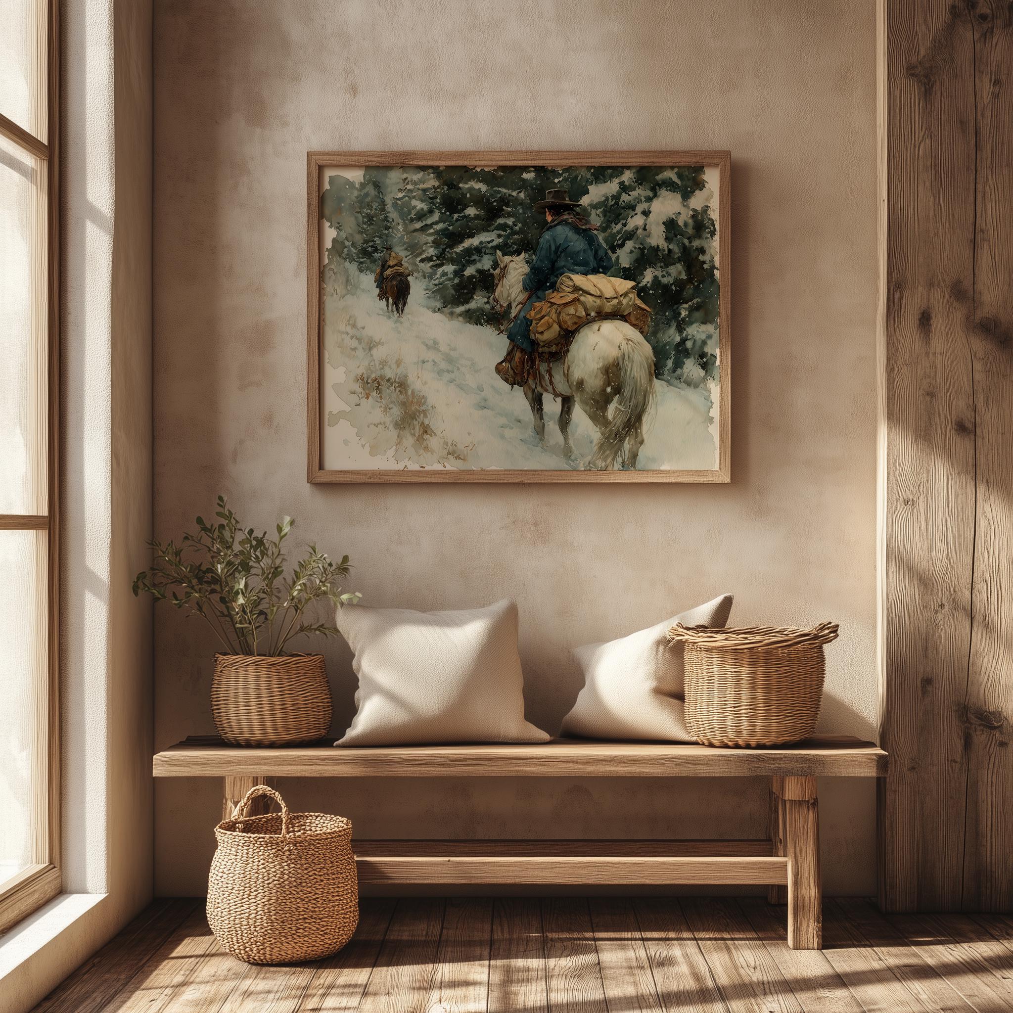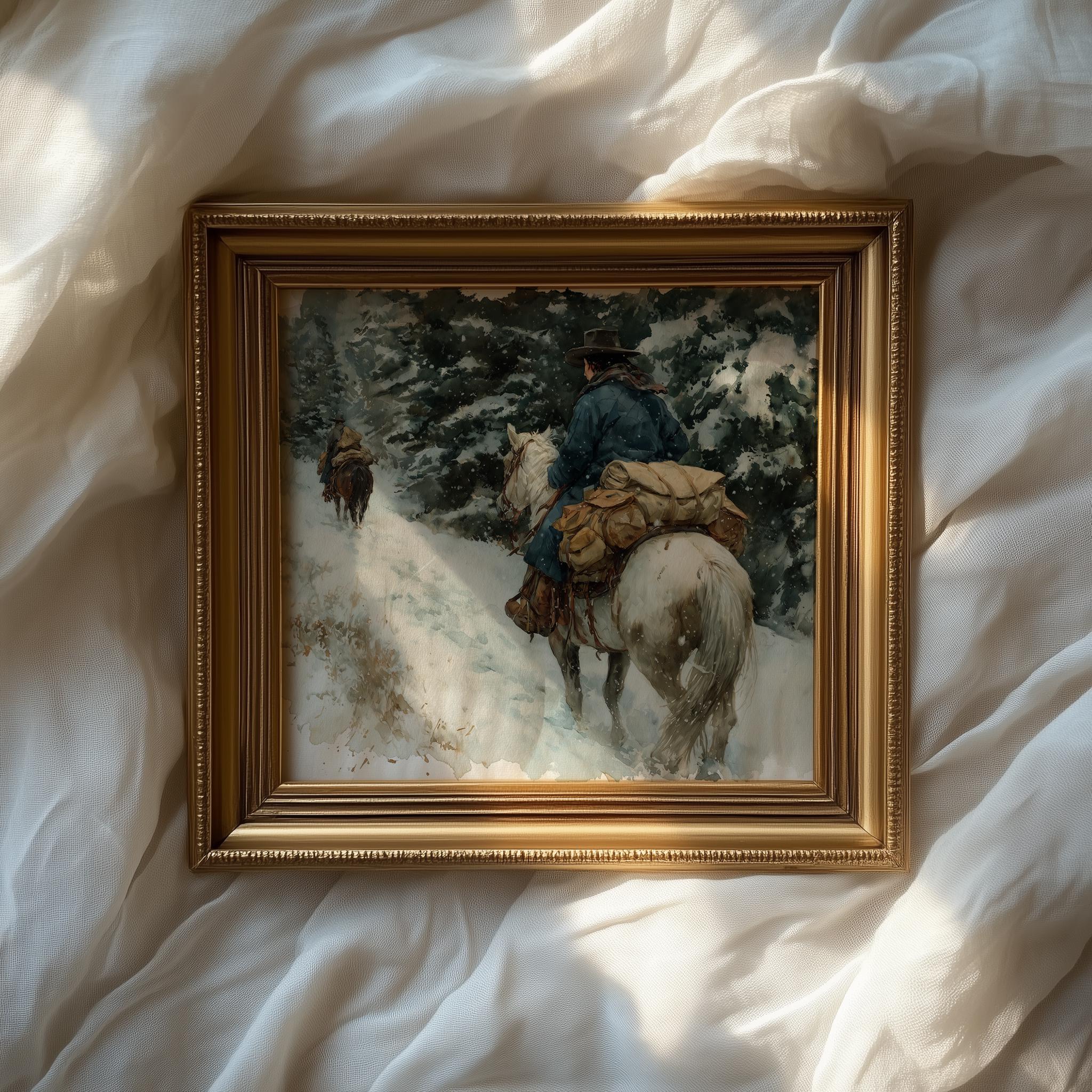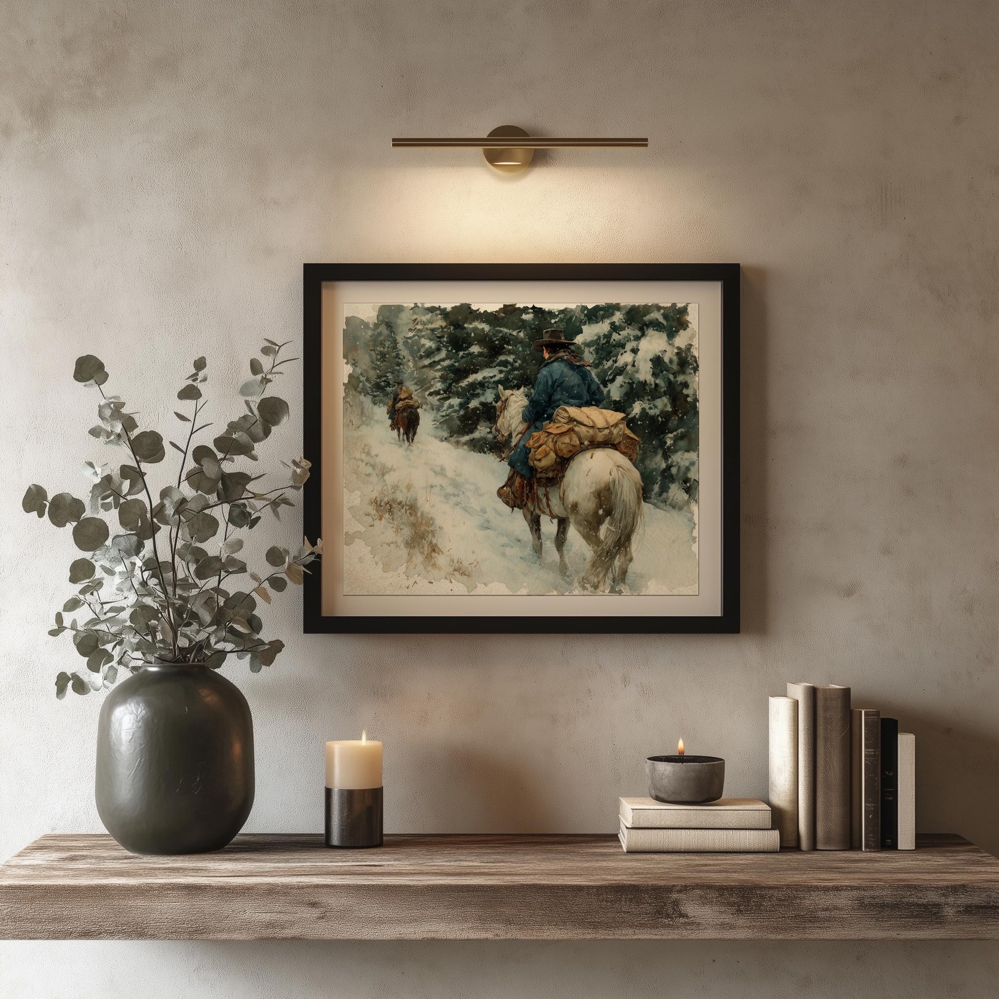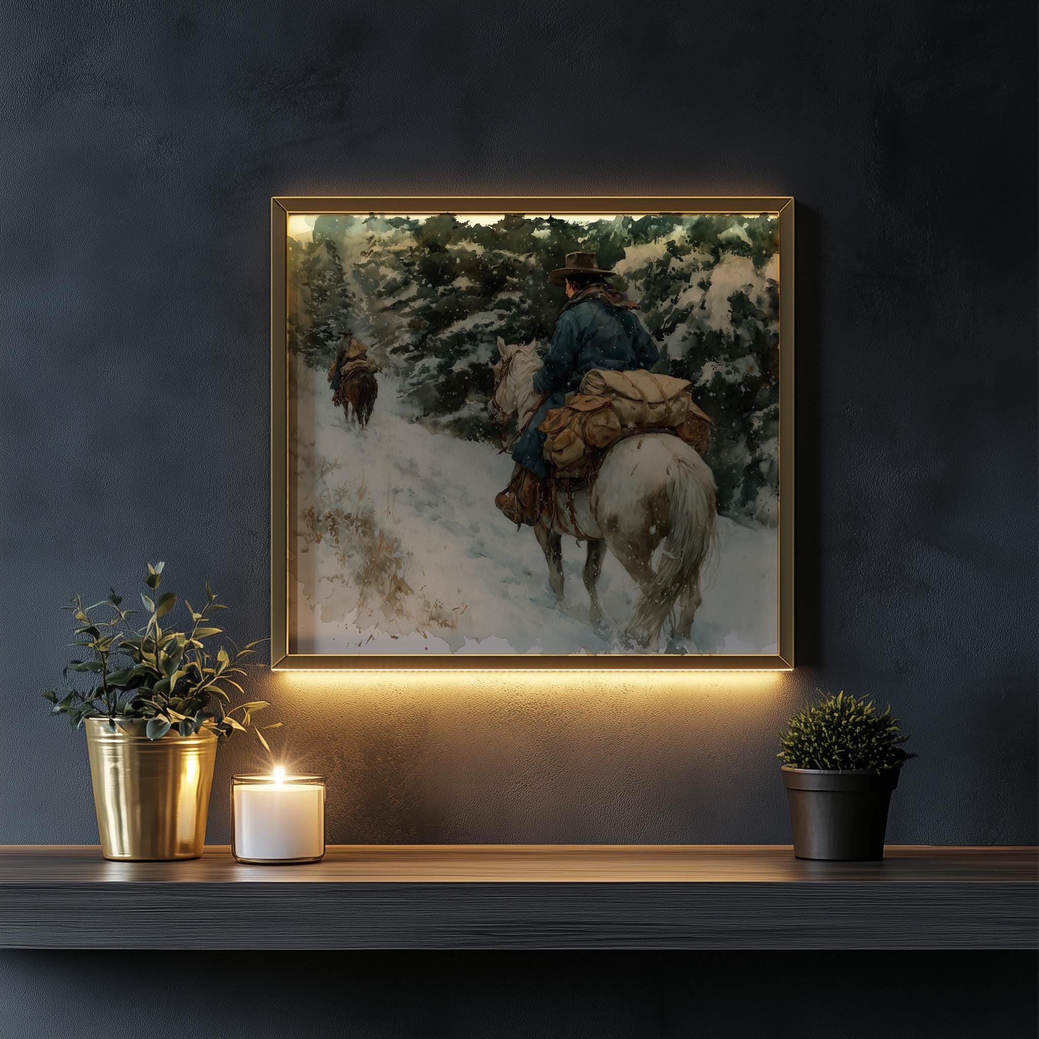 Immerse yourself in the charm with this rustic painting of a cowgirl riding a packhorse through a snowy mountain trail. An instantly downloadable print, it's perfect for elevating your decor with budget-friendly charm. This gives you the flexibility to customize the size, frame, and material according to your personal taste and space, ensuring a perfect fit for your walls.