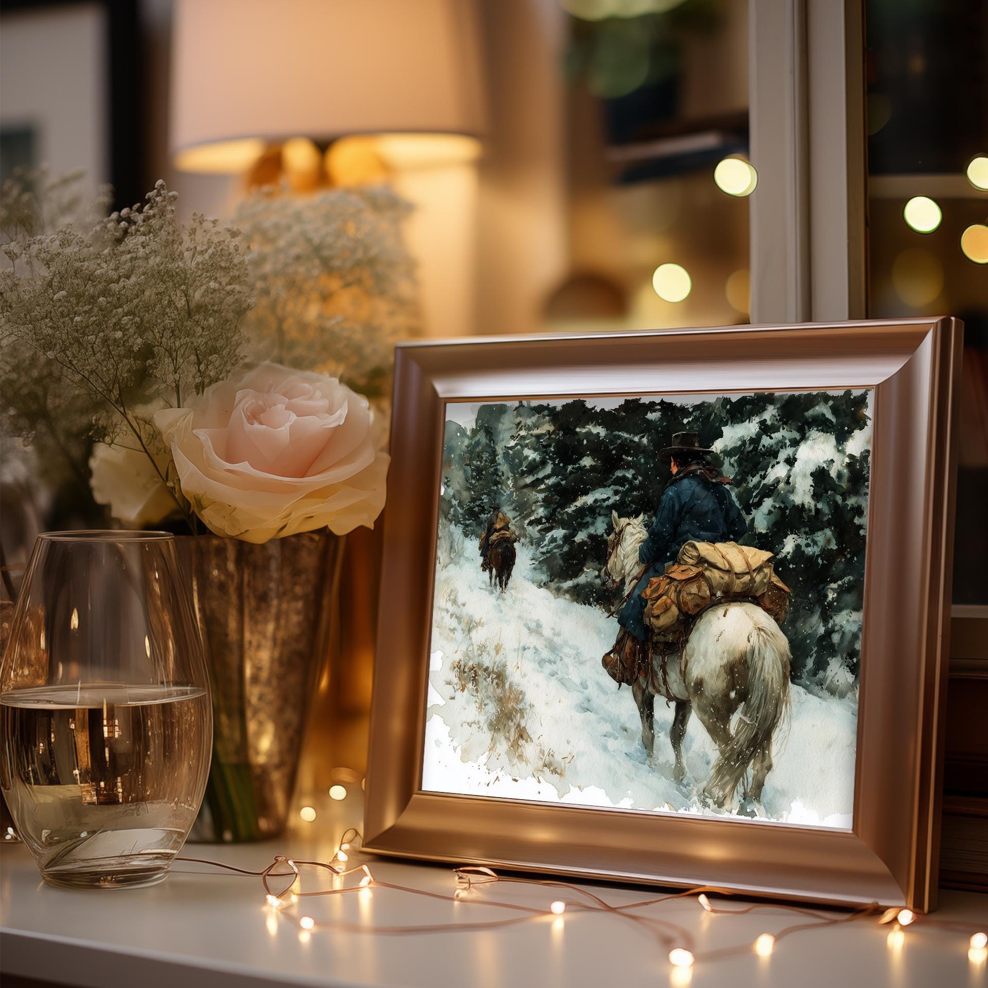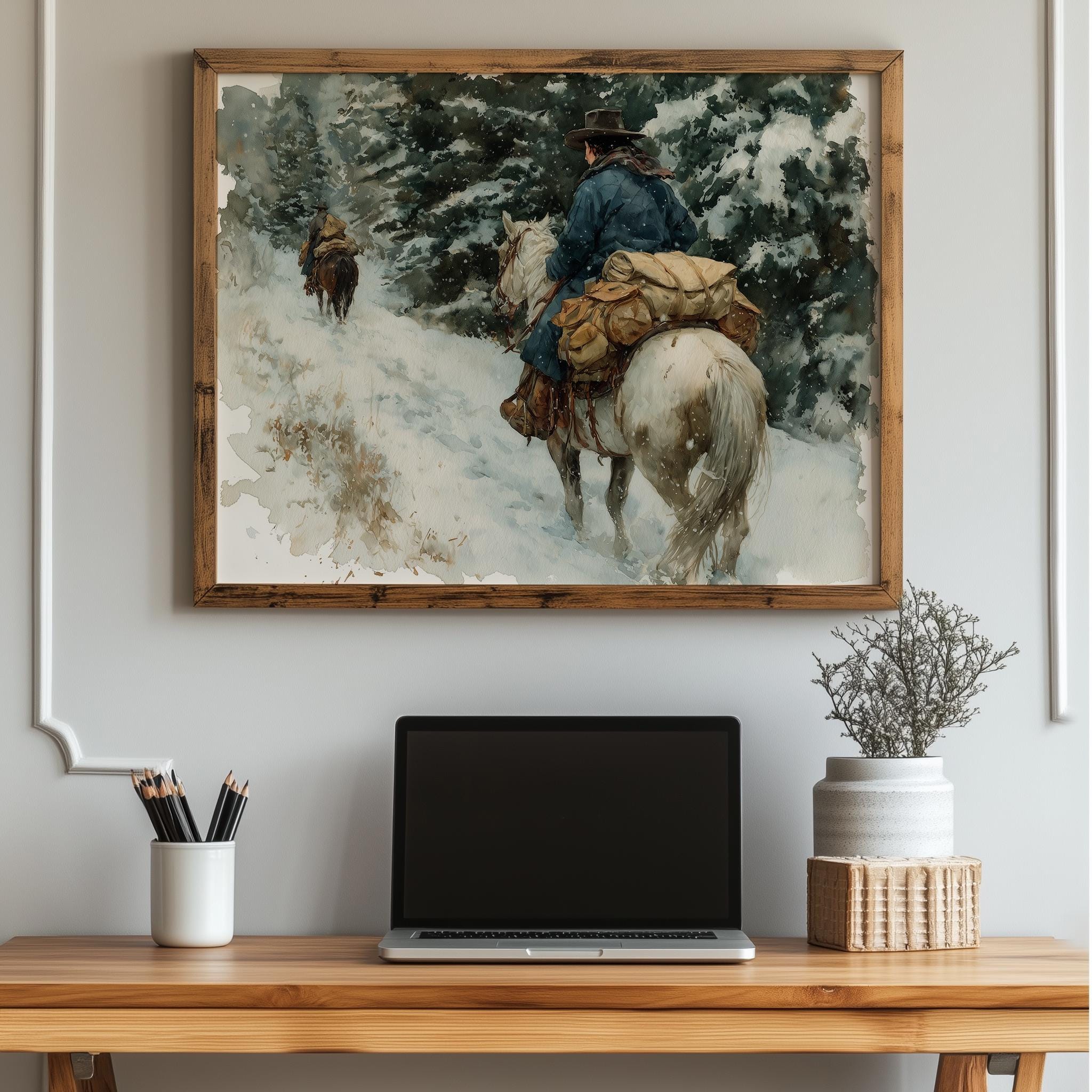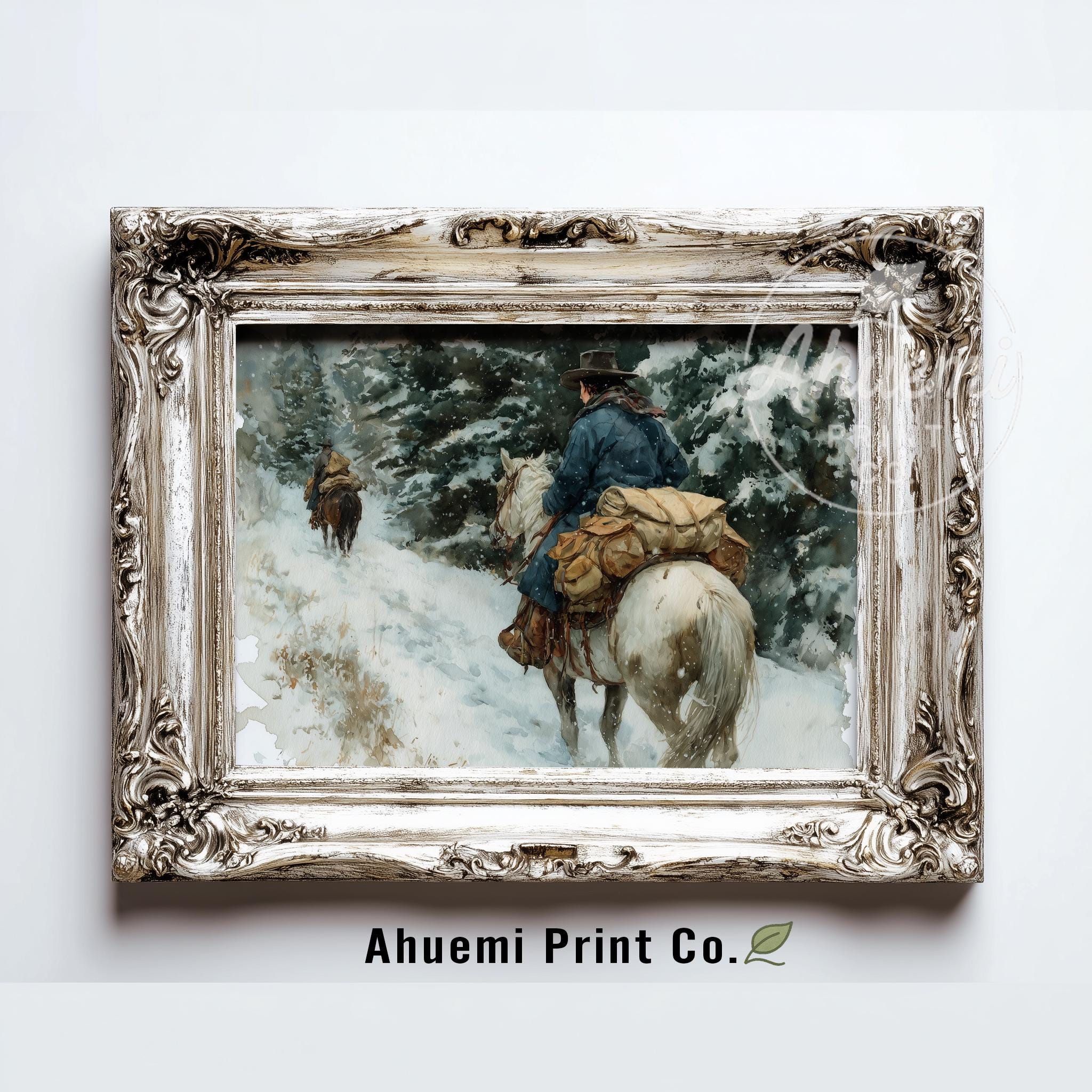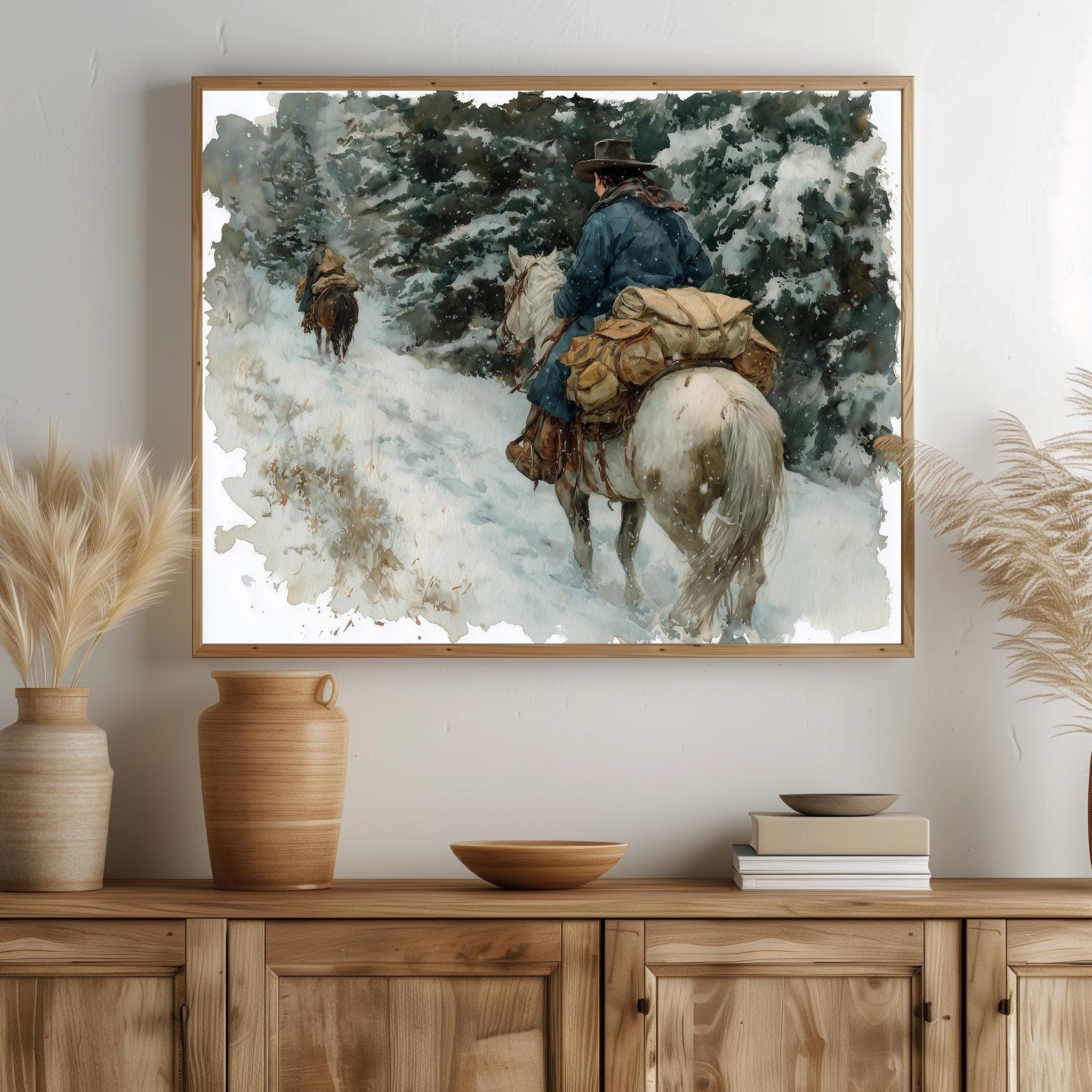 Immerse yourself in the charm with this rustic painting of a cowgirl riding a packhorse through a snowy mountain trail. An instantly downloadable print, it's perfect for elevating your decor with budget-friendly charm. This gives you the flexibility to customize the size, frame, and material according to your personal taste and space, ensuring a perfect fit for your walls.