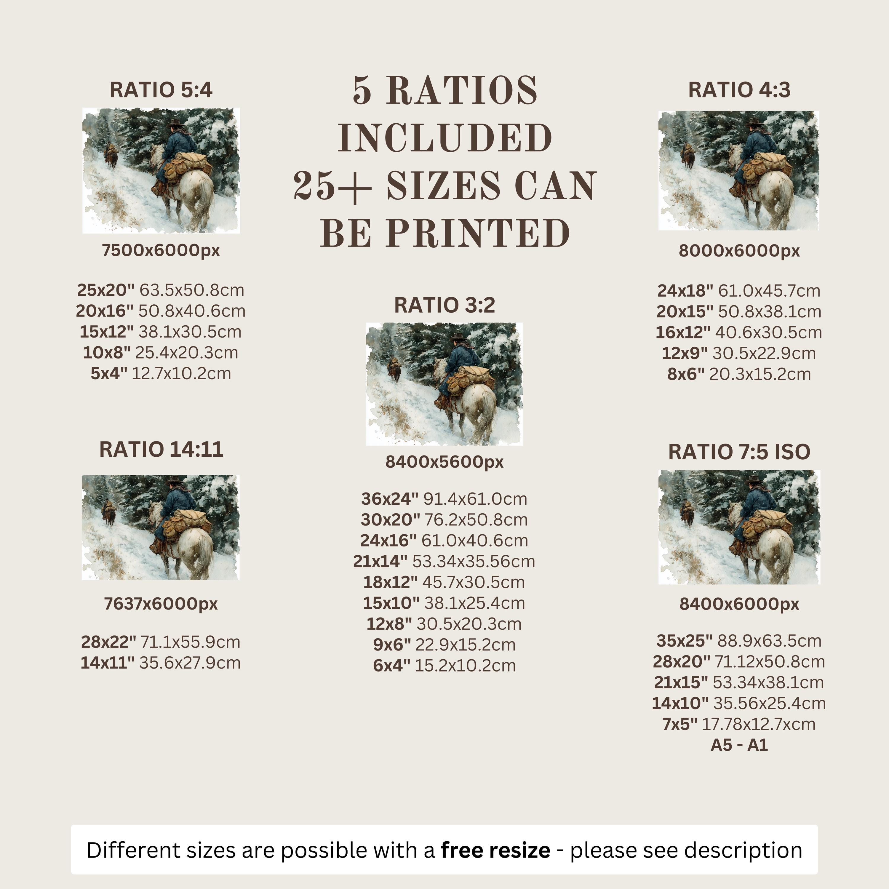 Each artwork includes 5 aspect ratios with 25+ print sizes. Most standard frames are covered. One custom resize per purchase available—message before ordering.