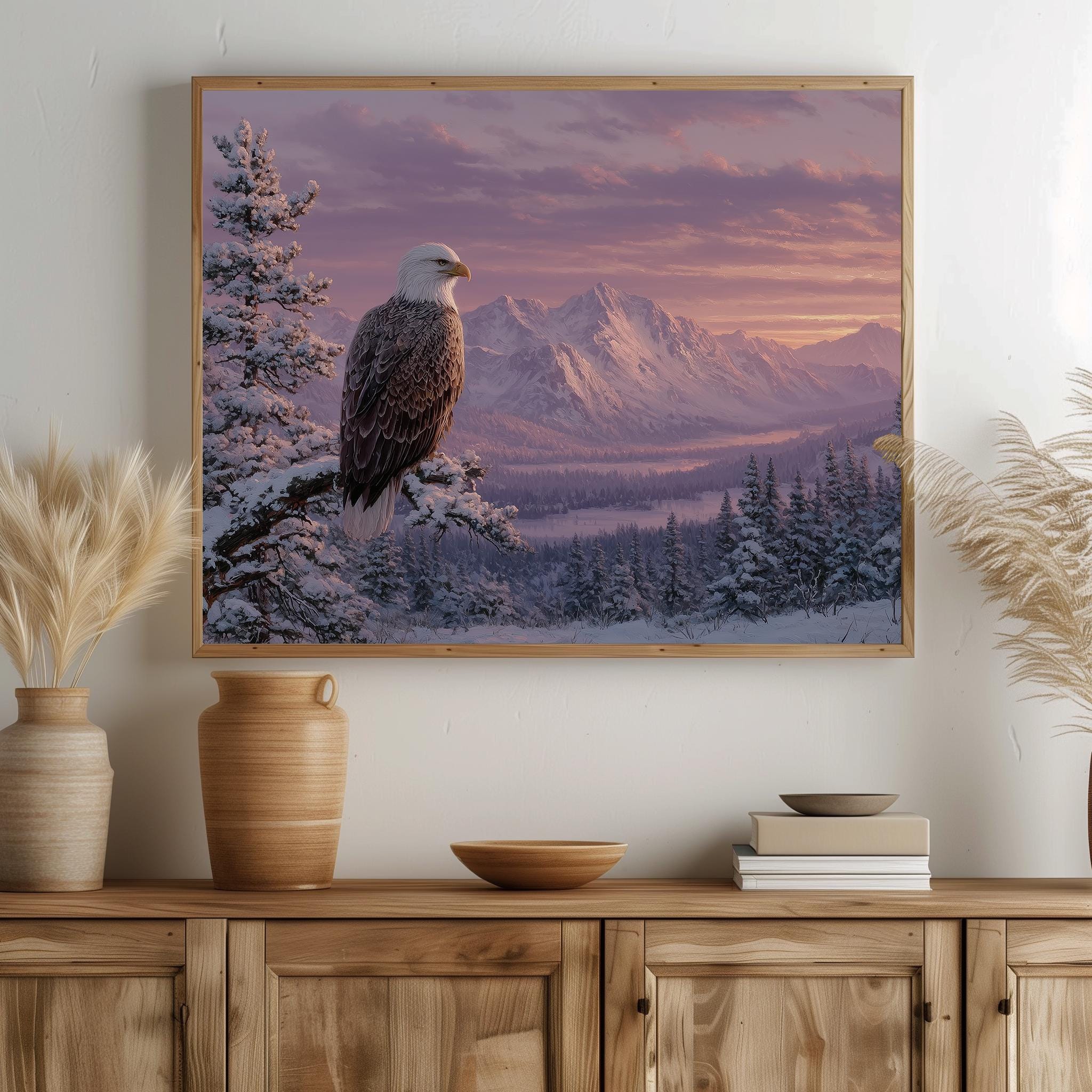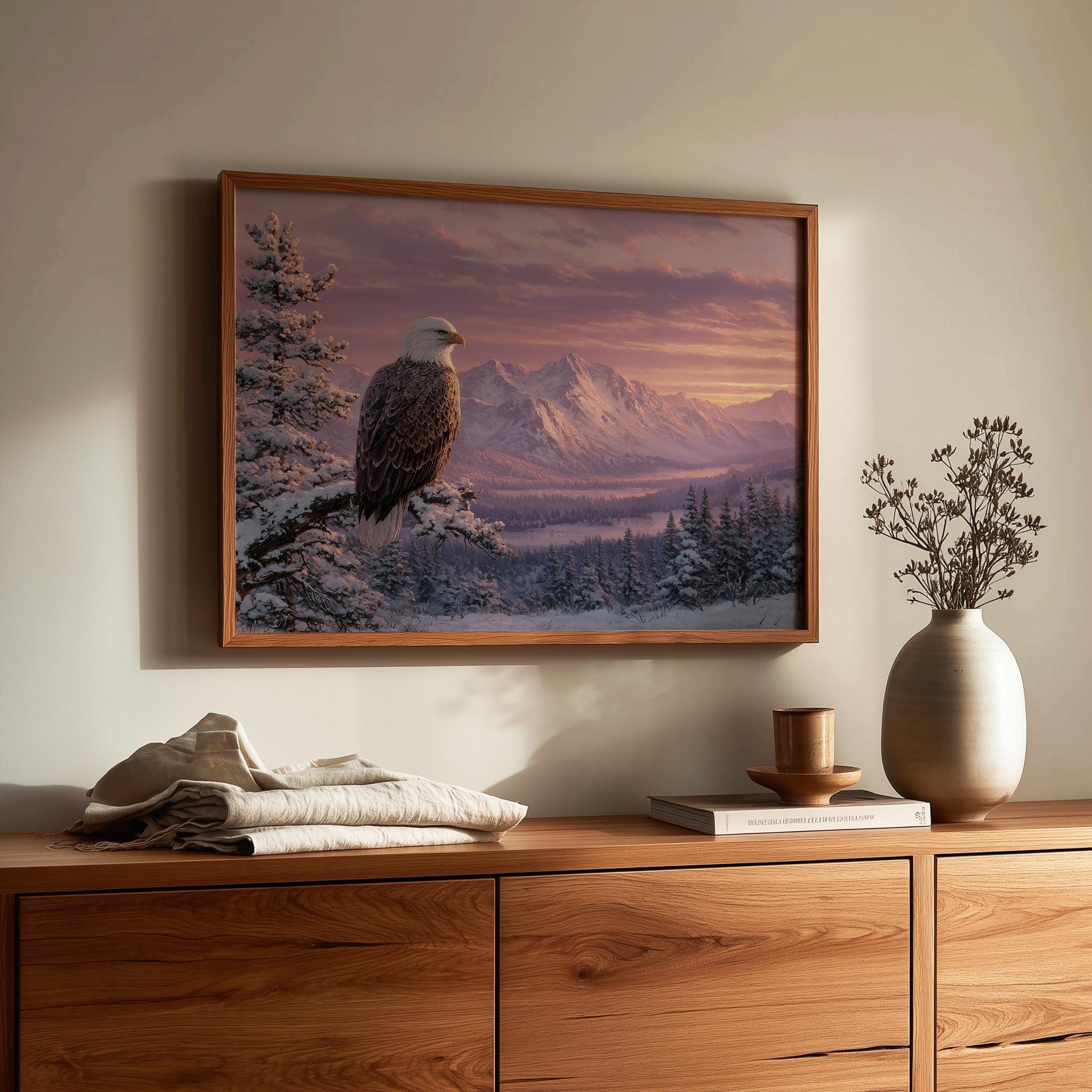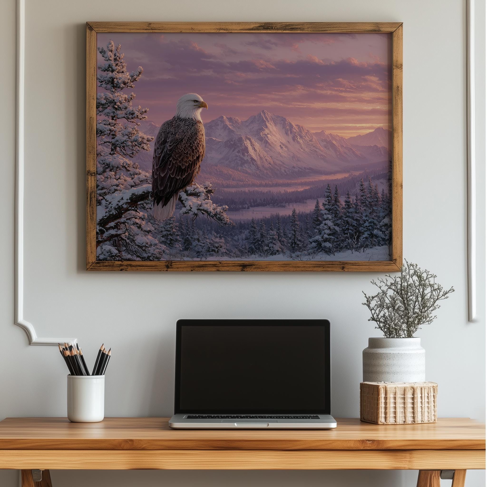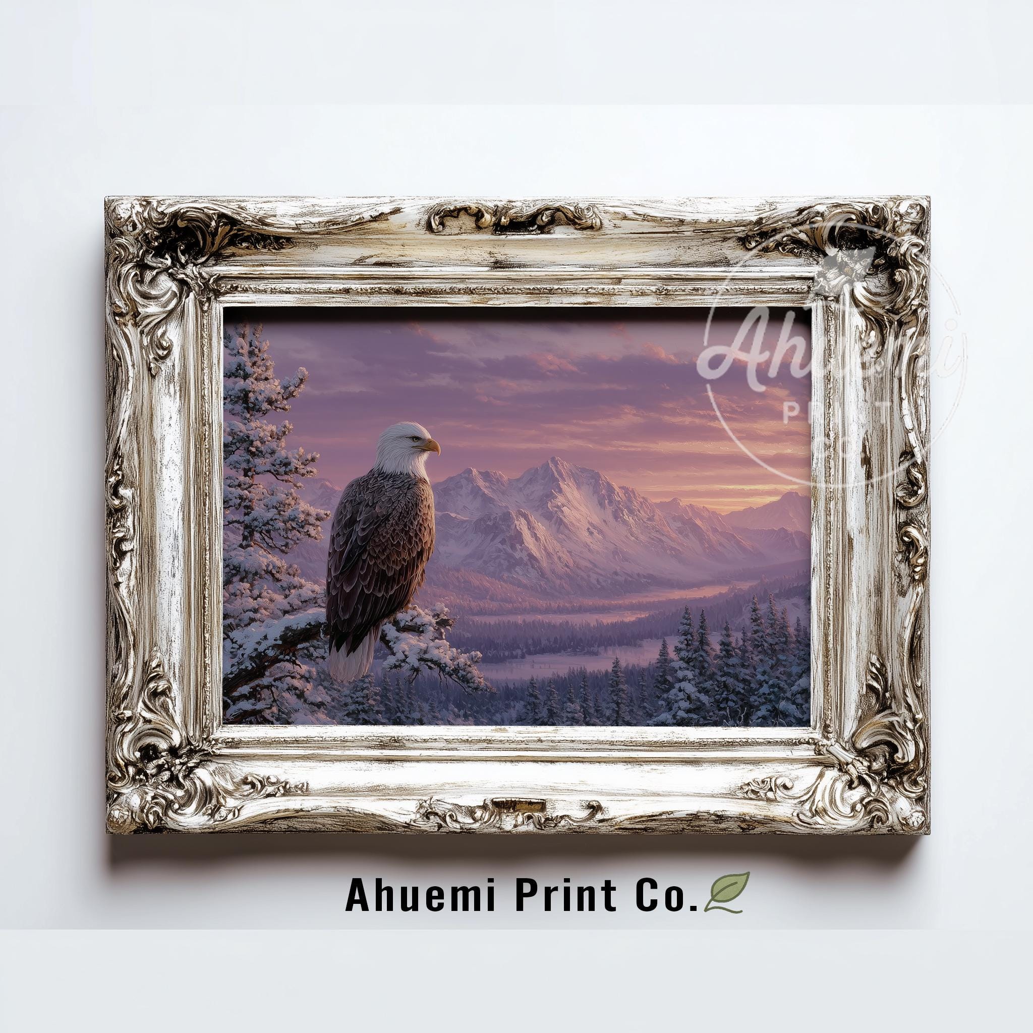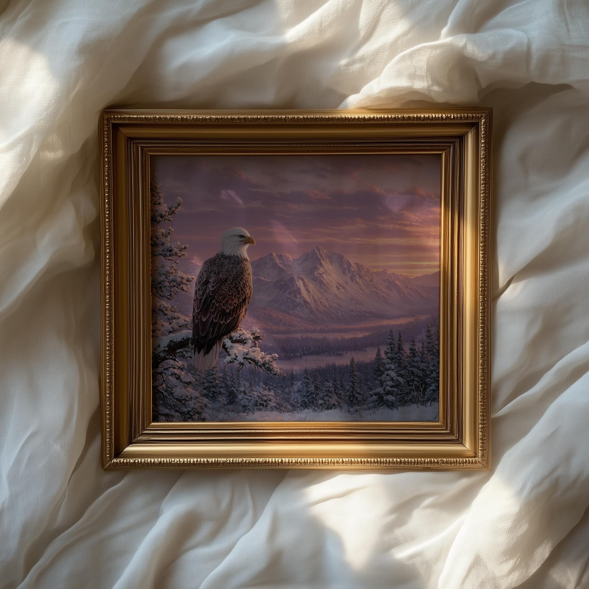 Immerse yourself in the charm with this rustic painting of a majestic winter eagle soaring over snow-dusted mountains. An instantly downloadable print, it's perfect for elevating your decor with budget-friendly charm. This gives you the flexibility to customize the size, frame, and material according to your personal taste and space, ensuring a perfect fit for your walls.