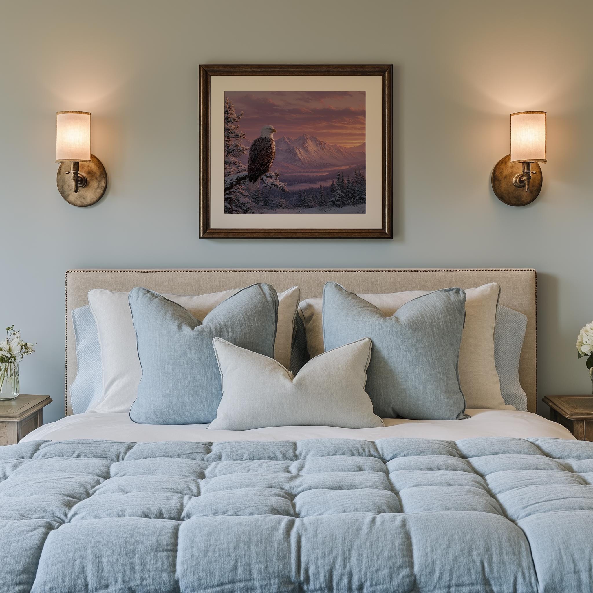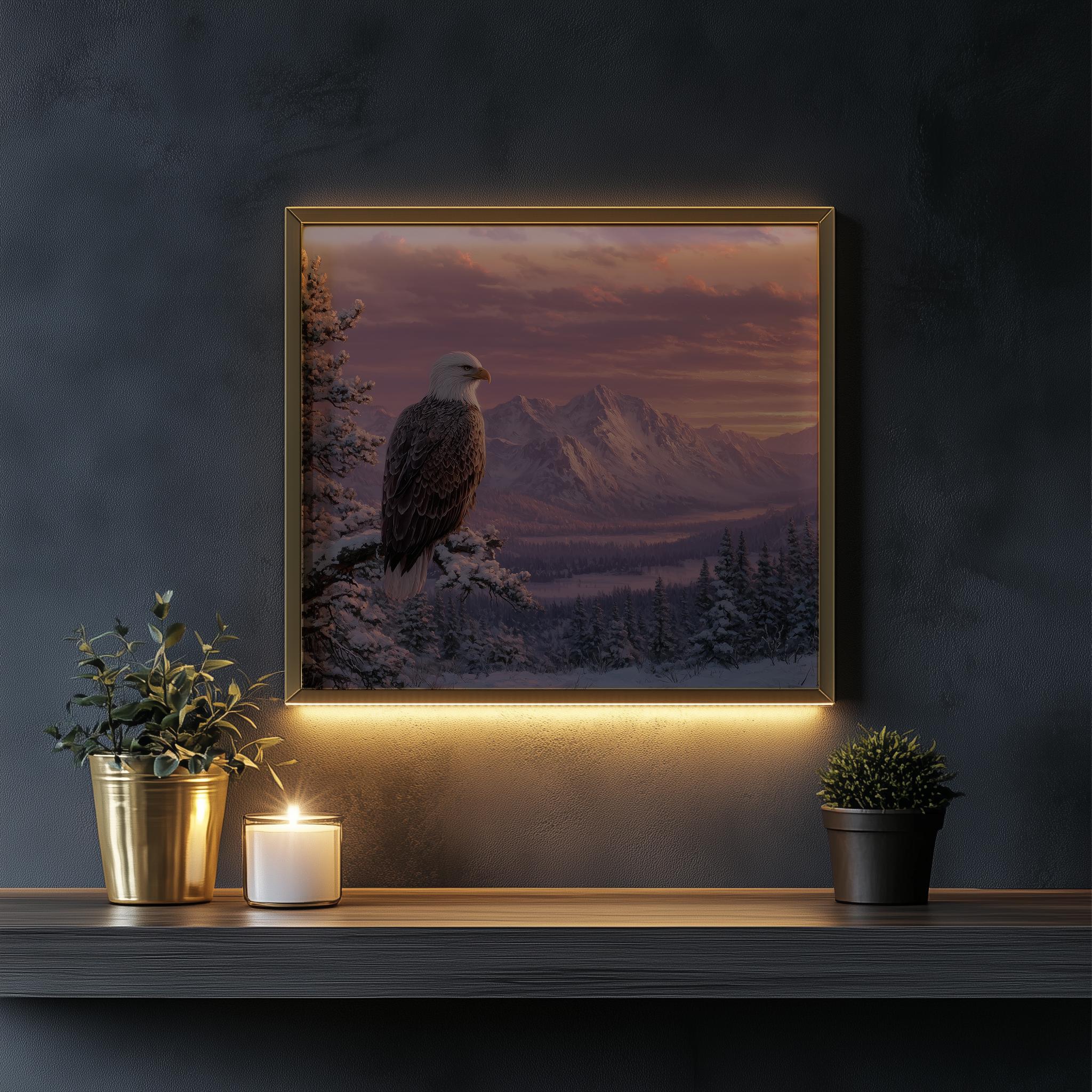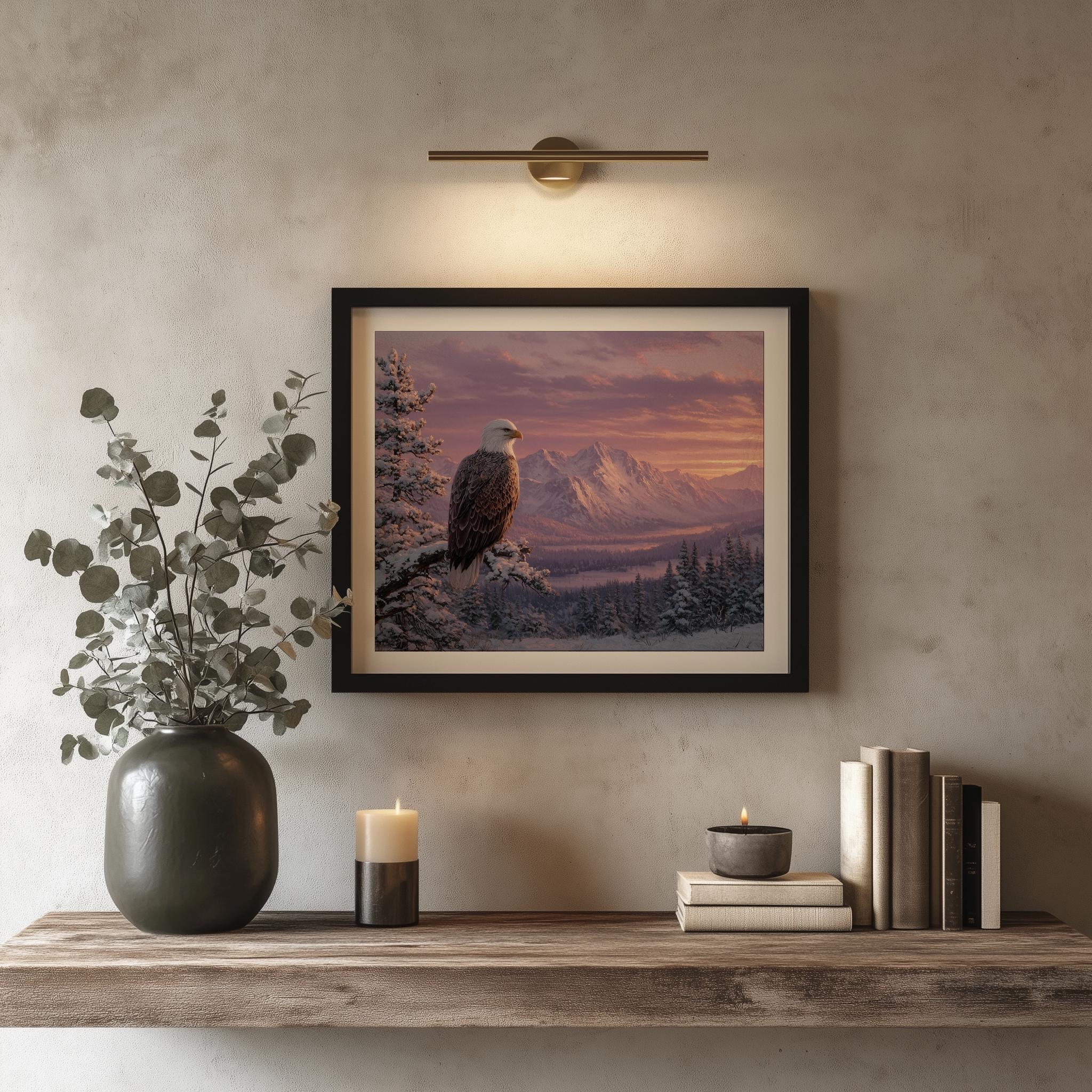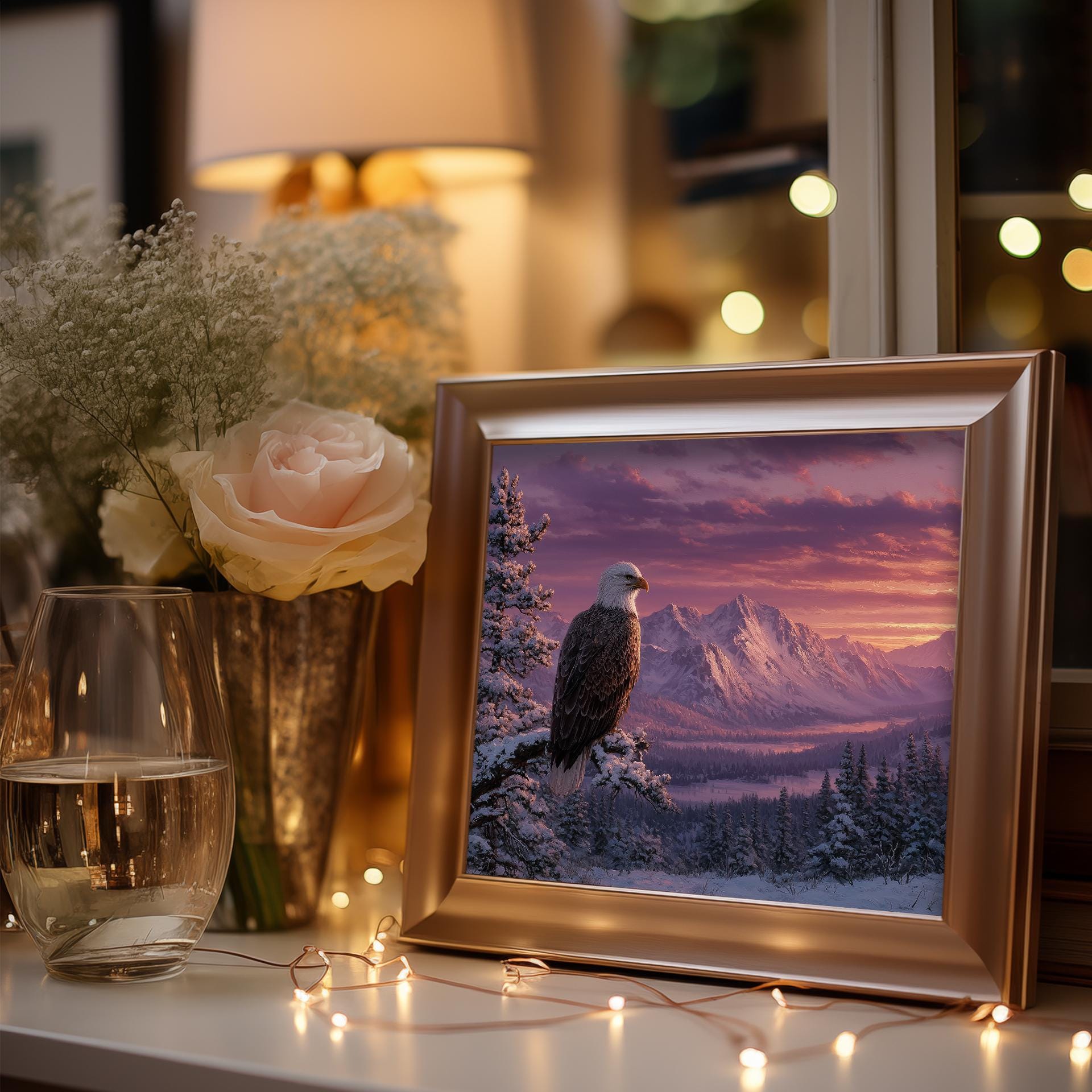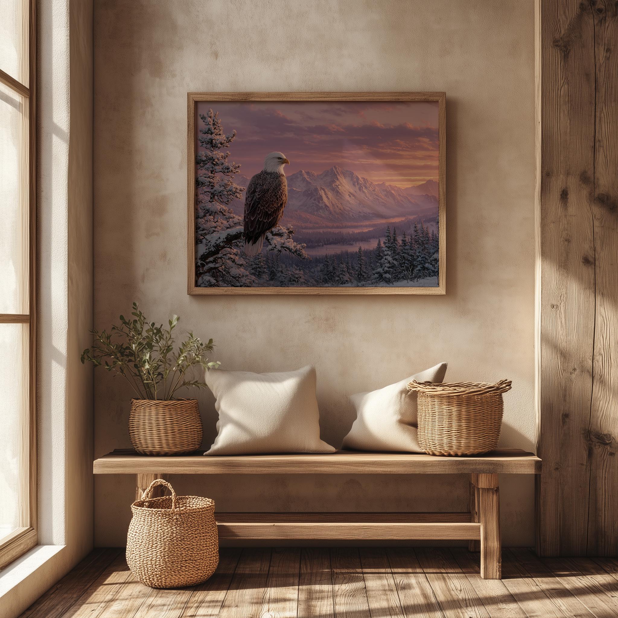 Immerse yourself in the charm with this rustic painting of a majestic winter eagle soaring over snow-dusted mountains. An instantly downloadable print, it's perfect for elevating your decor with budget-friendly charm. This gives you the flexibility to customize the size, frame, and material according to your personal taste and space, ensuring a perfect fit for your walls.