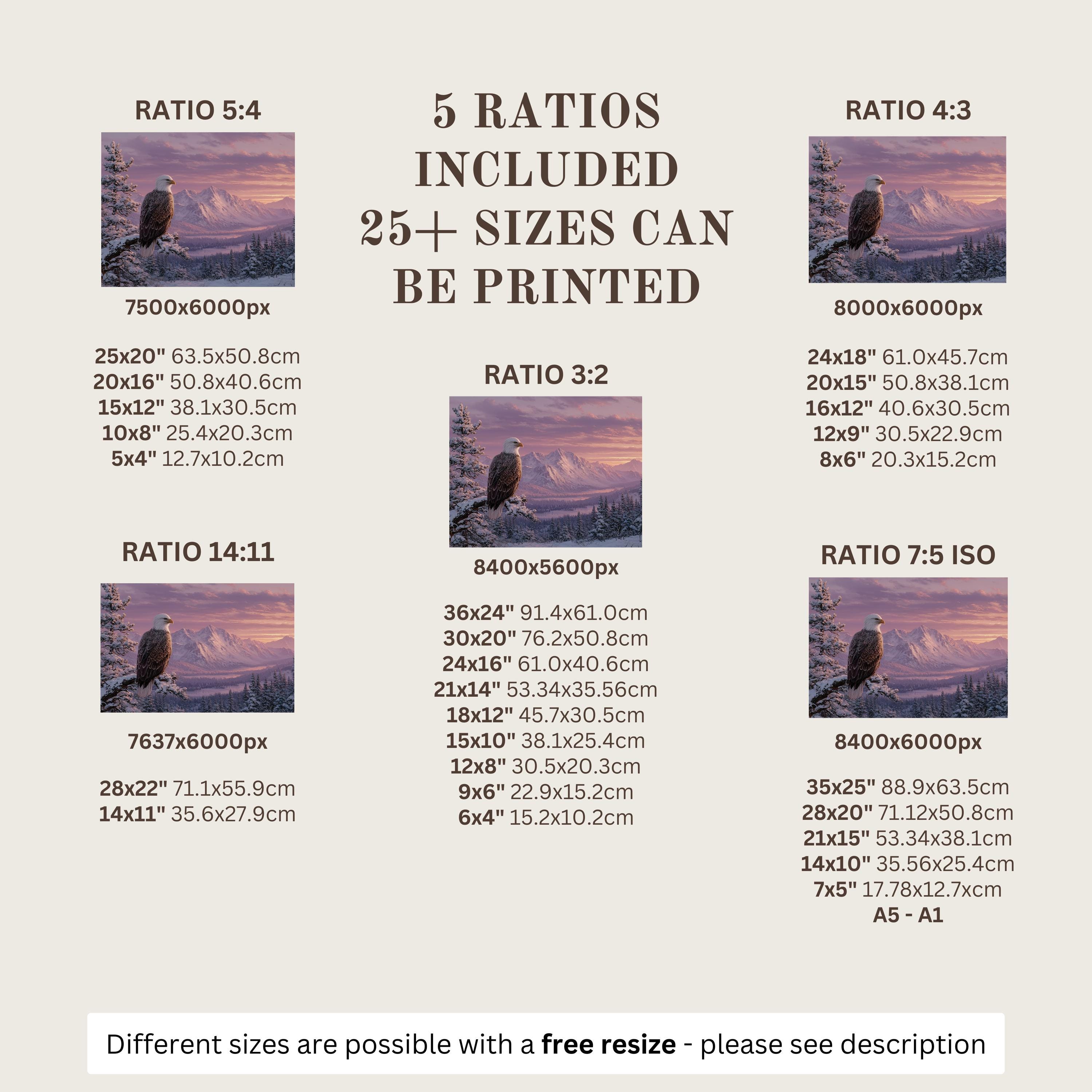 Each artwork includes 5 aspect ratios with 25+ print sizes. Most standard frames are covered. One custom resize per purchase available—message before ordering.