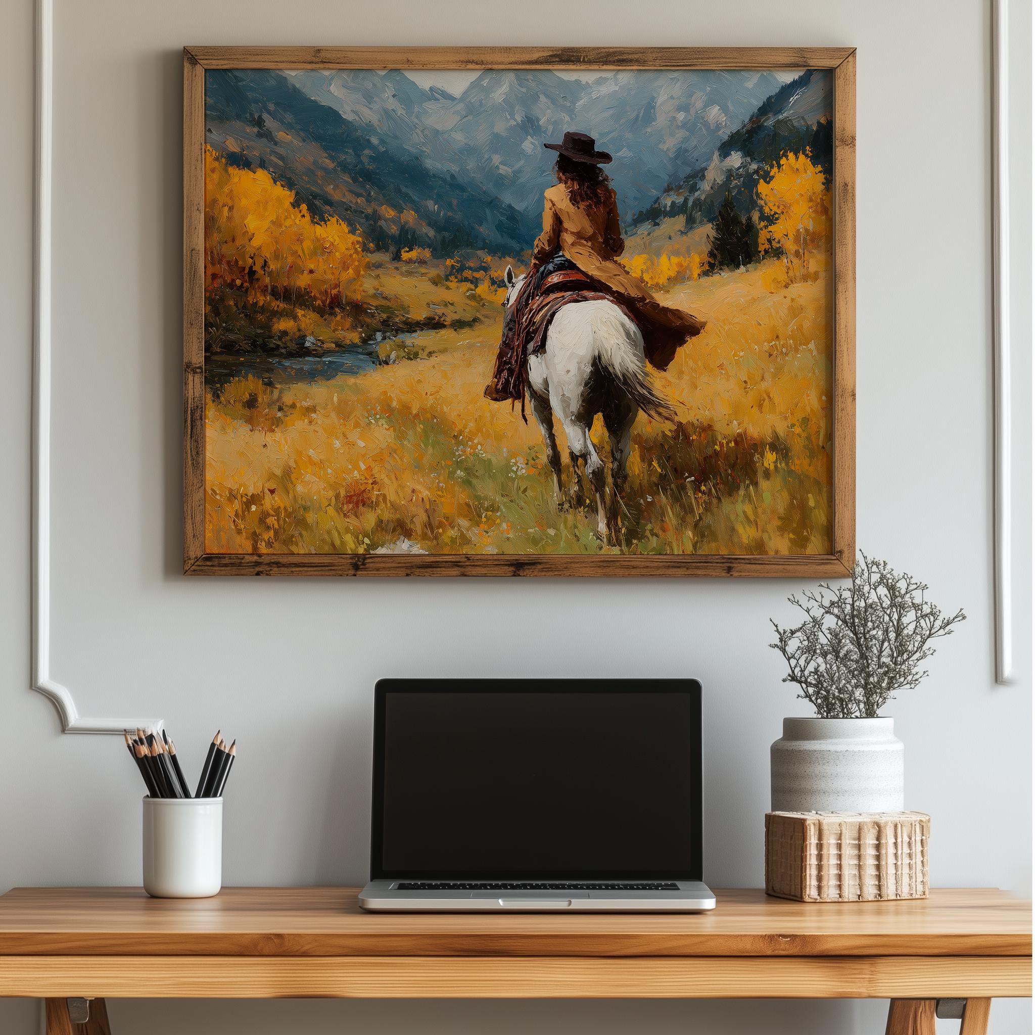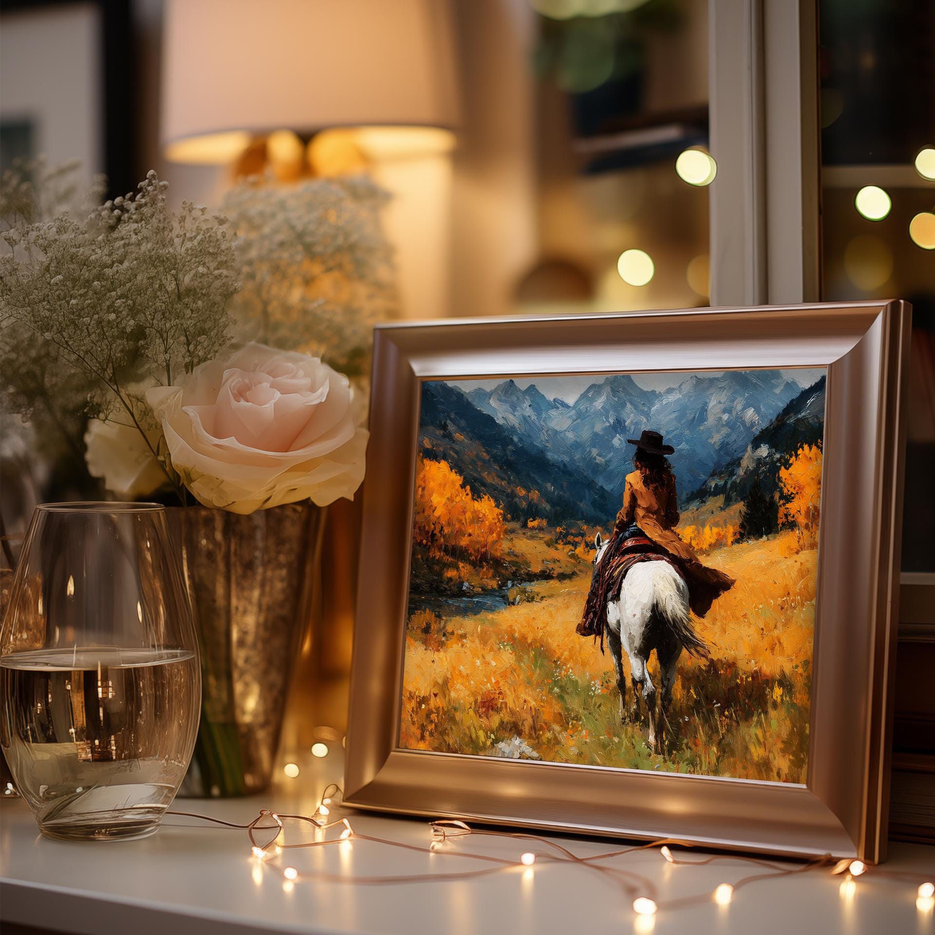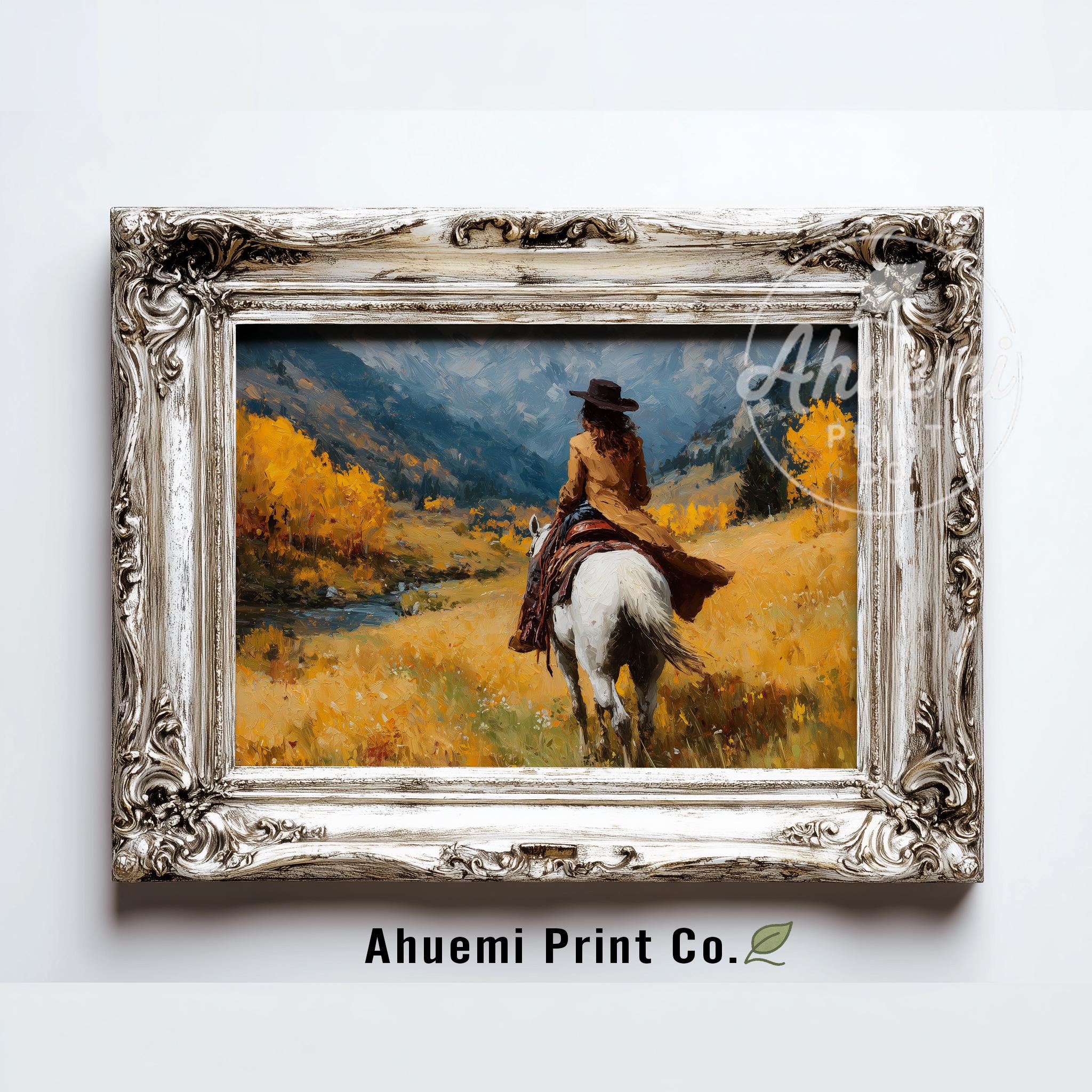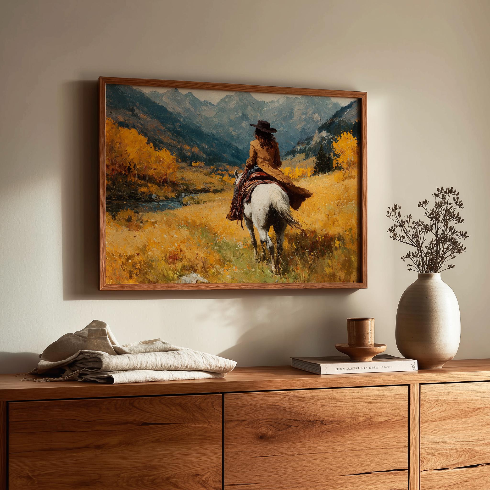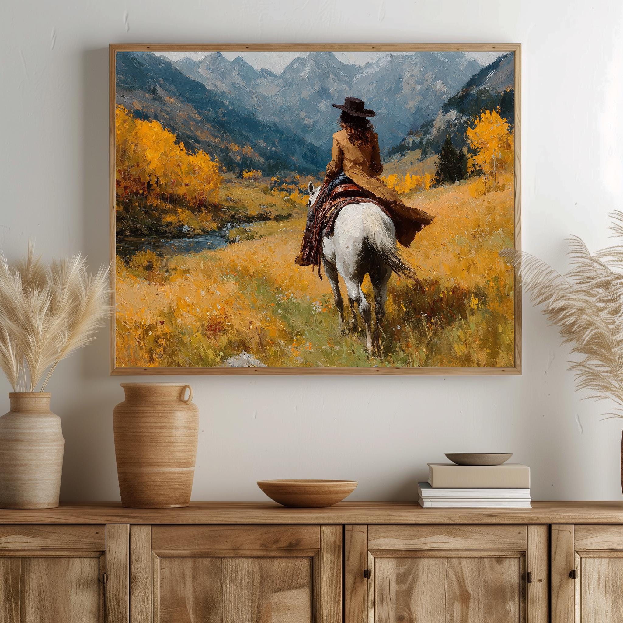 Immerse yourself in the charm with this rustic painting of a serene autumn mountain pass, where a cowgirl rides gracefully through a vibrant landscape. An instantly downloadable print, it's perfect for elevating your decor with budget-friendly charm. This gives you the flexibility to customize the size, frame, and material according to your personal taste and space, ensuring a perfect fit for your walls.