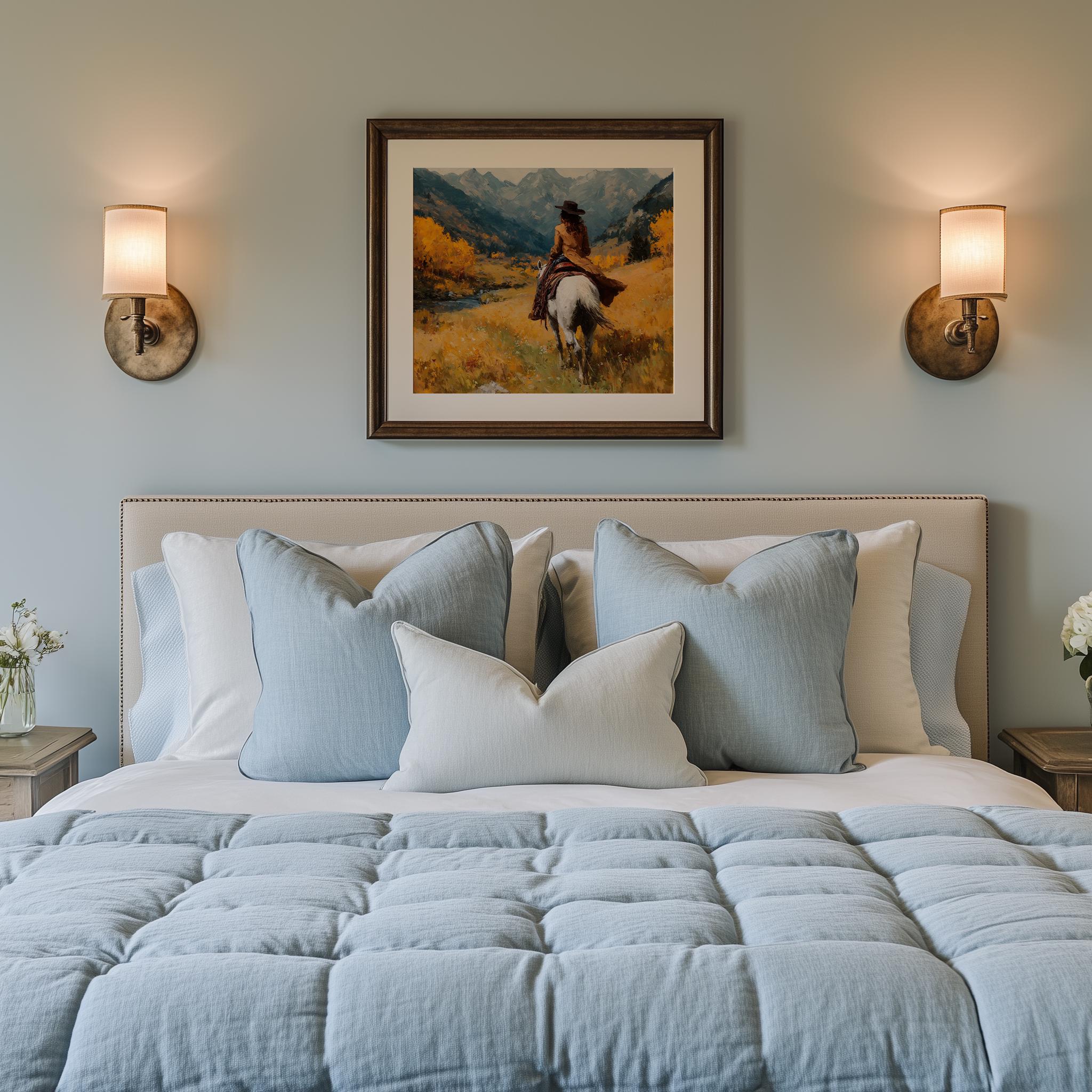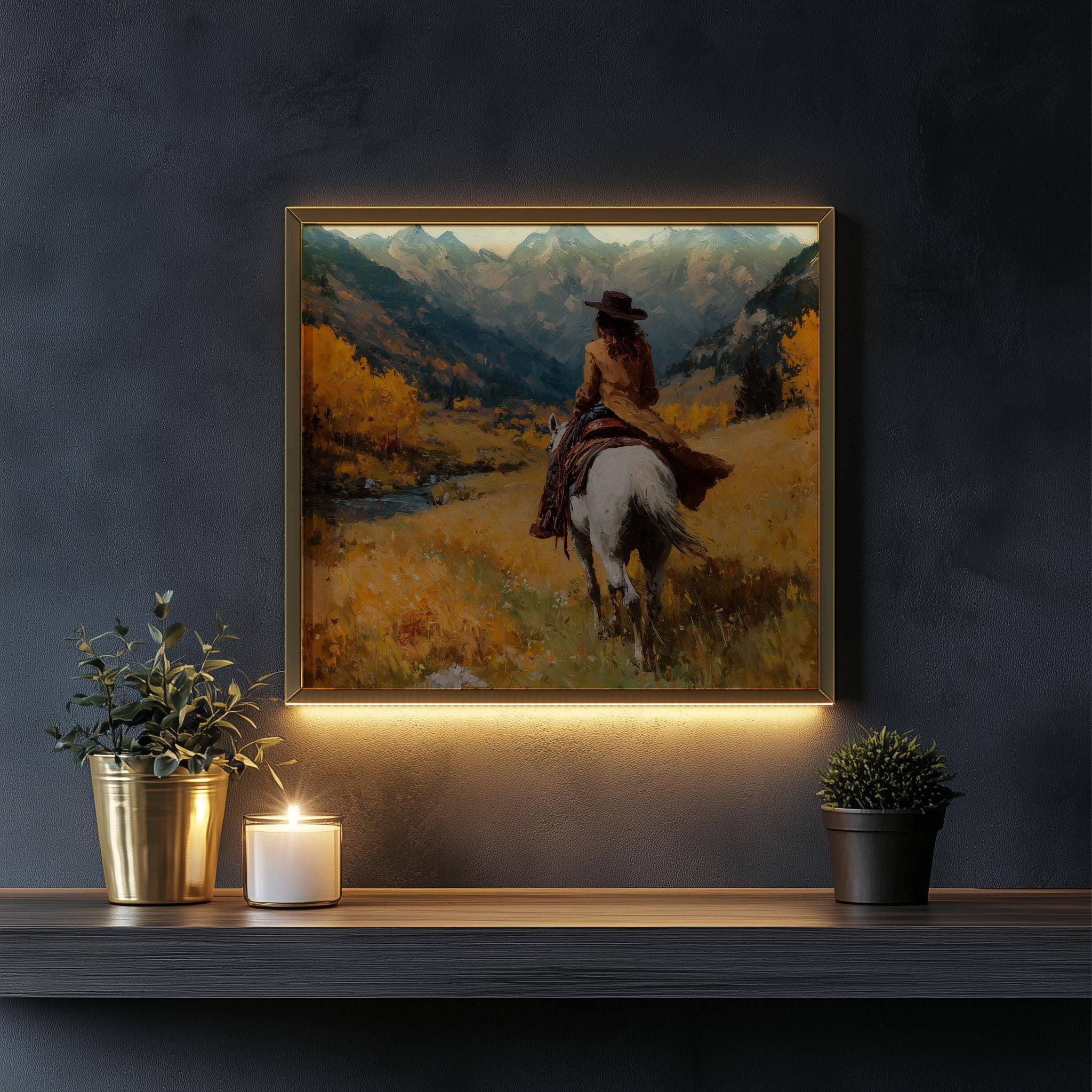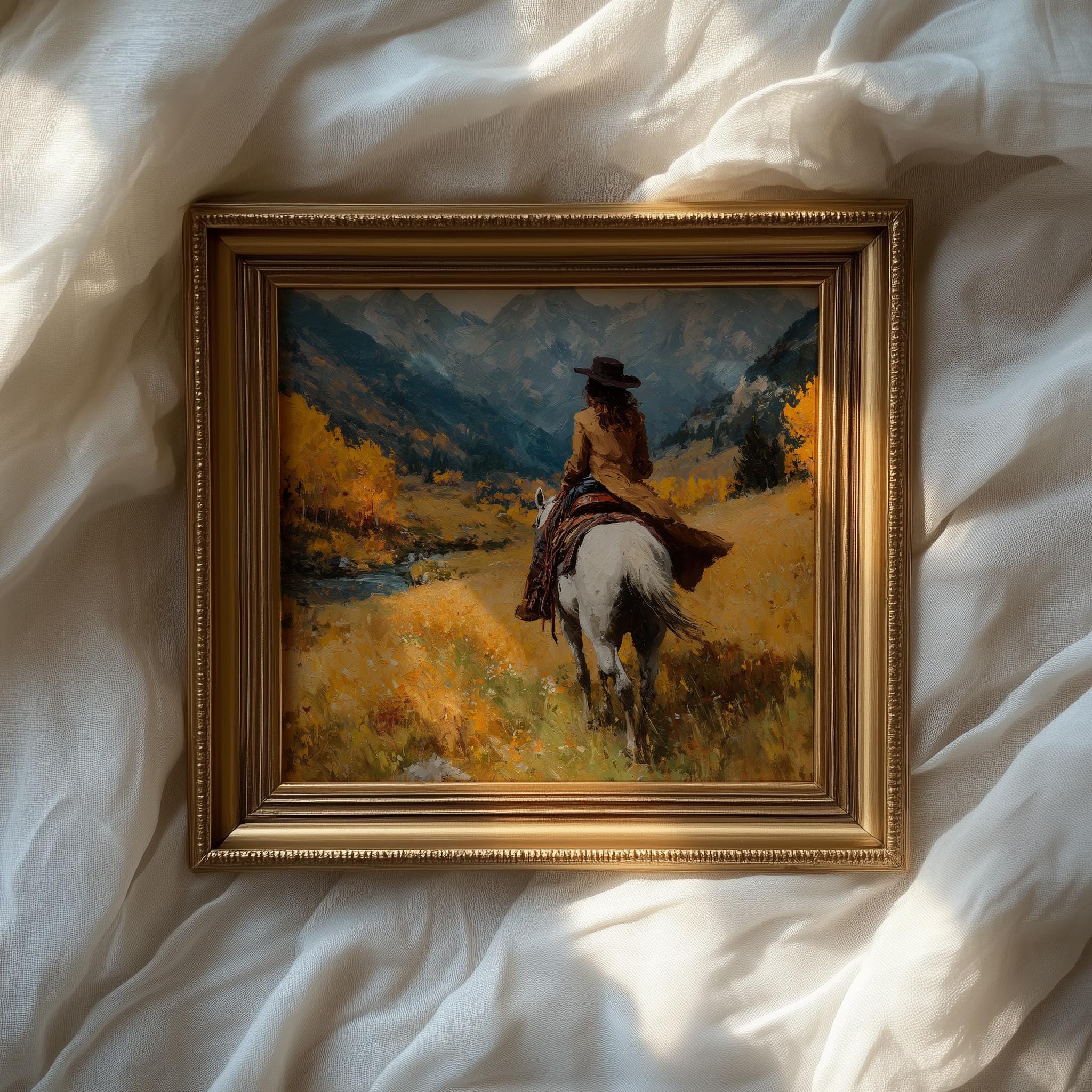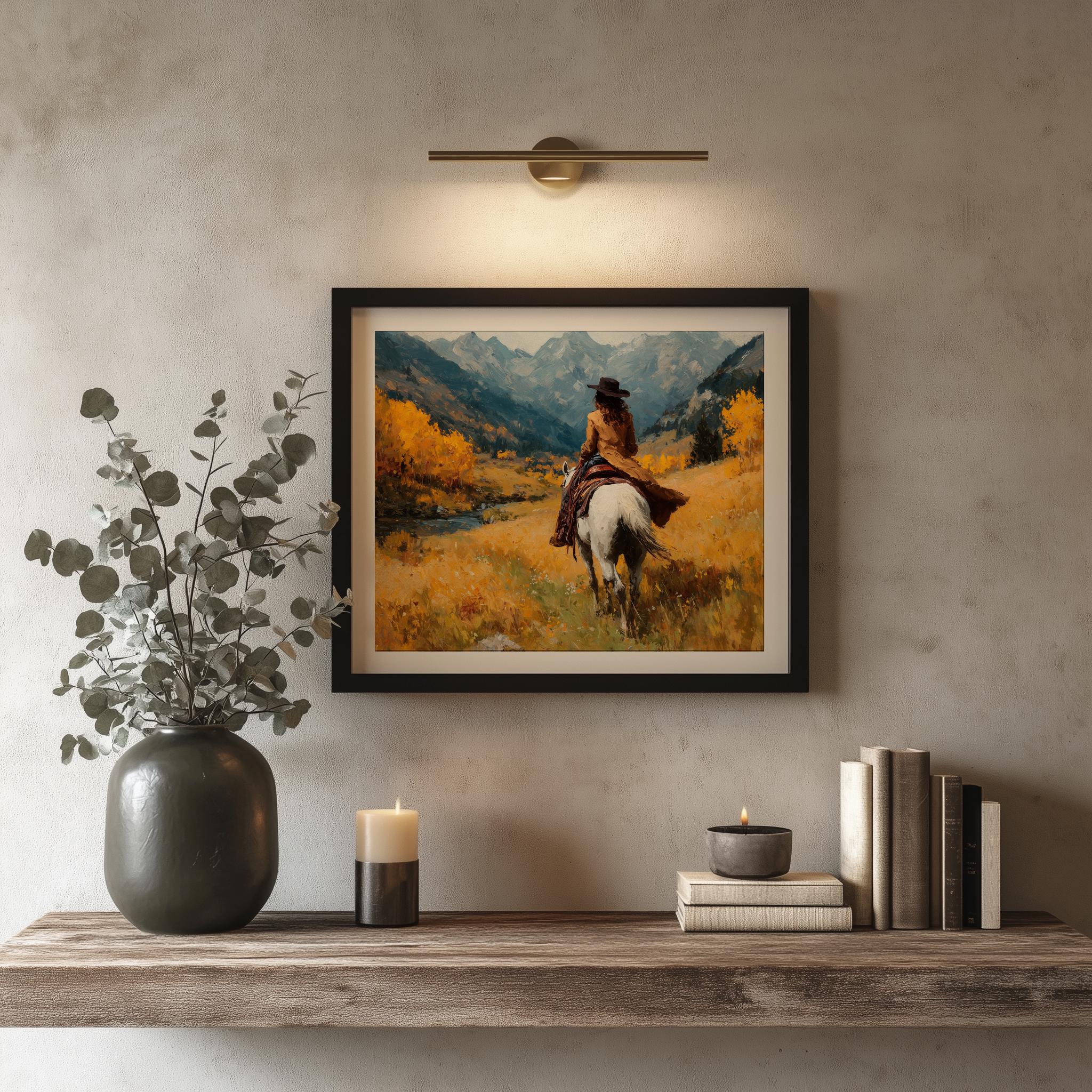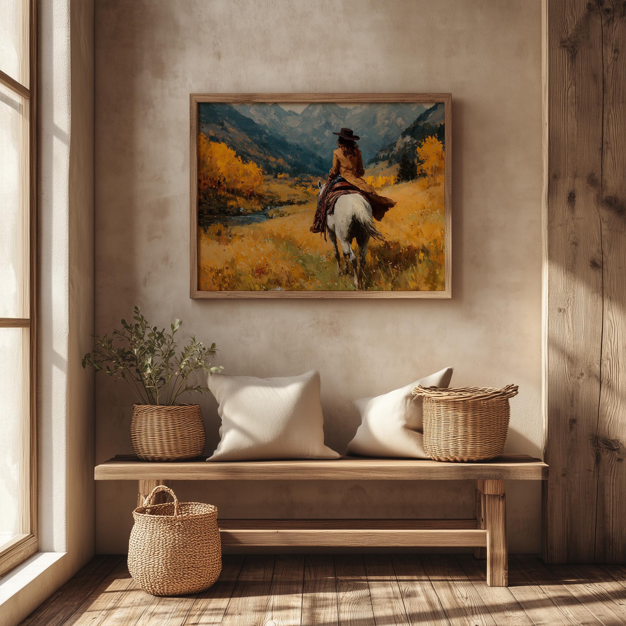 Immerse yourself in the charm with this rustic painting of a serene autumn mountain pass, where a cowgirl rides gracefully through a vibrant landscape. An instantly downloadable print, it's perfect for elevating your decor with budget-friendly charm. This gives you the flexibility to customize the size, frame, and material according to your personal taste and space, ensuring a perfect fit for your walls.